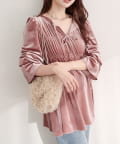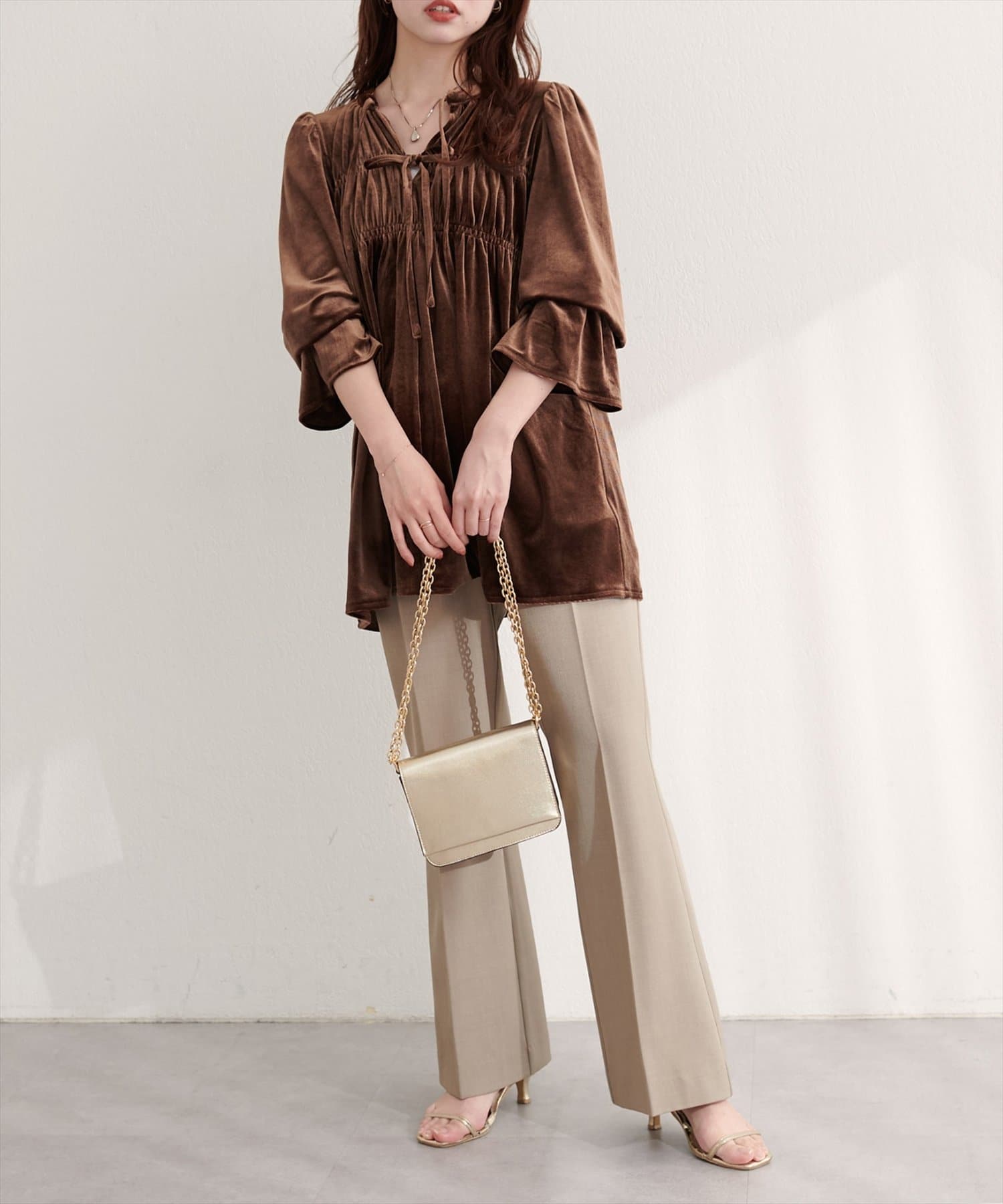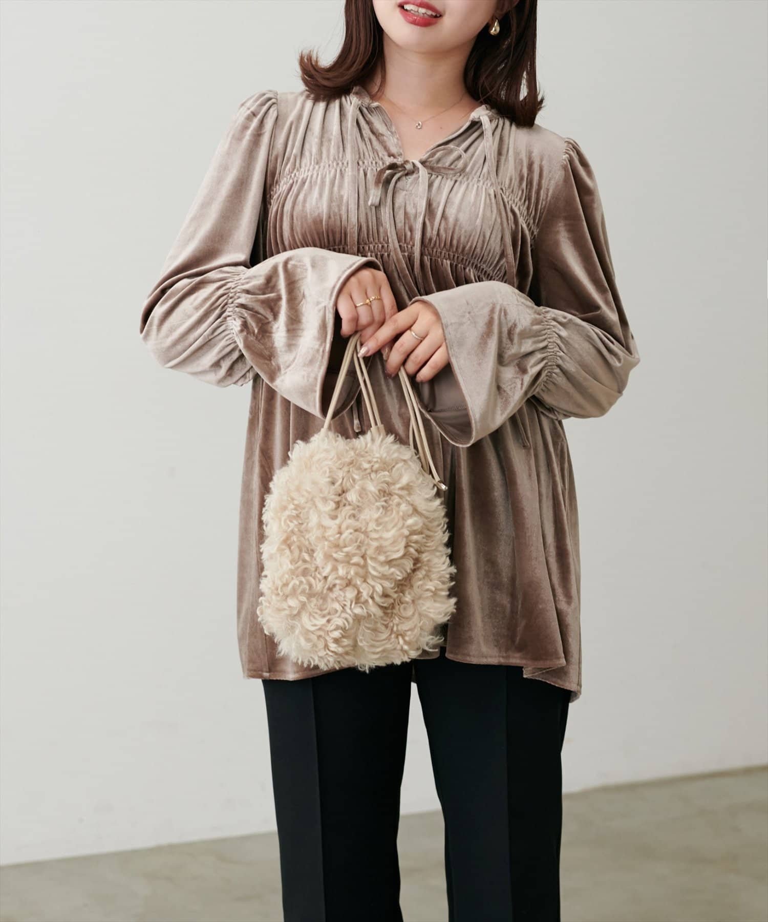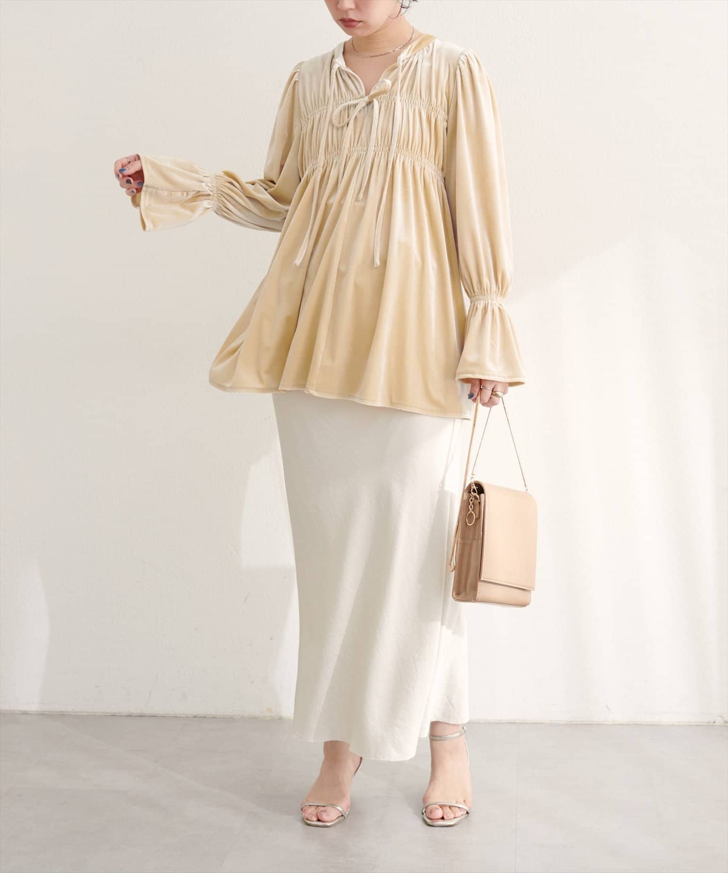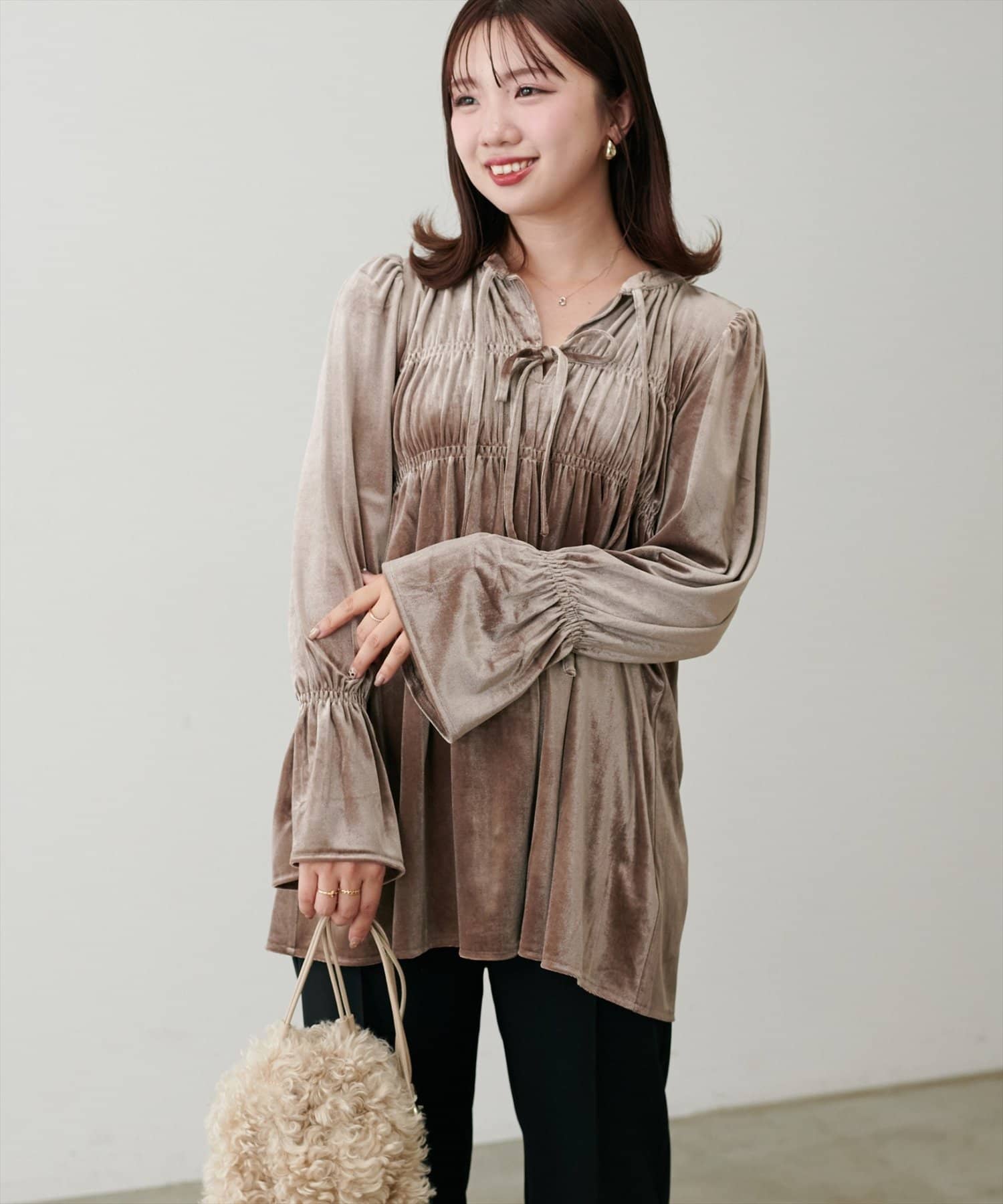 ベロア素材とシャーリングやリボンのデザイン性で一枚で様になるアイテムです。