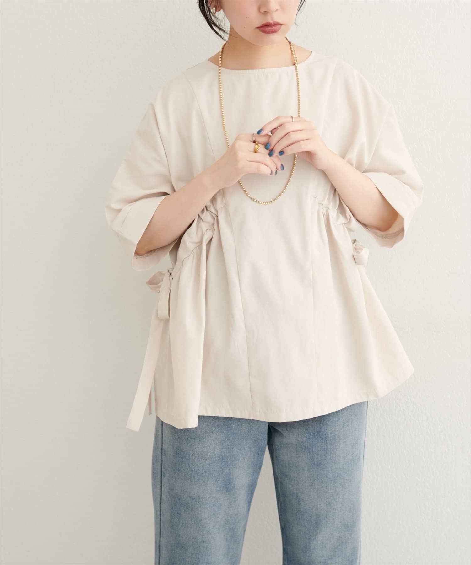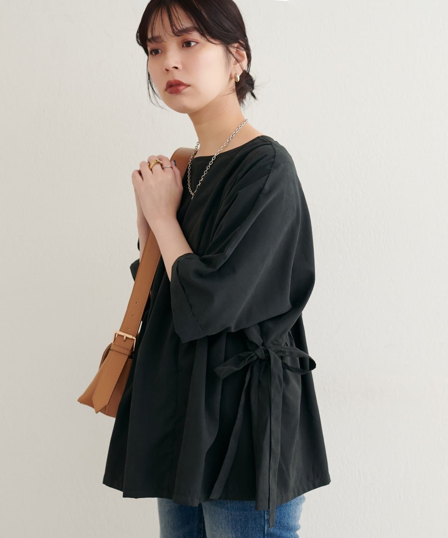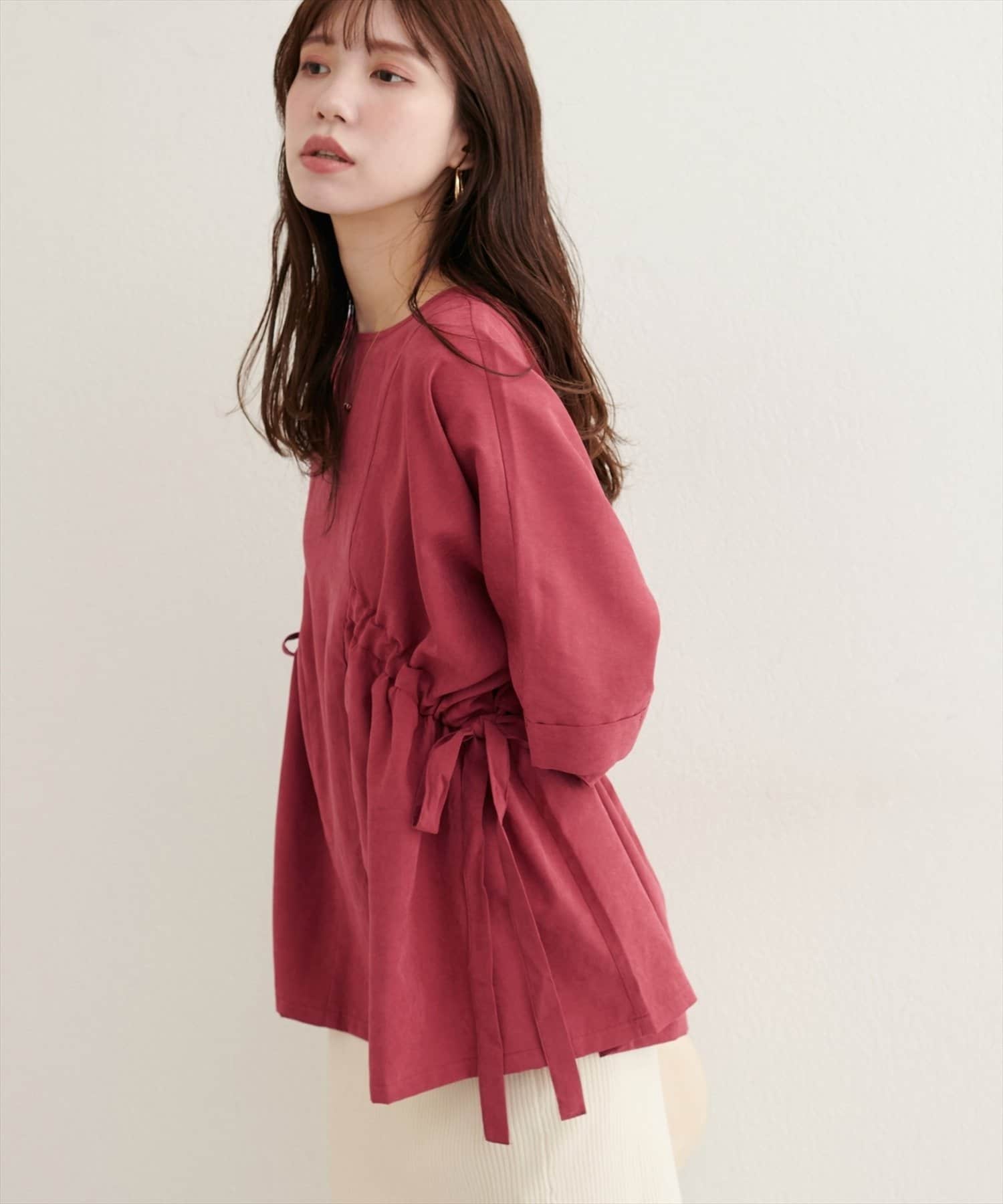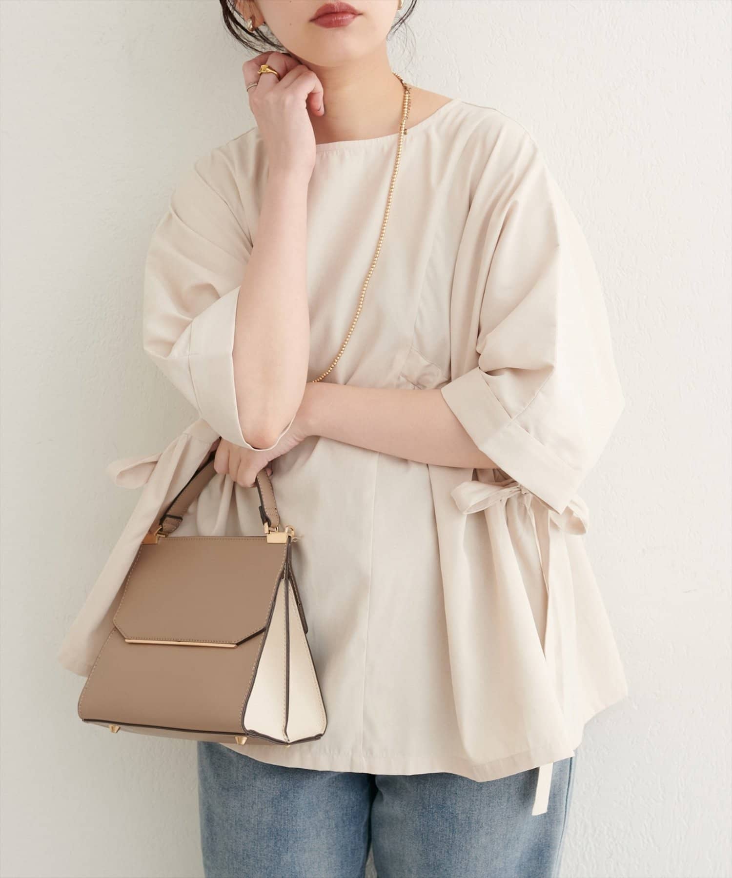 両サイドに施されたドロストリボンは、きゅっと絞ってフェミニンに