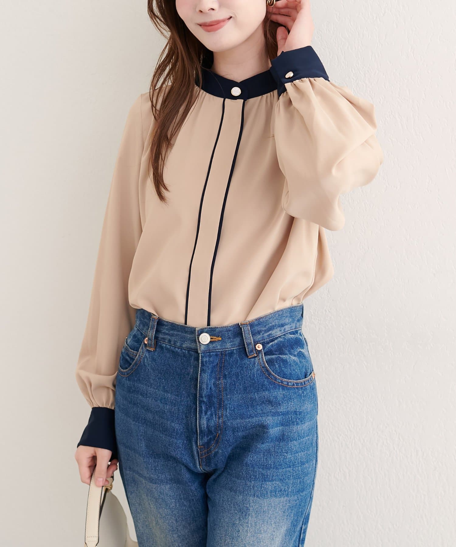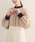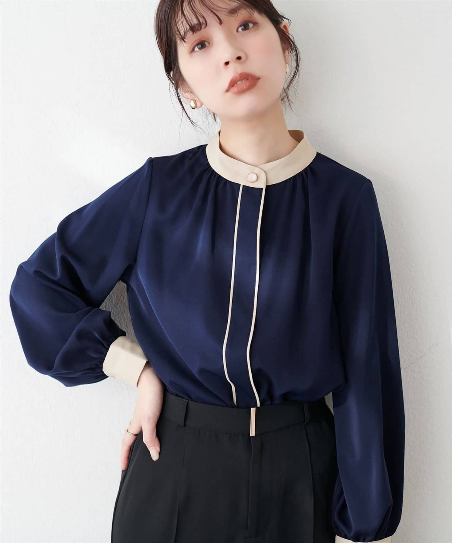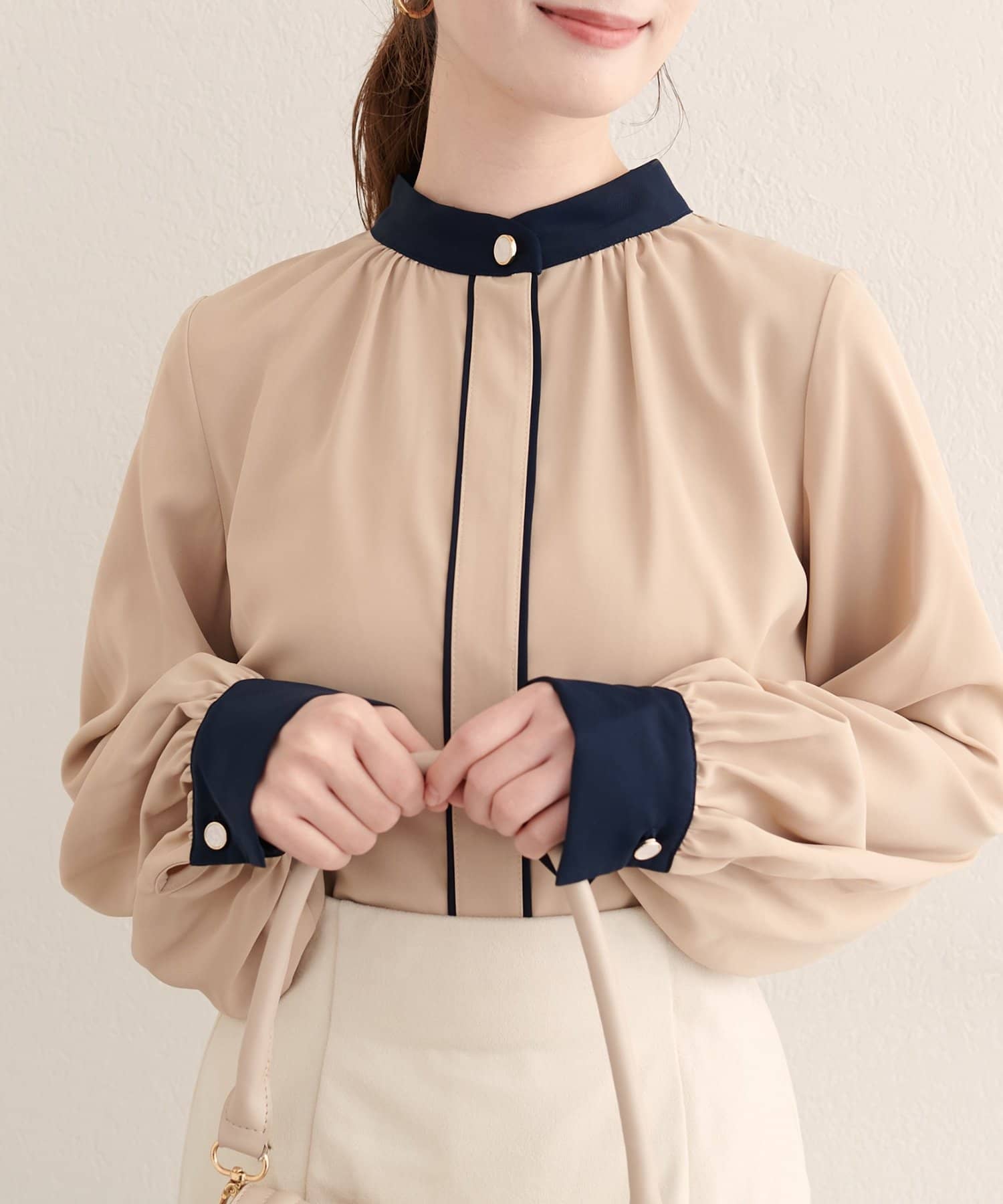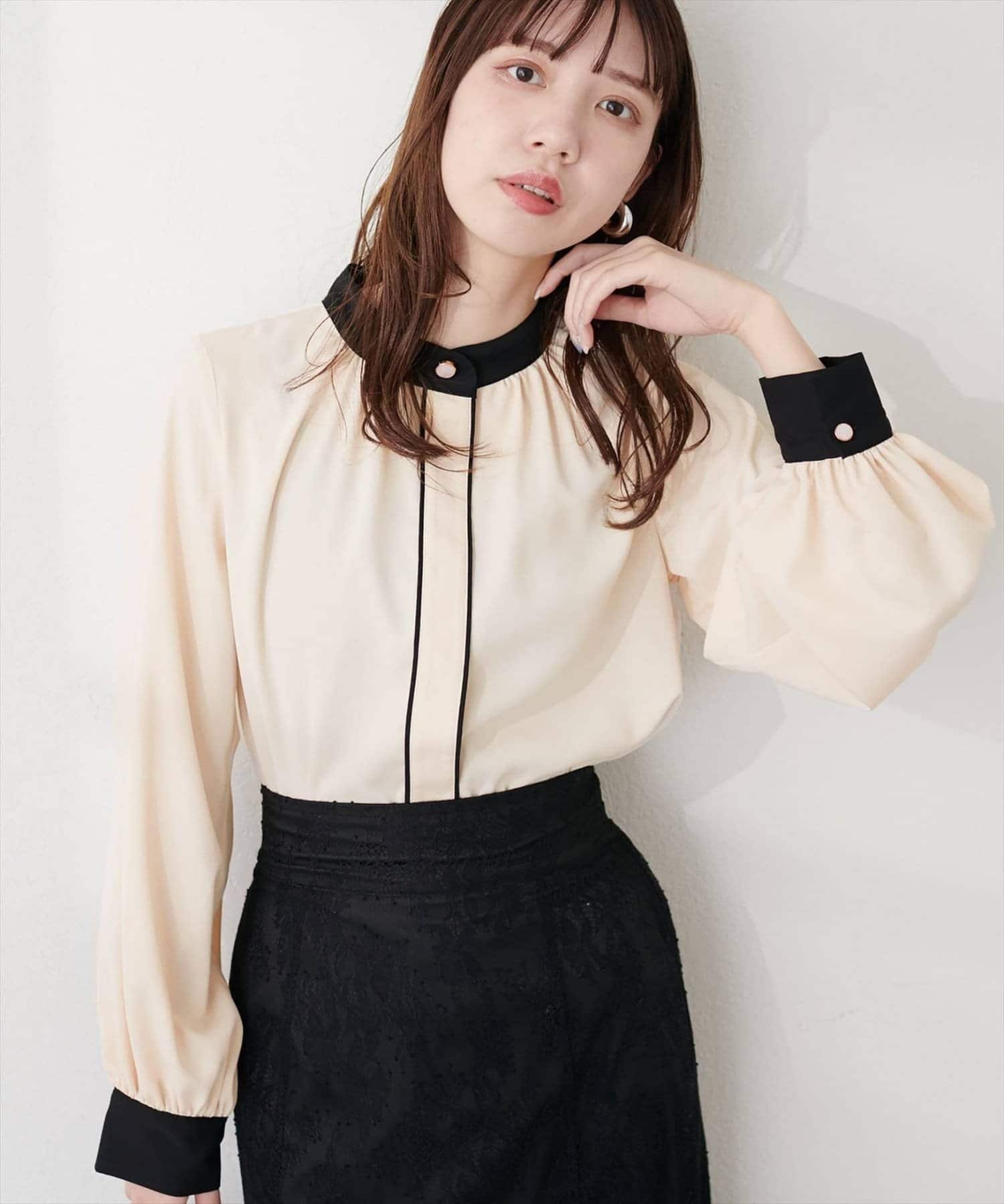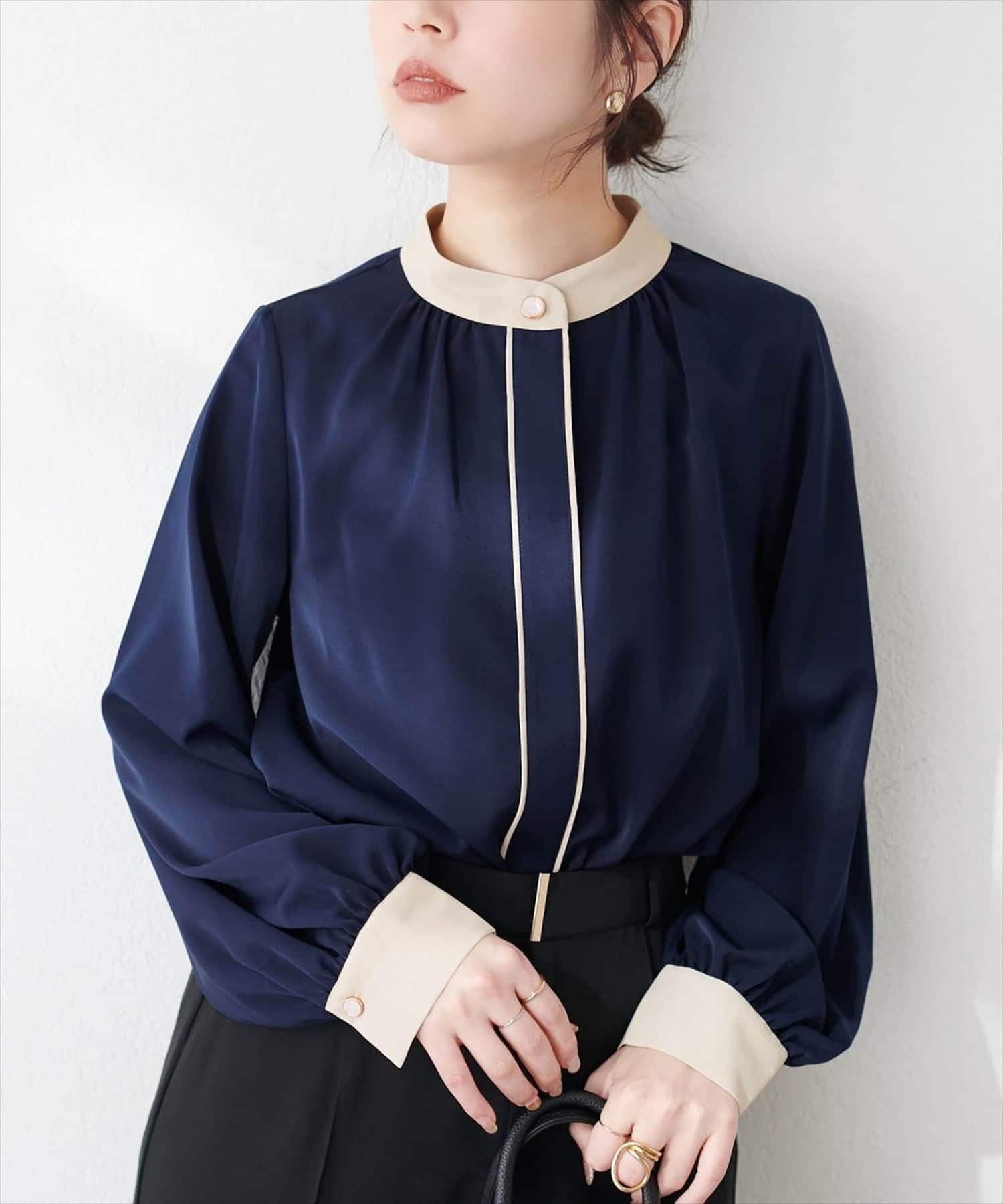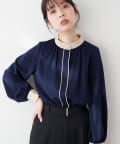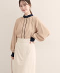 華やかで女性らしい雰囲気と配色のトリミングをアクセントにメリハリをつけたフェミニンブラウス。