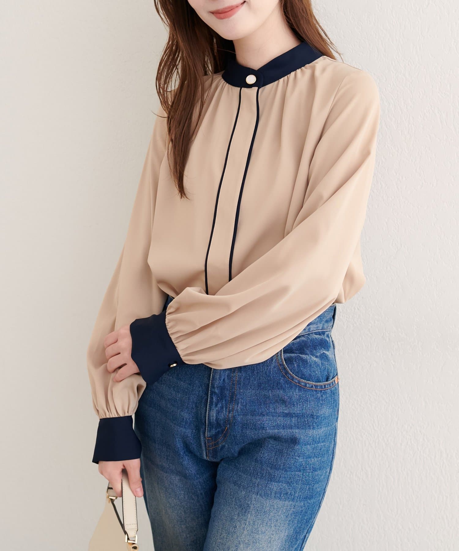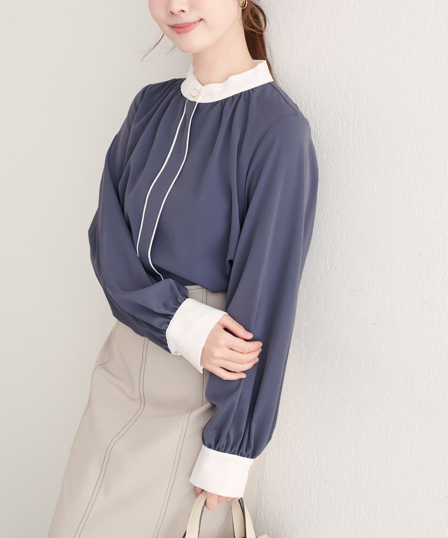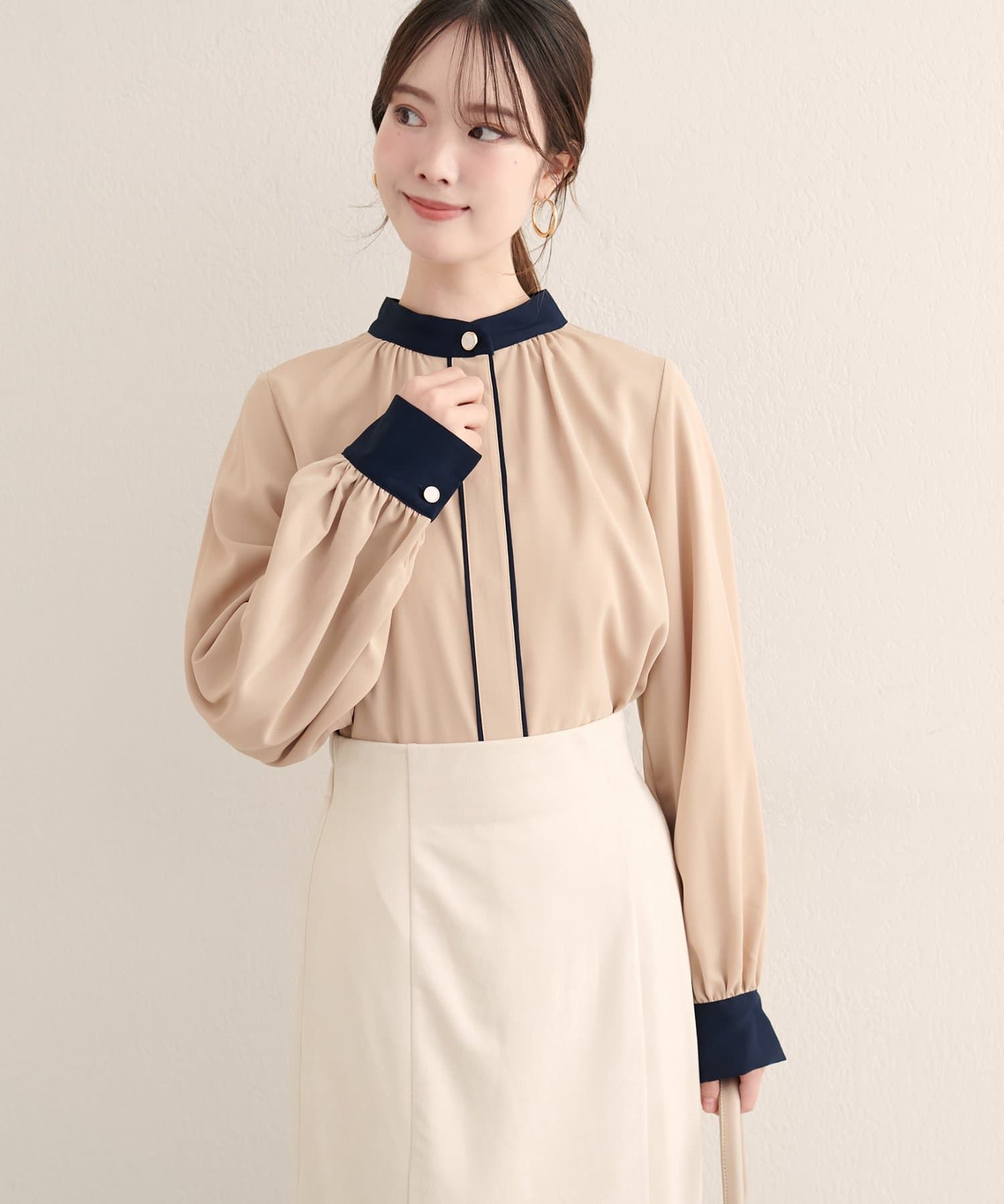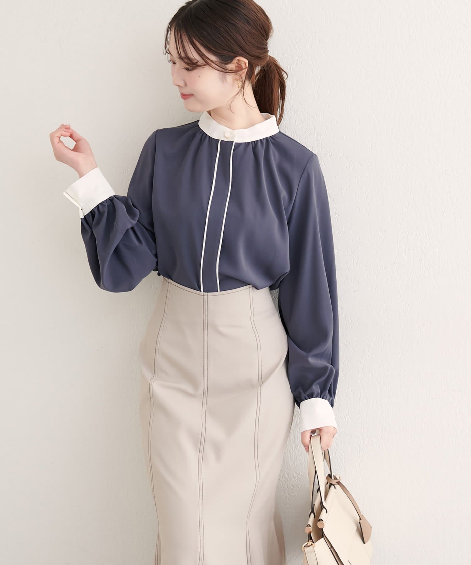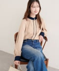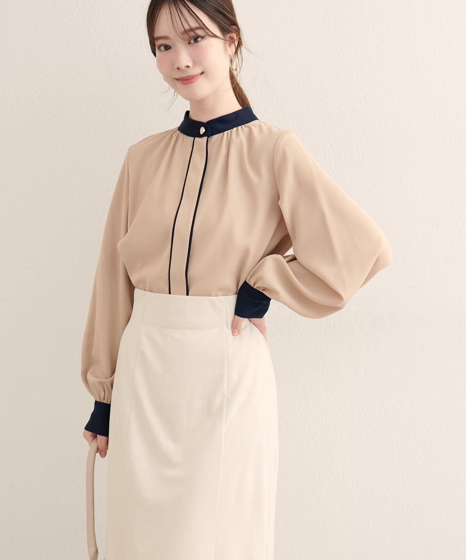 華やかで女性らしい雰囲気と配色のトリミングをアクセントにメリハリをつけたフェミニンブラウス。