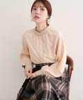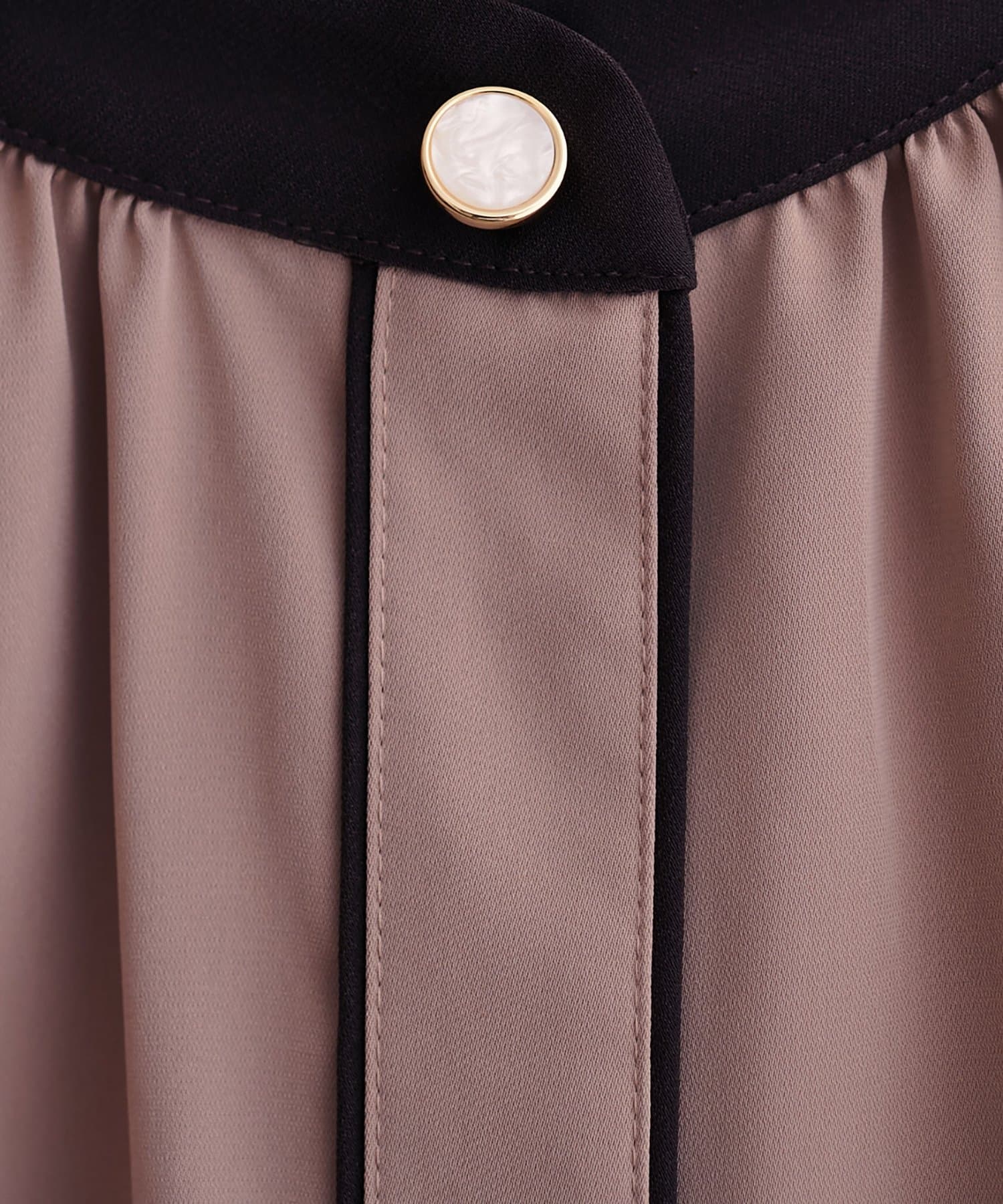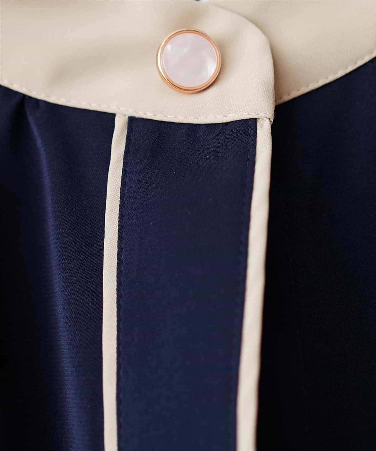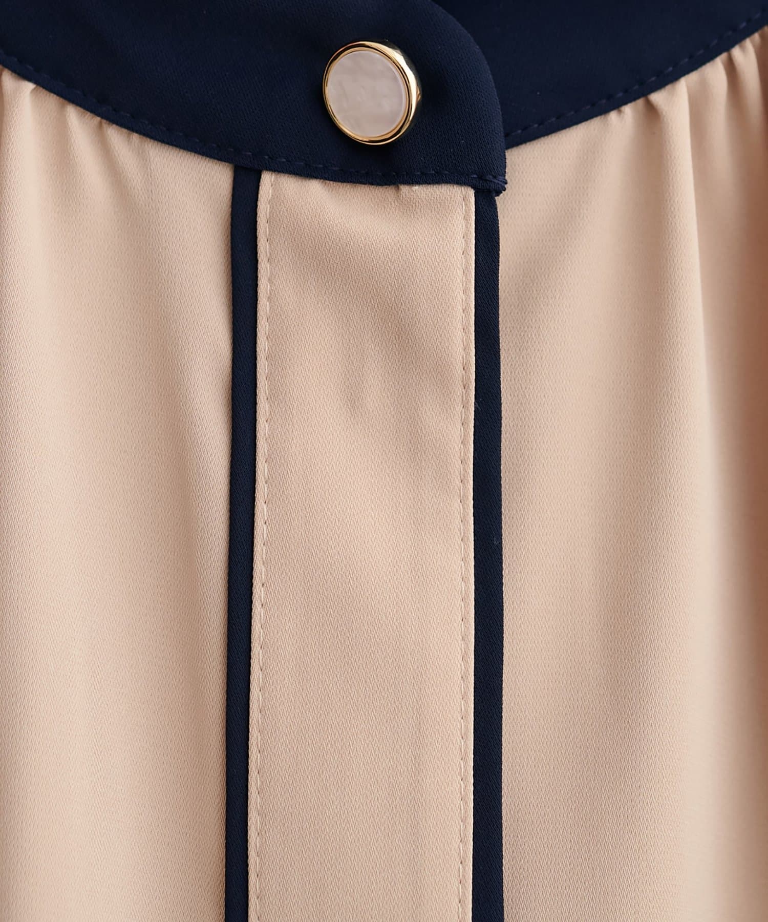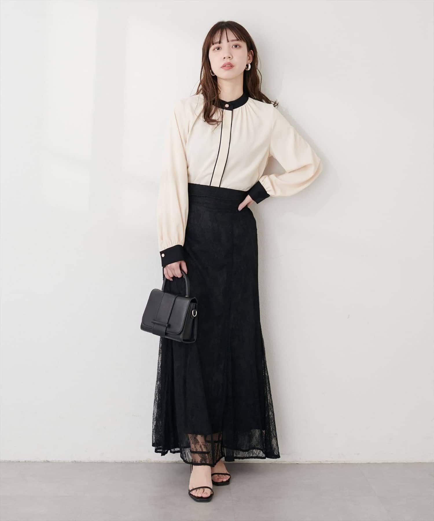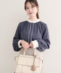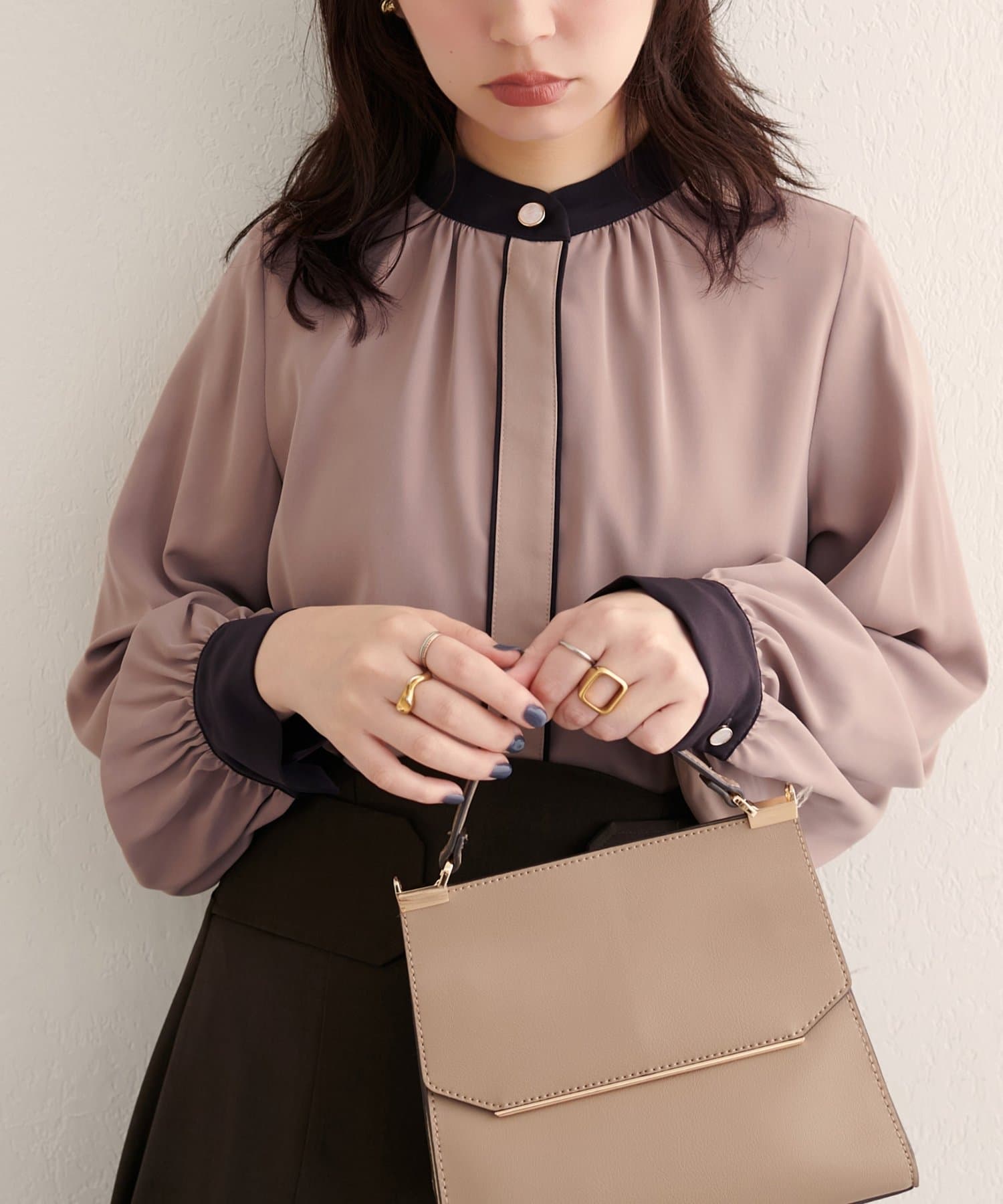 華やかで女性らしい雰囲気と配色のトリミングをアクセントにメリハリをつけたフェミニンブラウス。