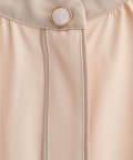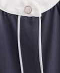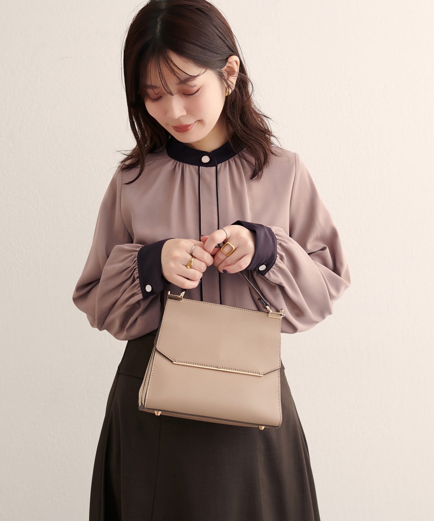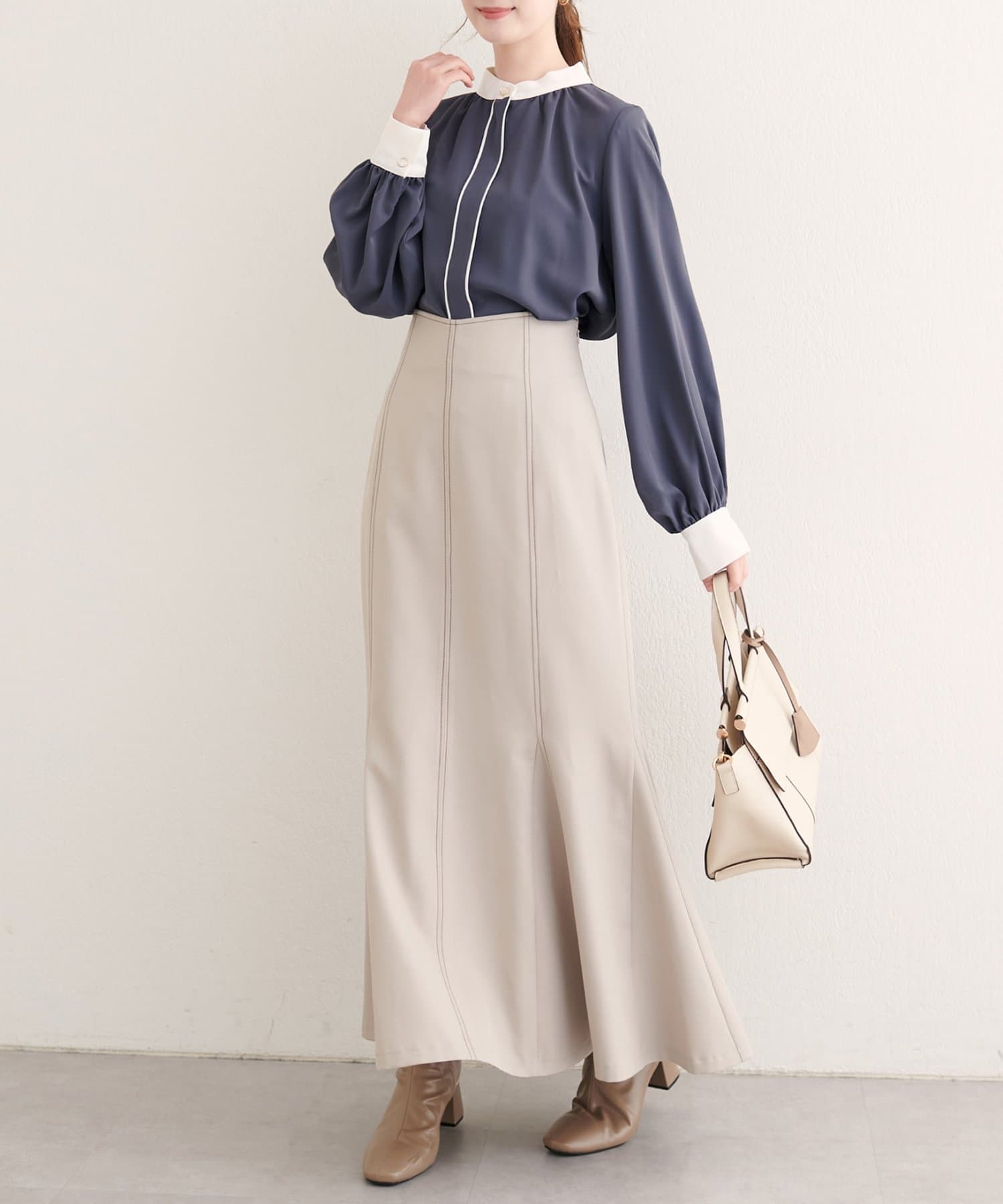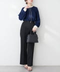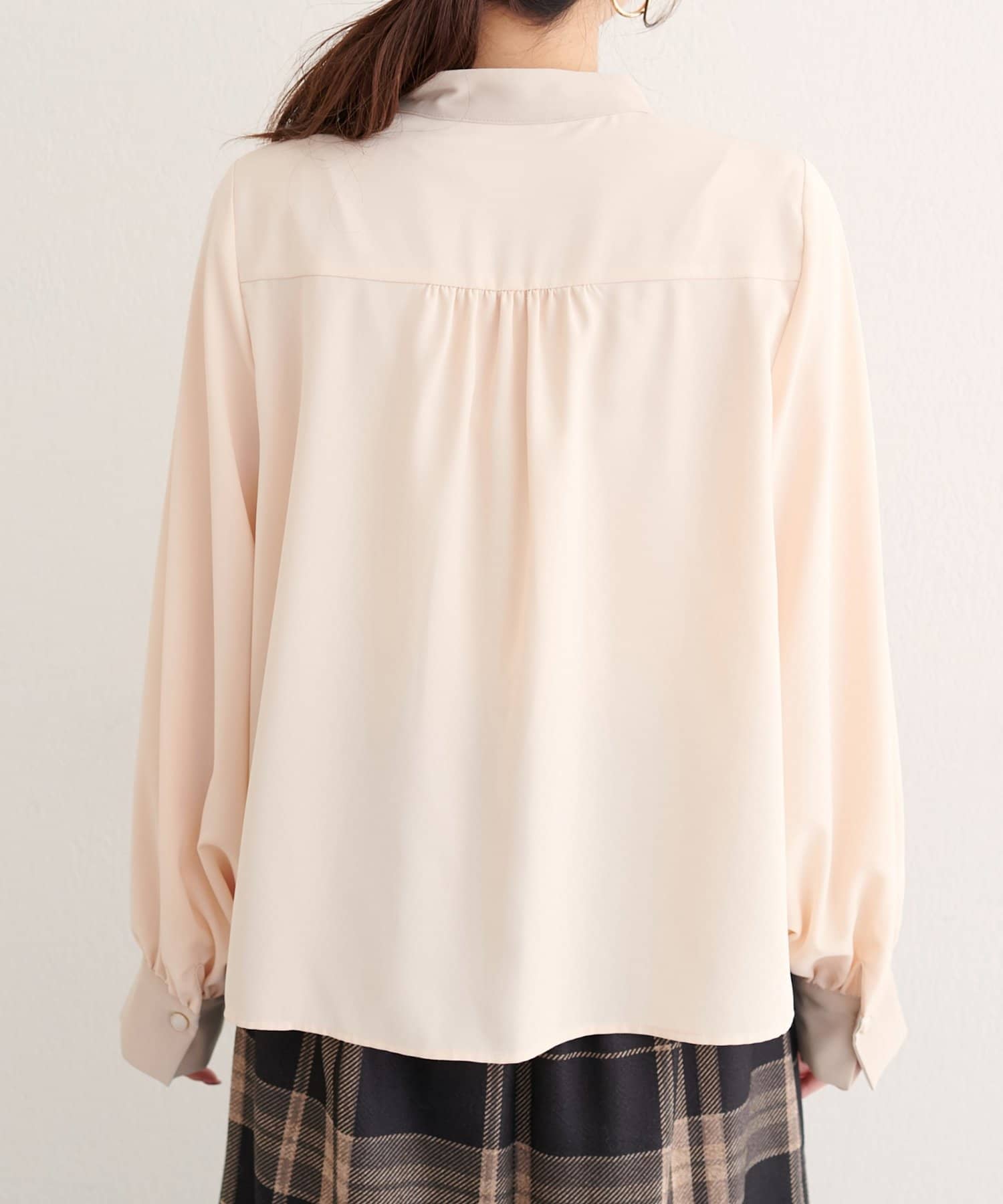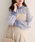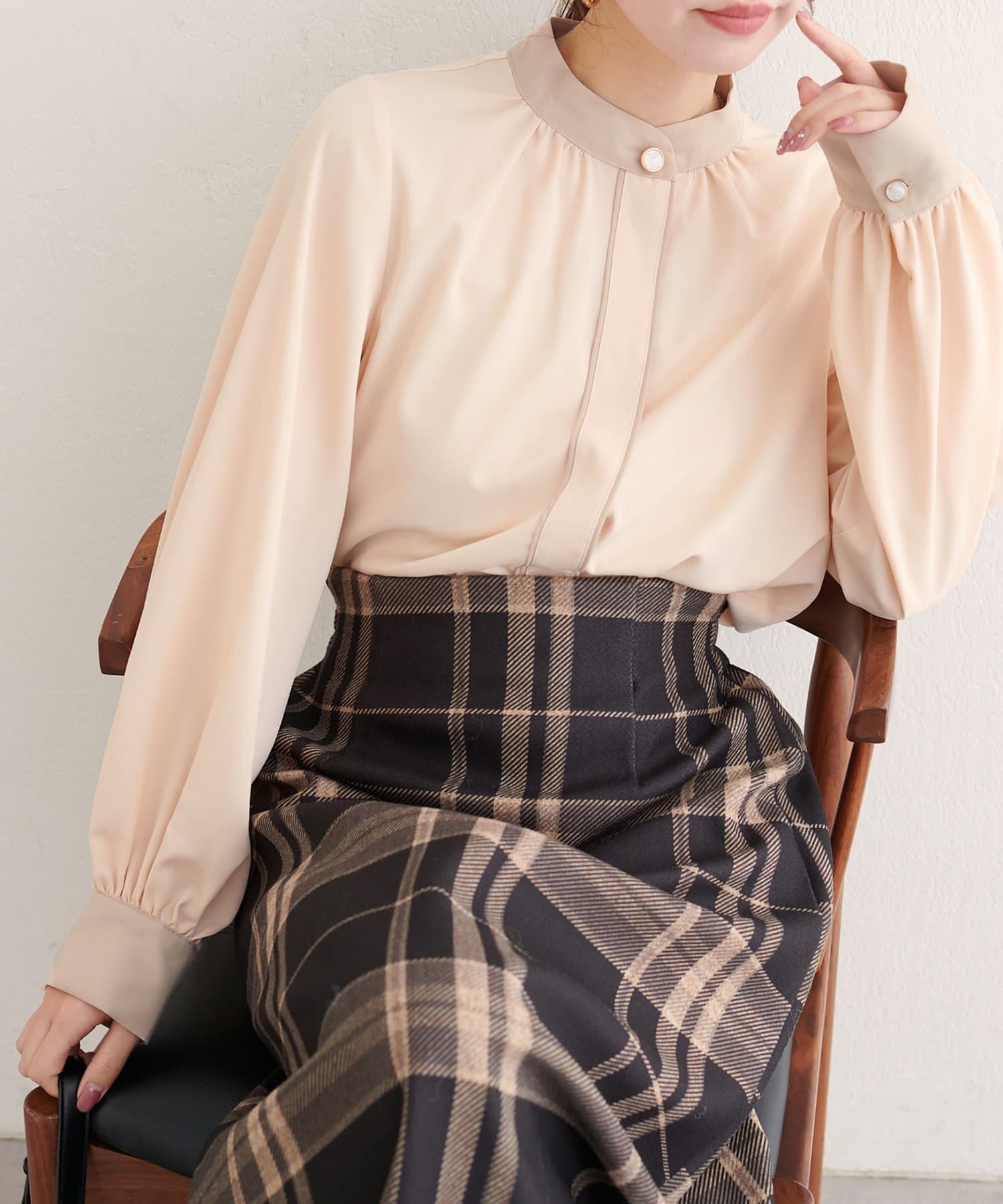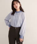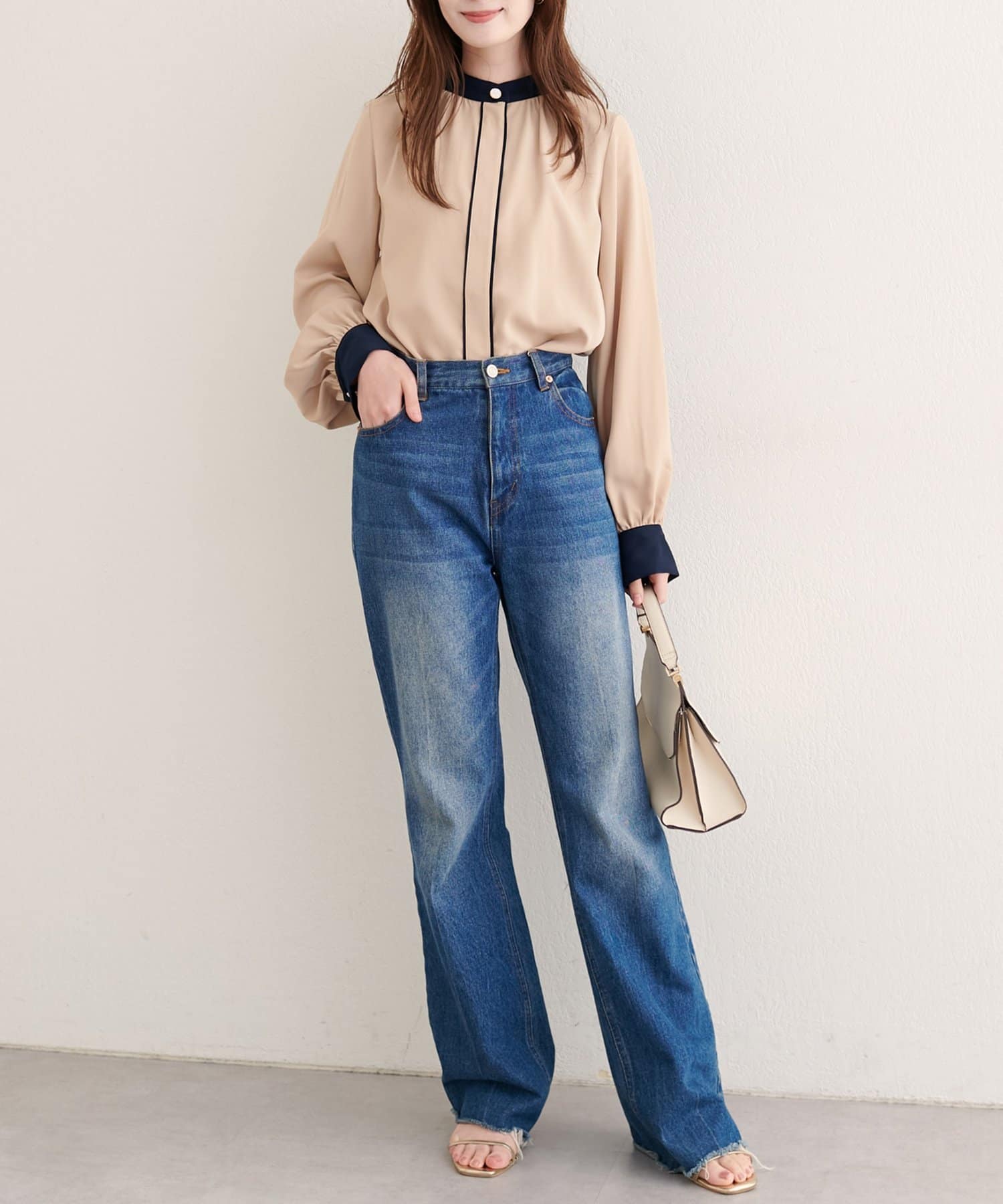 華やかで女性らしい雰囲気と配色のトリミングをアクセントにメリハリをつけたフェミニンブラウス。
