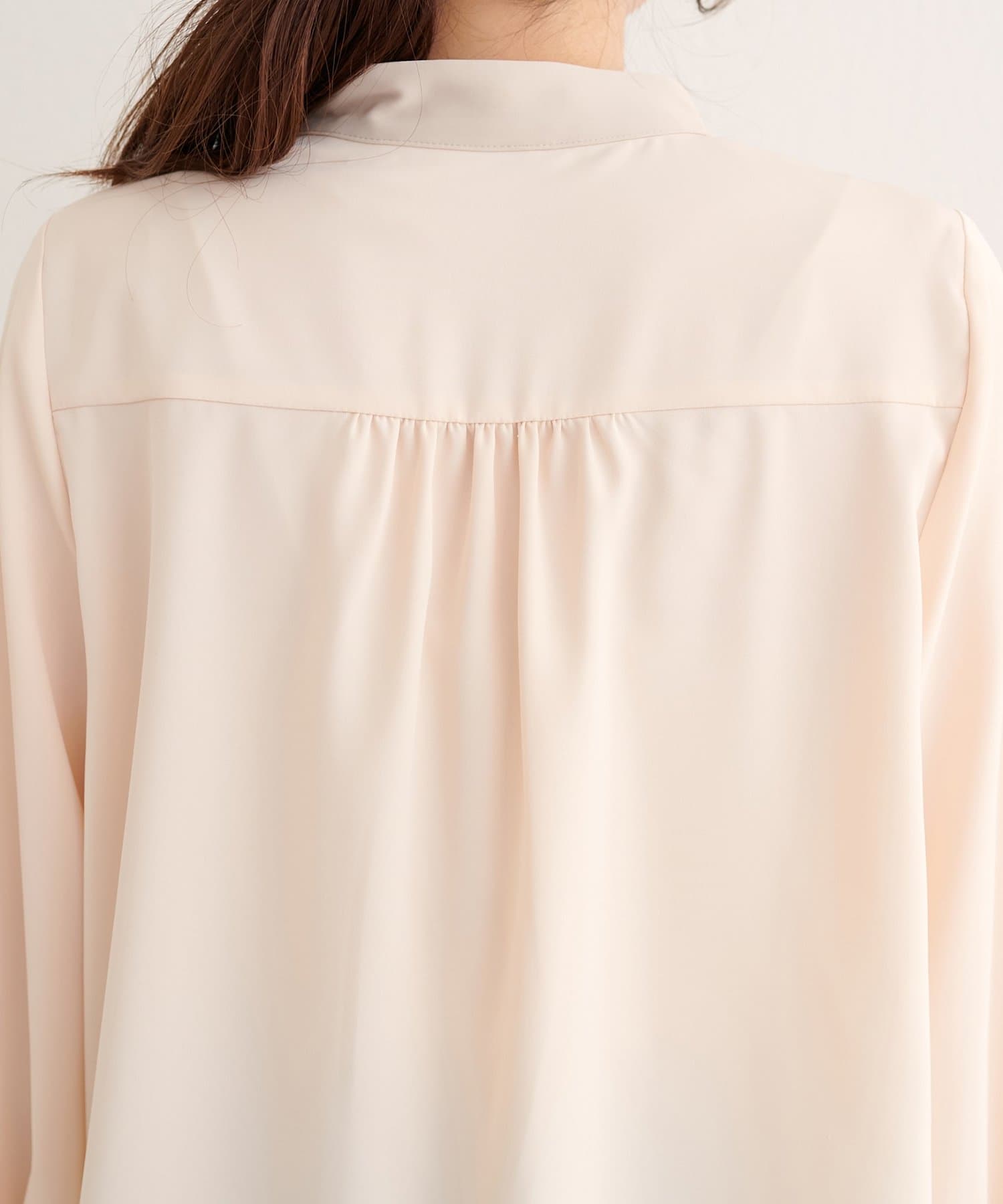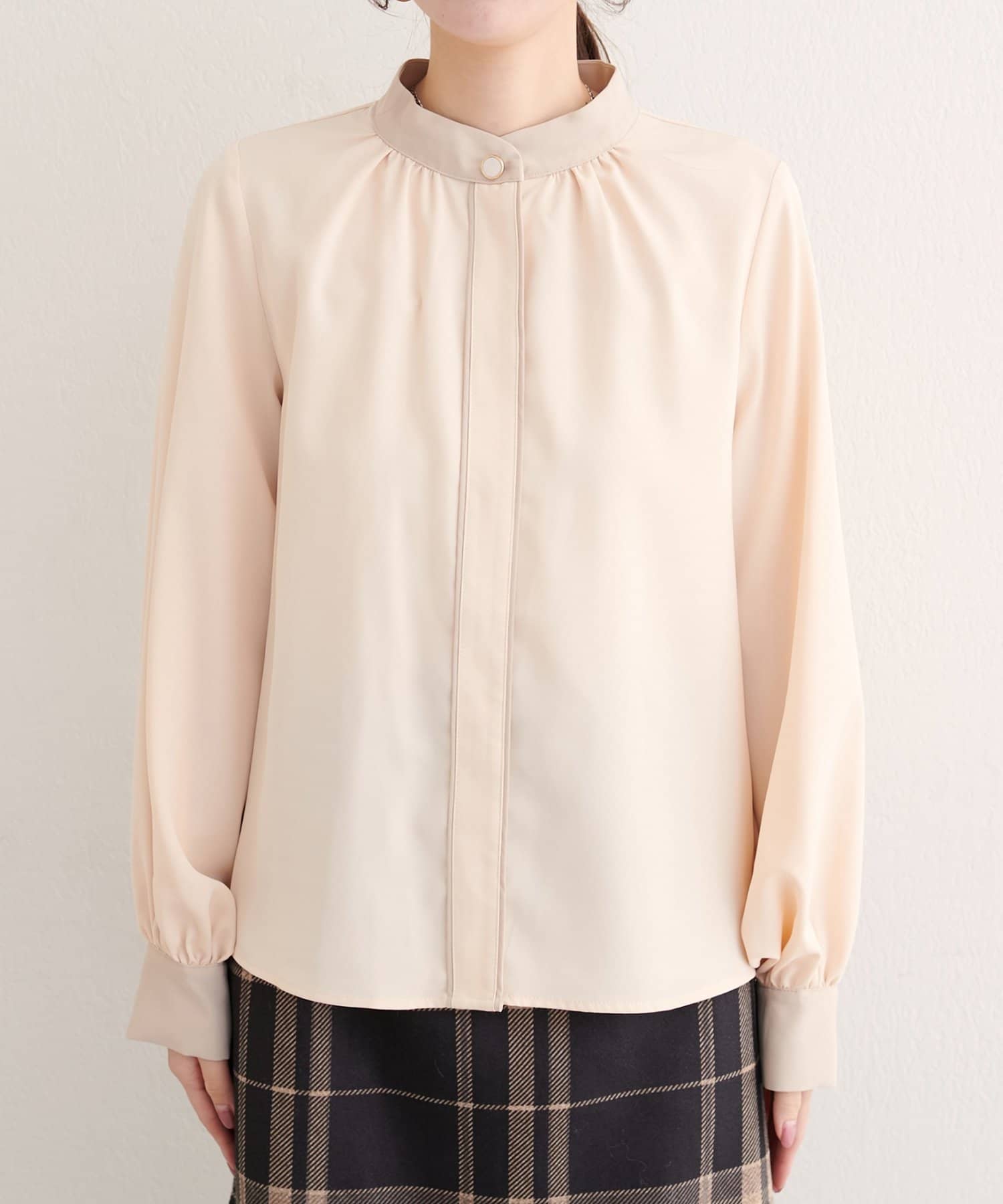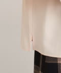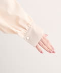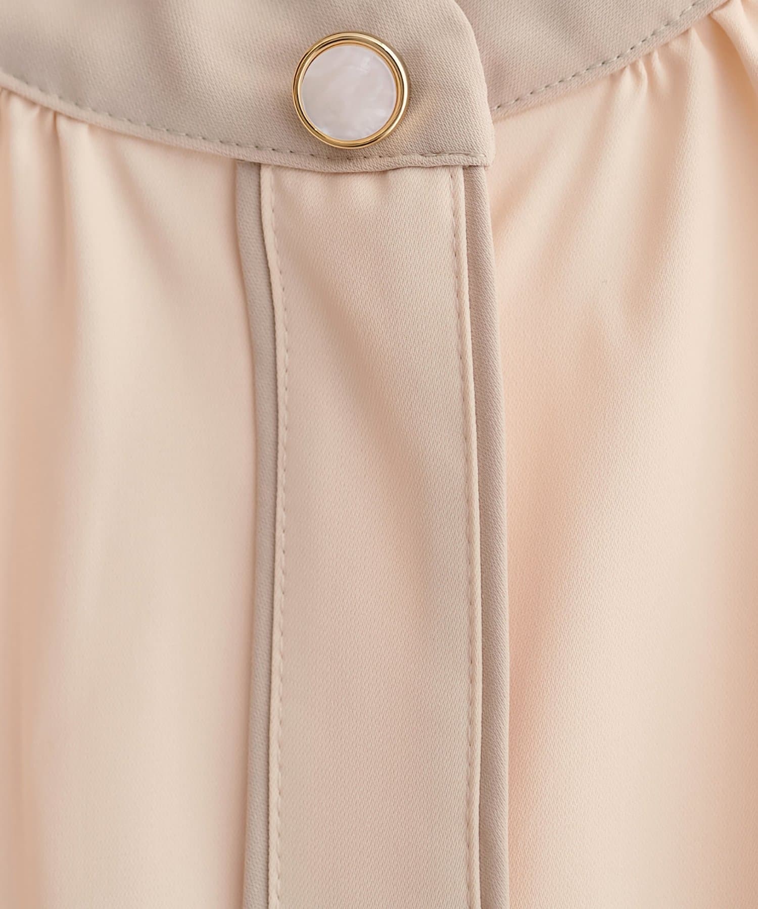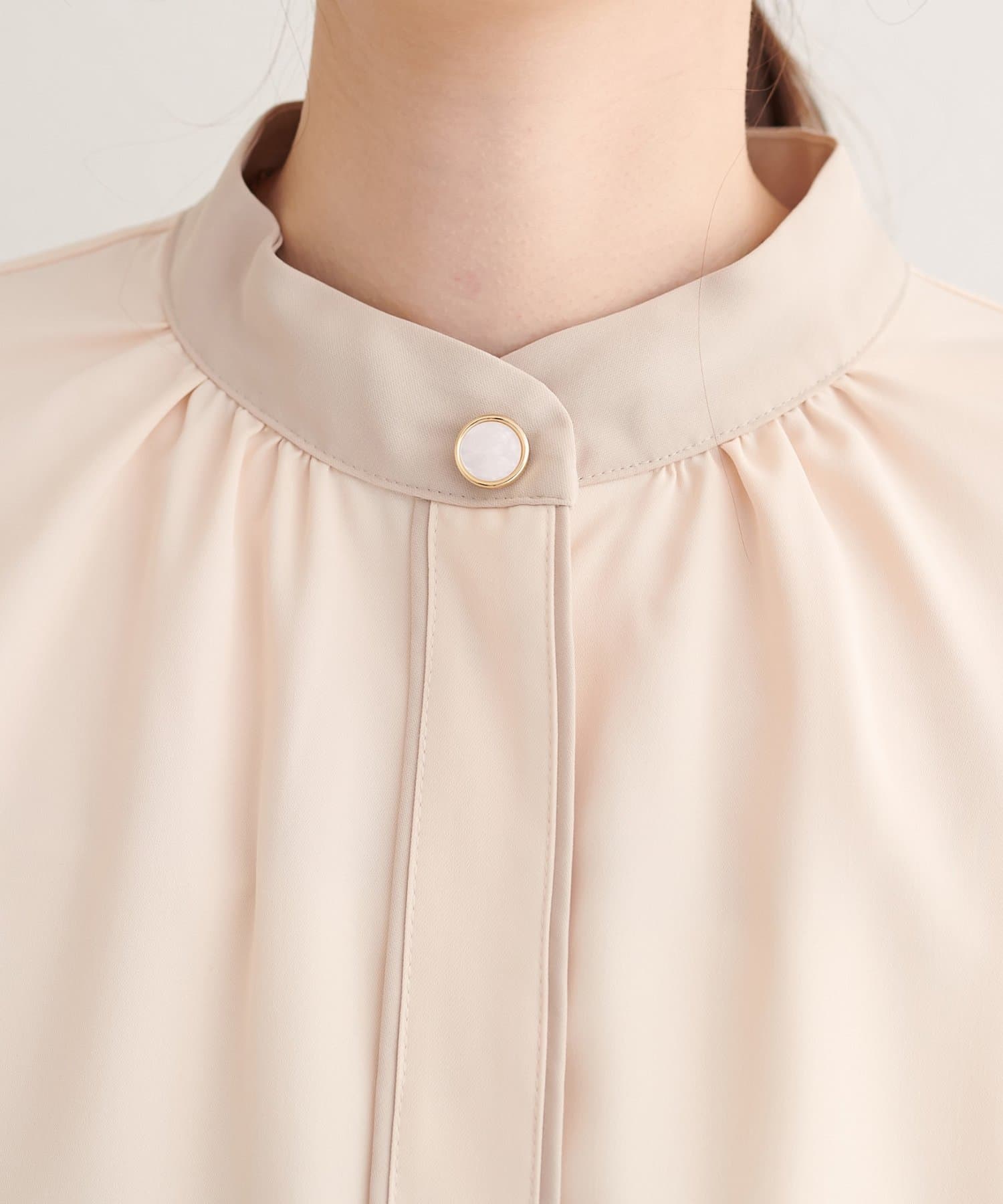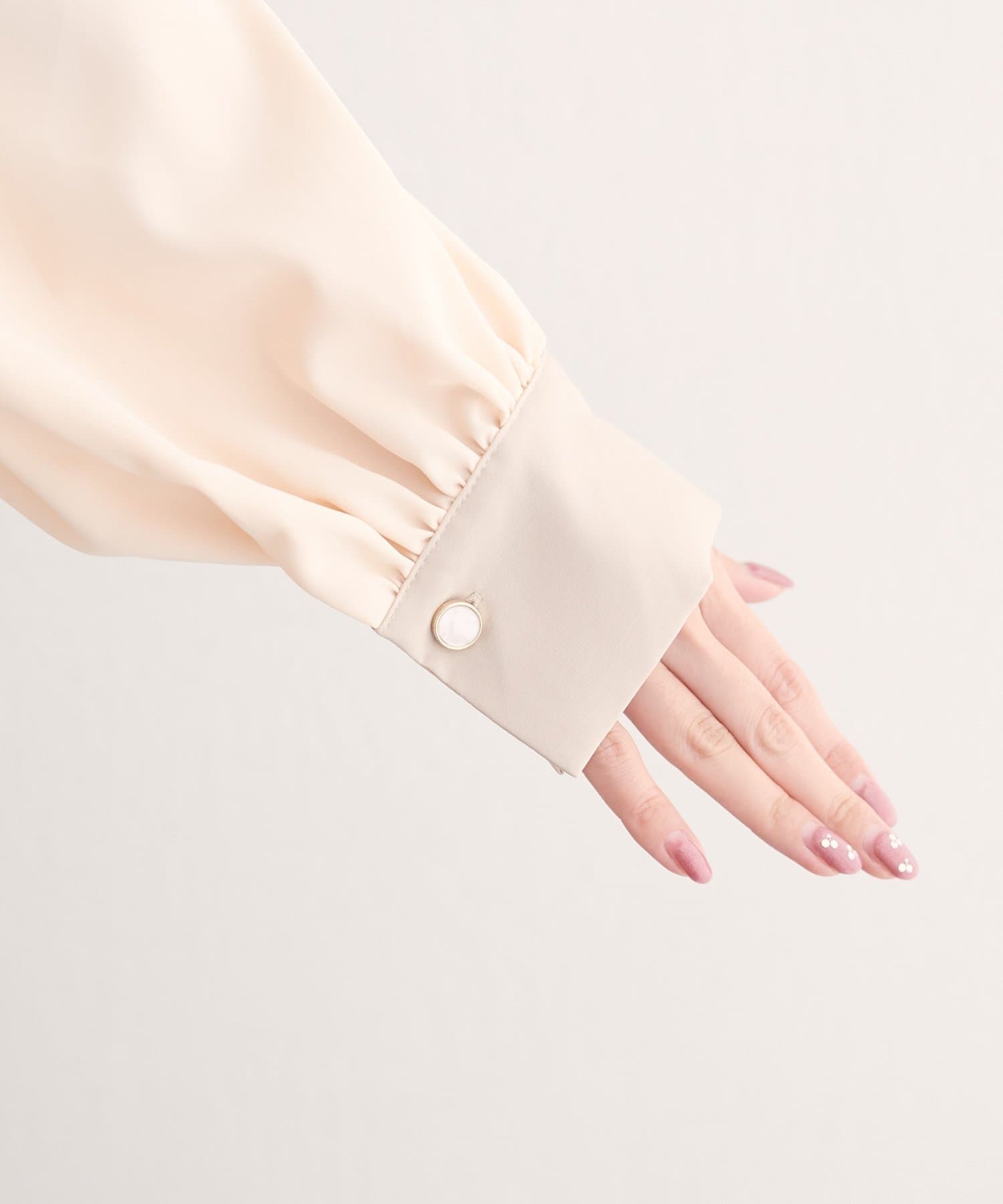 シェル素材とゴールドを組み合わせた上品な印象の釦を襟元と袖口に施し、
