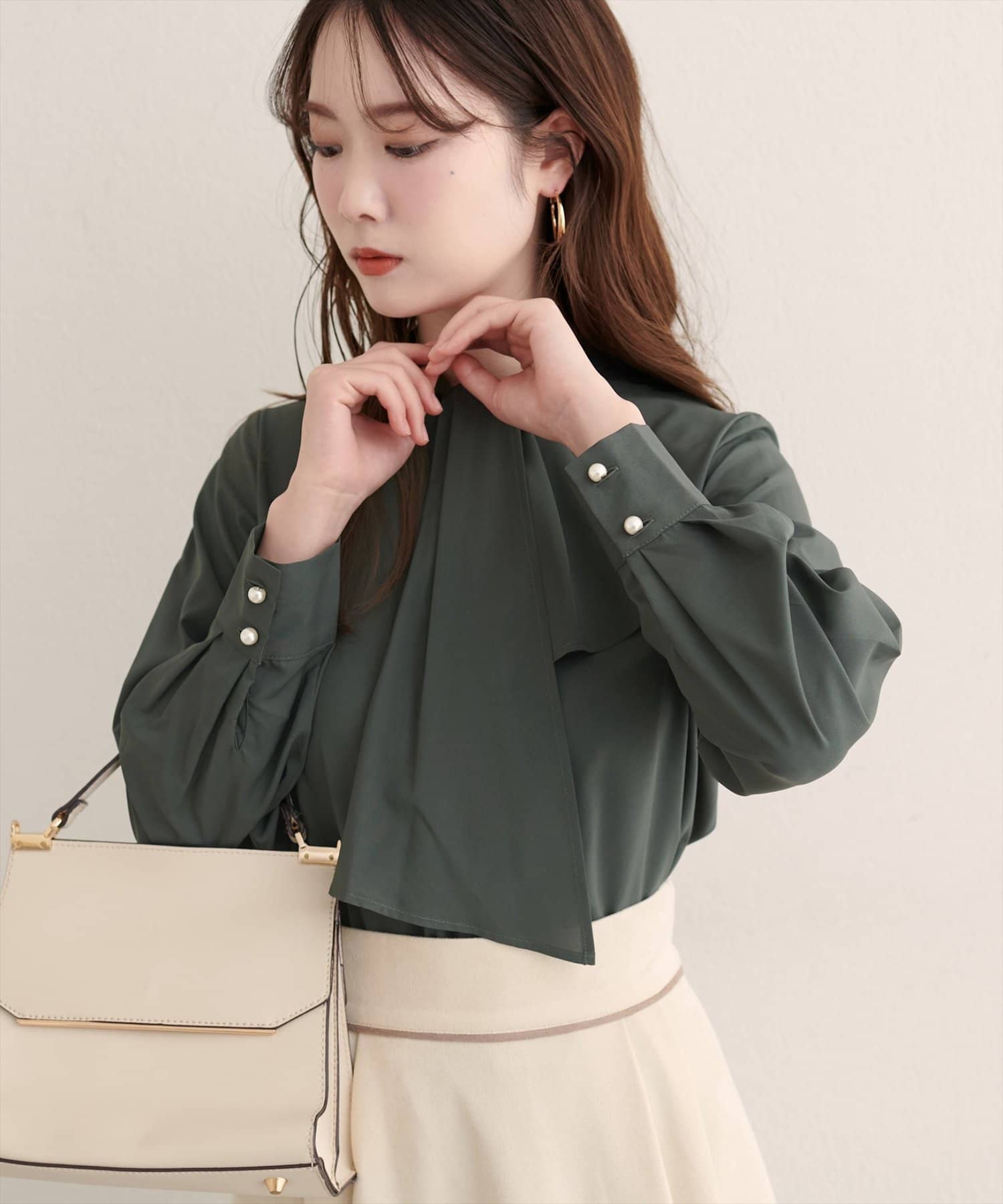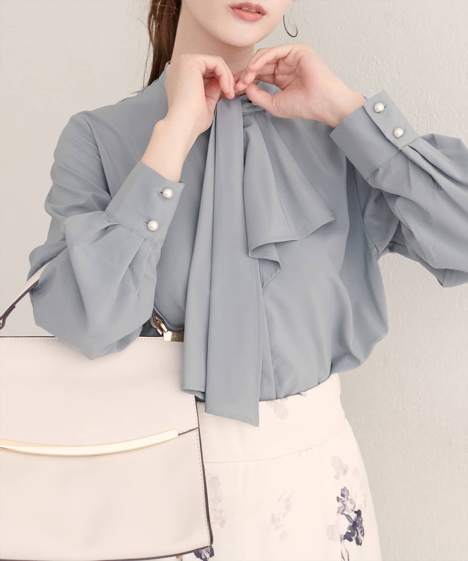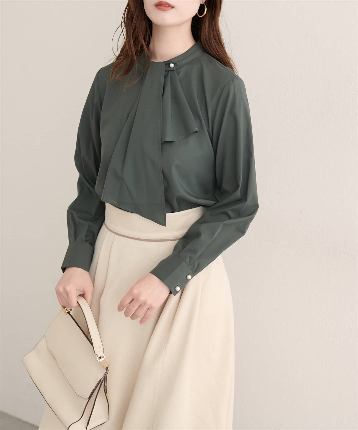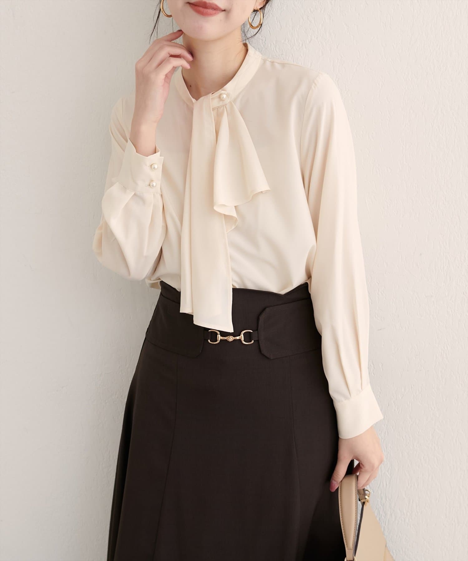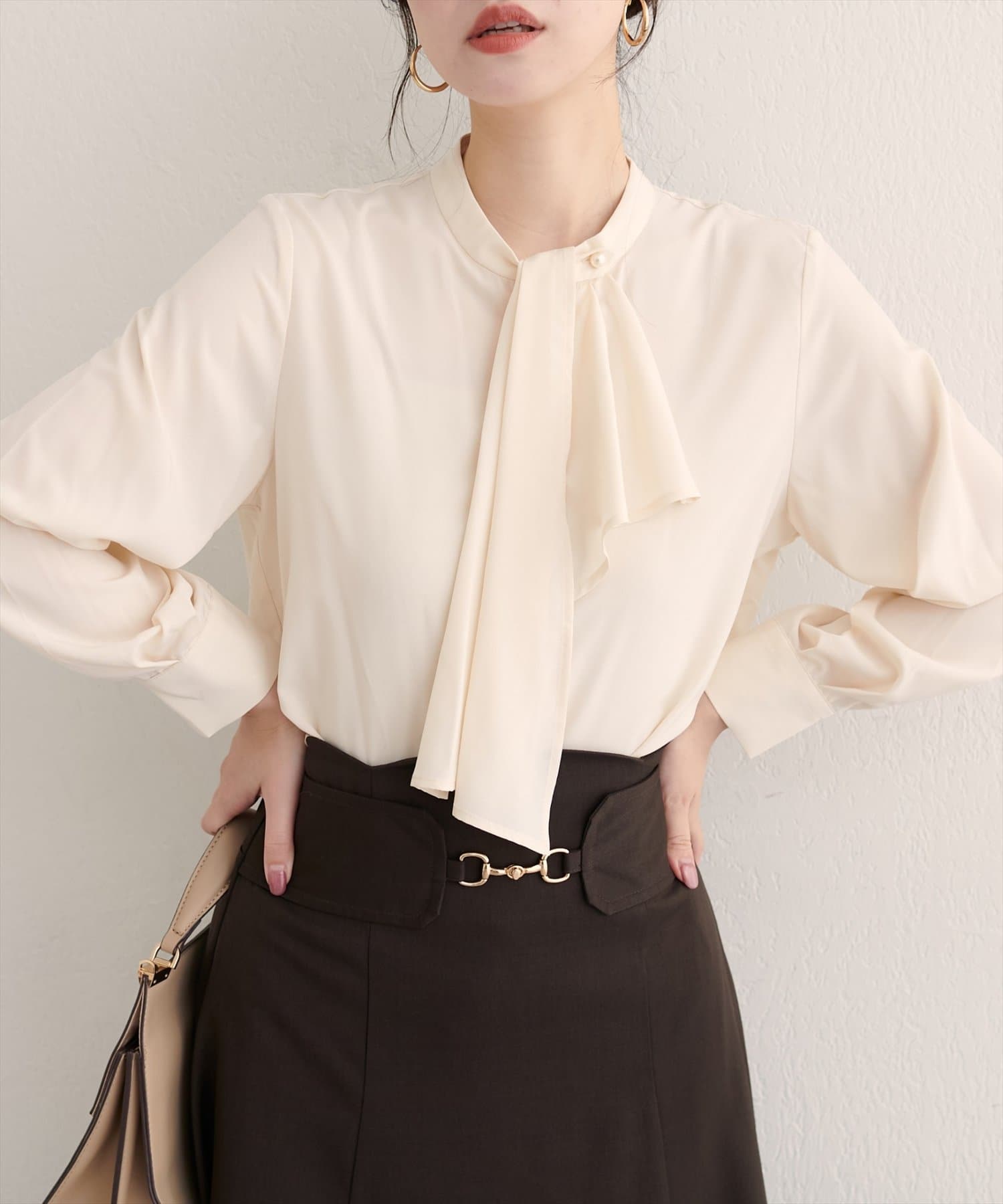 ドレープになったスカーフタイのデザインが特徴のお上品ブラウス。