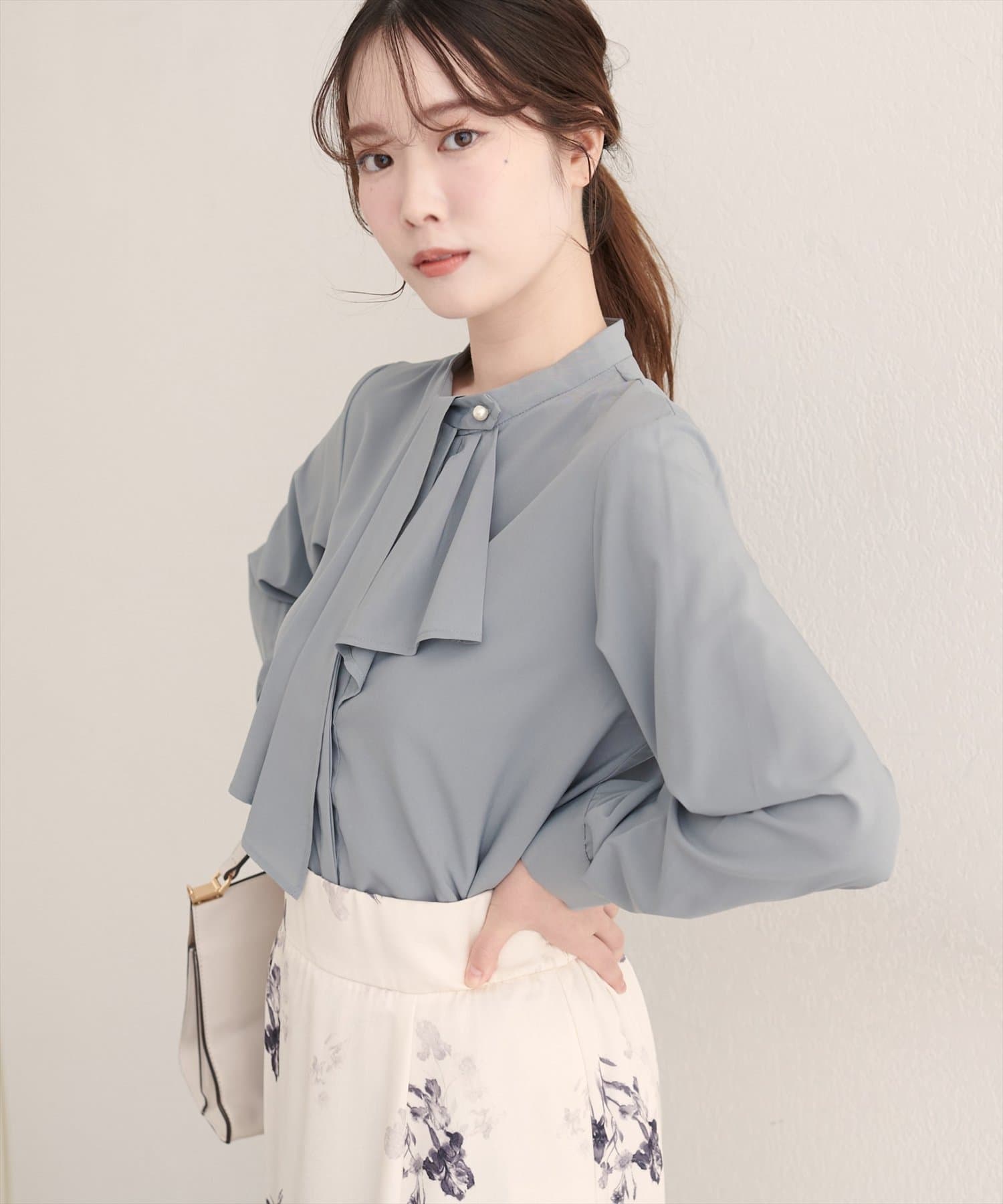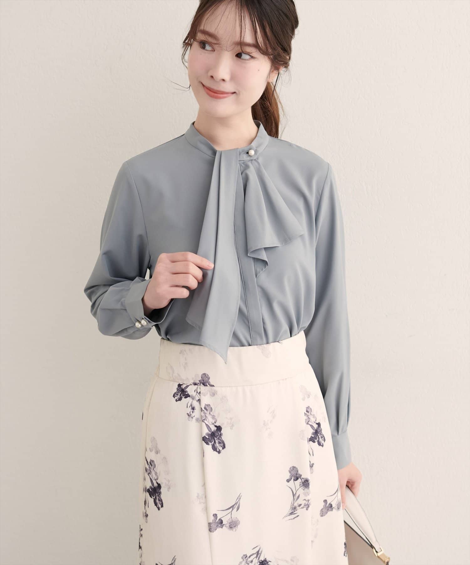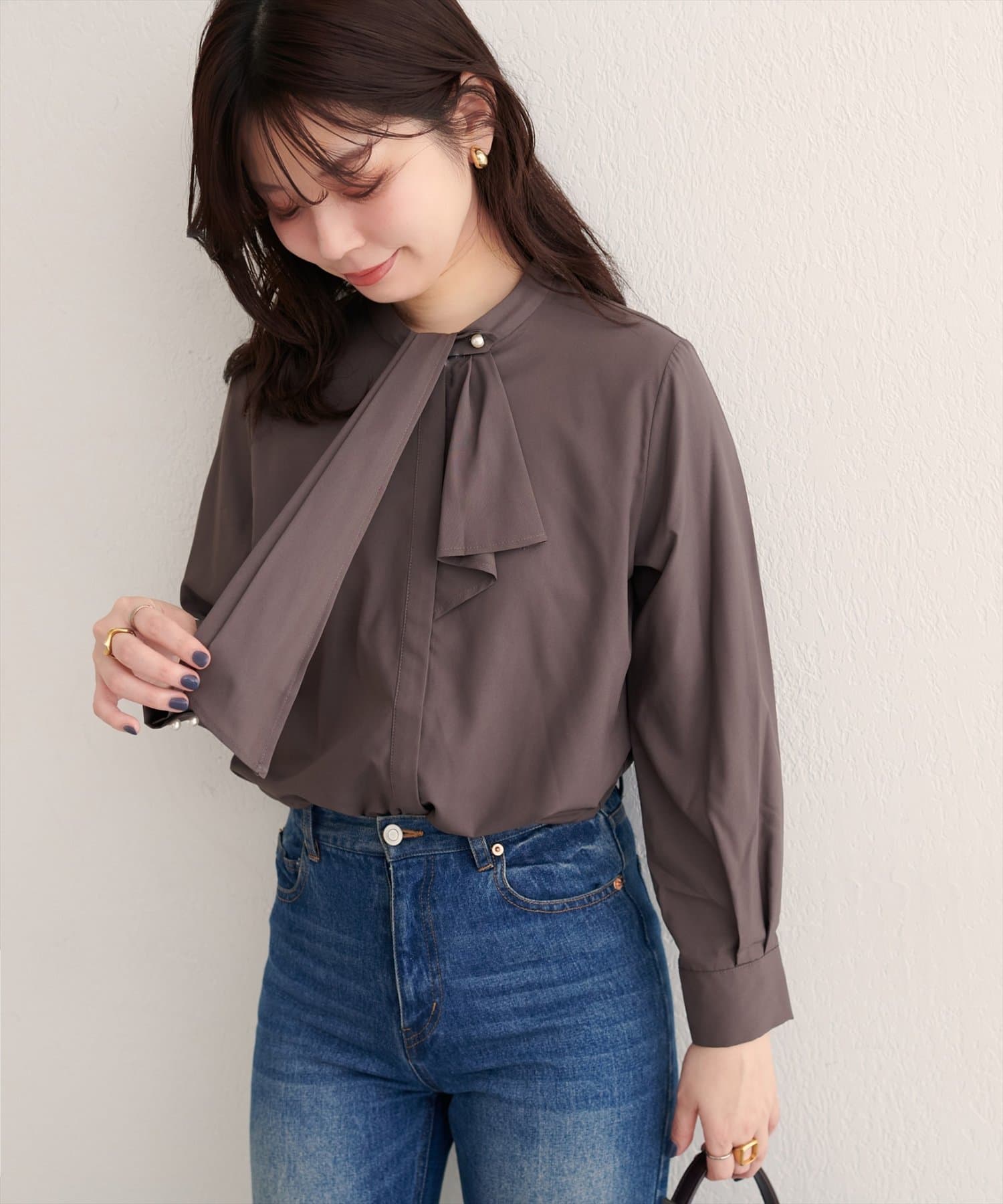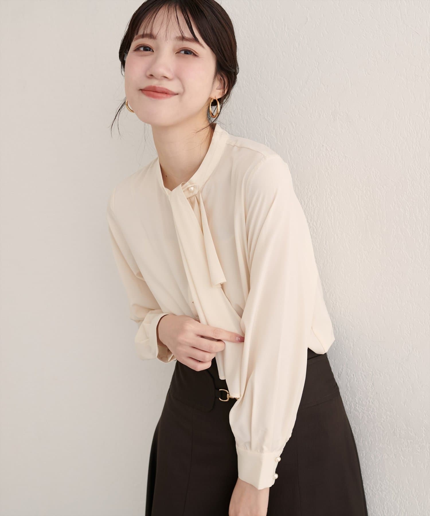ドレープになったスカーフタイのデザインが特徴のお上品ブラウス。