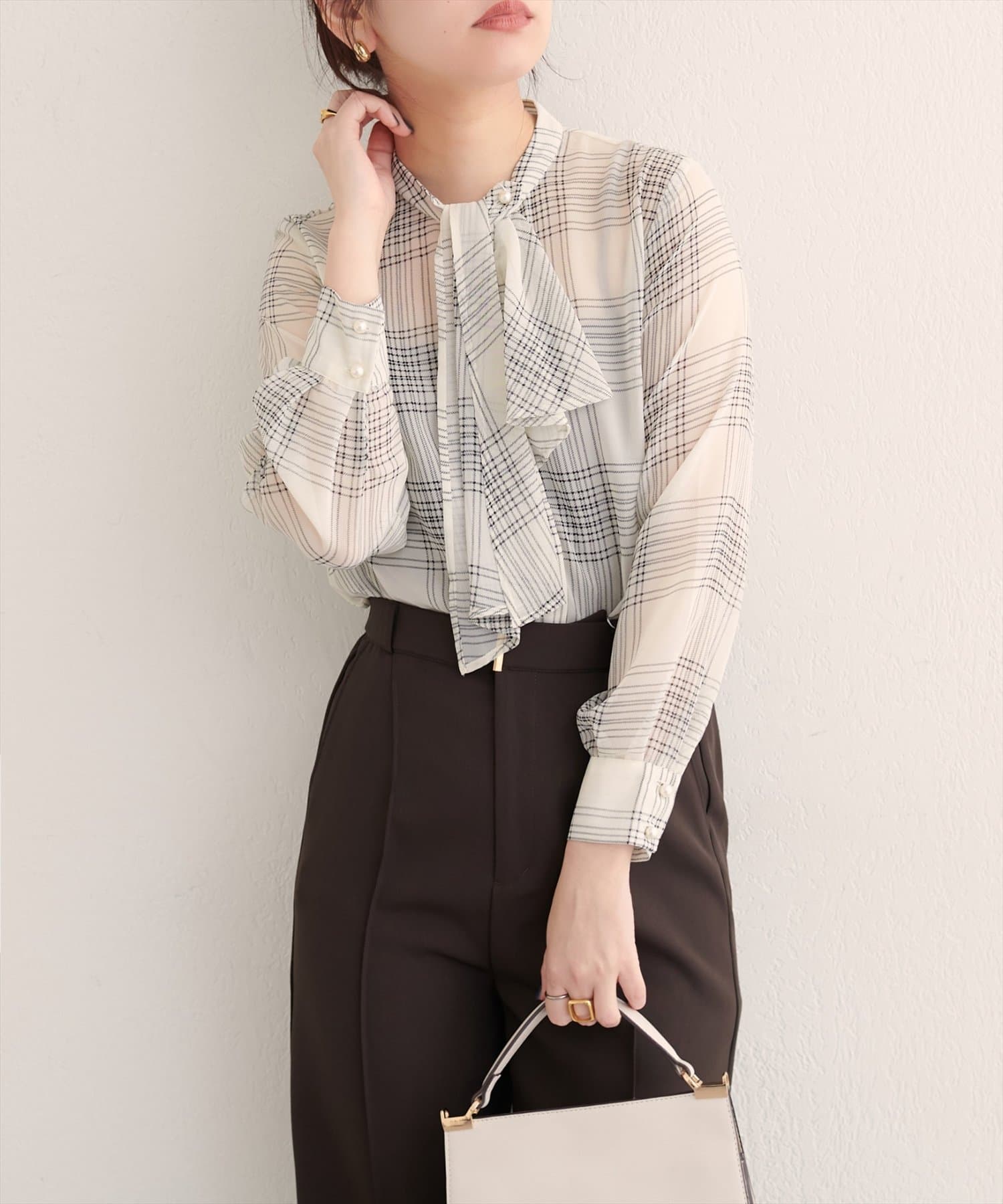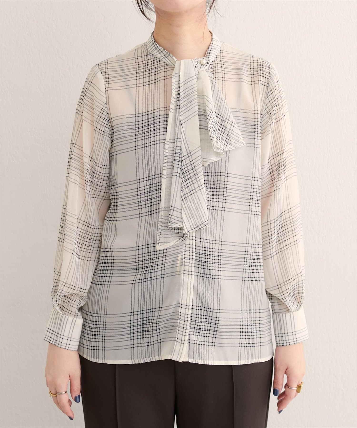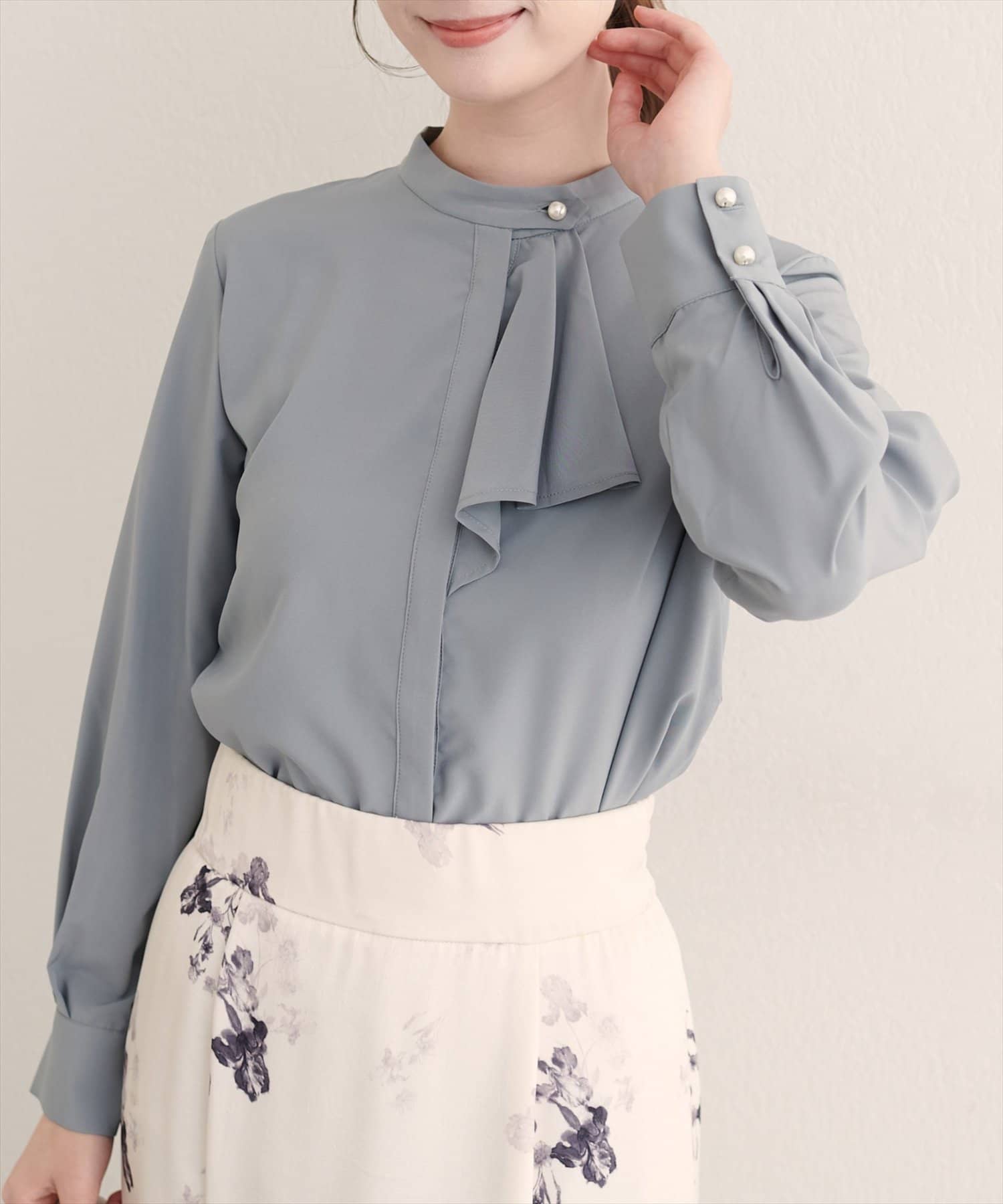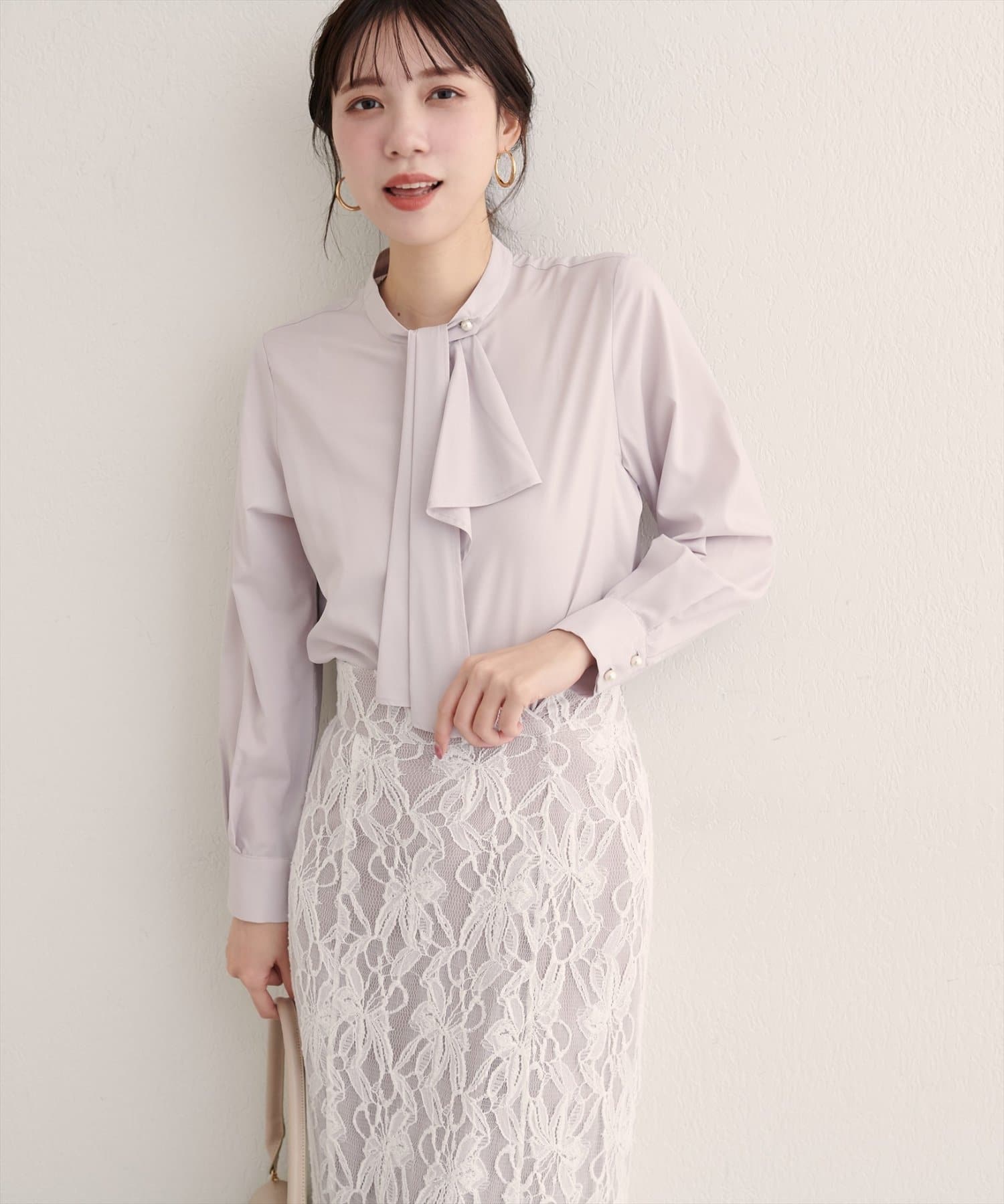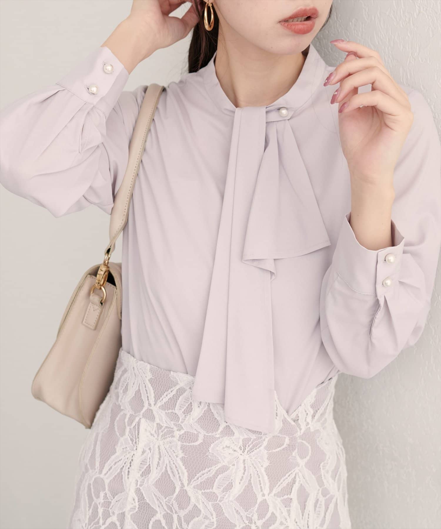 ドレープになったスカーフタイのデザインが特徴のお上品ブラウス。