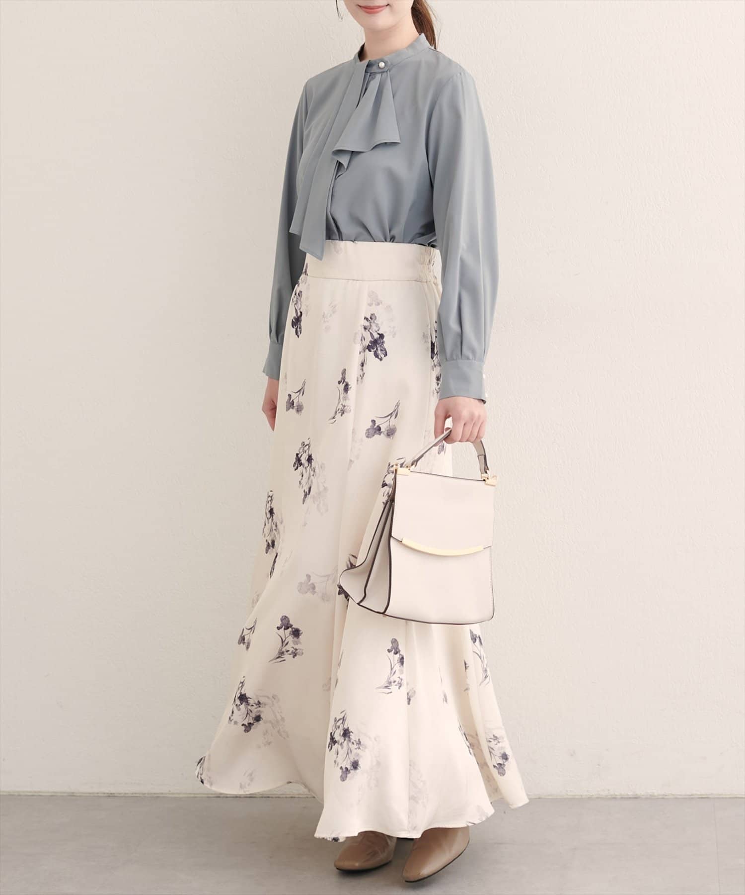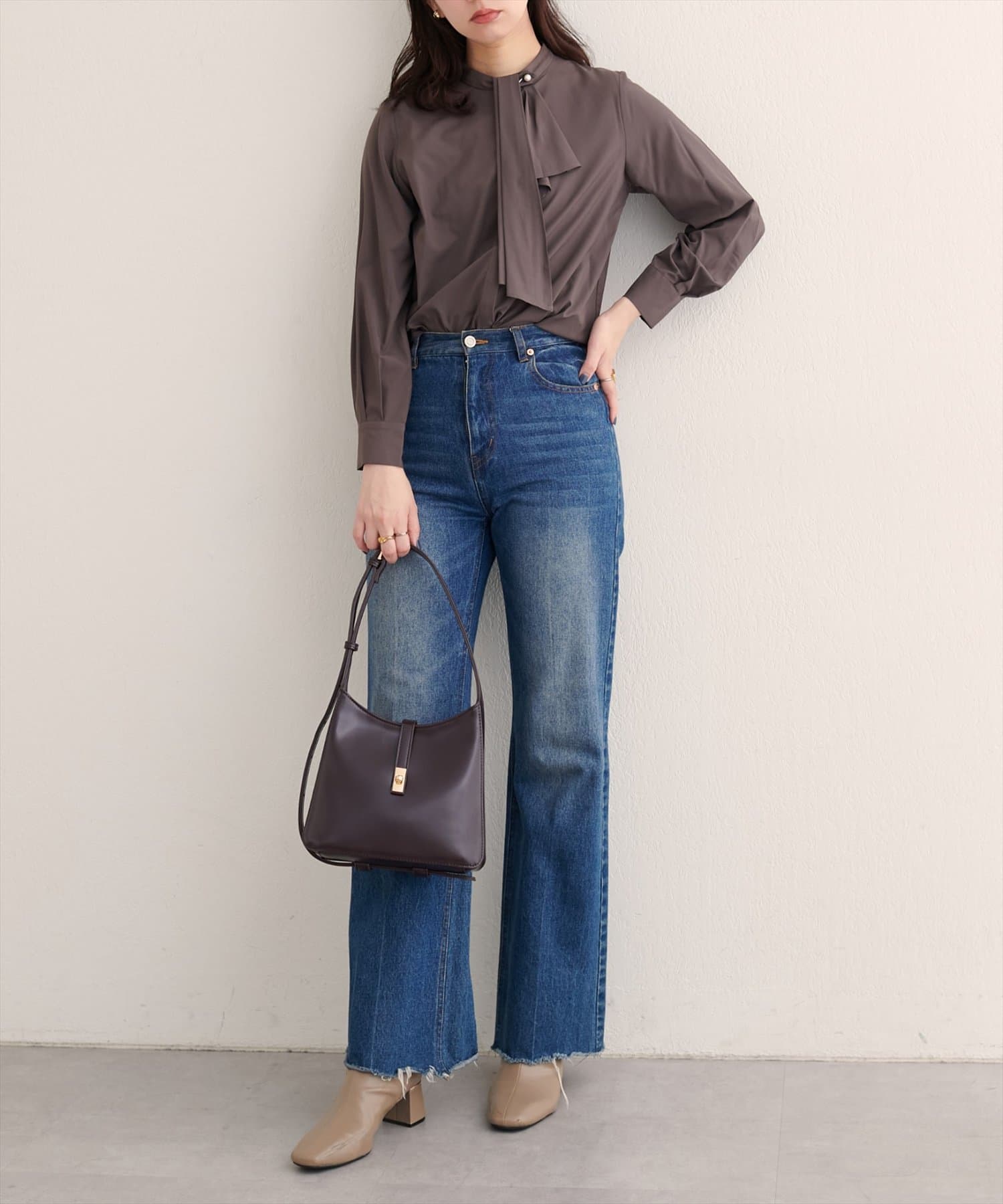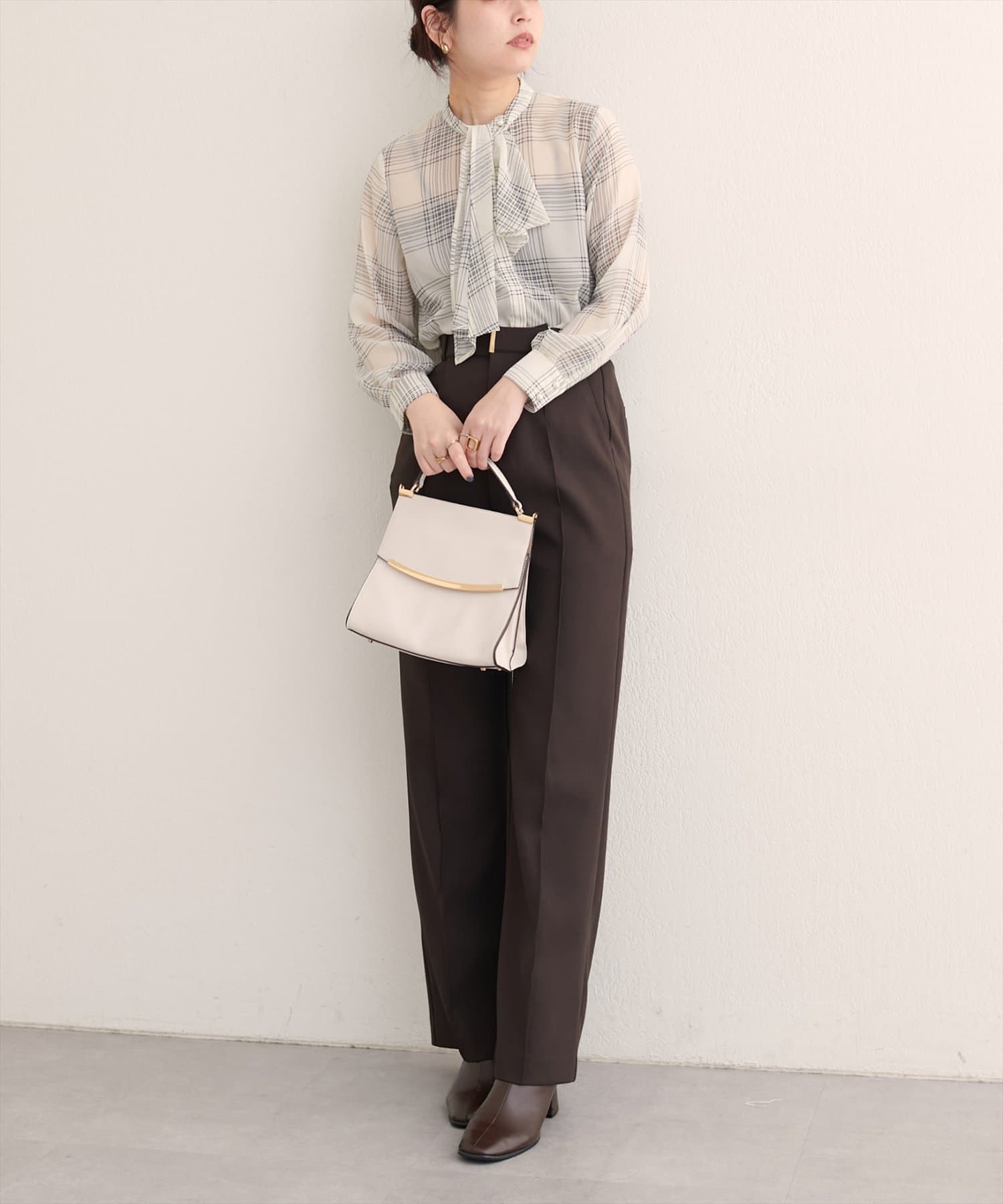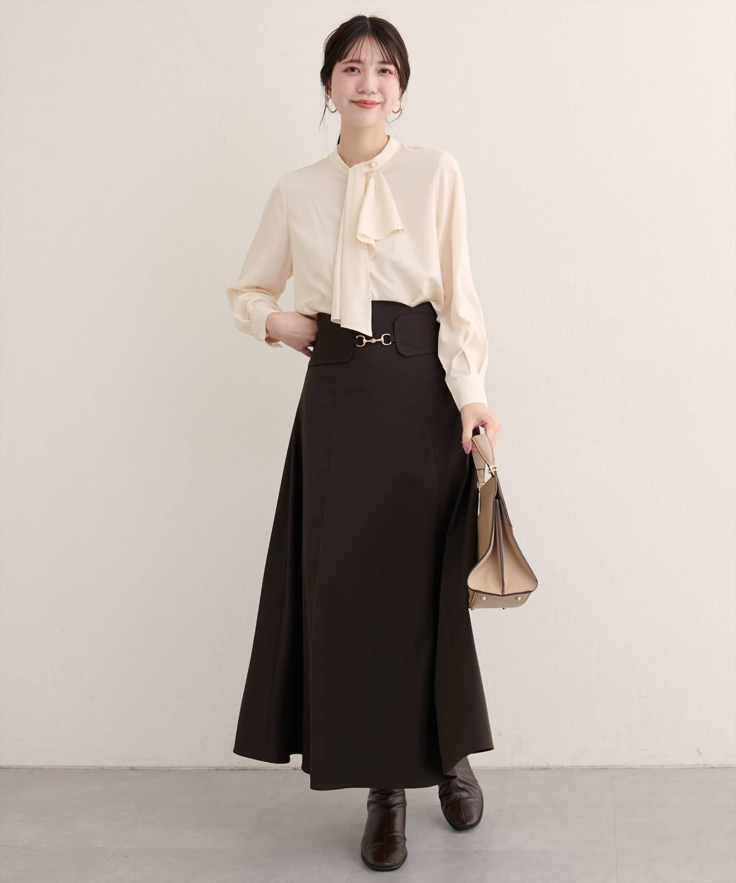 ブラウスがさらりとしている分、ボトムは厚みのあるアイテムを合わせて素材感にメリハリを付けるのがおすすめです。