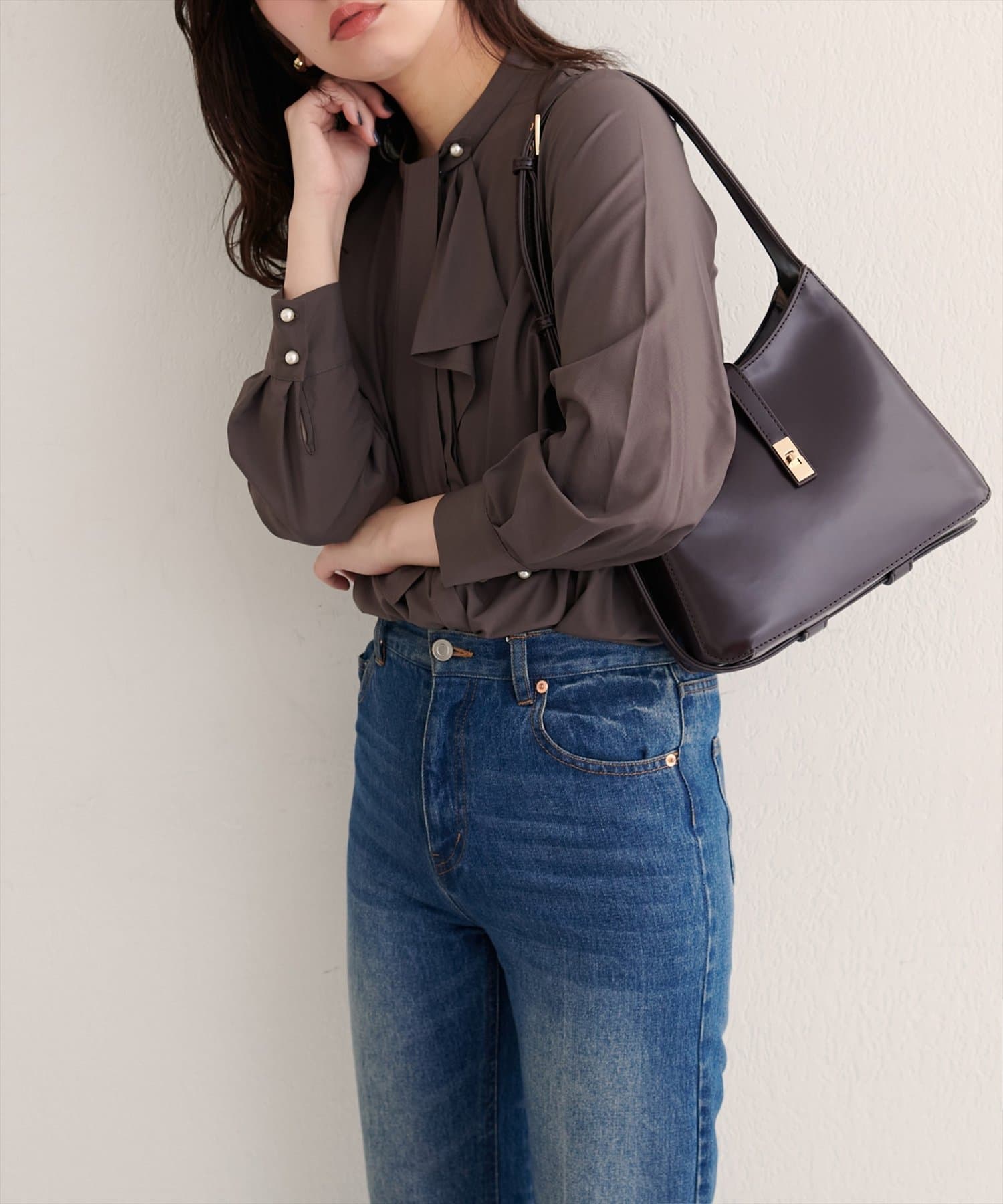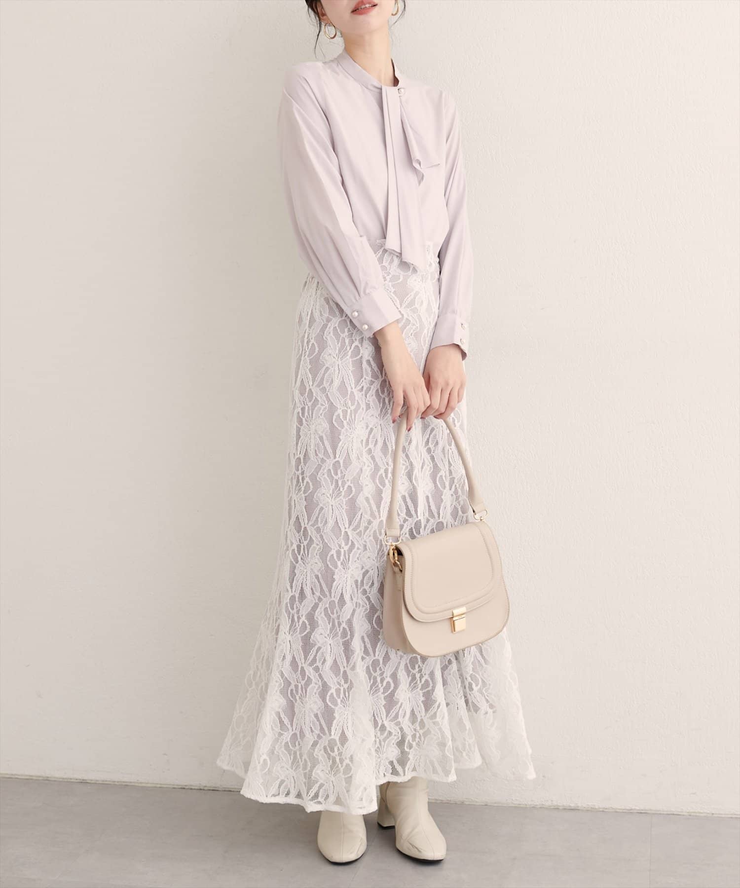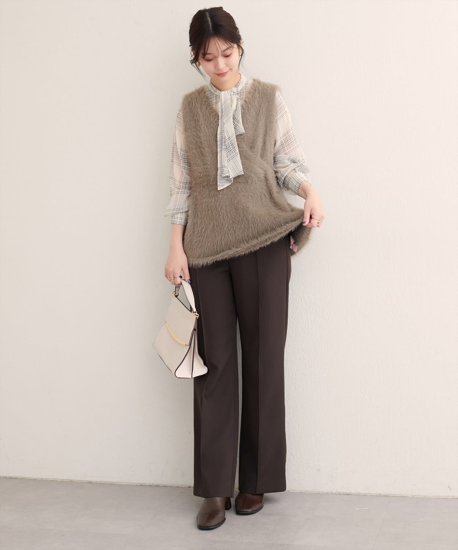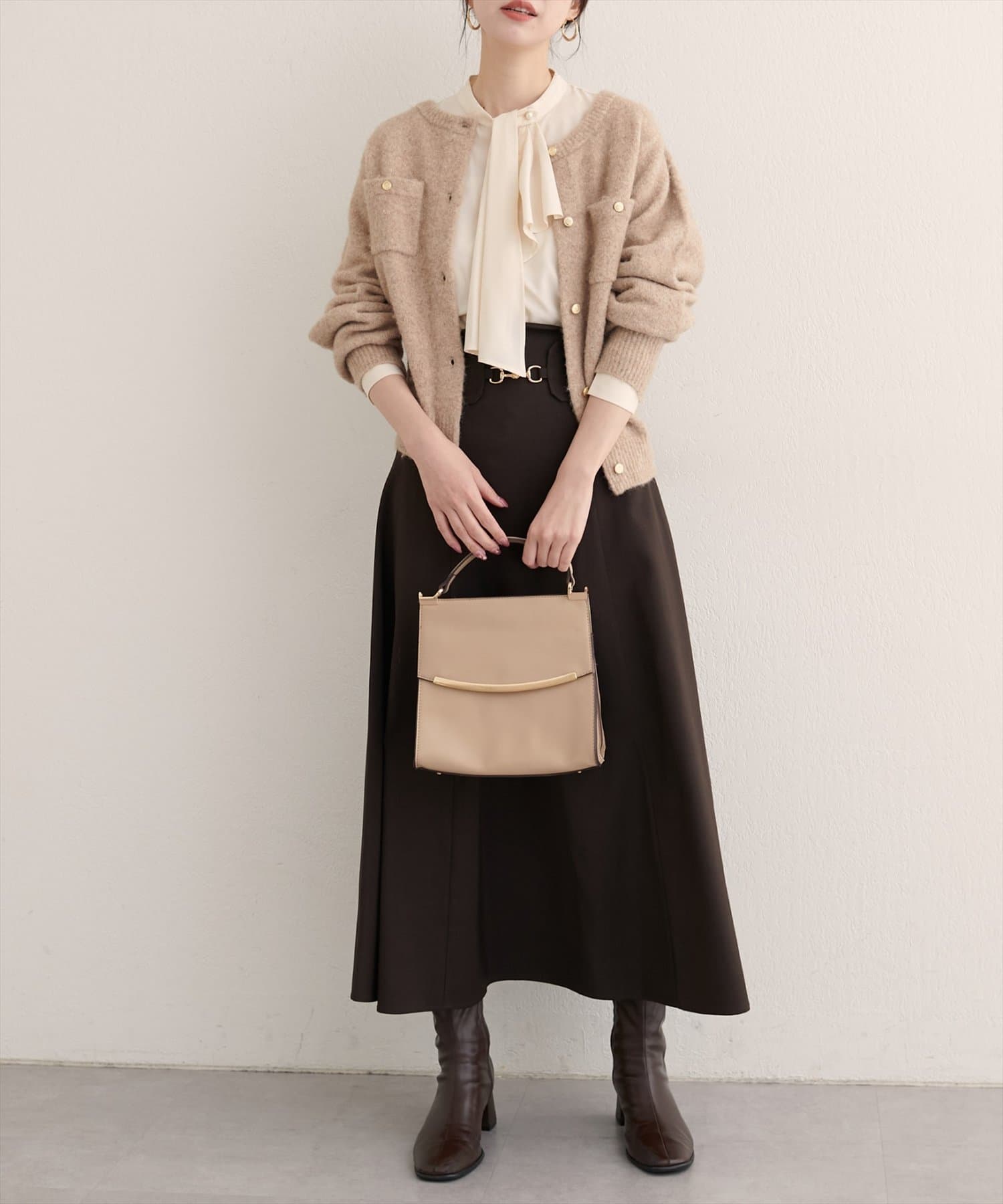 ブラウスがさらりとしている分、ボトムは厚みのあるアイテムを合わせて素材感にメリハリを付けるのがおすすめです。