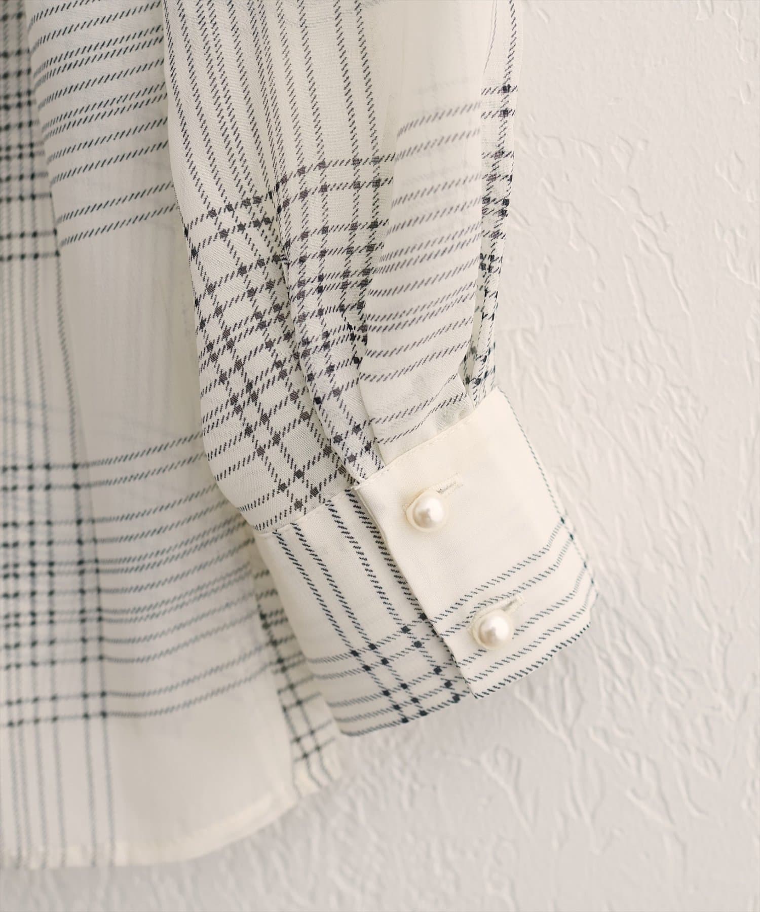 襟元と袖口にあしらわれた、さりげないパール釦もポイントです。