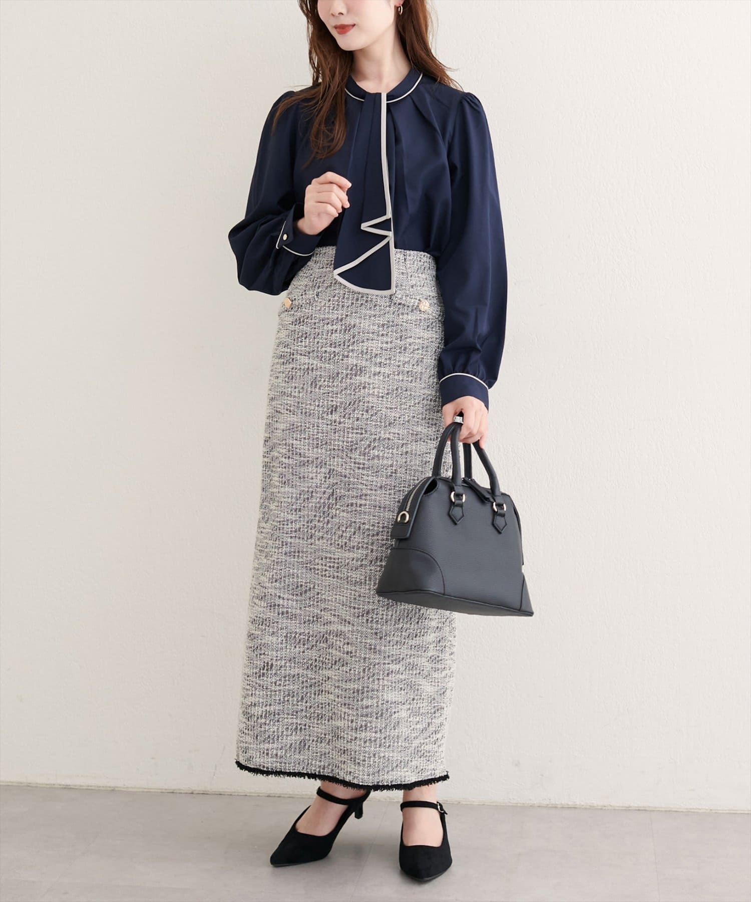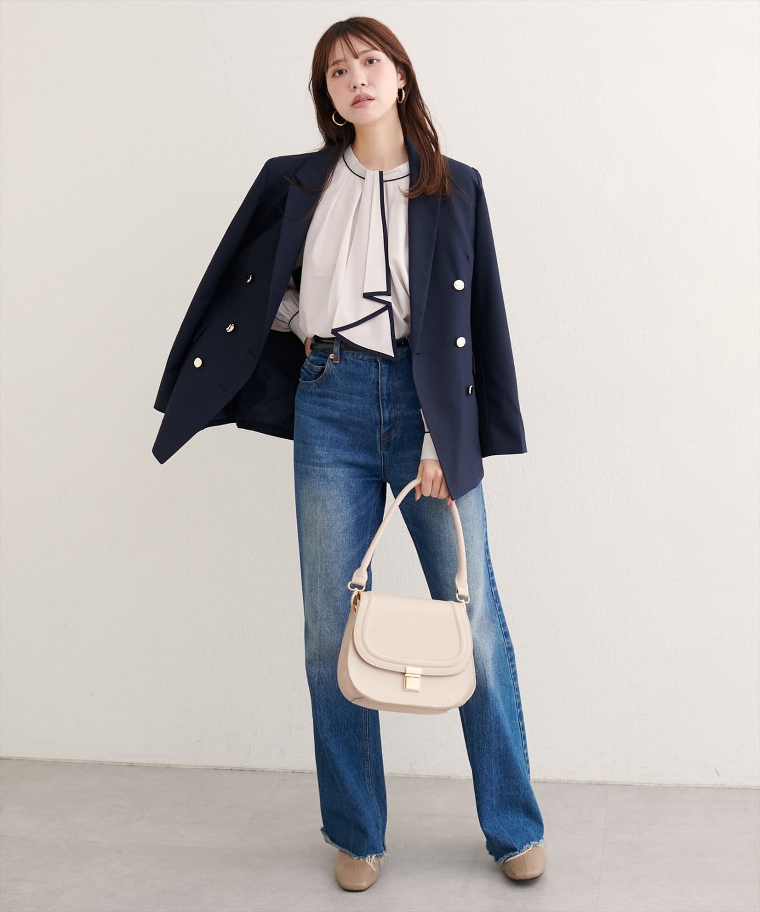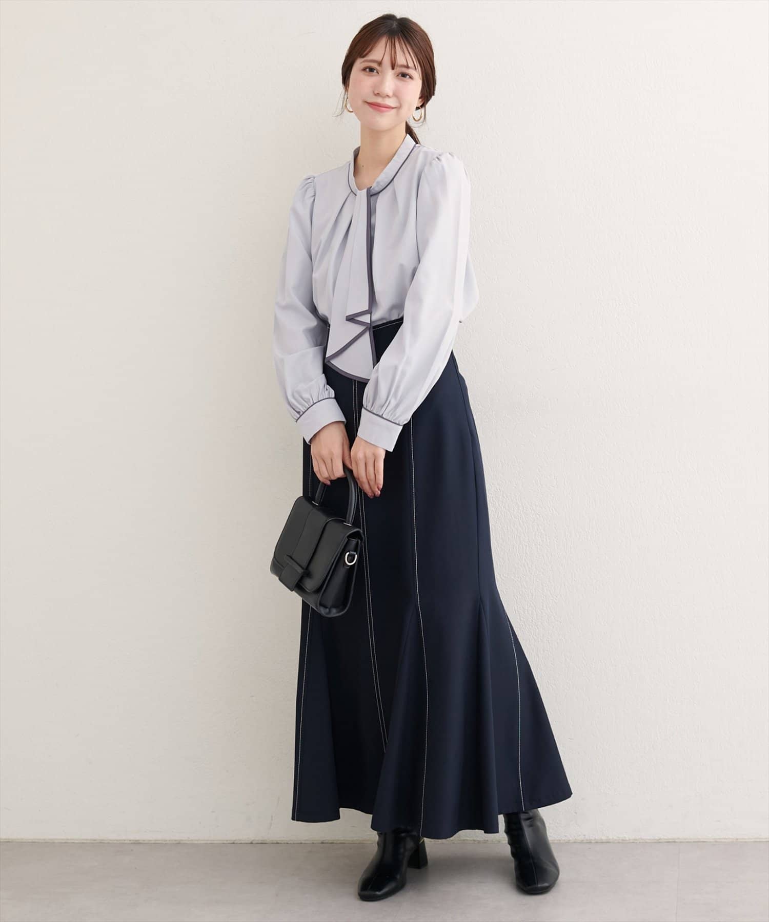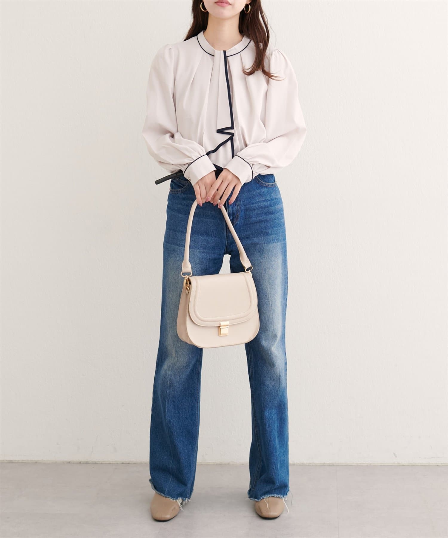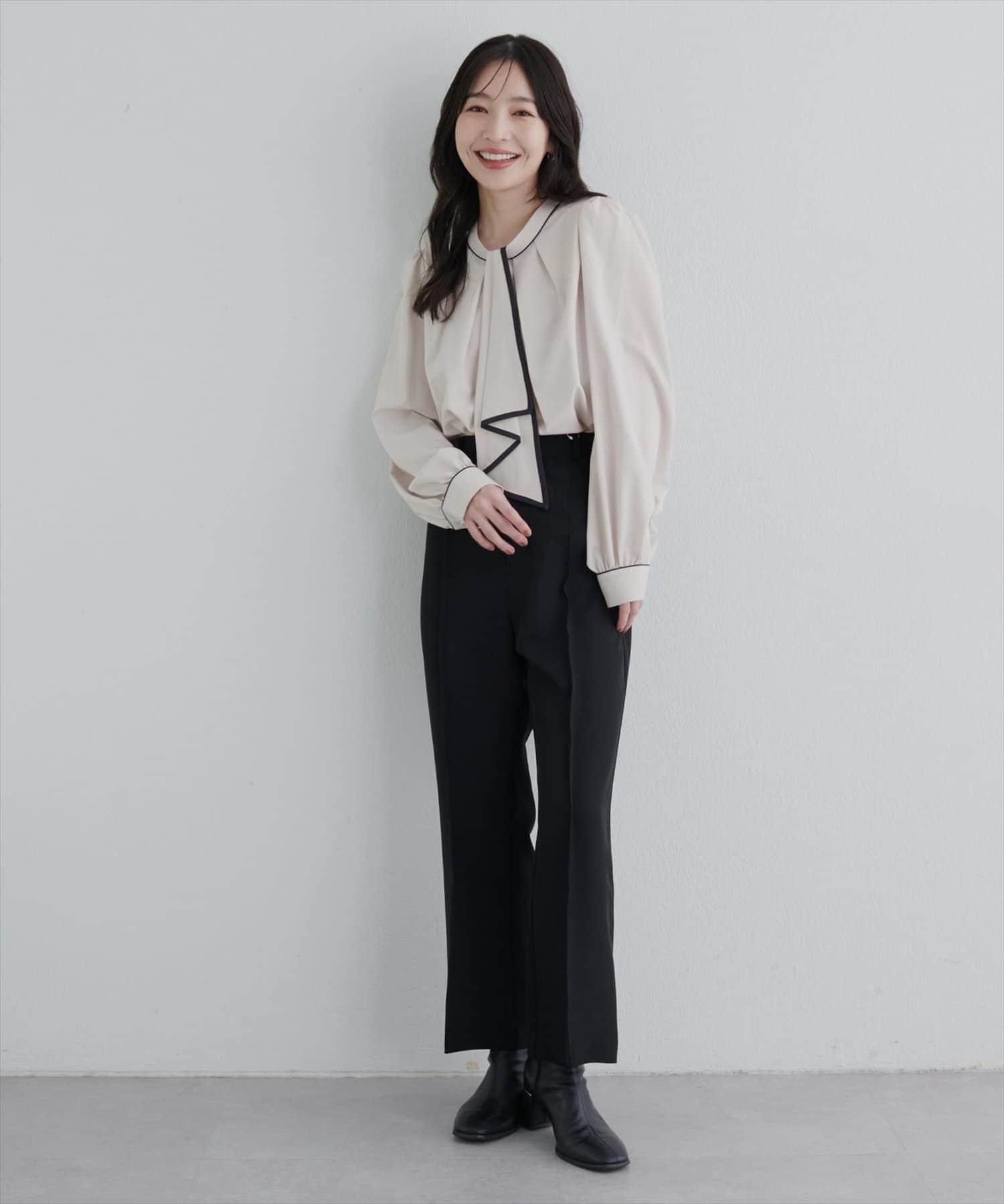 ブラウスがさらりとしている分、ボトムは厚みのあるアイテムを合わせて素材感にメリハリを付けるのがおすすめです。