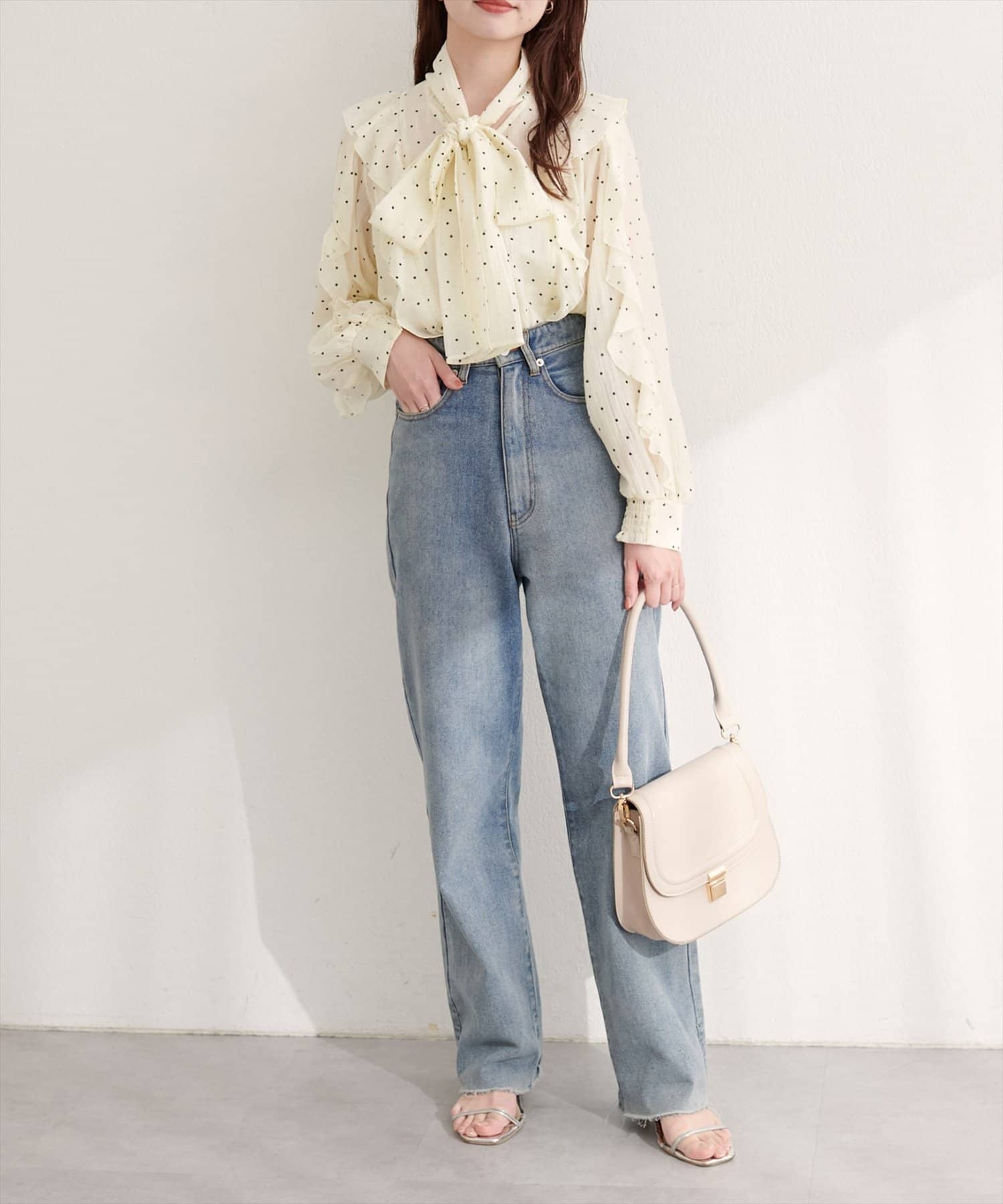 トップスの華やかさを活かし、あえてデニムでカジュアルに落とし込んだコーディネートもおすすめです。