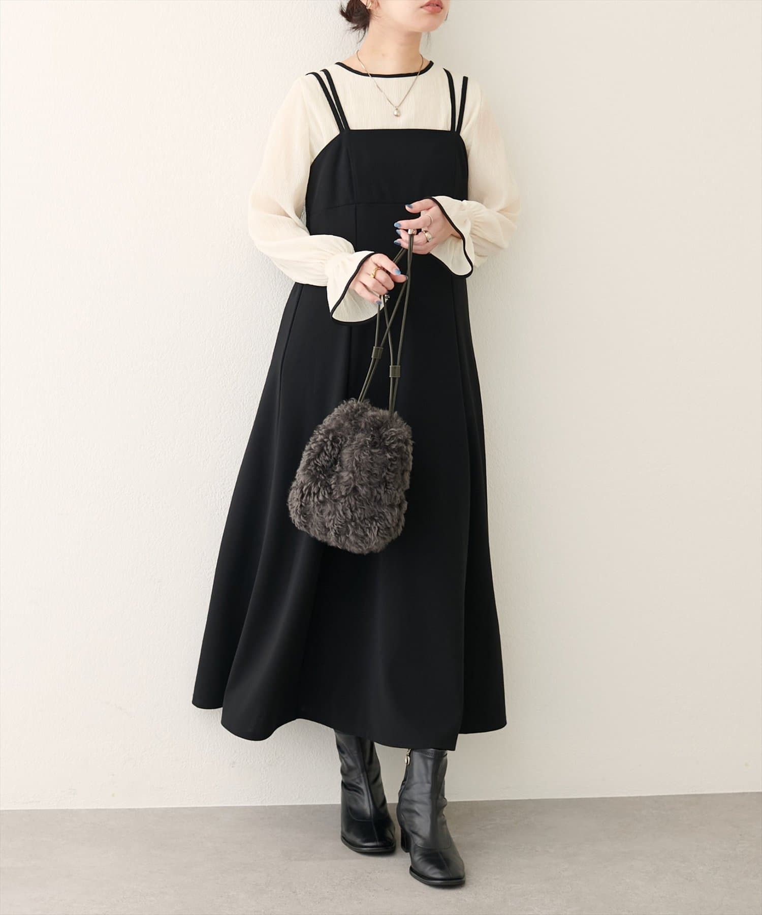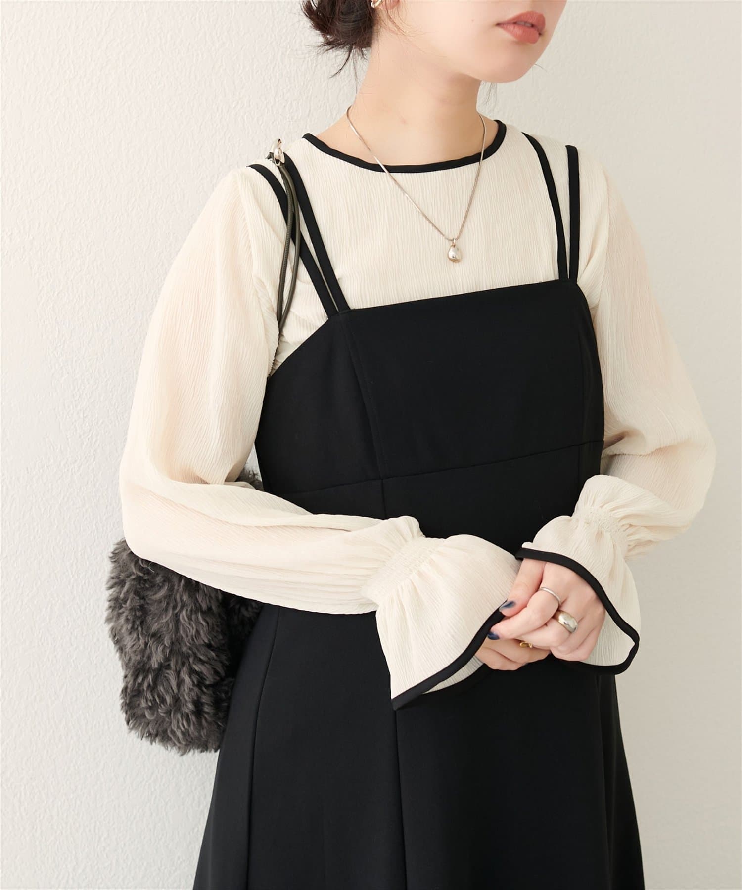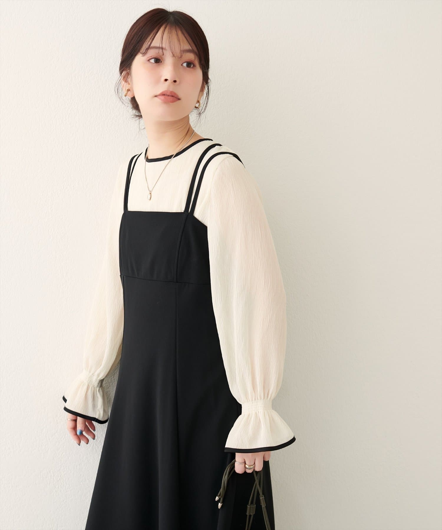 ネックラインと袖口には、上品なパイピングを施し、全体を引き締めるアクセントに。