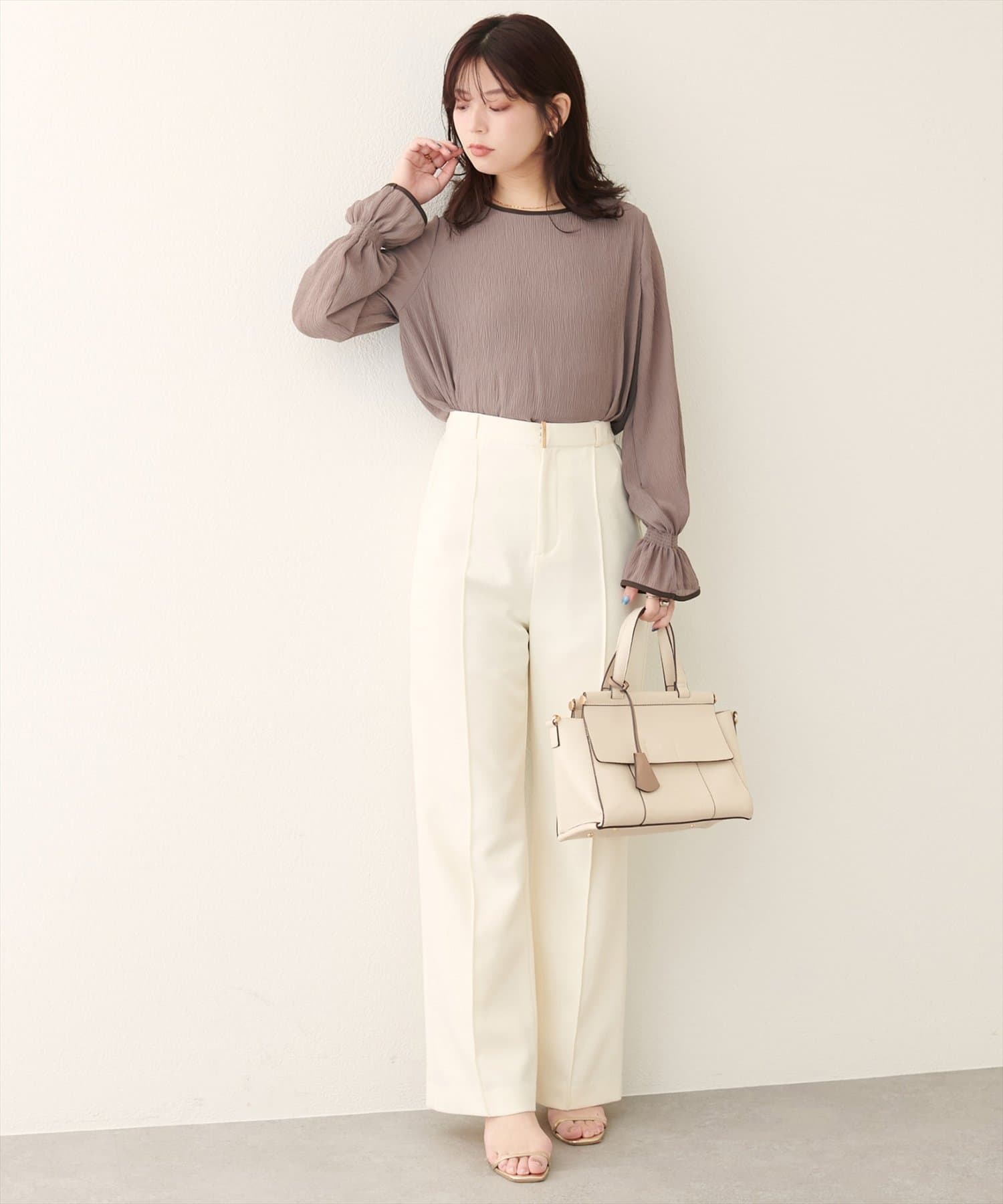 ブラウスの持つ上品さを活かして、きれいめなスタイリングに。