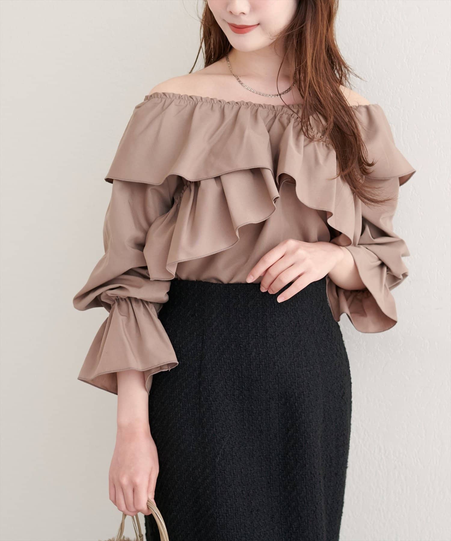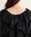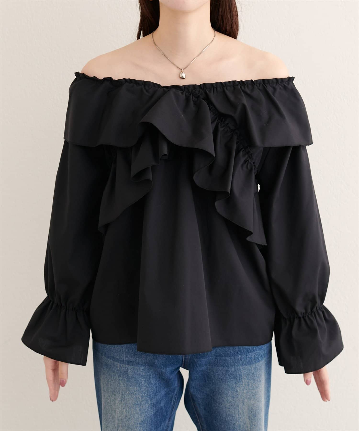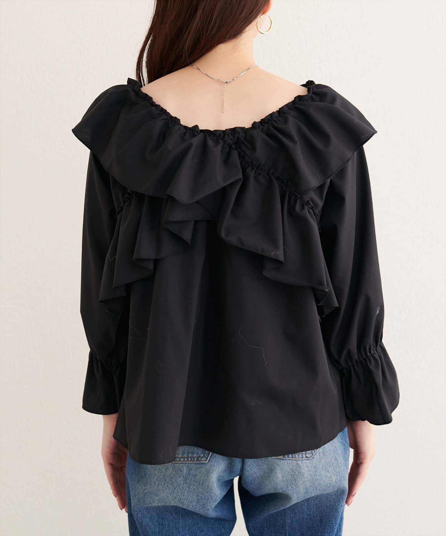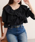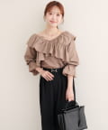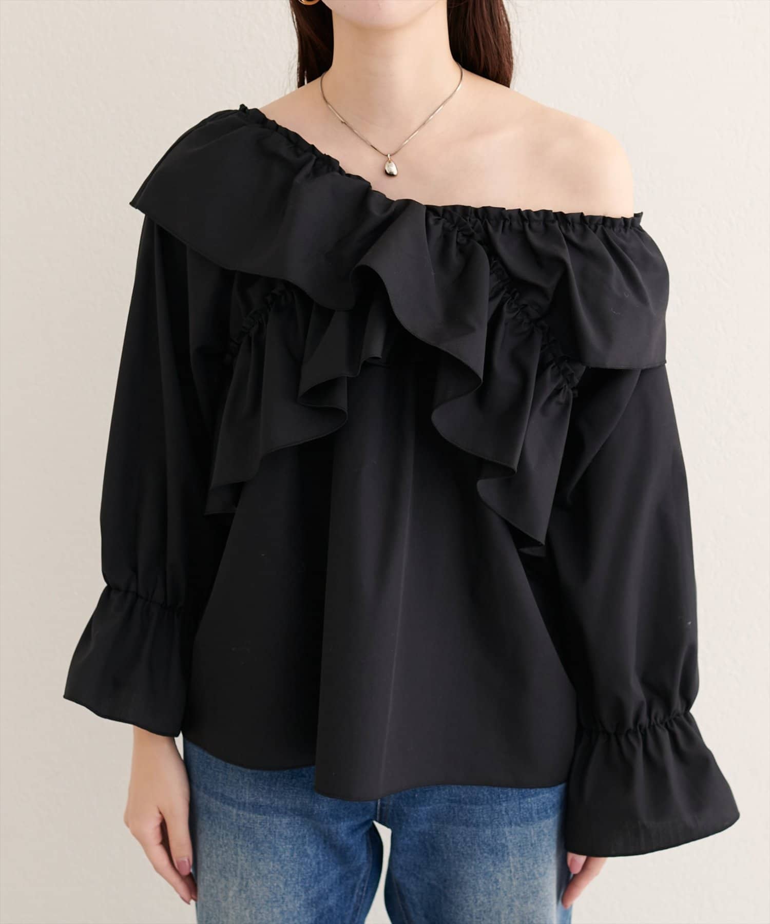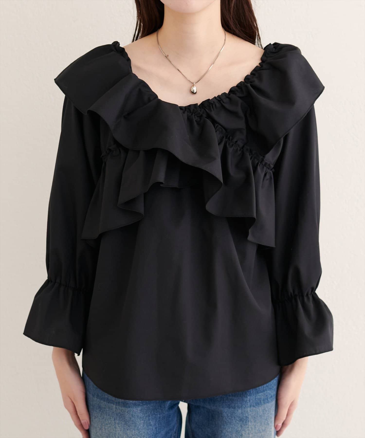 肩から胸にかけてクロスしたフリルデザインが目を惹くフェミニンブラウス。