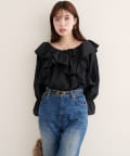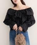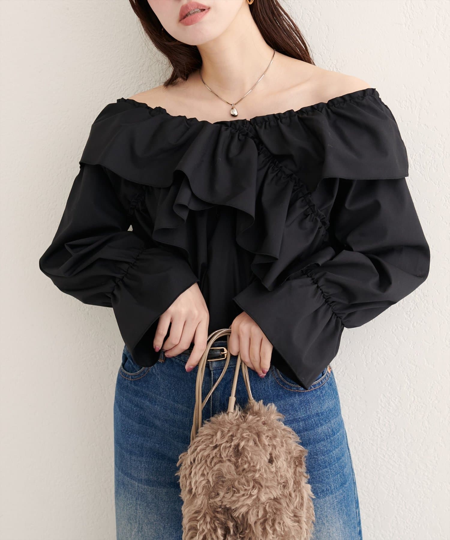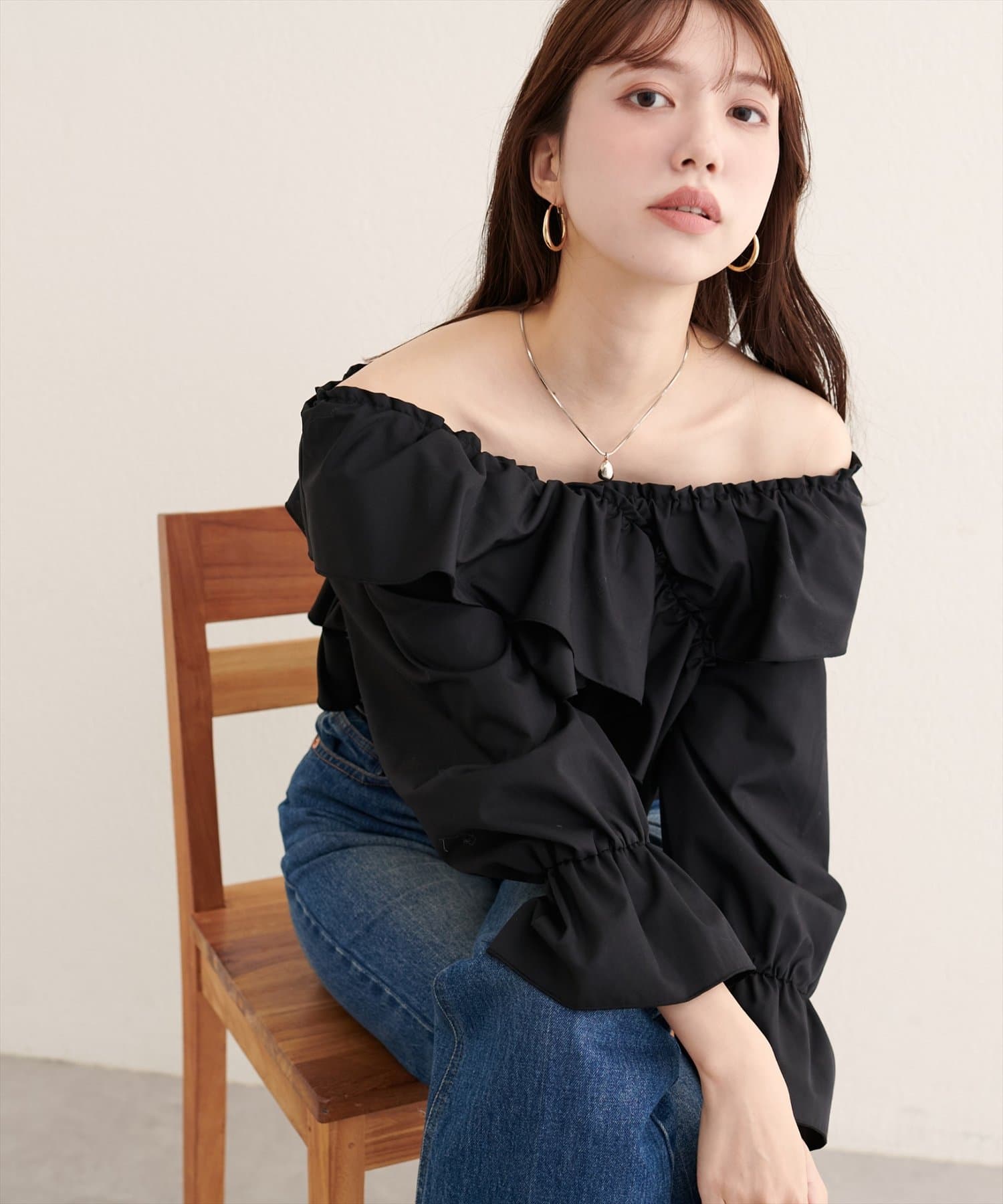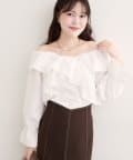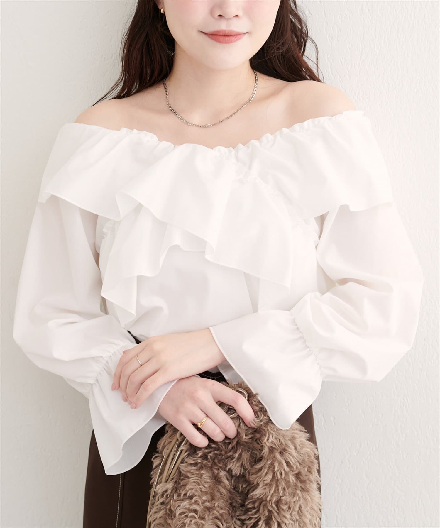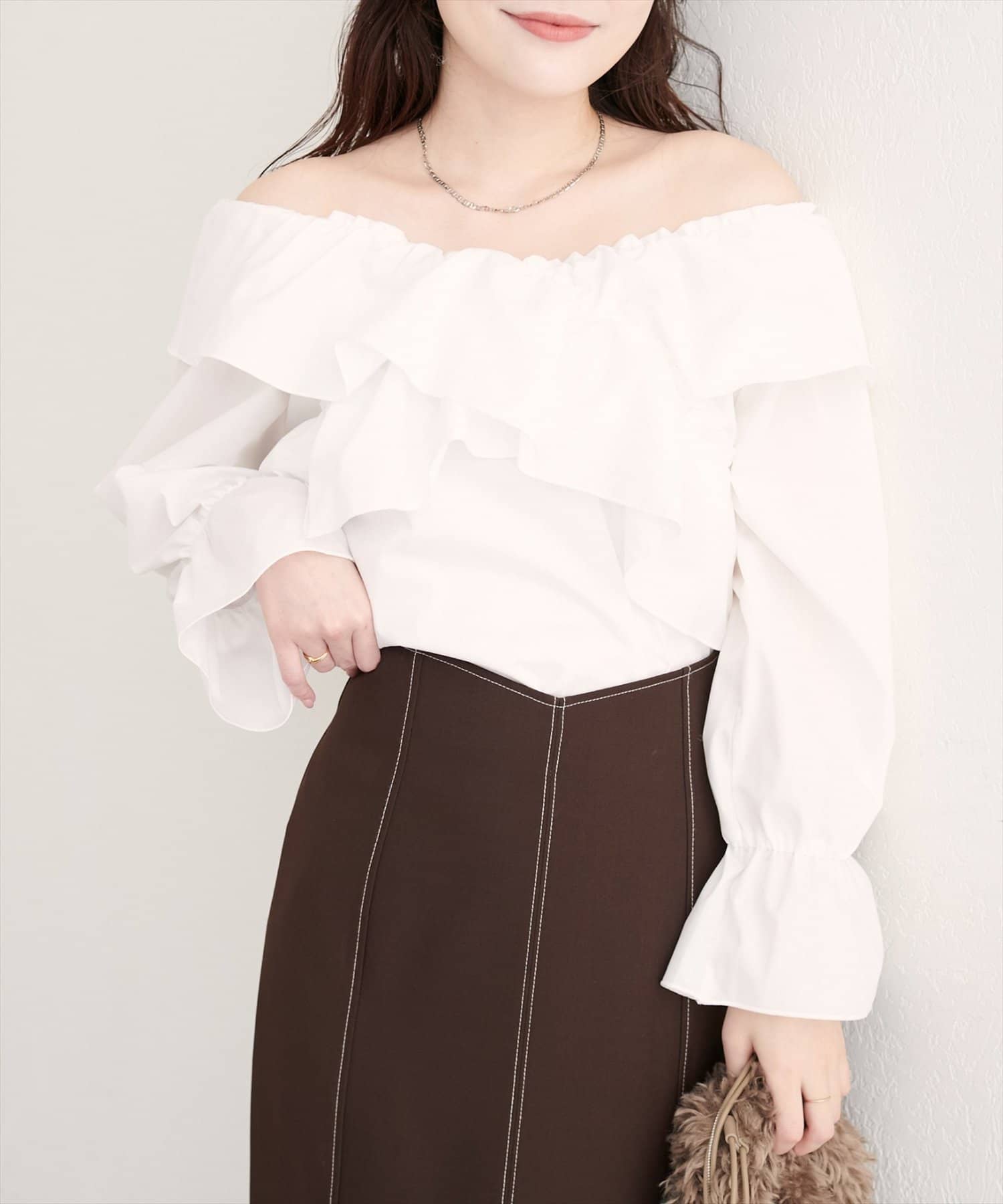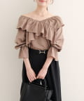 肩から胸にかけてクロスしたフリルデザインが目を惹くフェミニンブラウス。