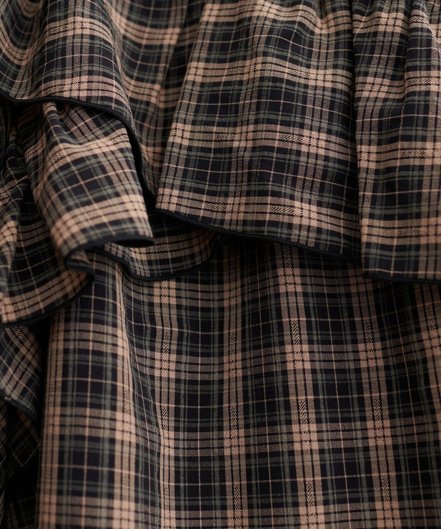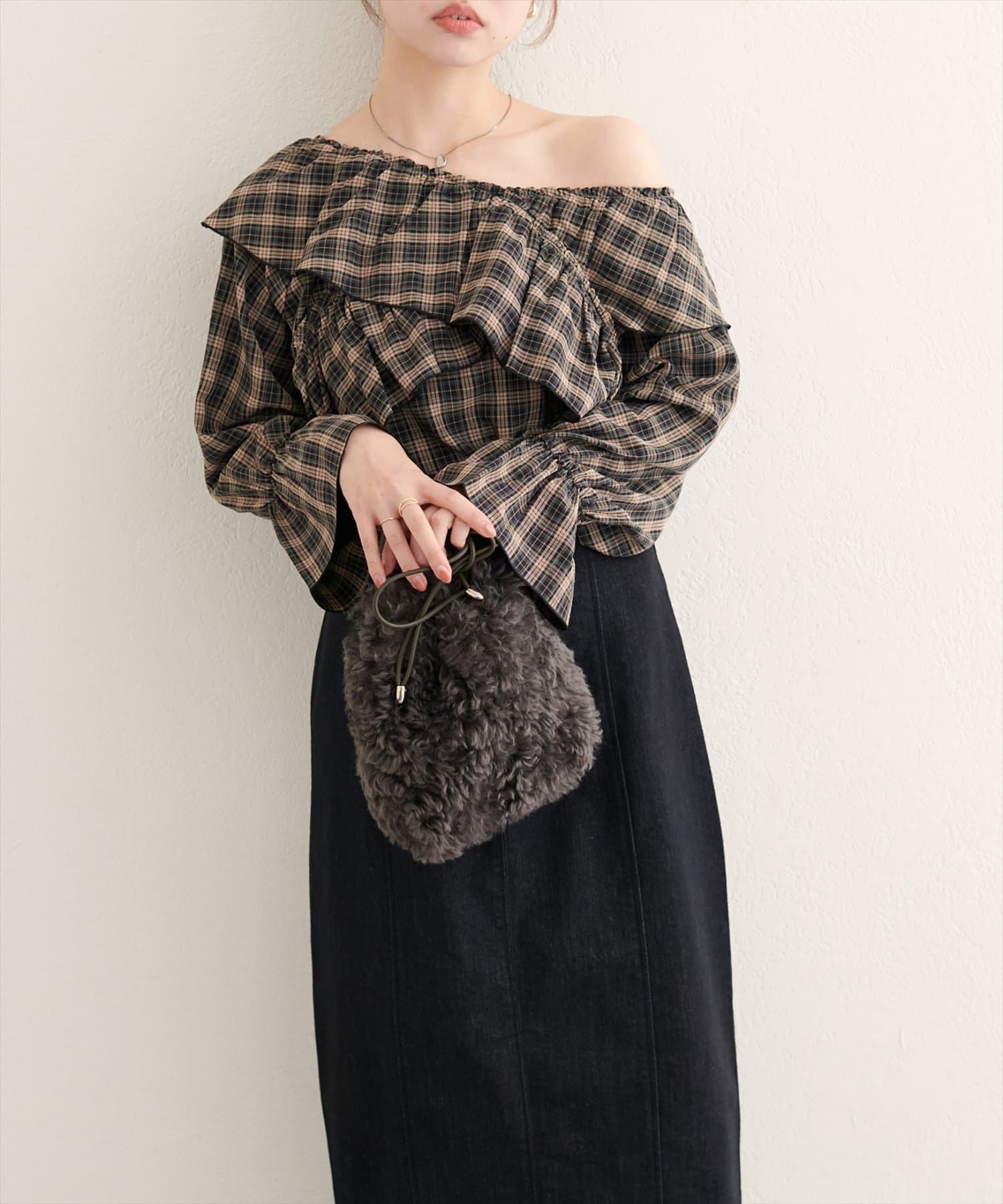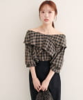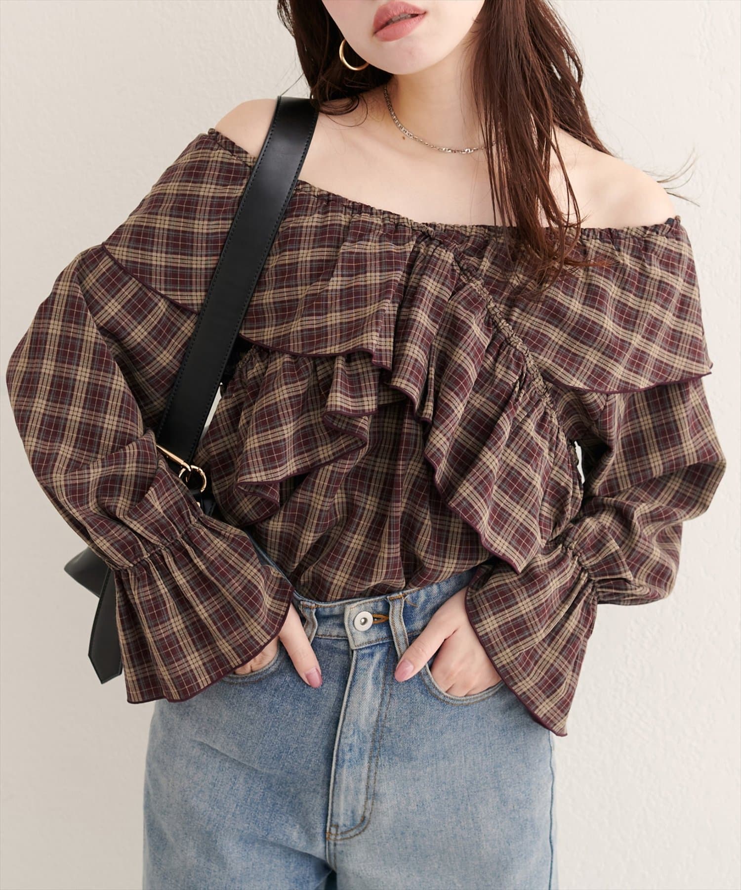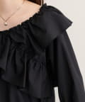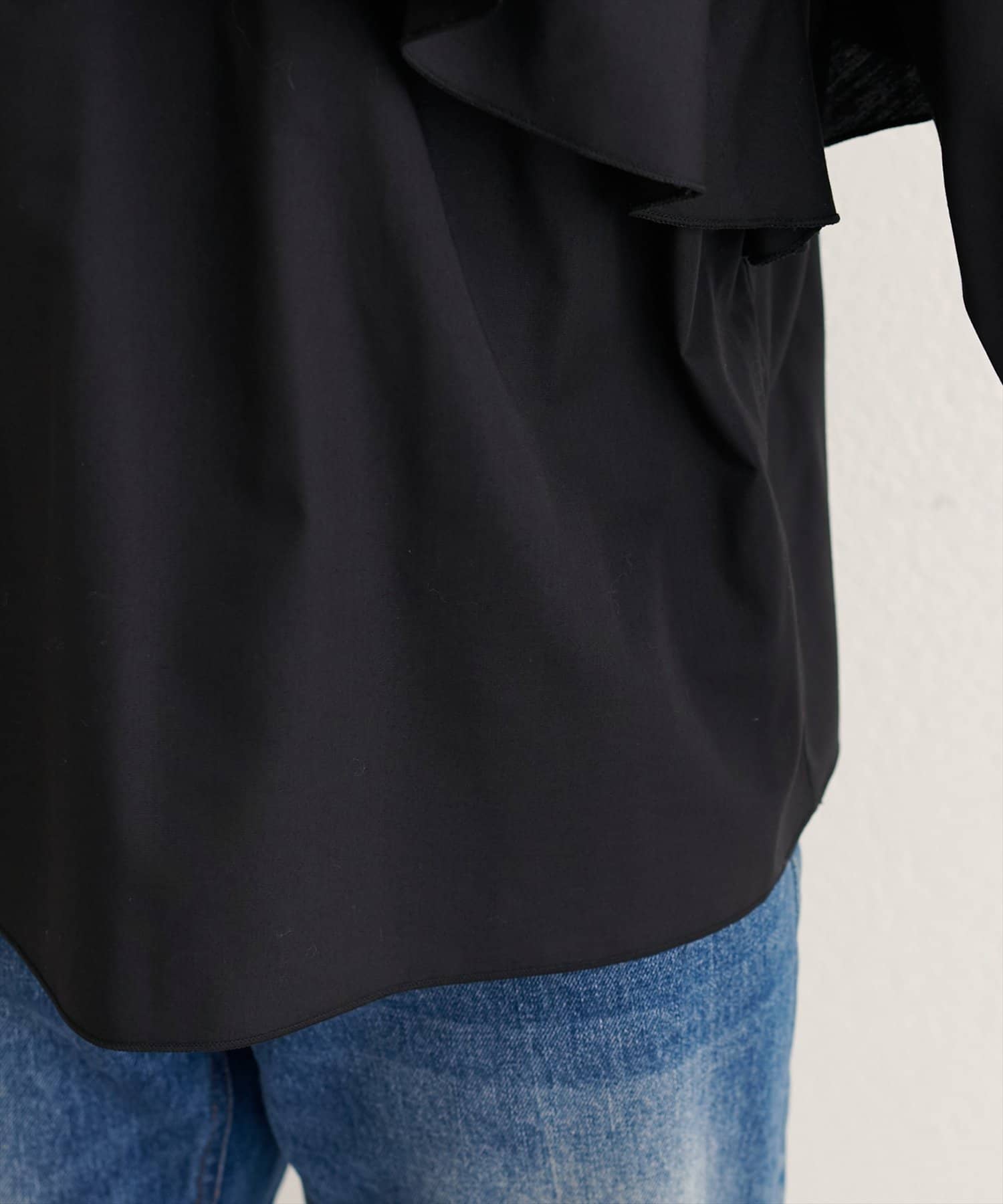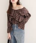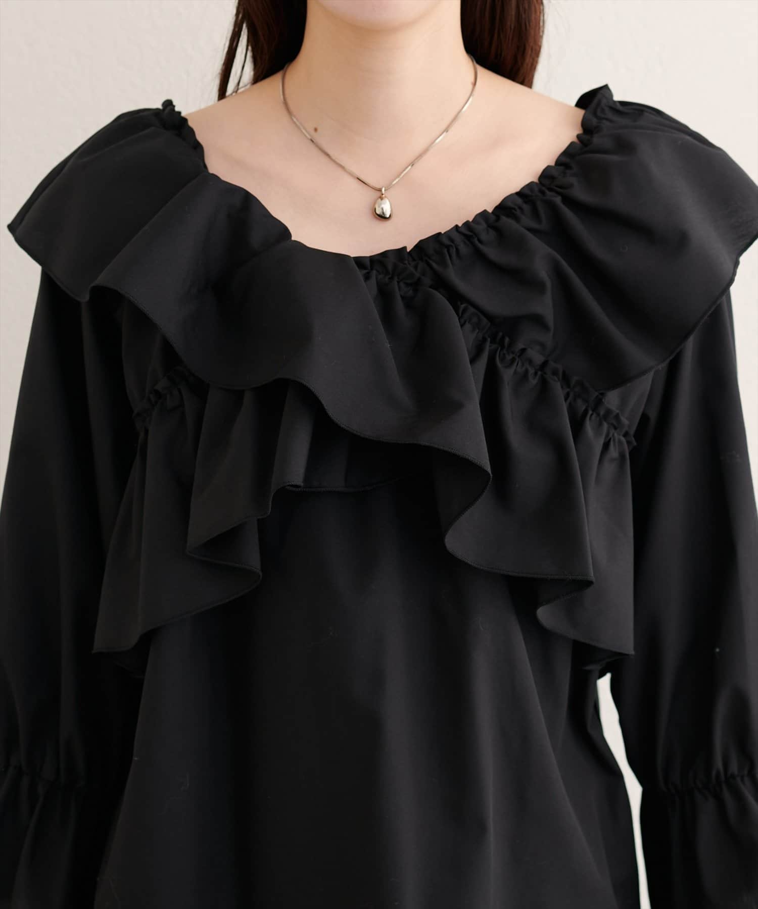 肩から胸にかけてクロスしたフリルデザインが目を惹くフェミニンブラウス。