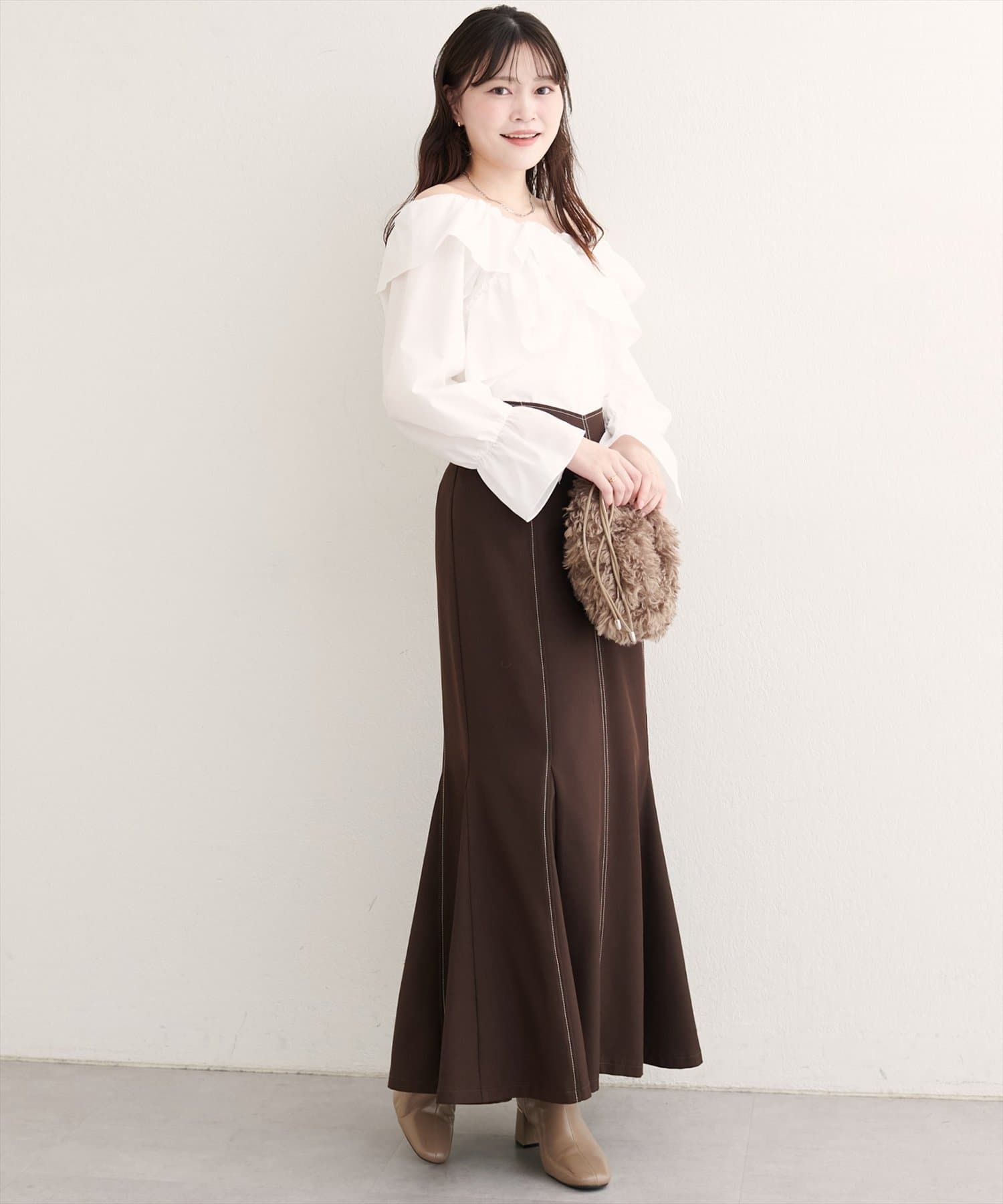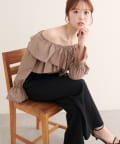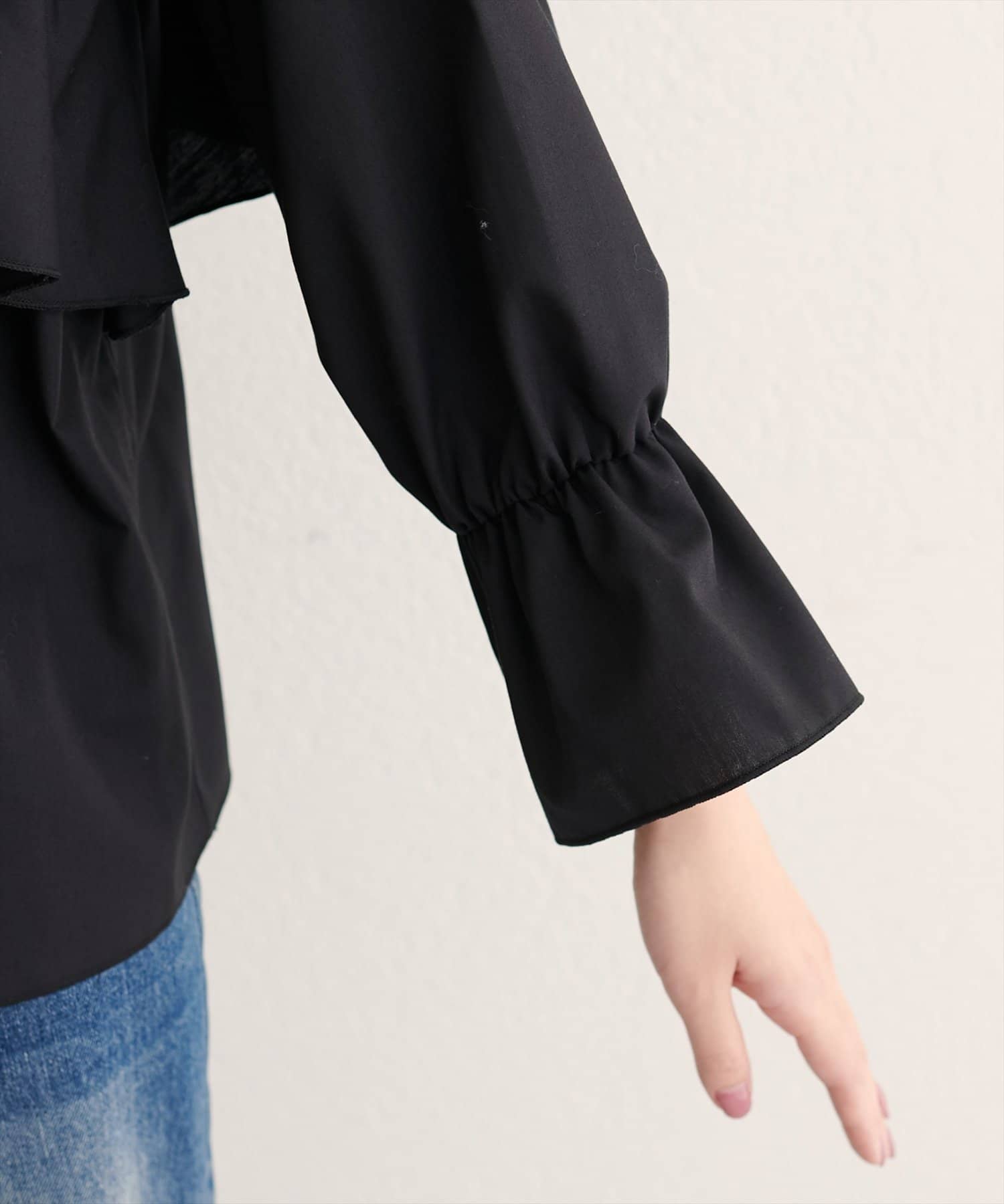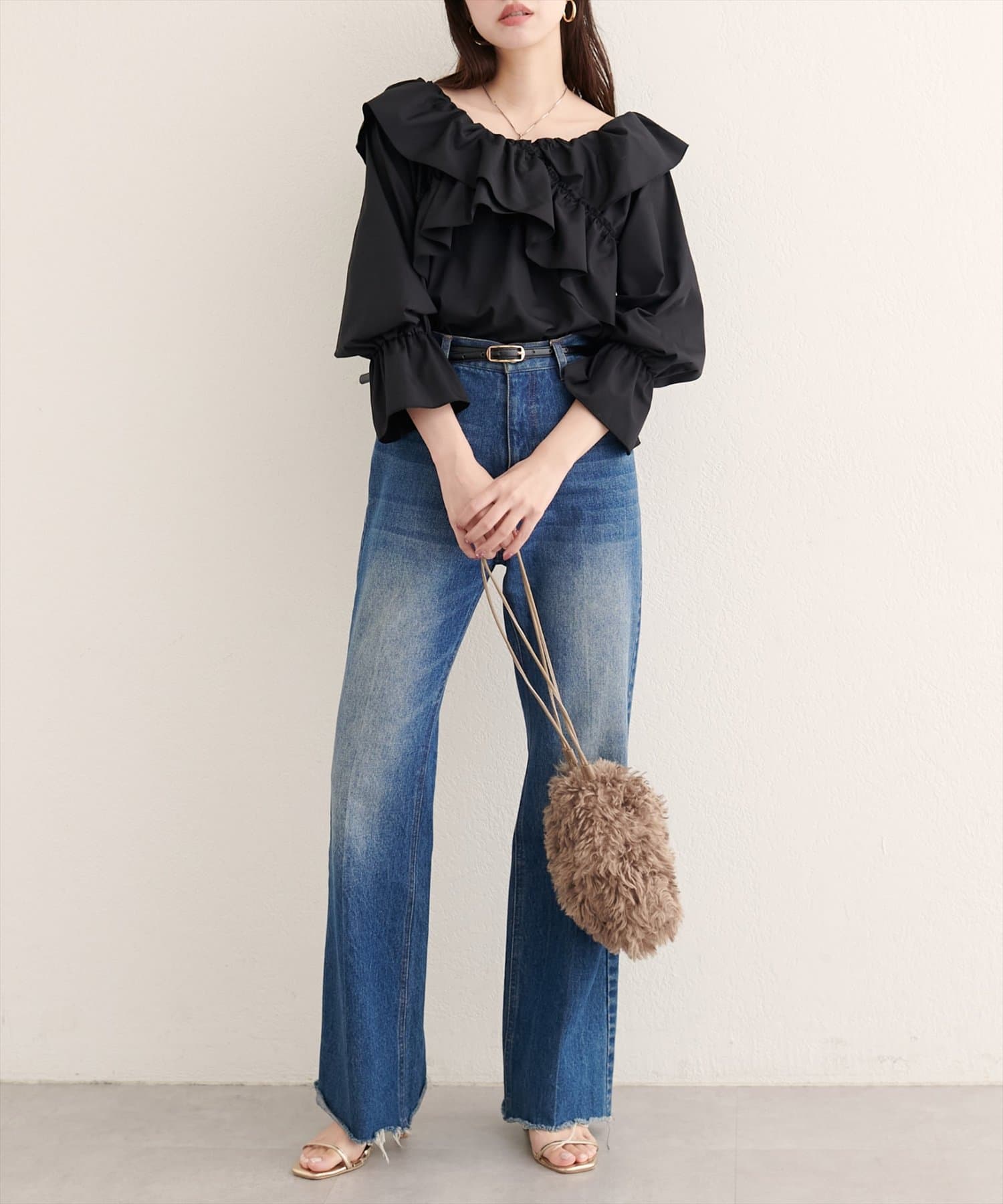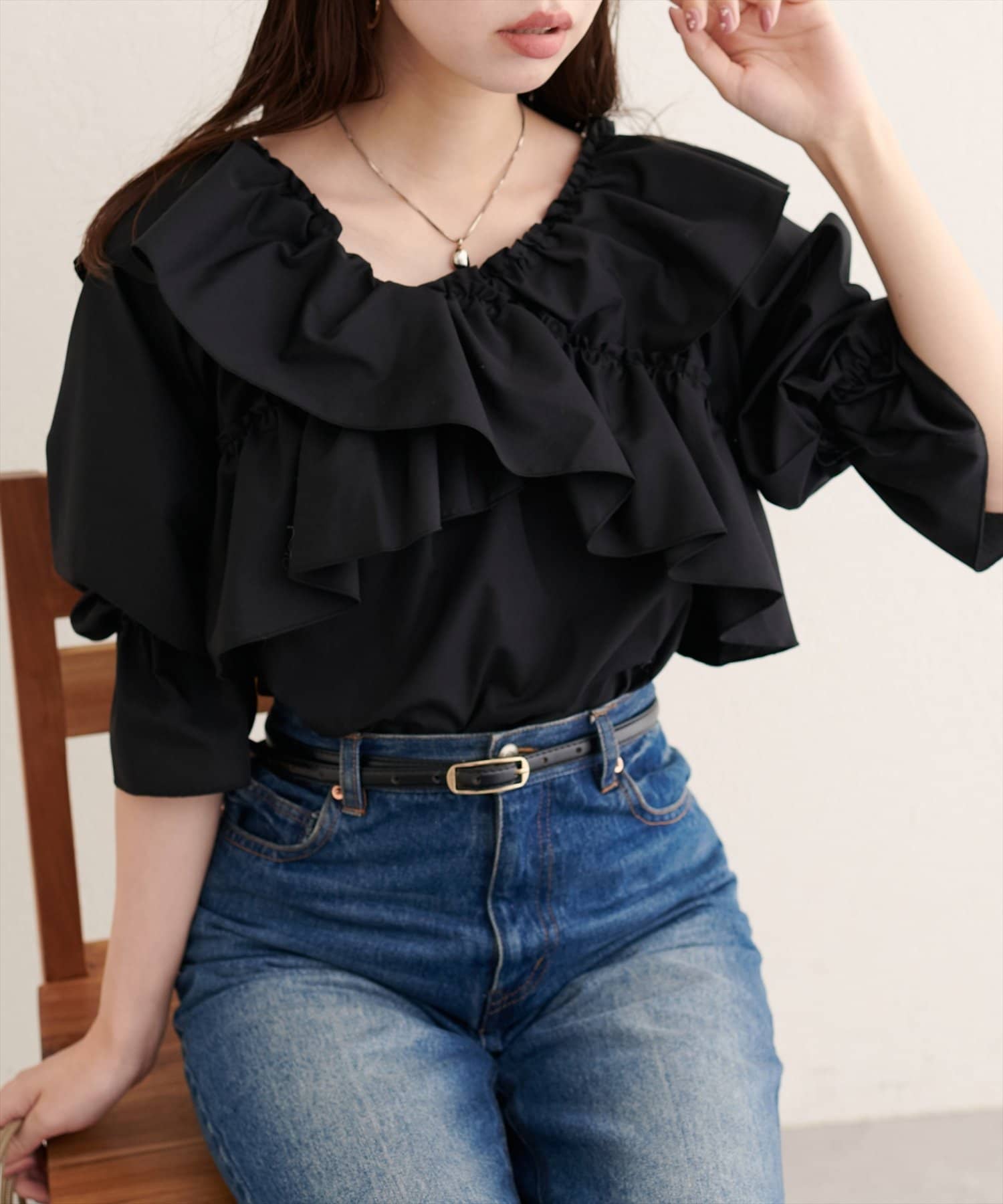 たっぷりのフリルとキャンディスリーブがアクセントになるので、シンプルなボトムスと合わせるだけでコーディネートがきまります。