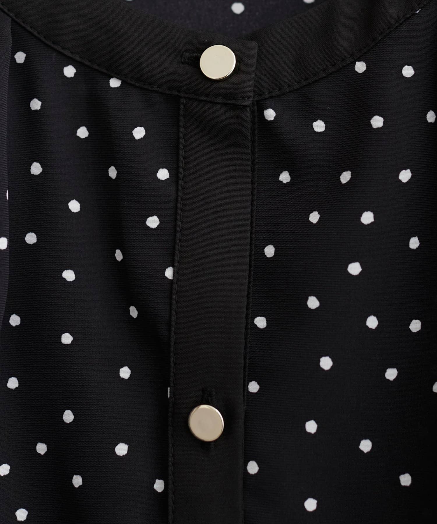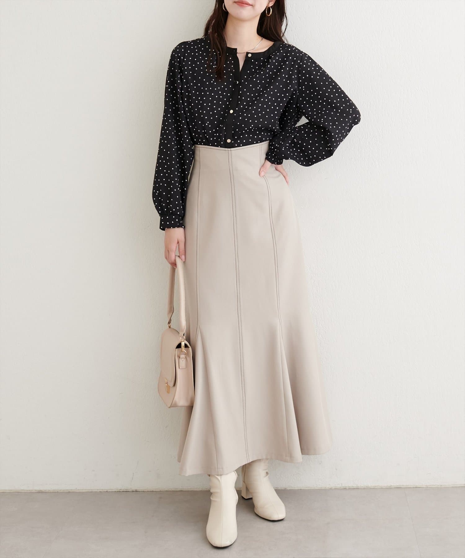 特徴的なのは、フロントのボタンデザインと、裾のタックが生み出すふんわりとしたシルエット。