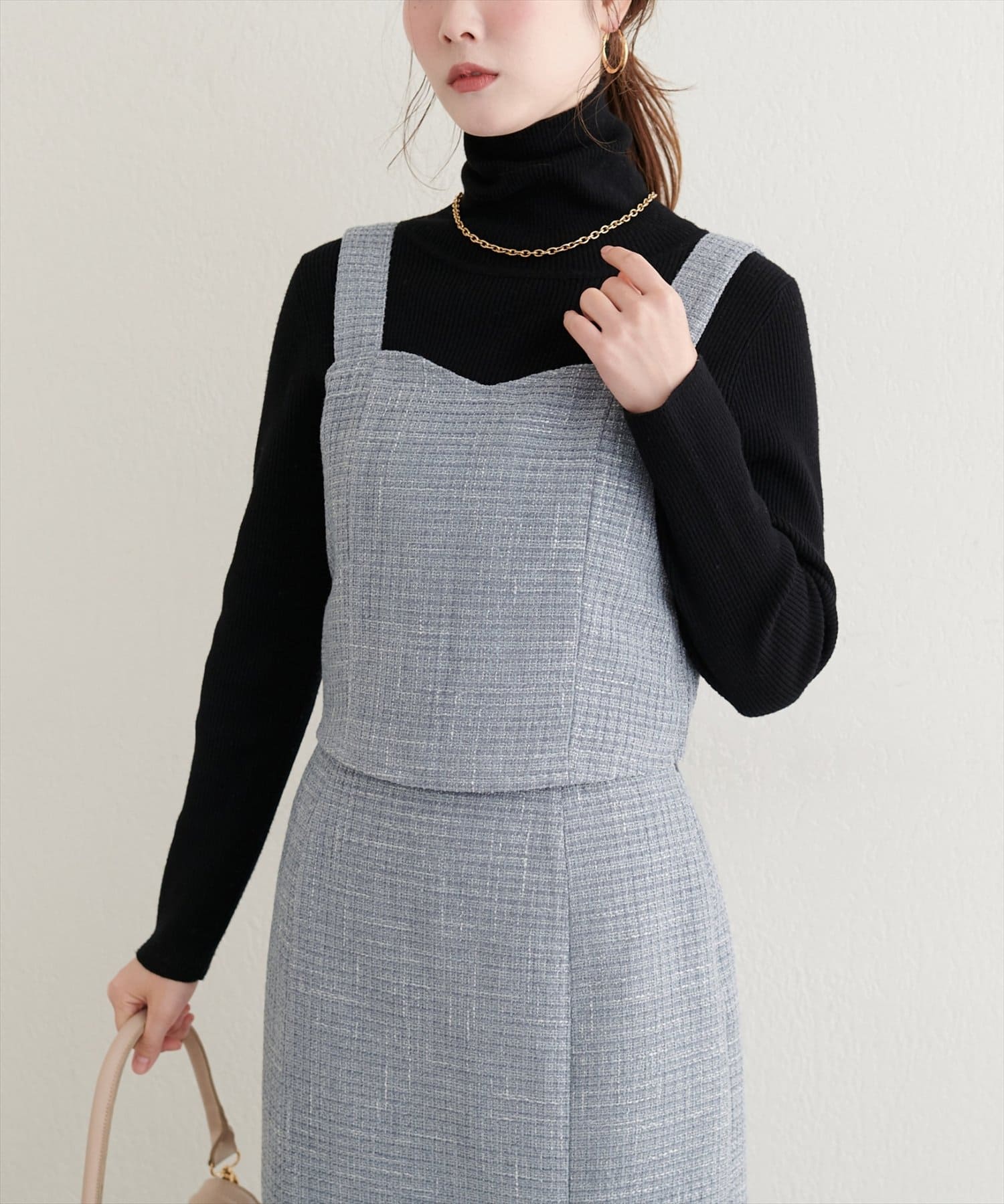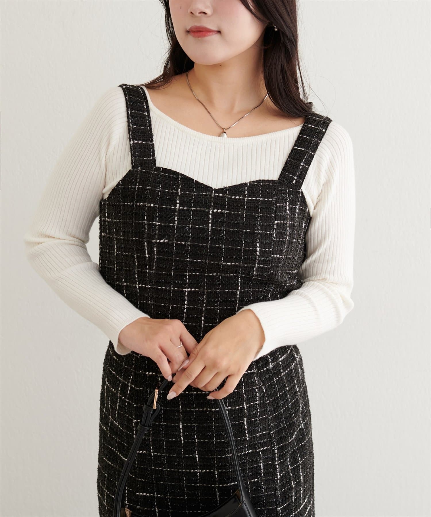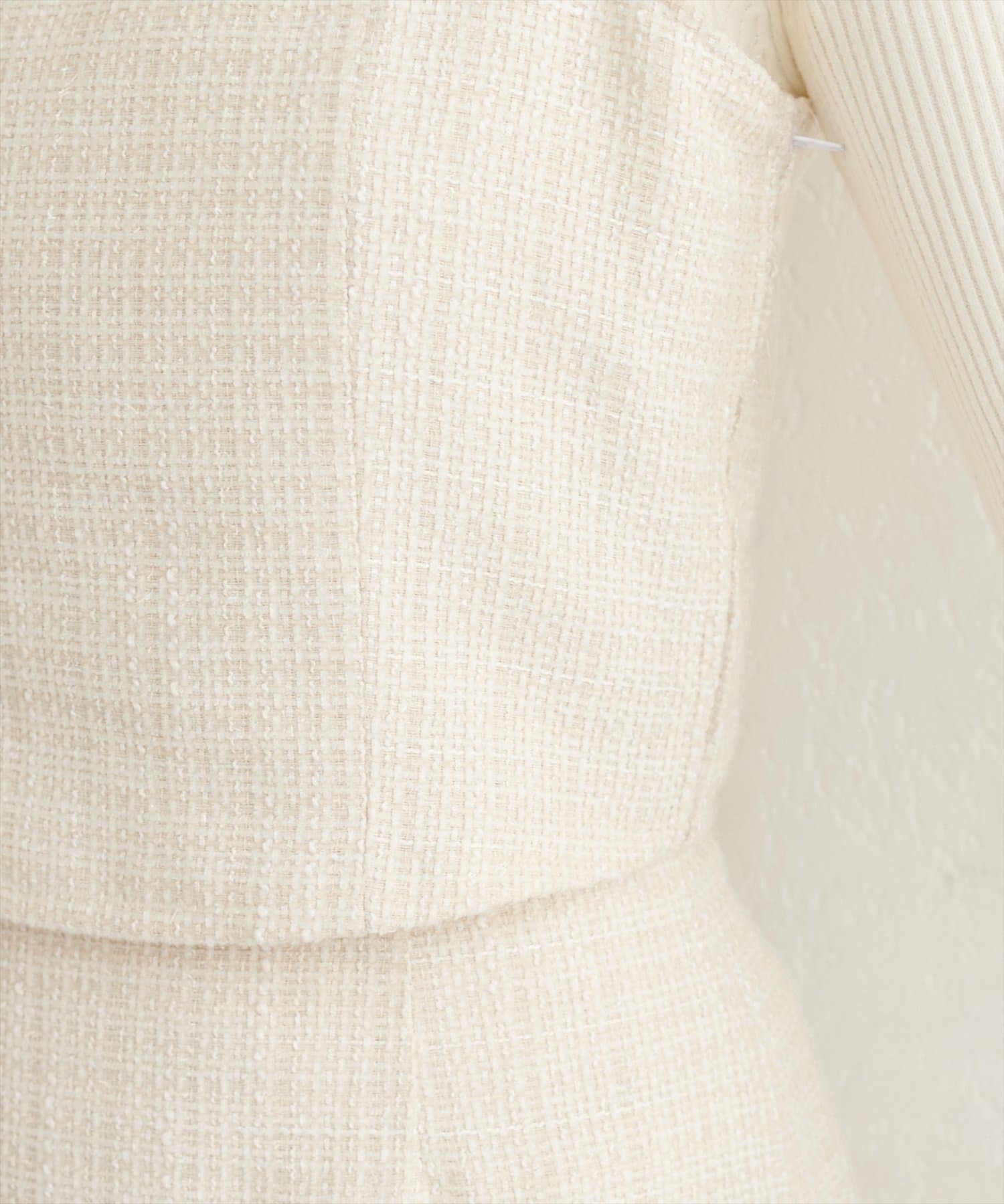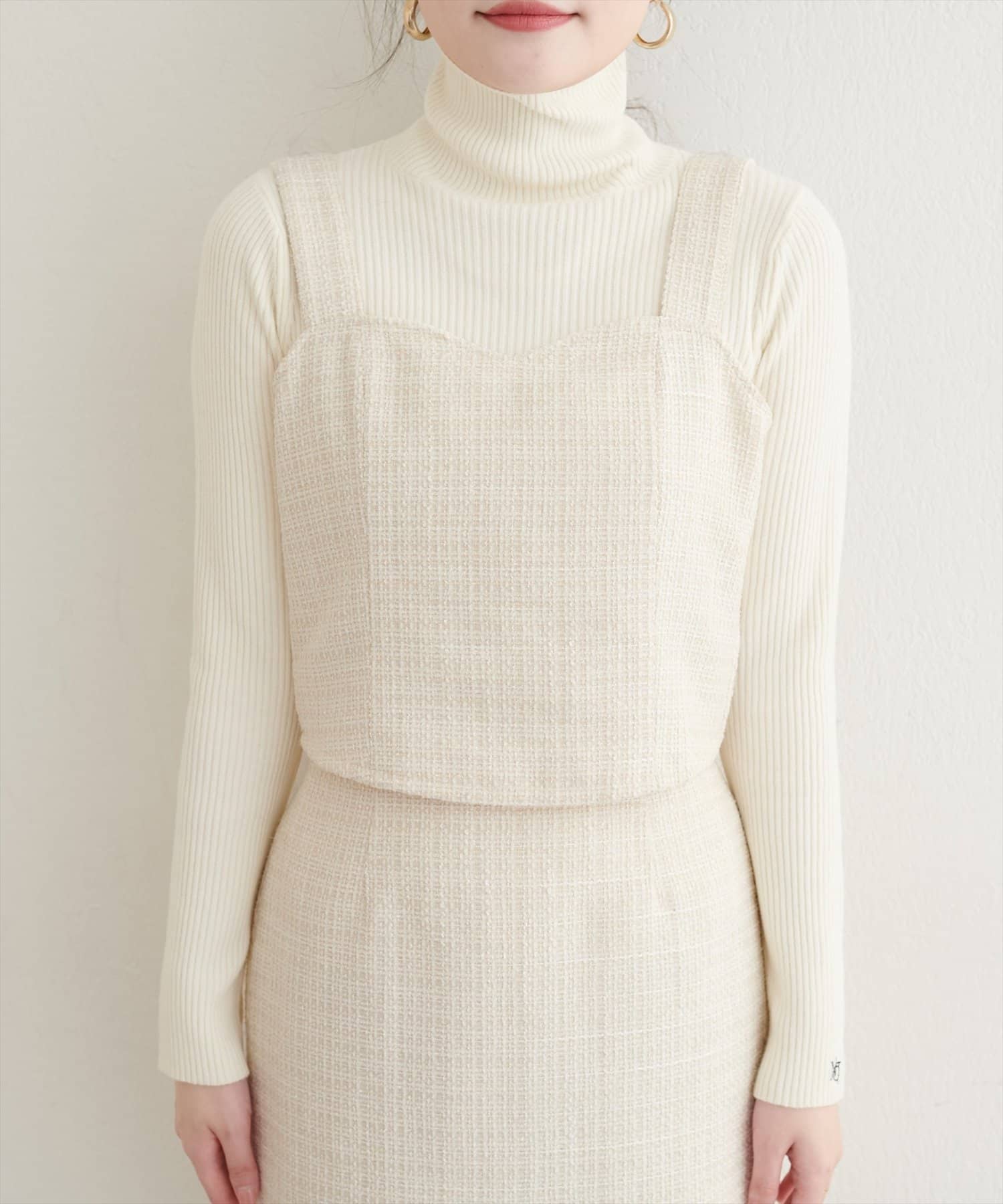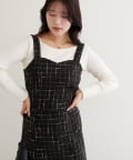 華やかなツイード生地のインナーには、ビスチェが引き立つジャストサイズで薄手のニットやカットソーがおすすめ