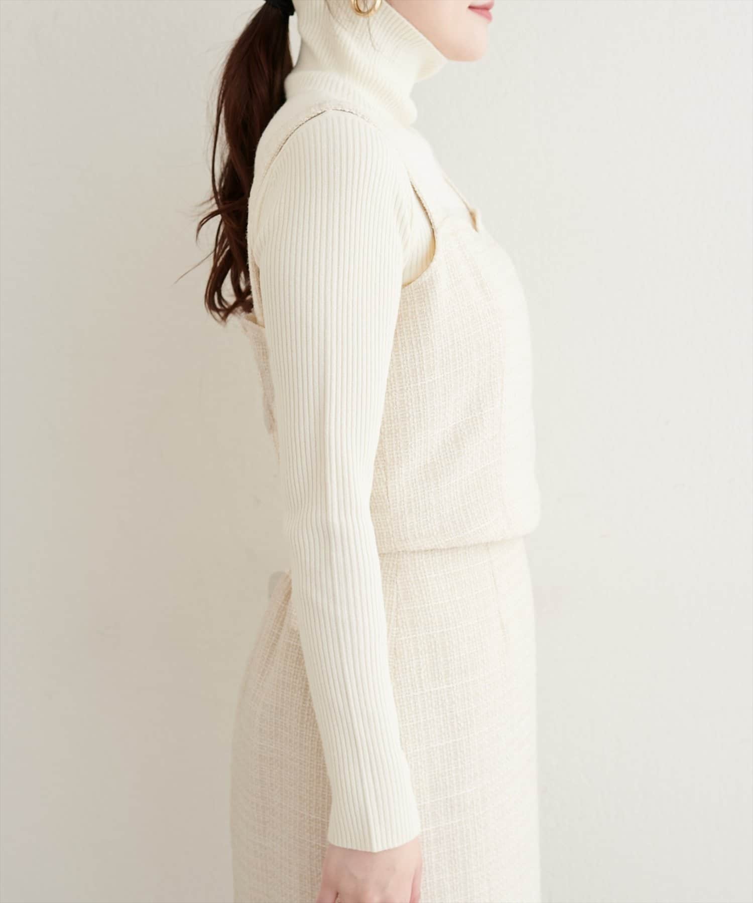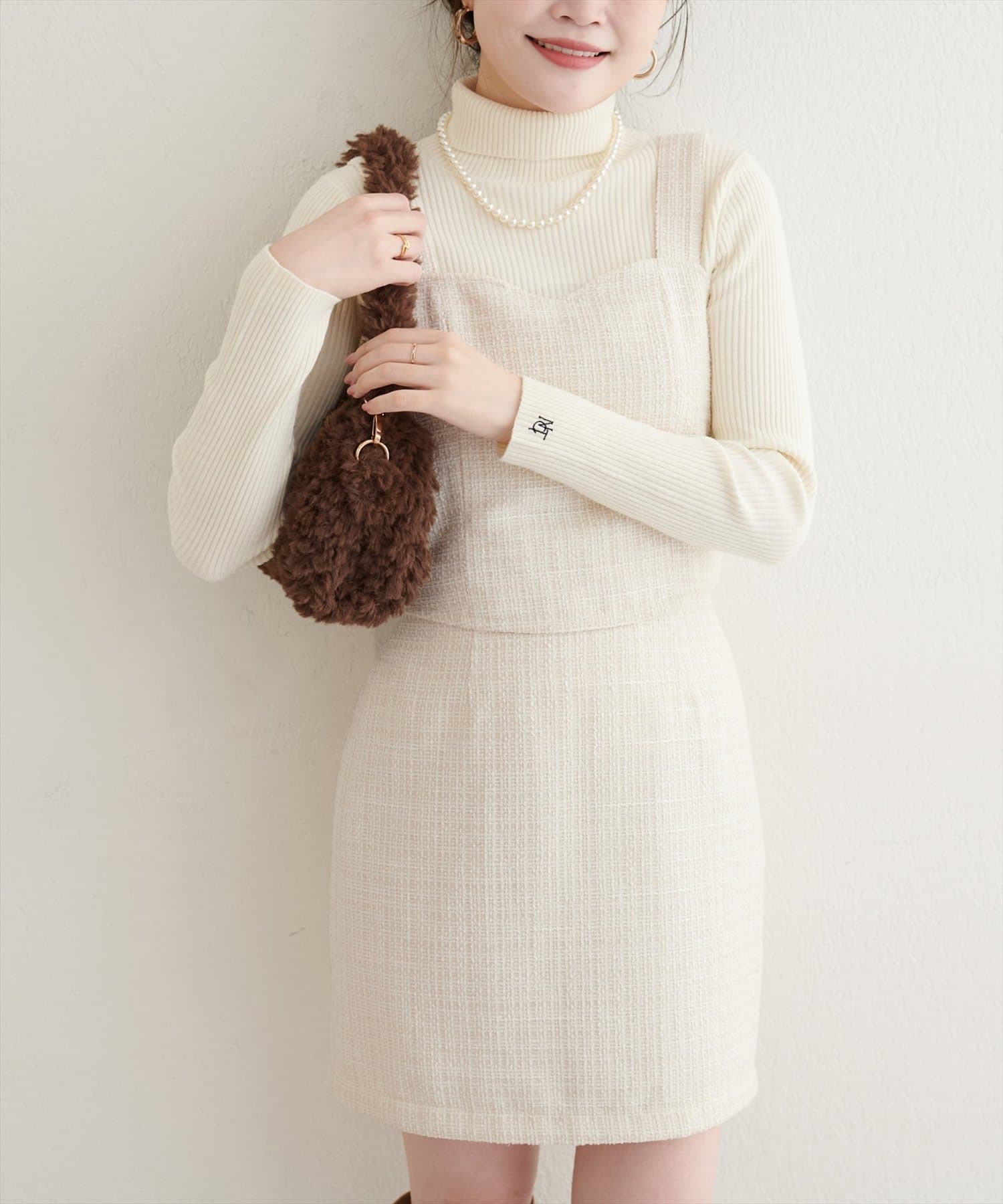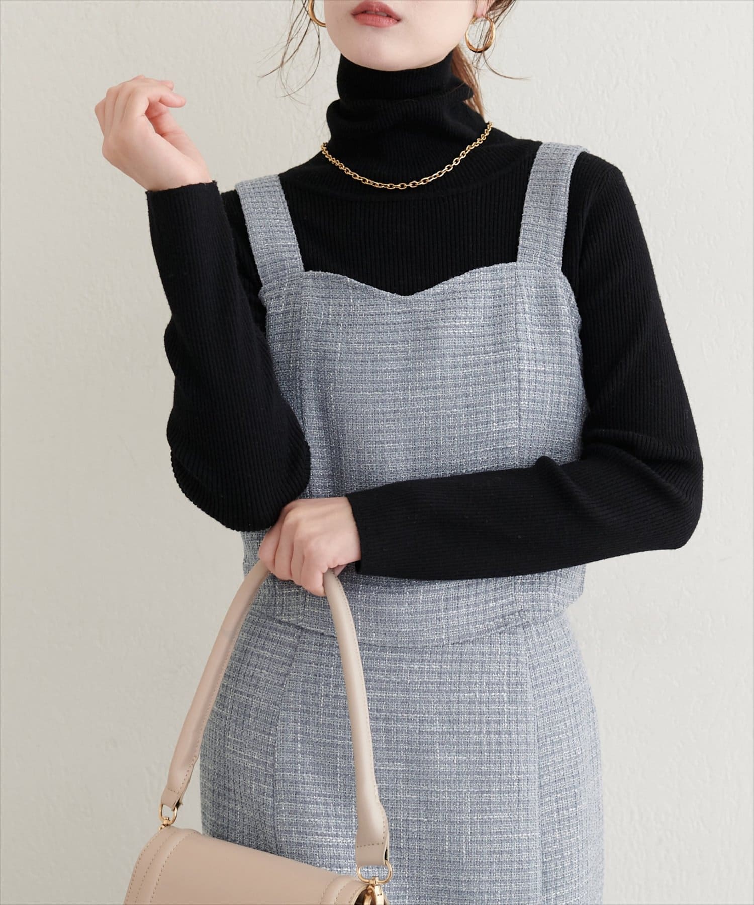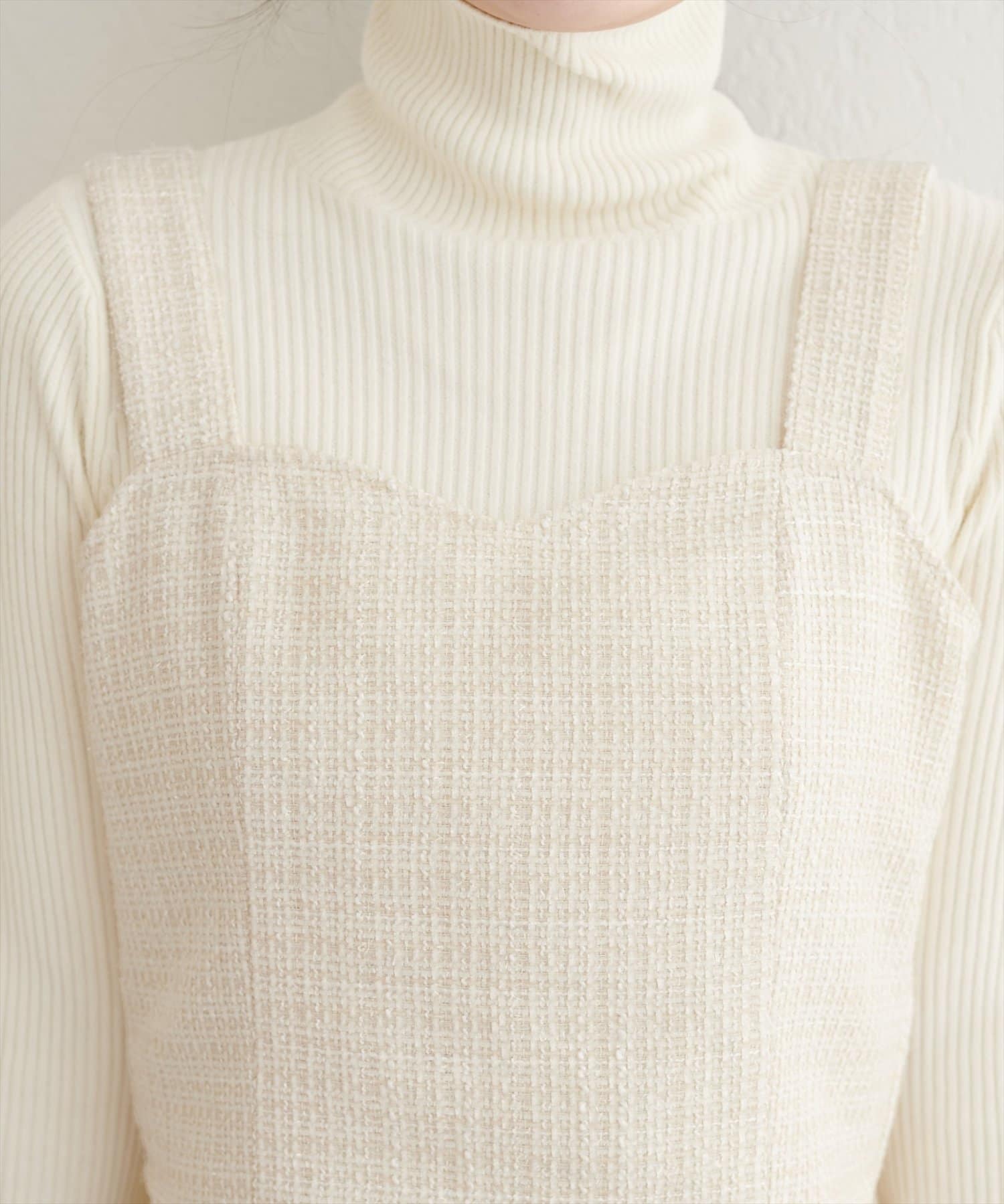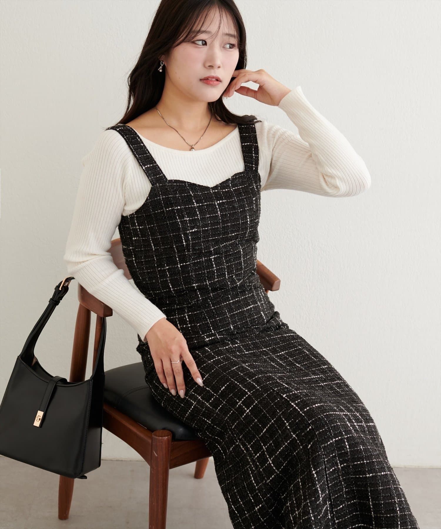 華やかなツイード生地のインナーには、ビスチェが引き立つジャストサイズで薄手のニットやカットソーがおすすめ