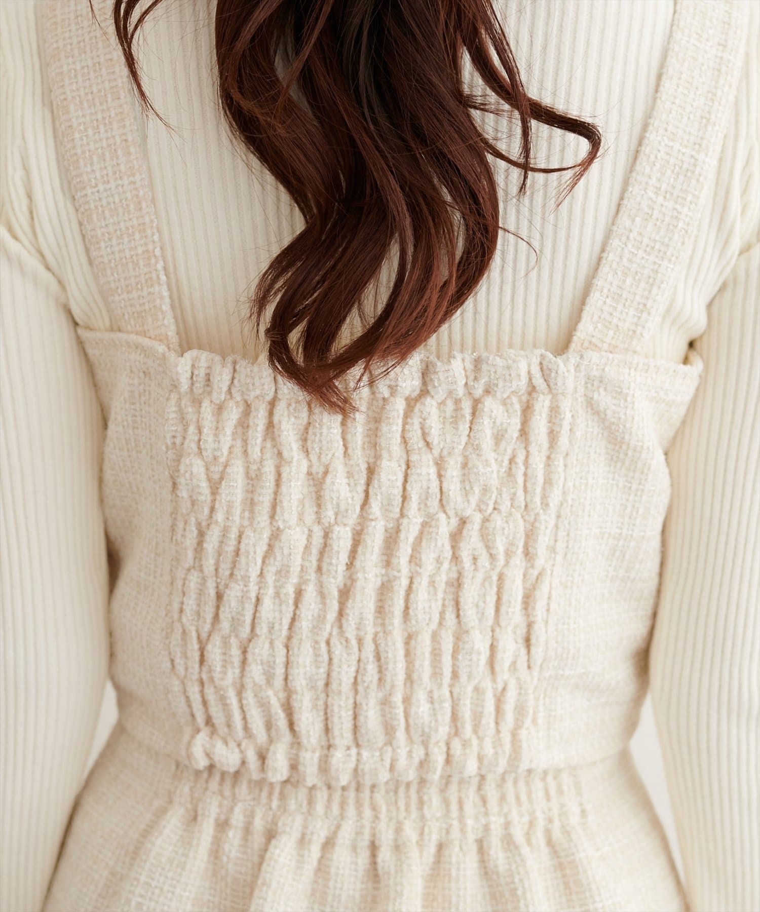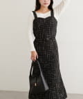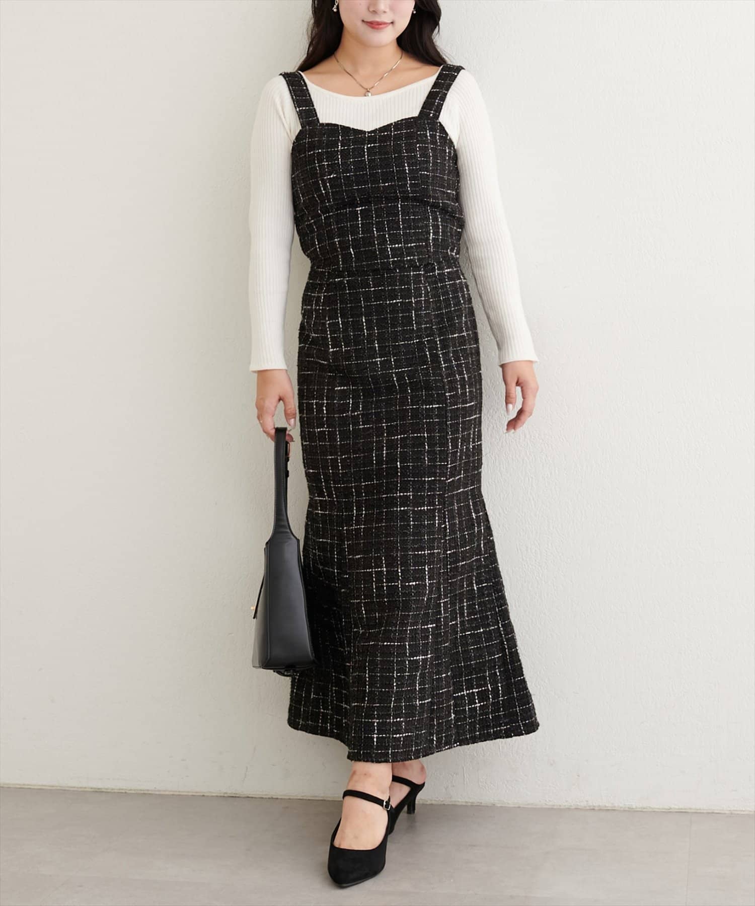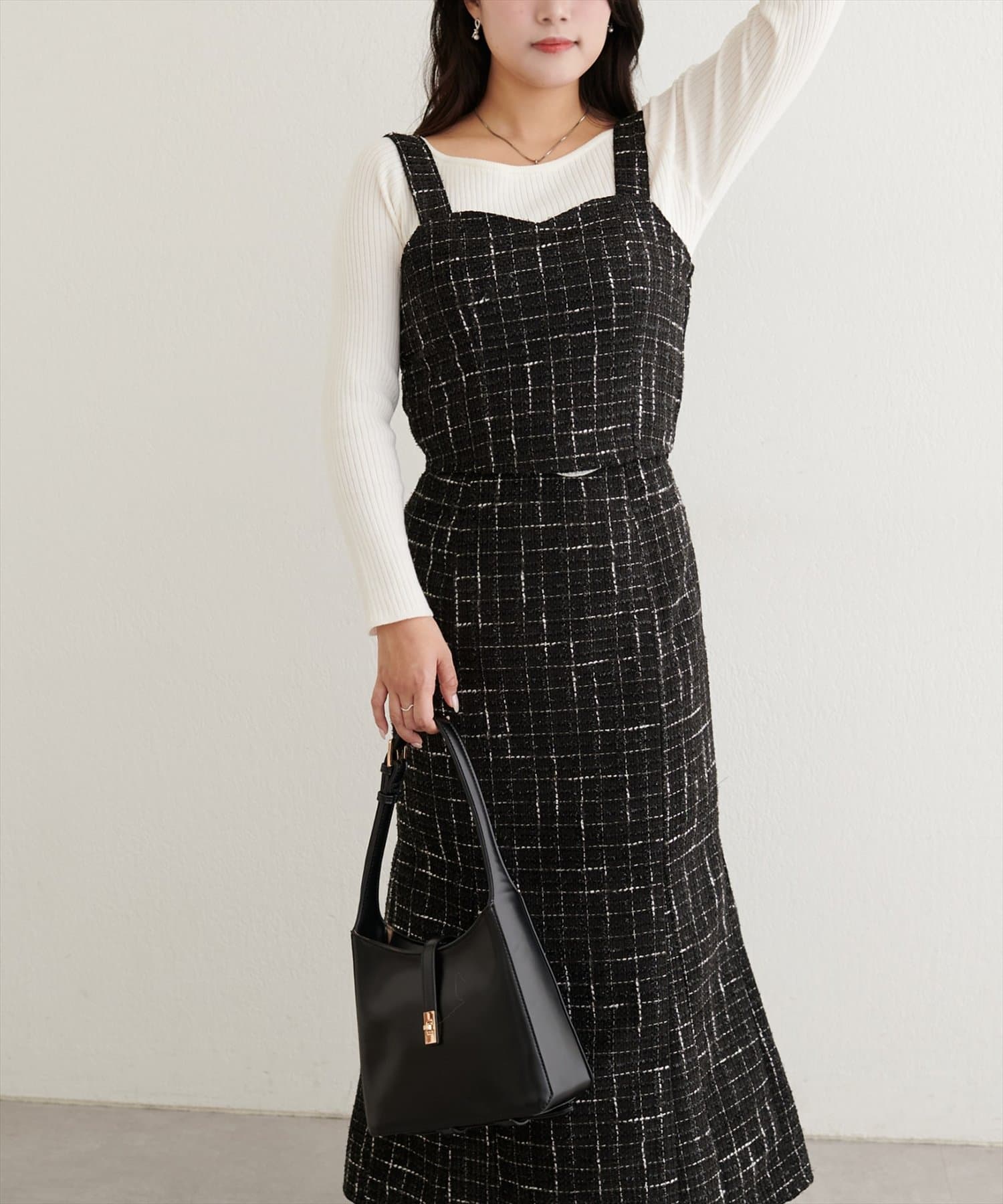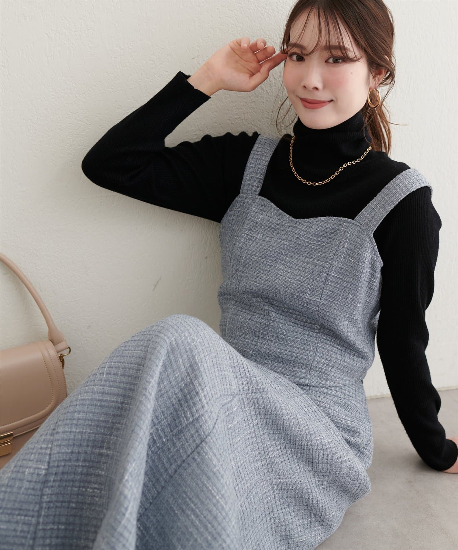 華やかなツイード生地のインナーには、ビスチェが引き立つジャストサイズで薄手のニットやカットソーがおすすめ