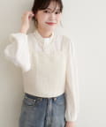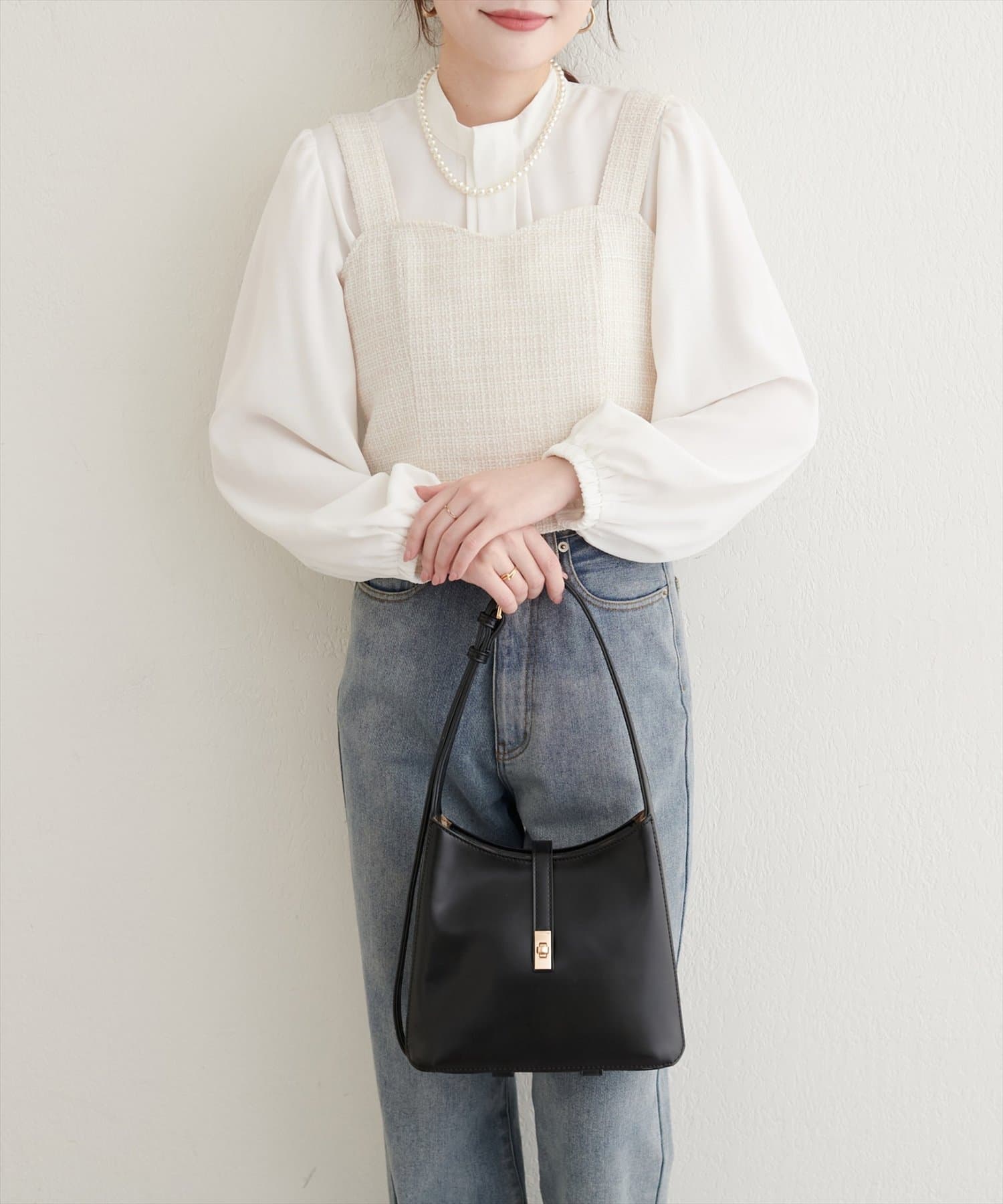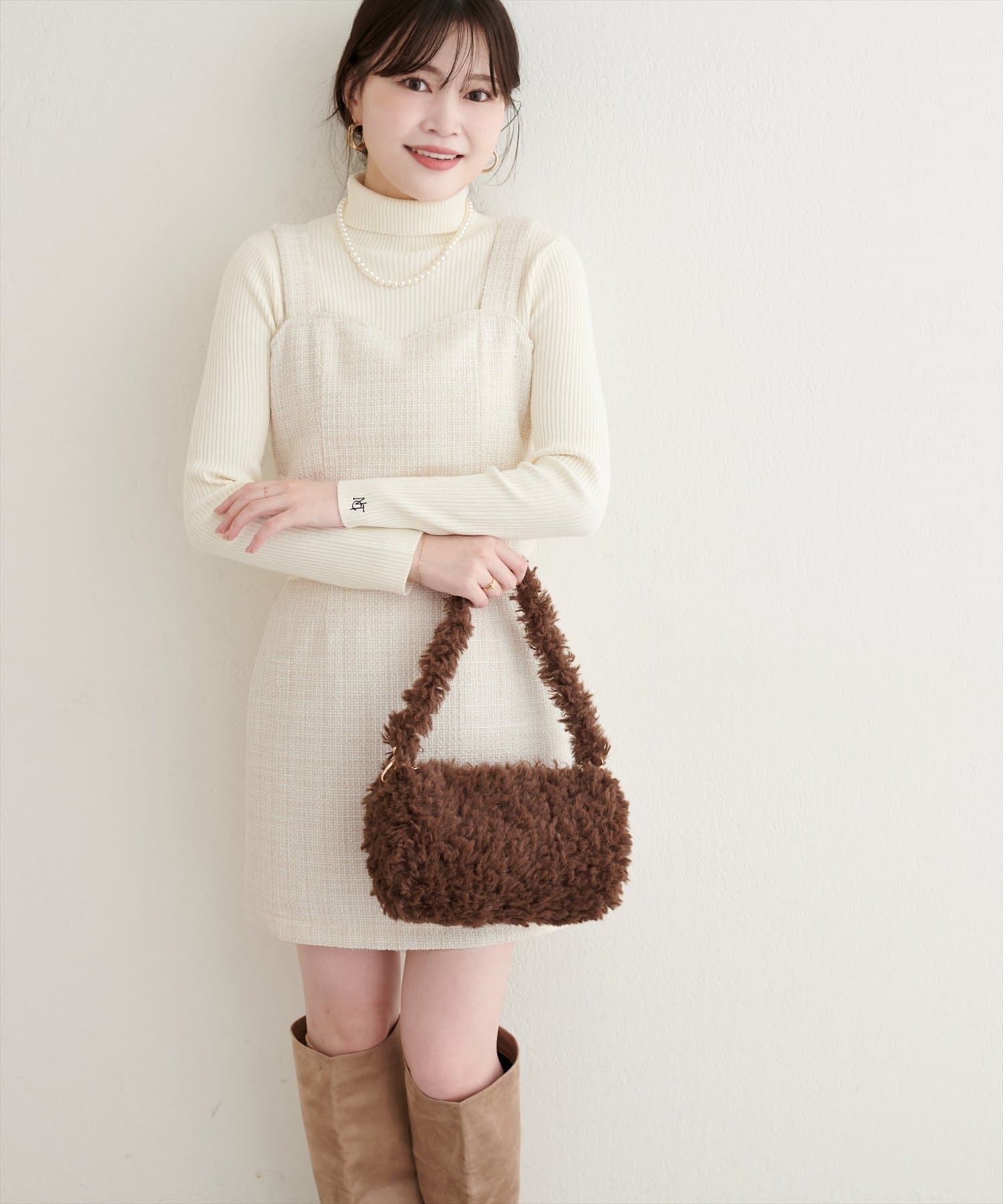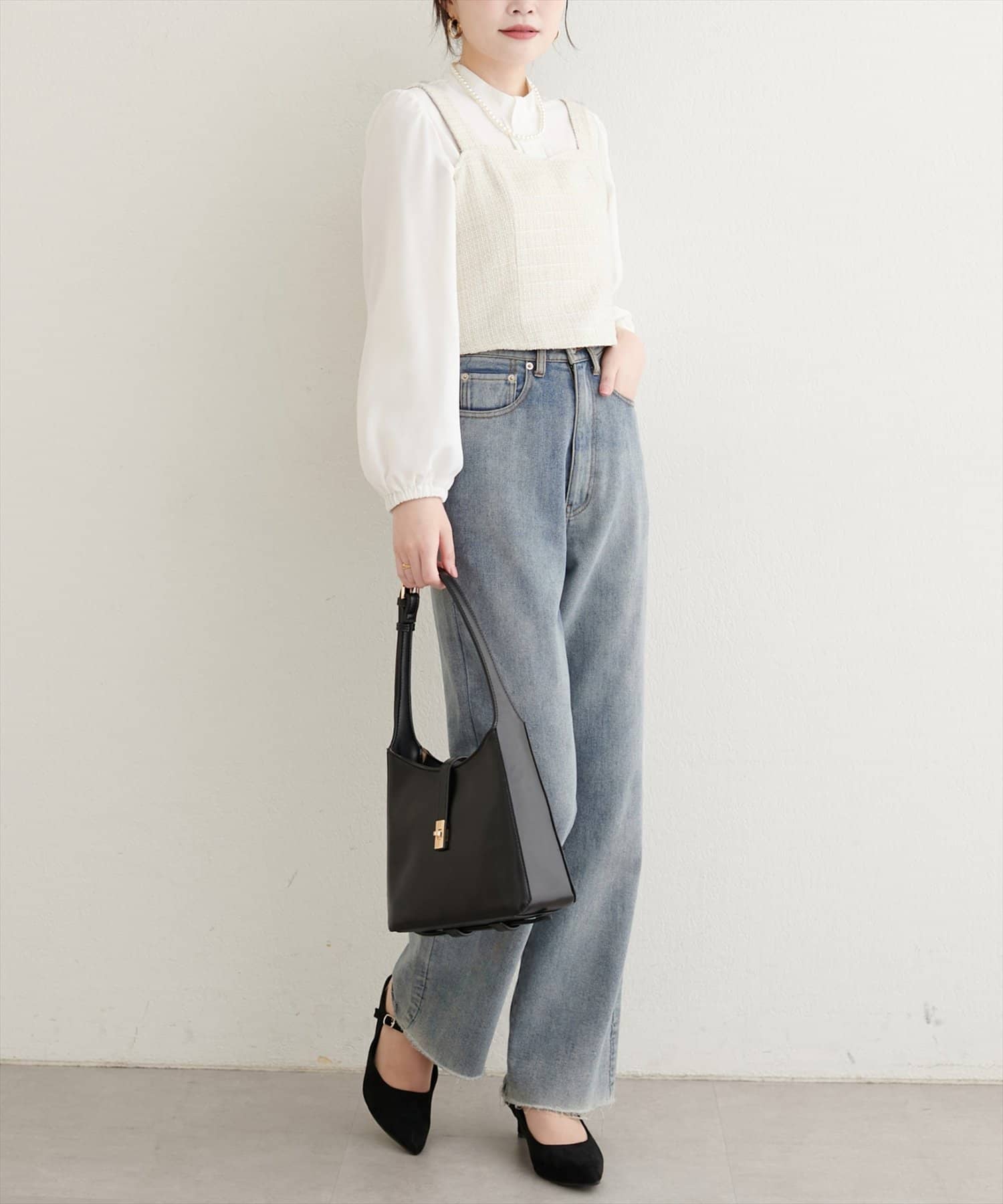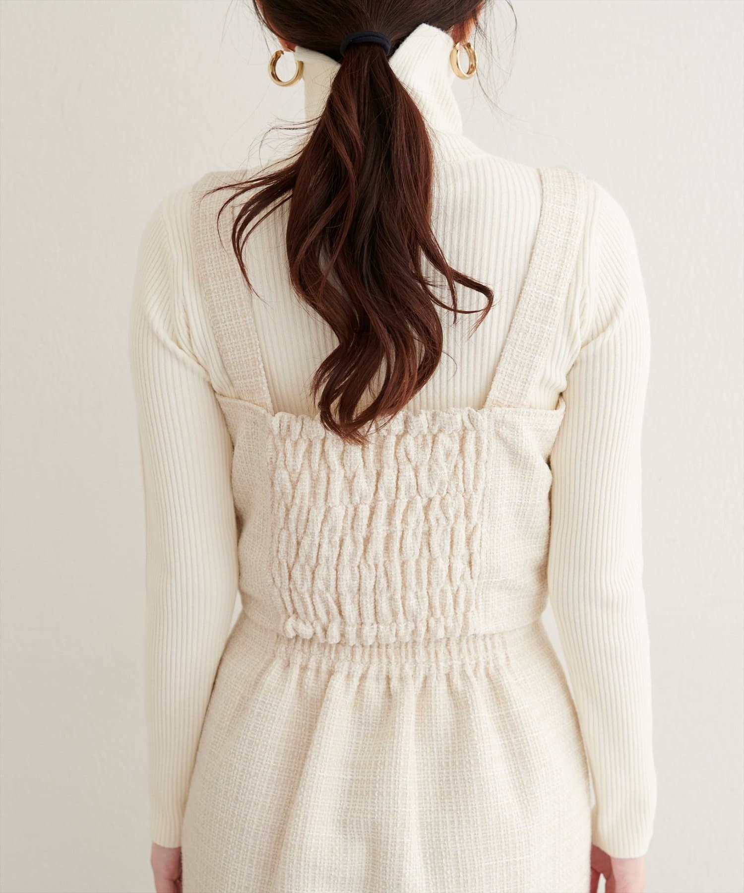 華やかなツイード生地のインナーには、ビスチェが引き立つジャストサイズで薄手のニットやカットソーがおすすめ