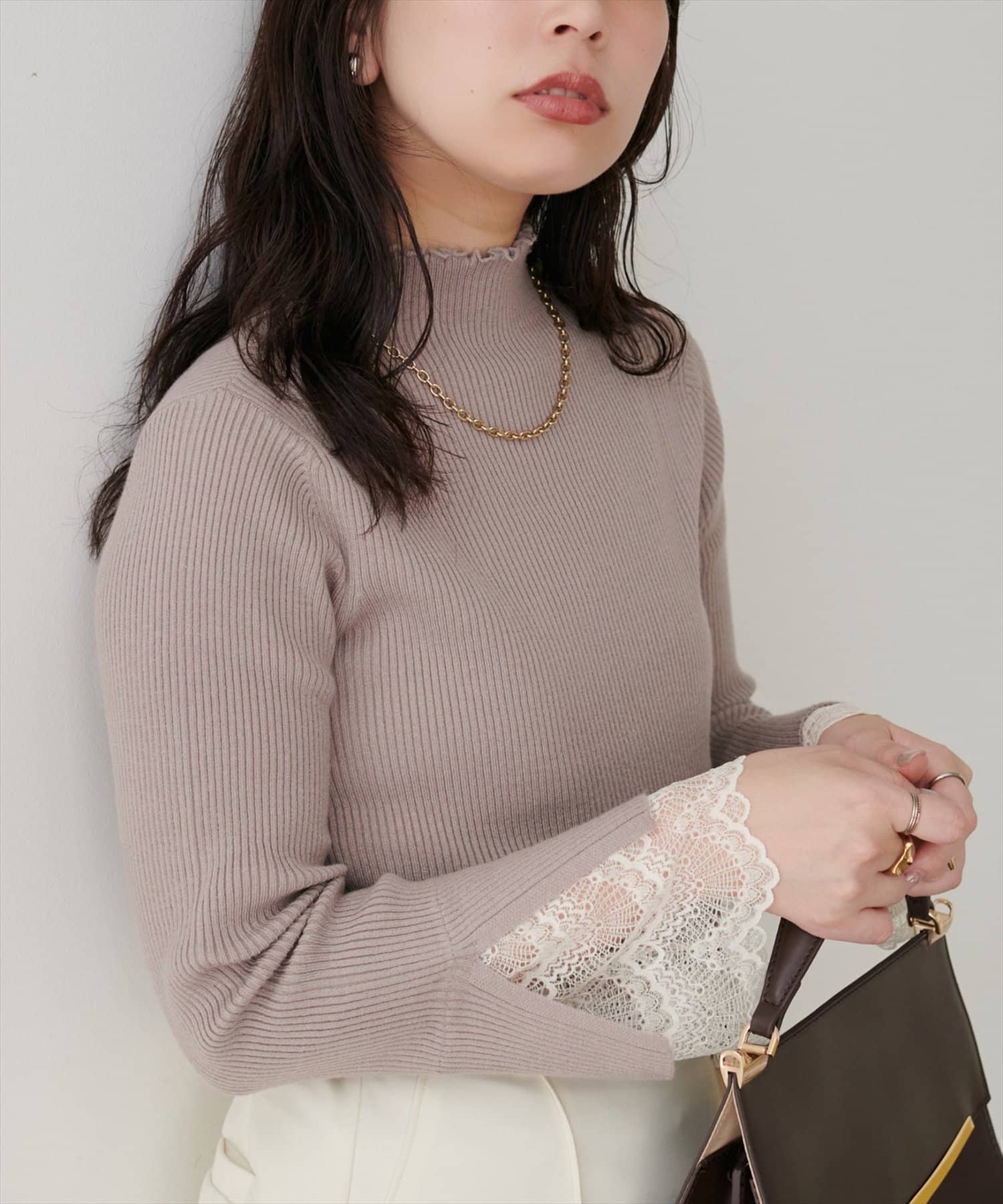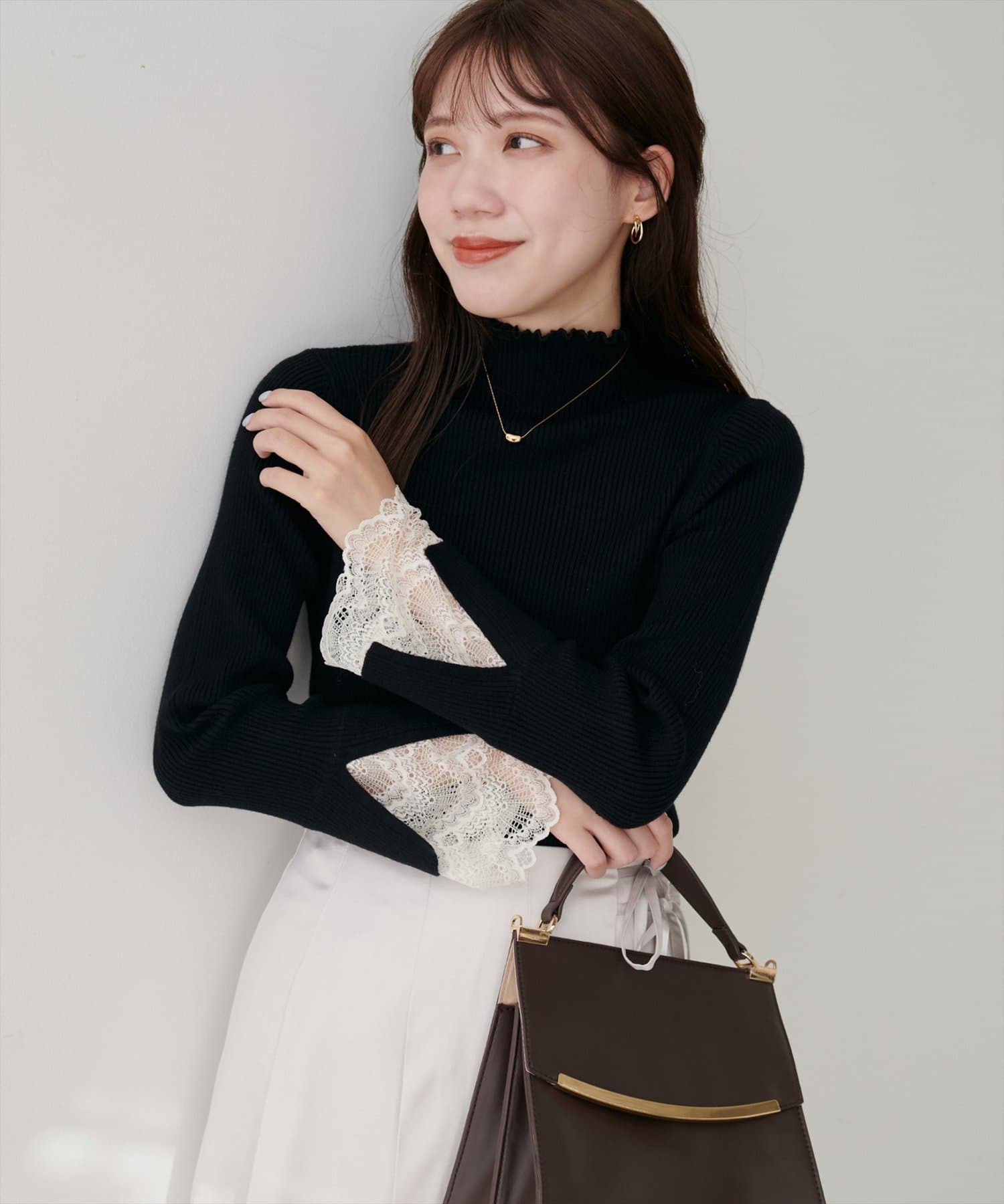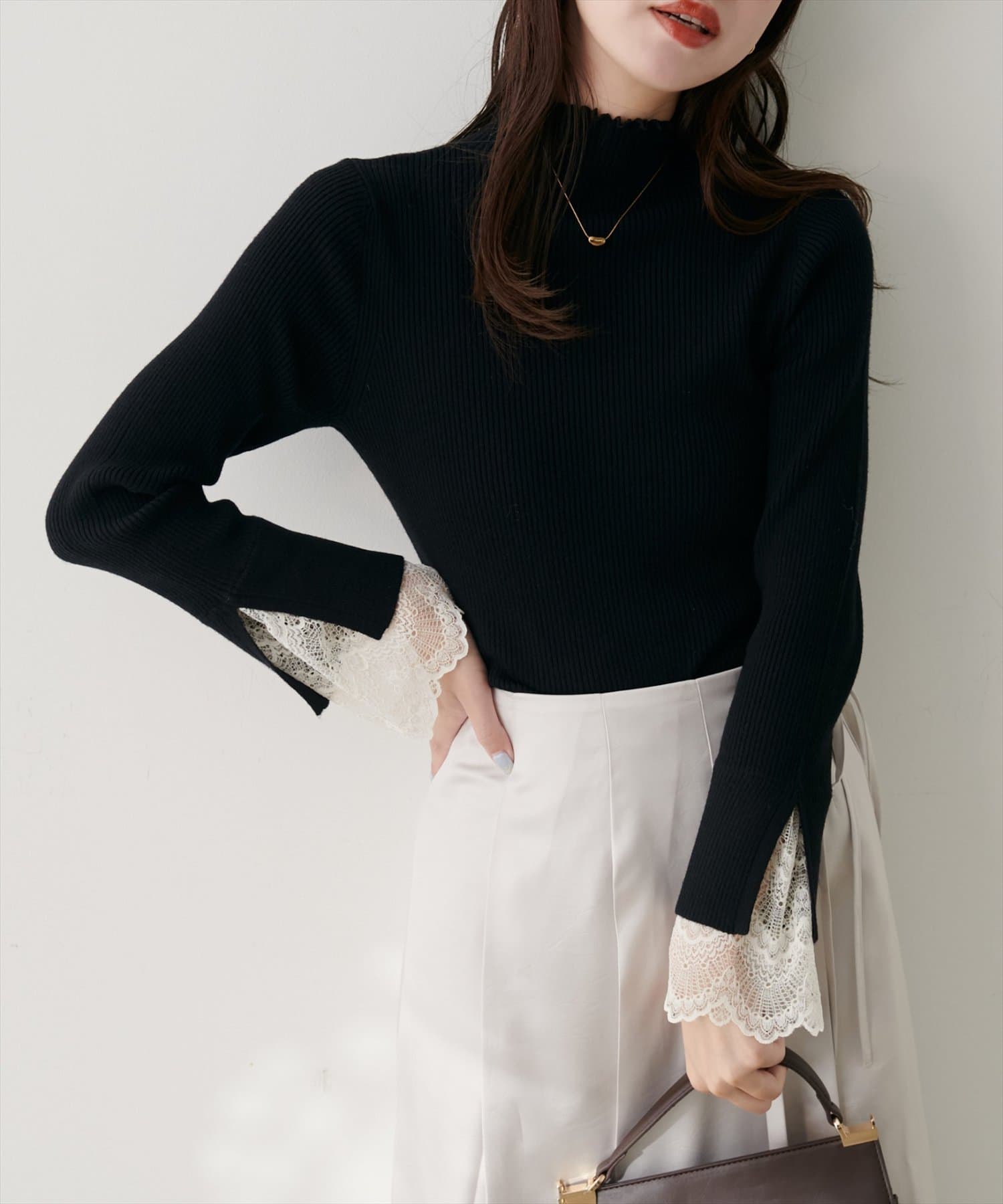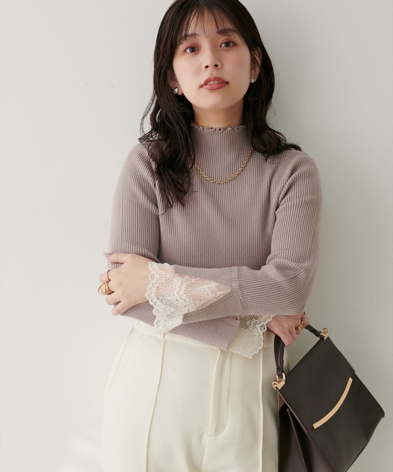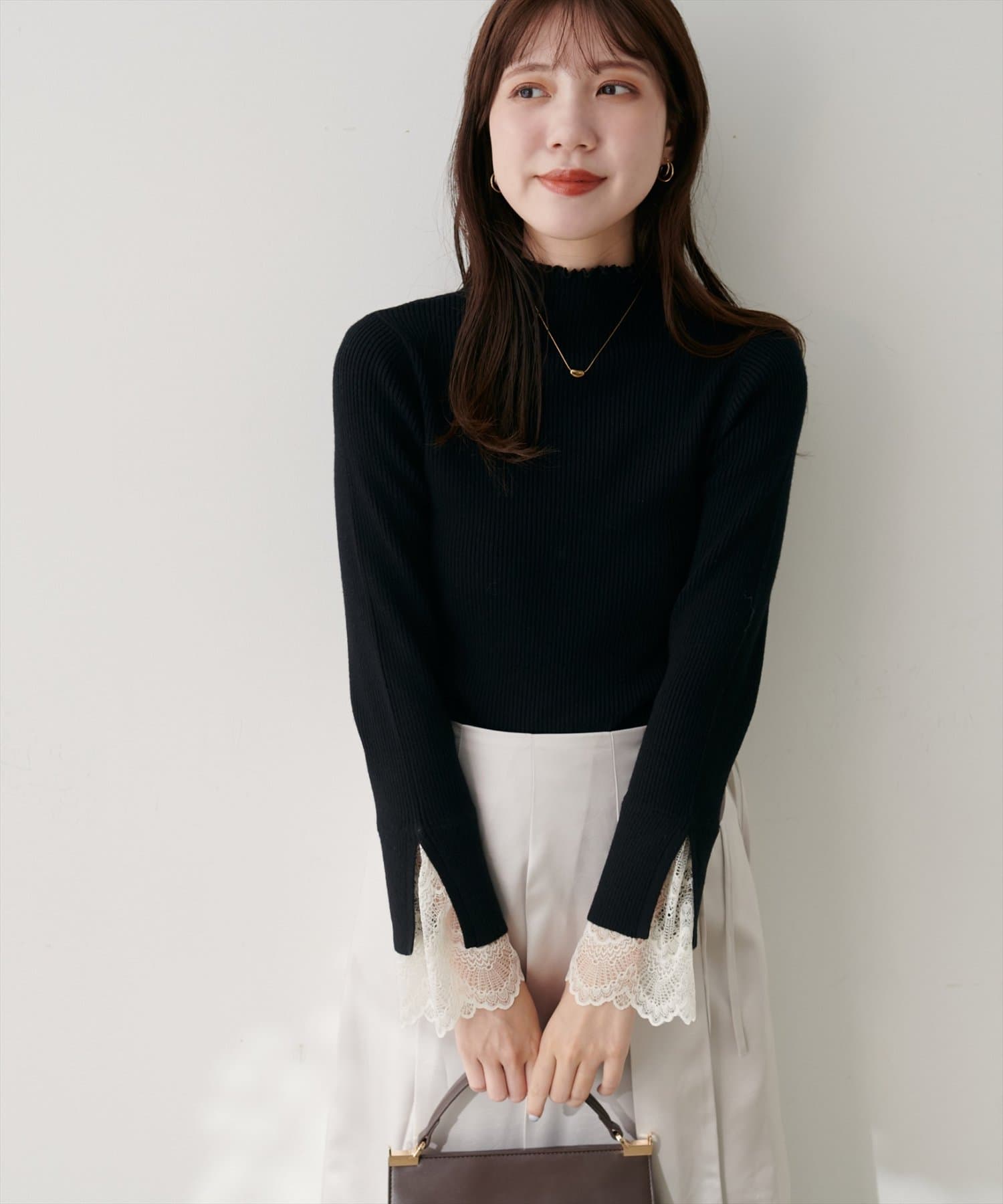コーディネートを選ばないシンプルなリブニットに袖口のレース切替がフェミニンなハイネックニット。