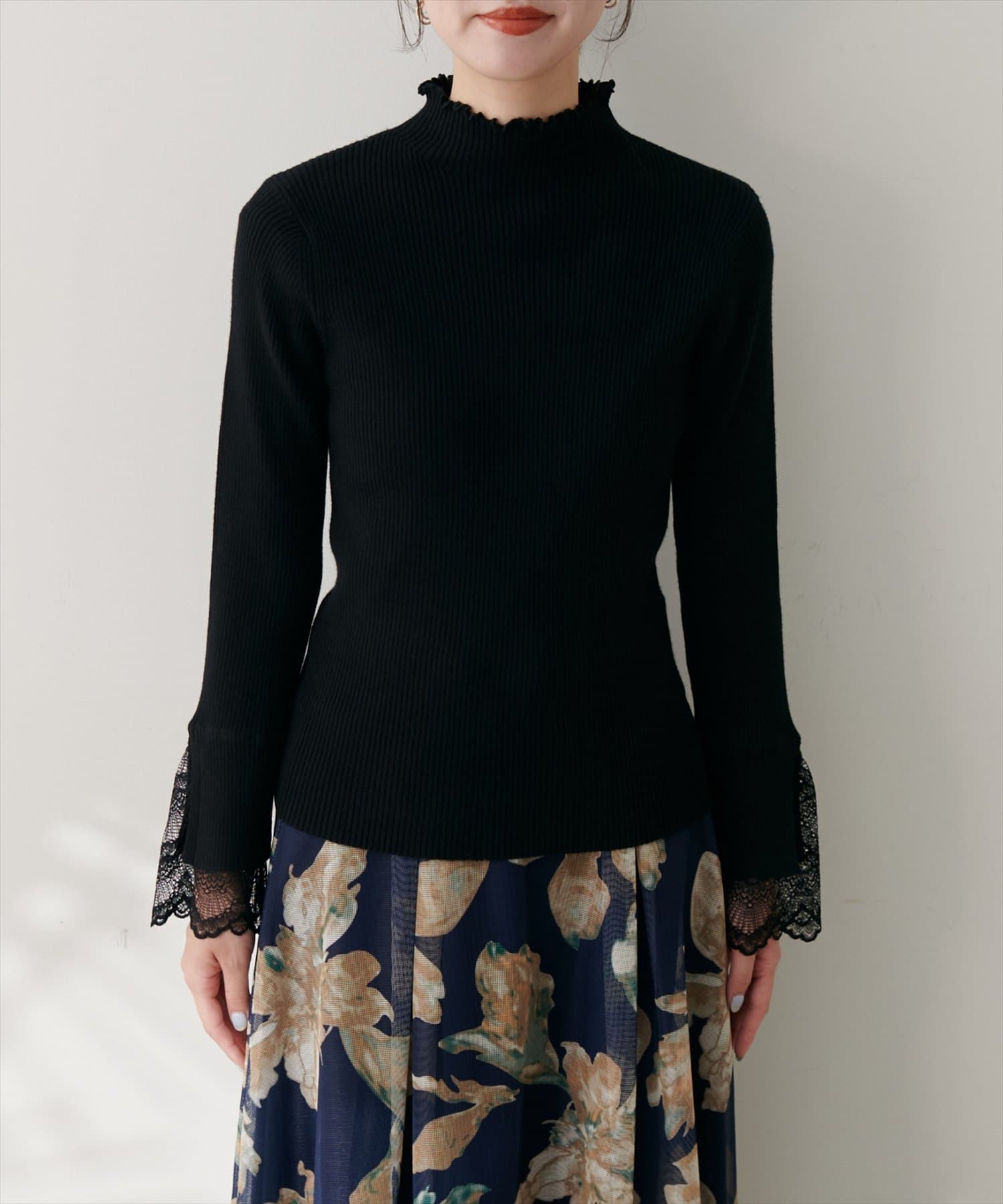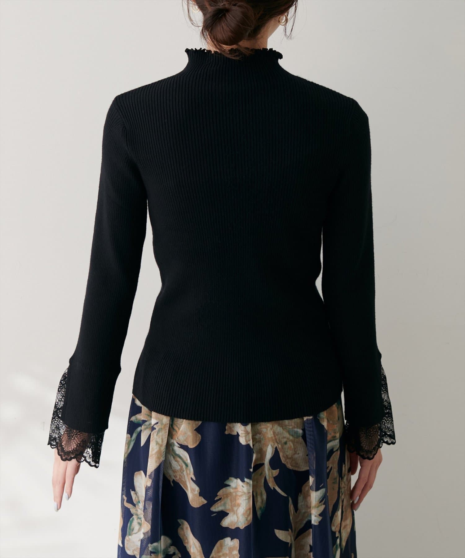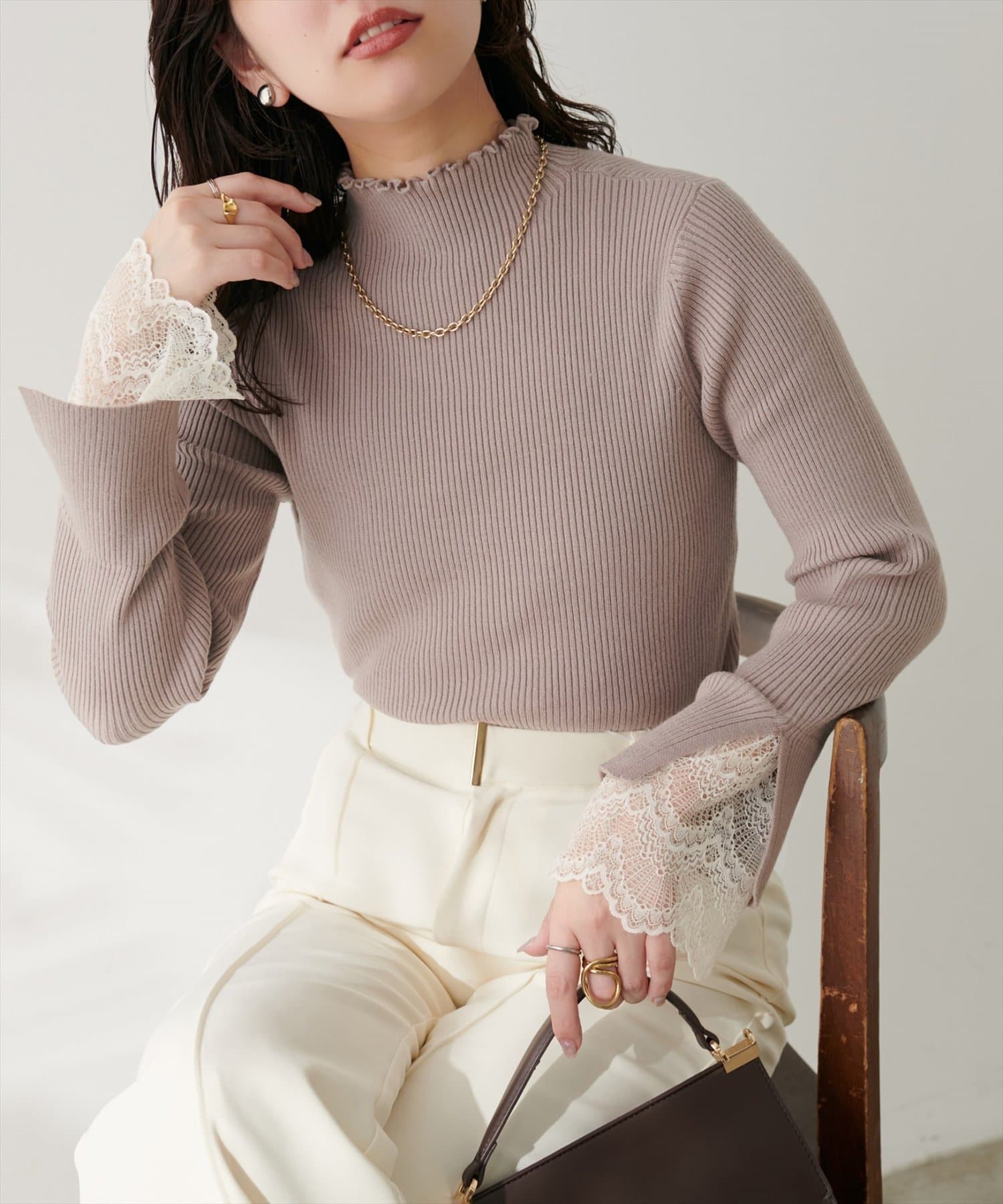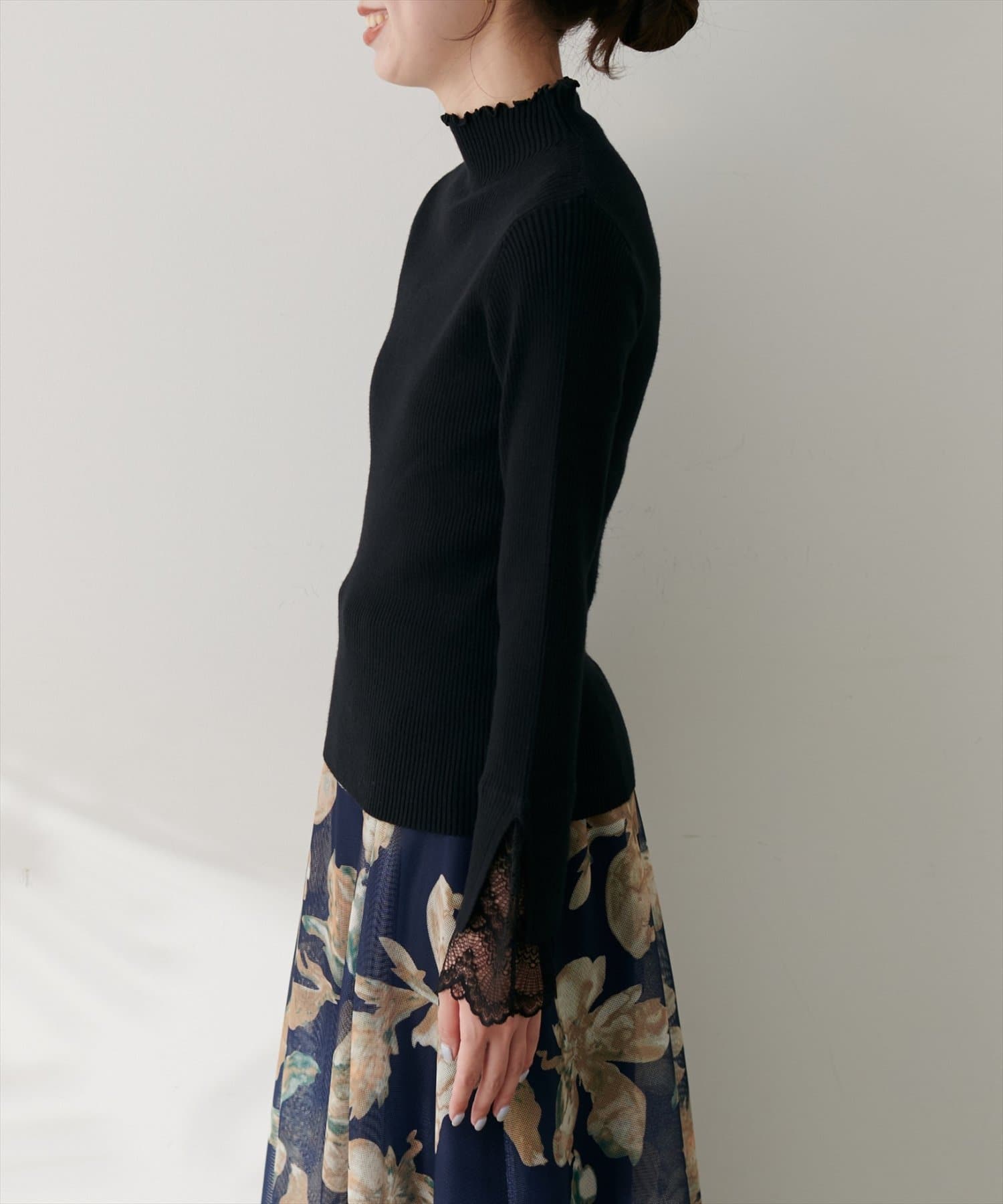 コーディネートを選ばないシンプルなリブニットに袖口のレース切替がフェミニンなハイネックニット。