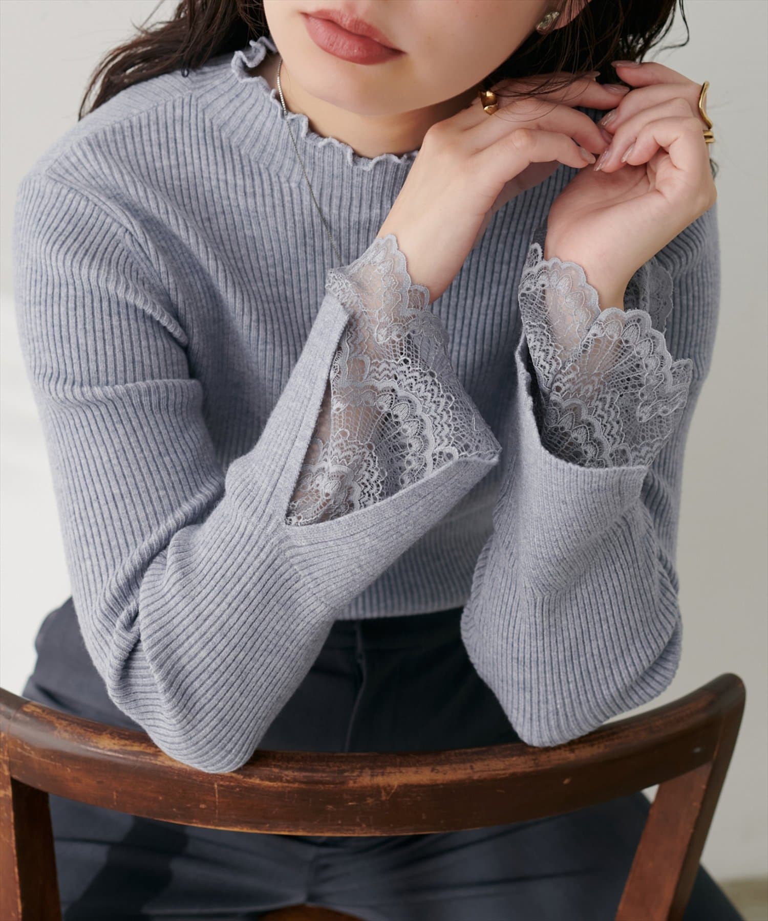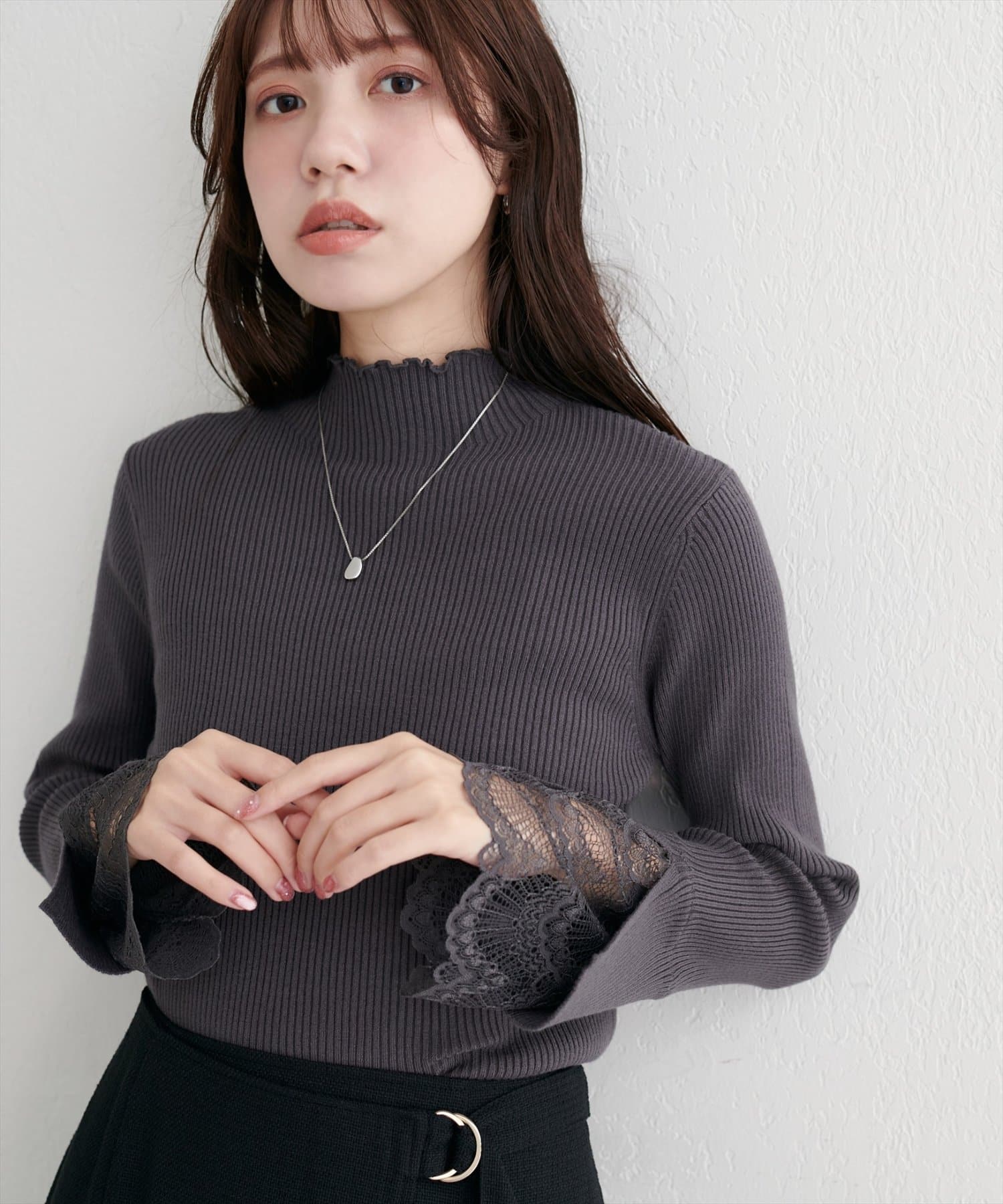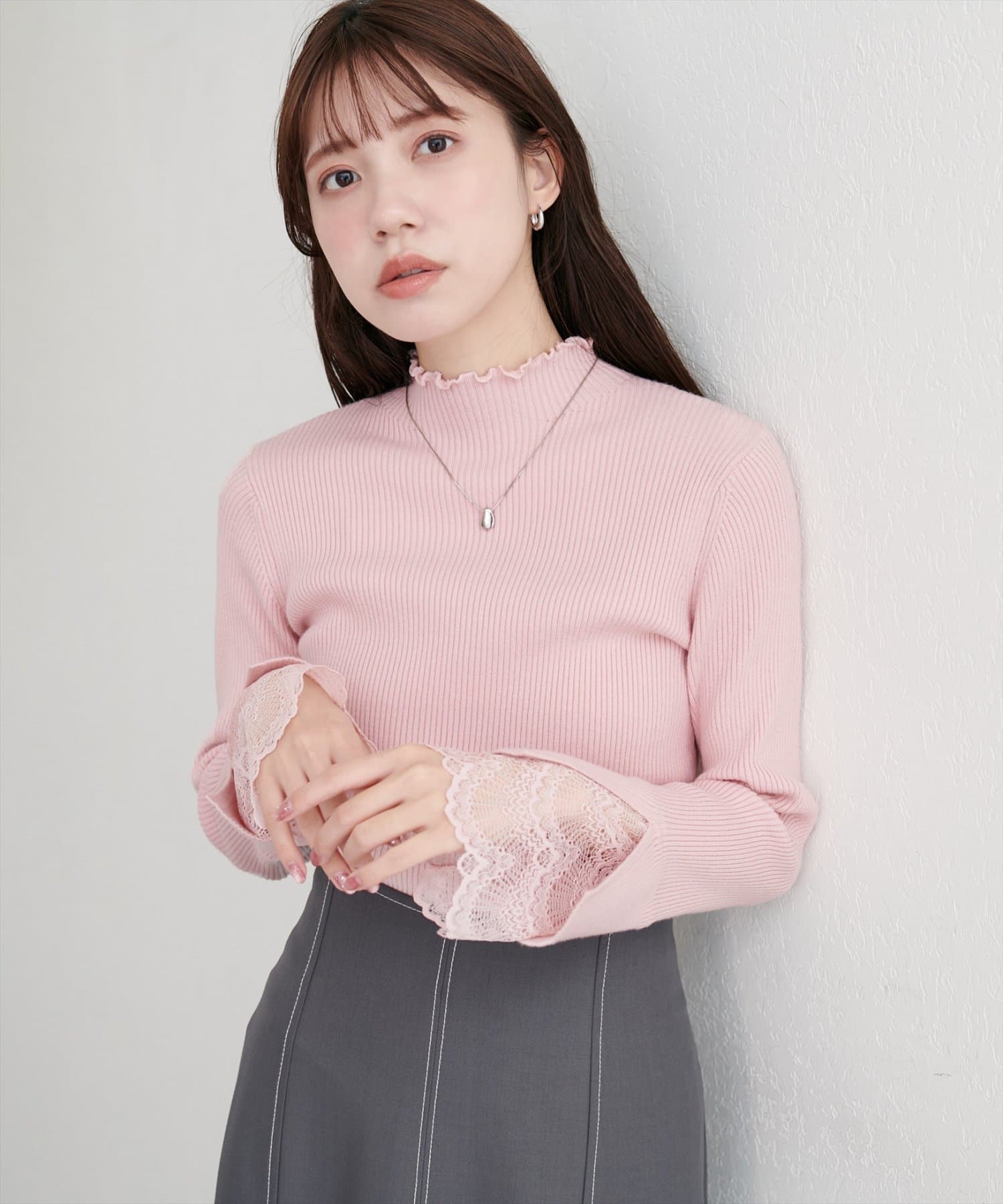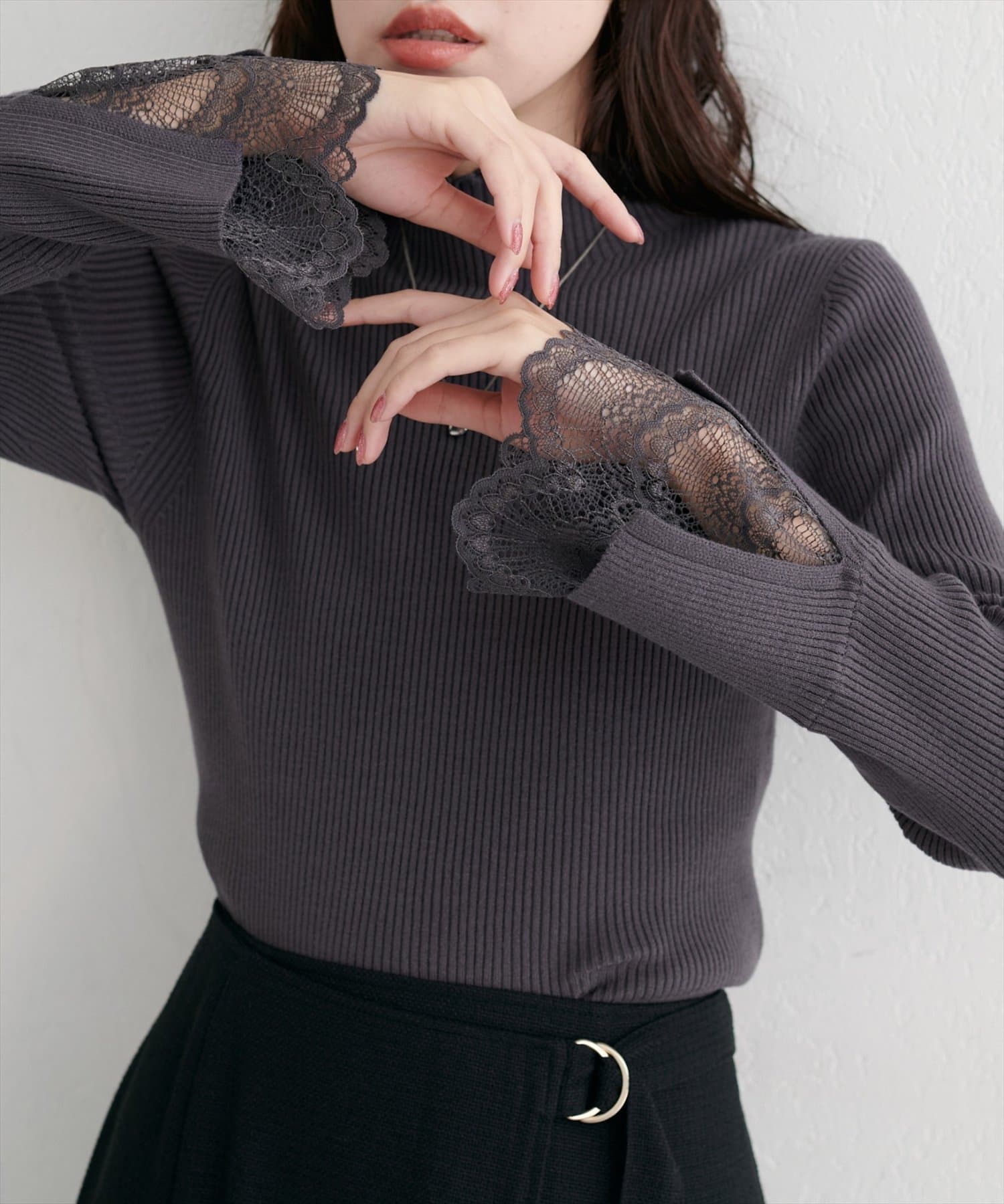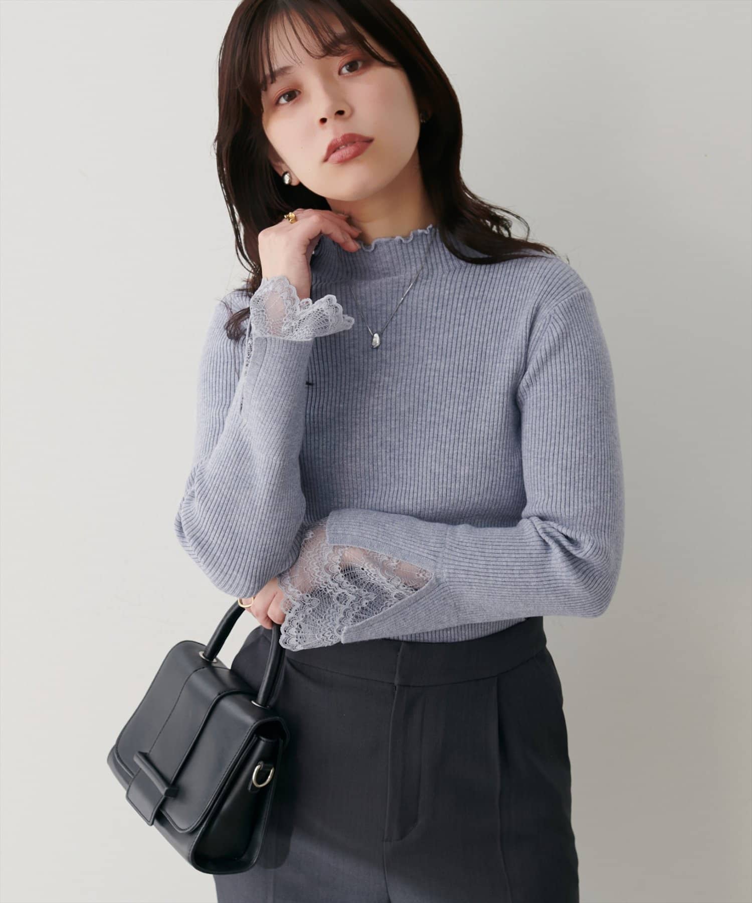 コーディネートを選ばないシンプルなリブニットに袖口のレース切替がフェミニンなハイネックニット。
