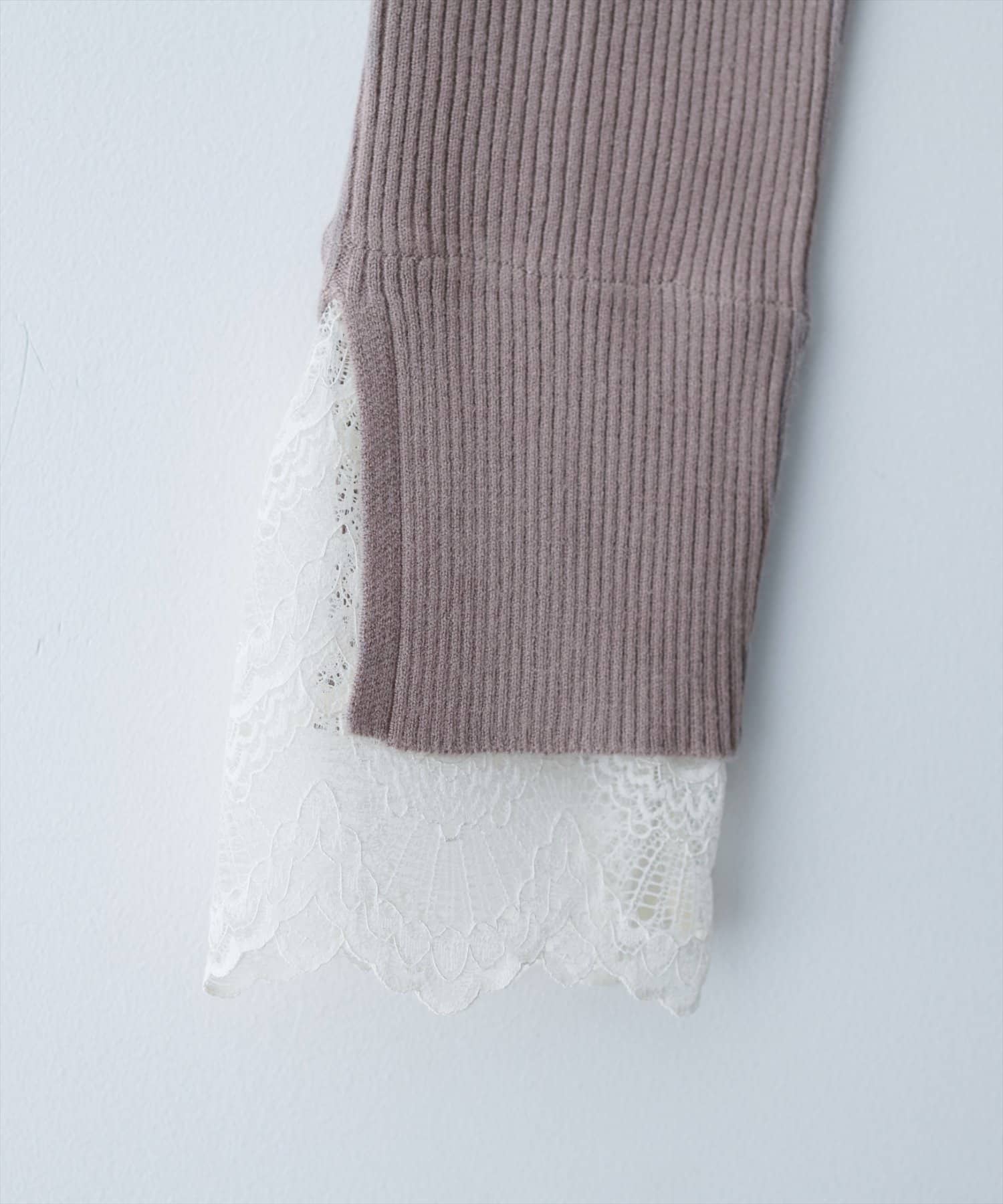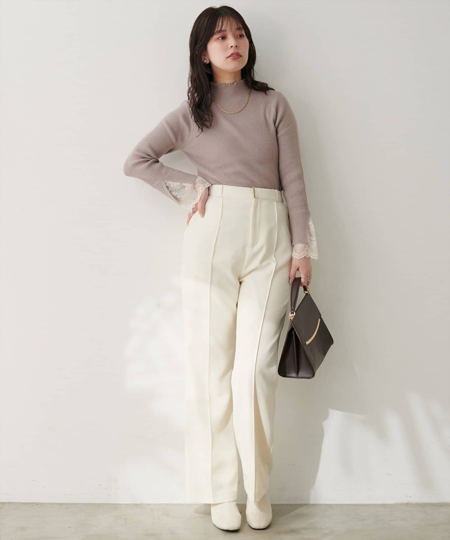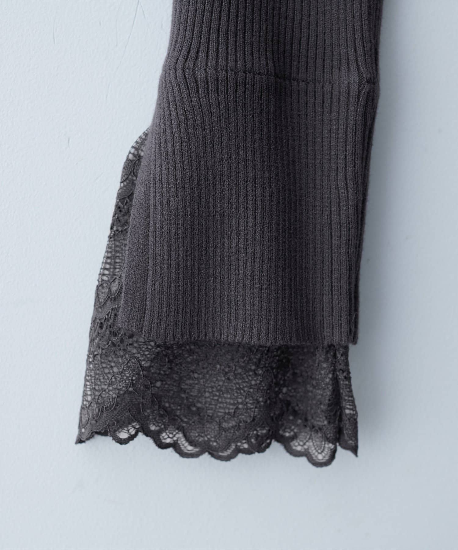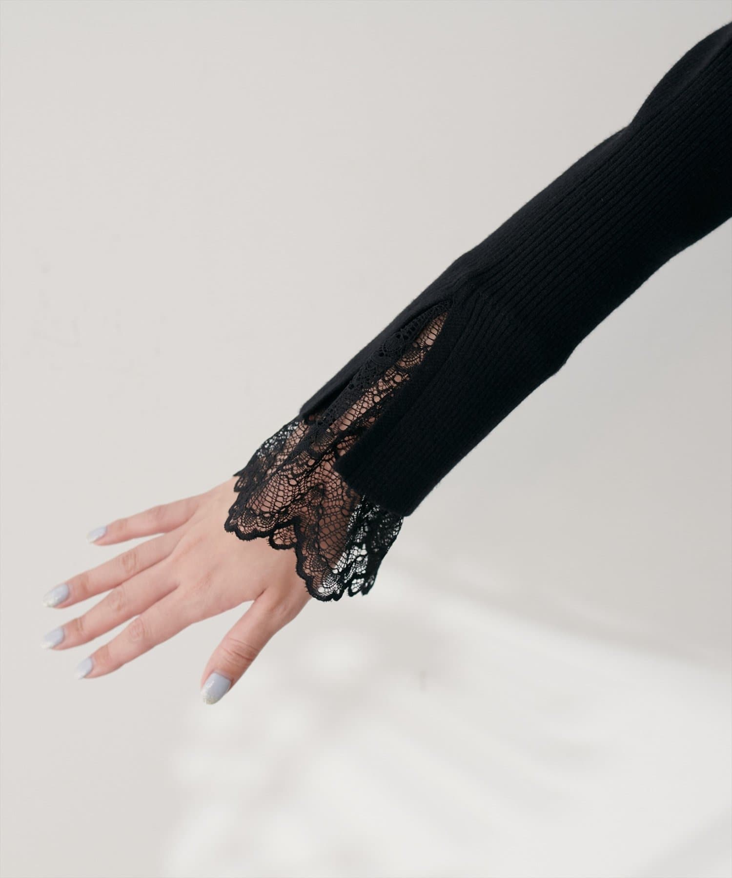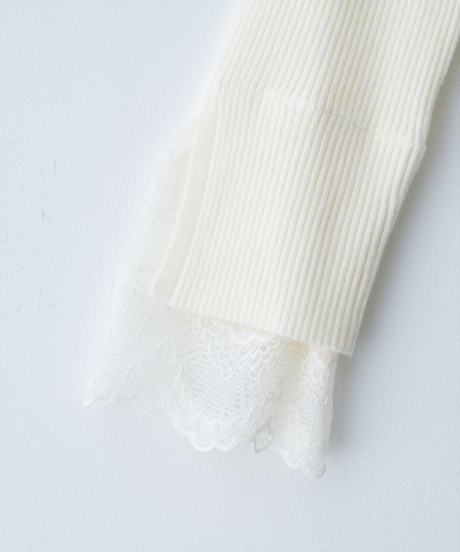 コーディネートを選ばないシンプルなリブニットに袖口のレース切替がフェミニンなハイネックニット。
