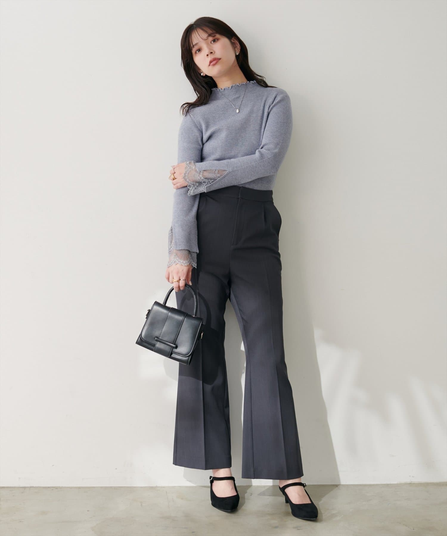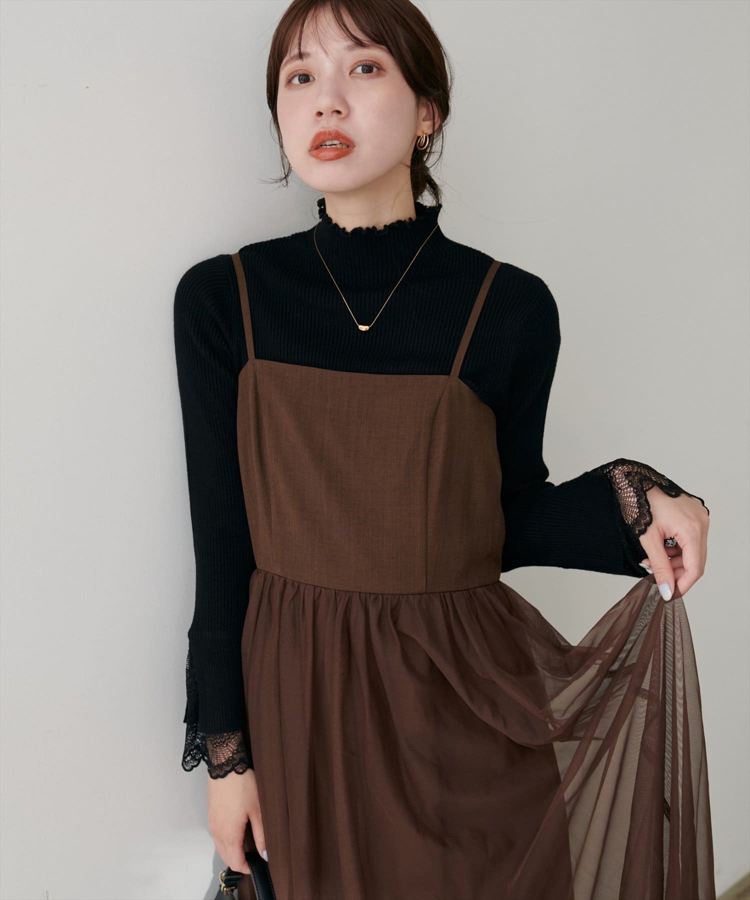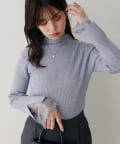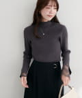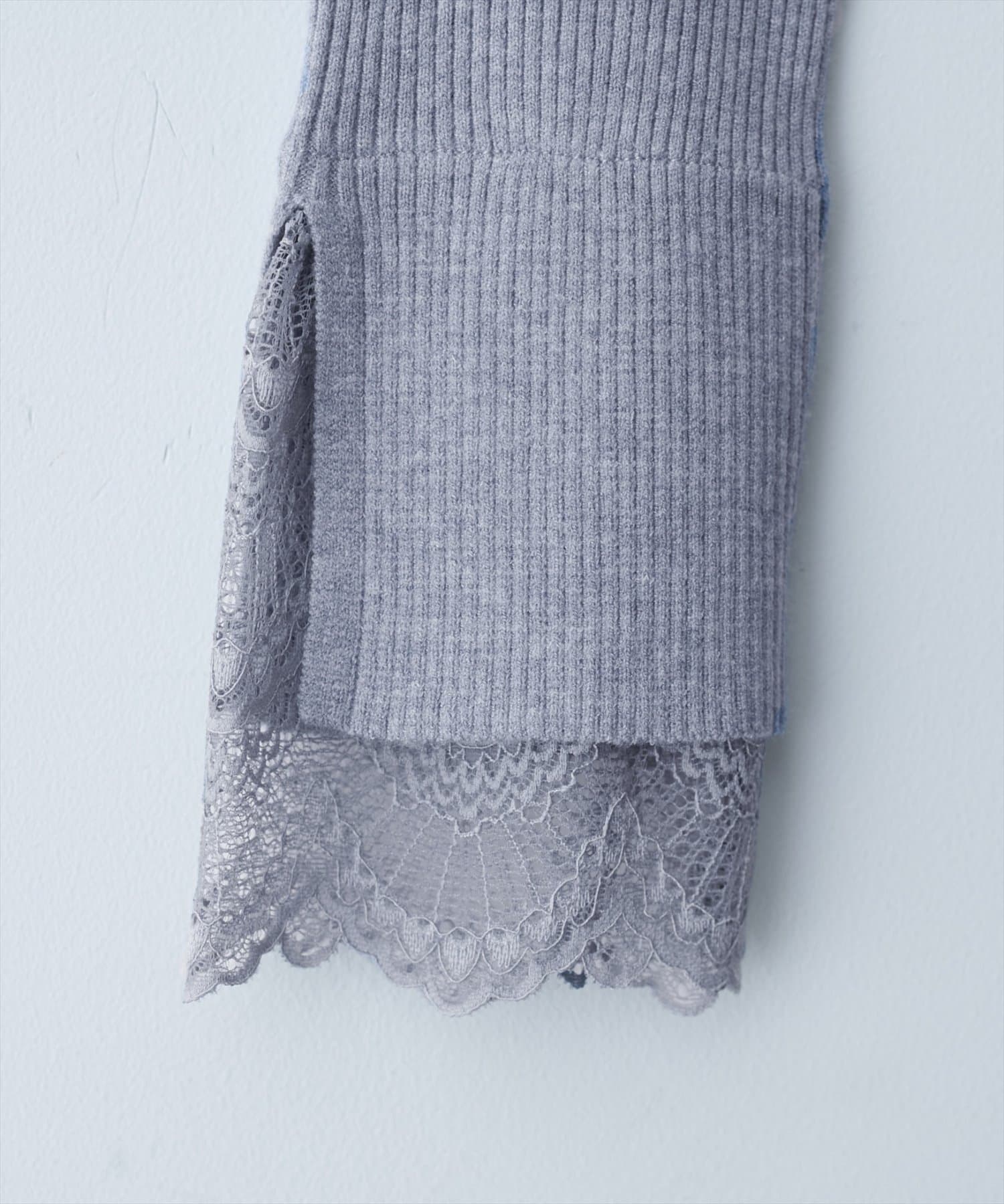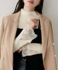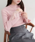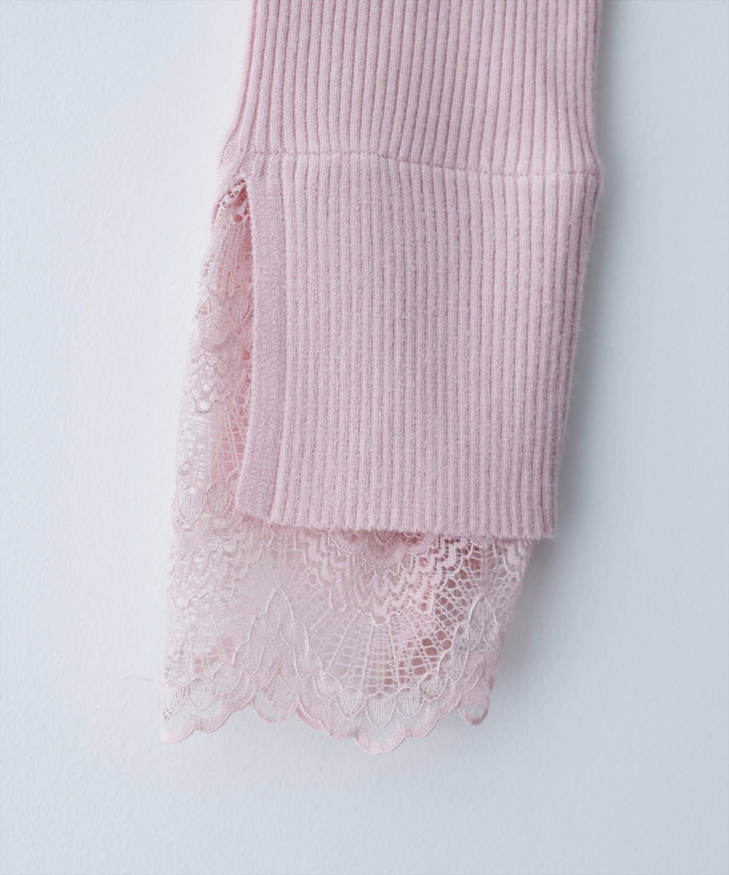 コーディネートを選ばないシンプルなリブニットに袖口のレース切替がフェミニンなハイネックニット。