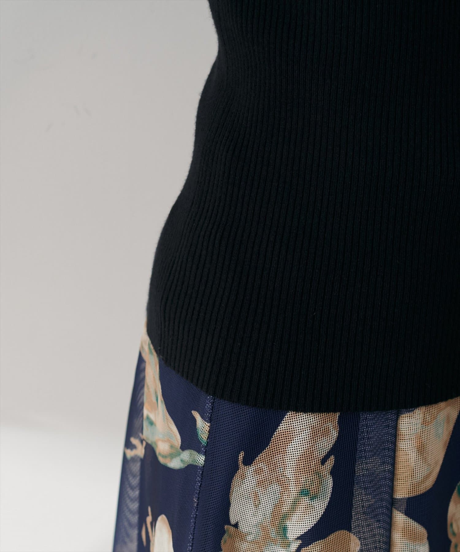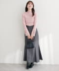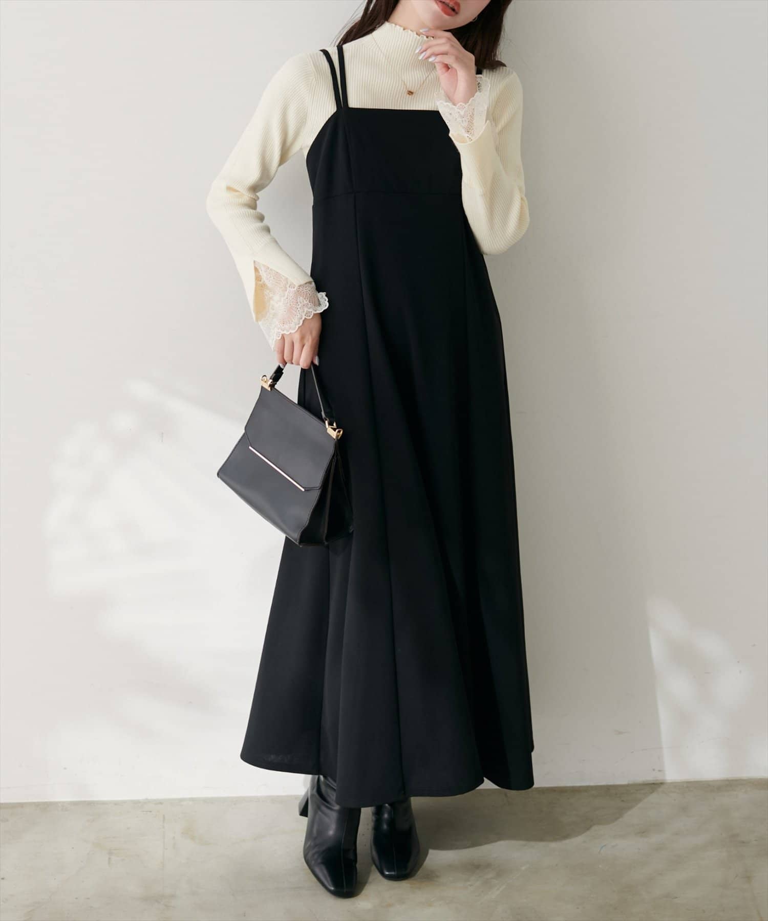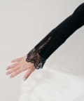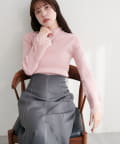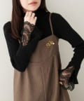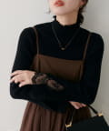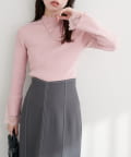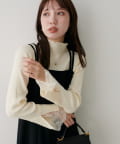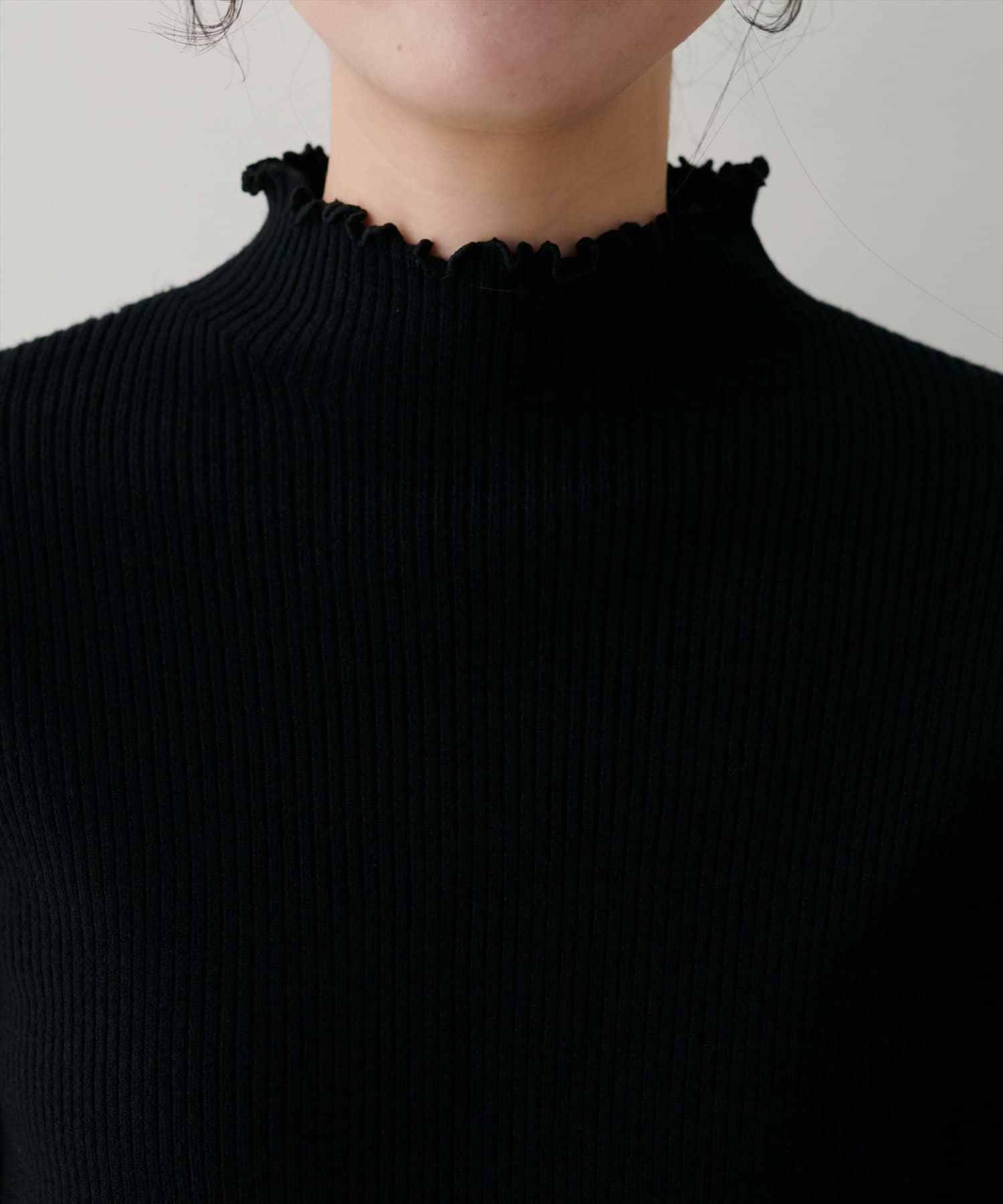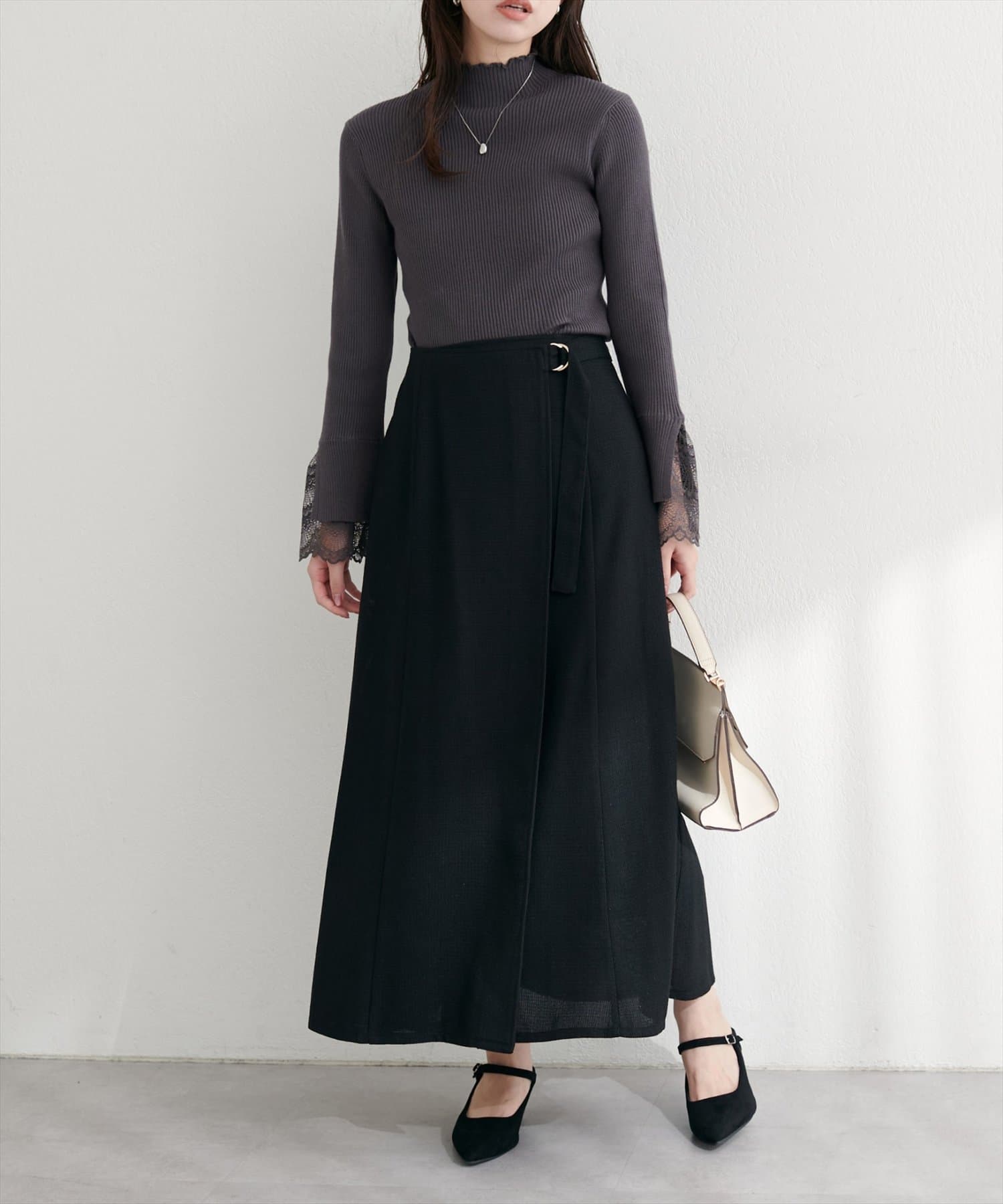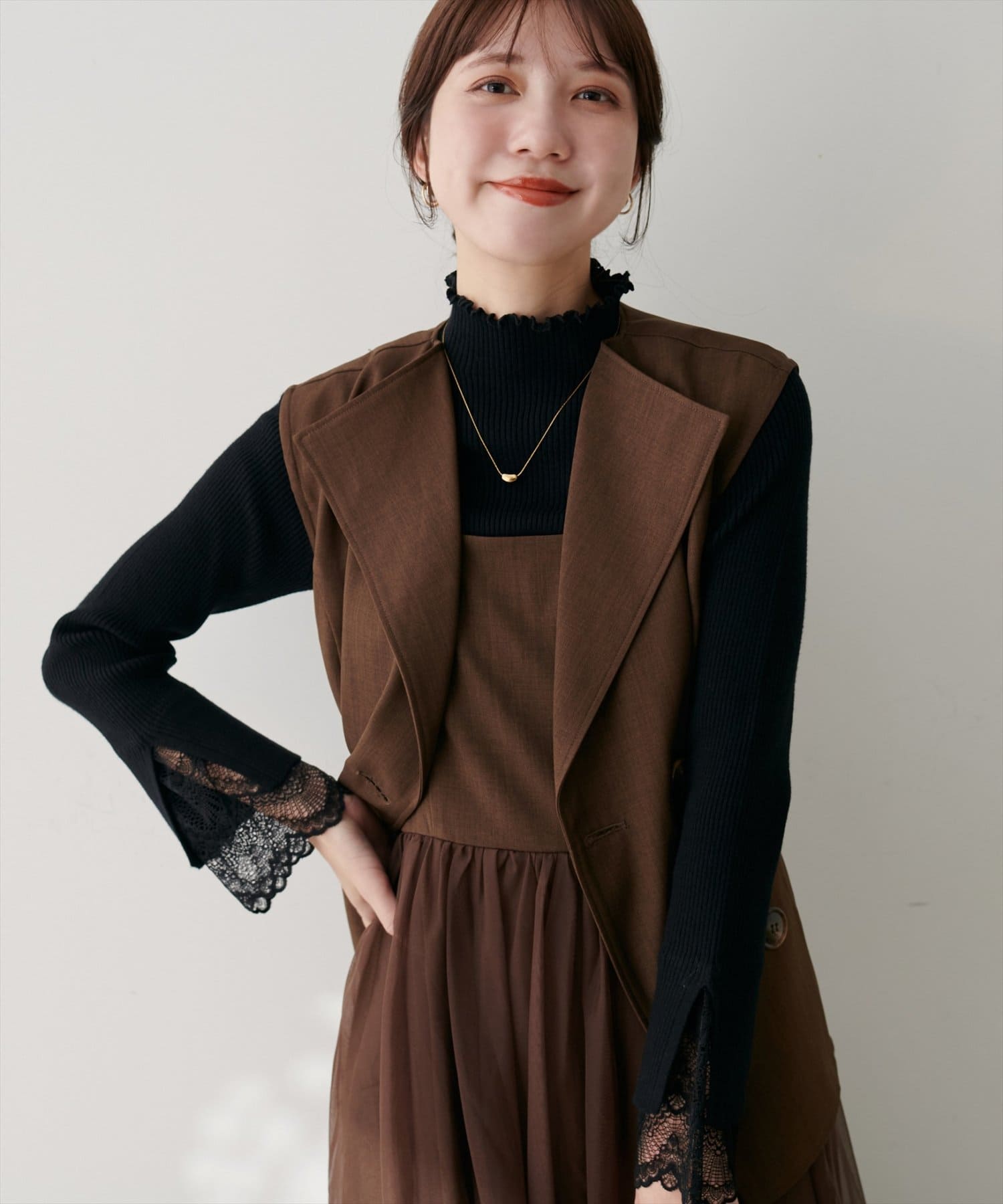 コーディネートを選ばないシンプルなリブニットに袖口のレース切替がフェミニンなハイネックニット。