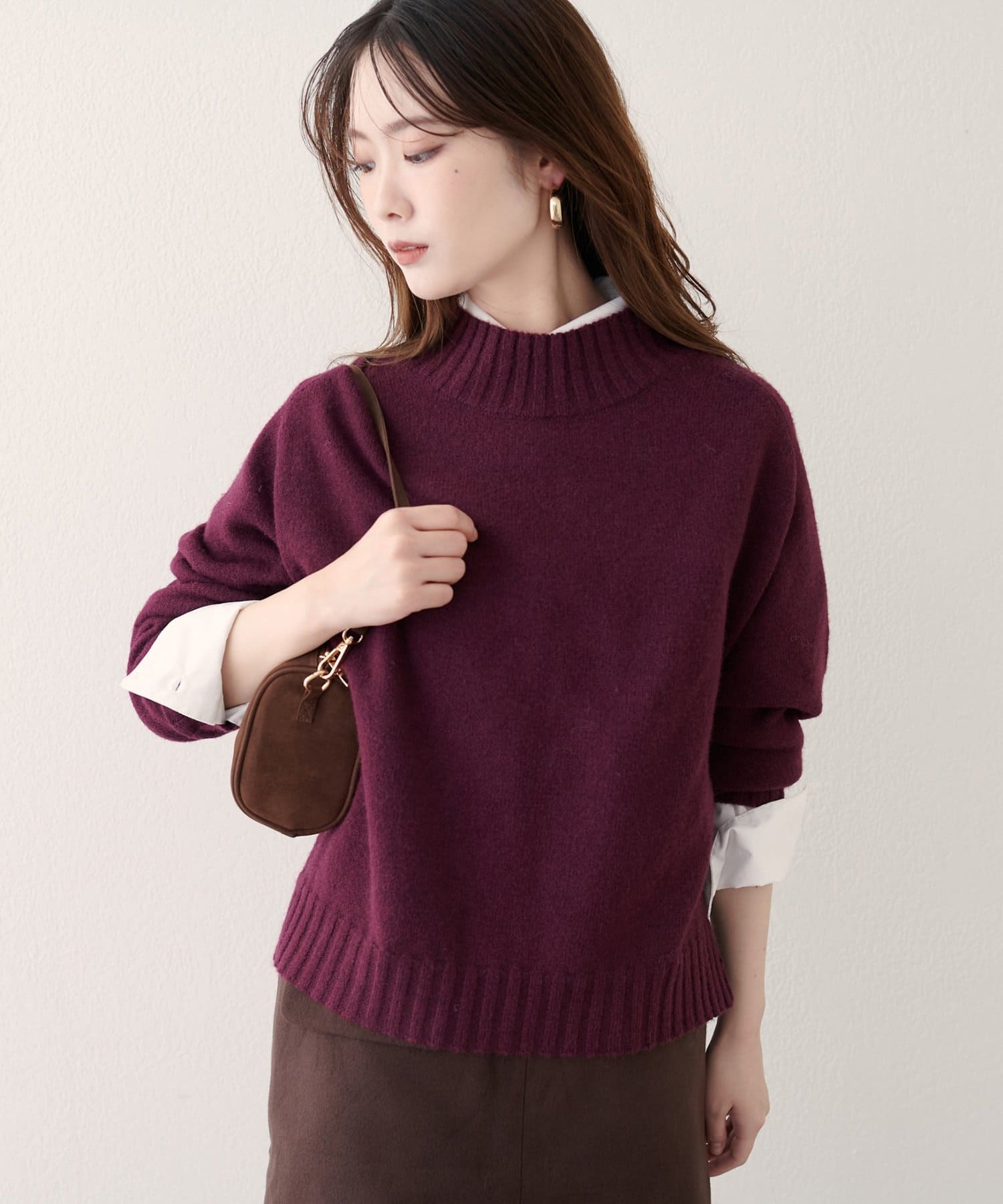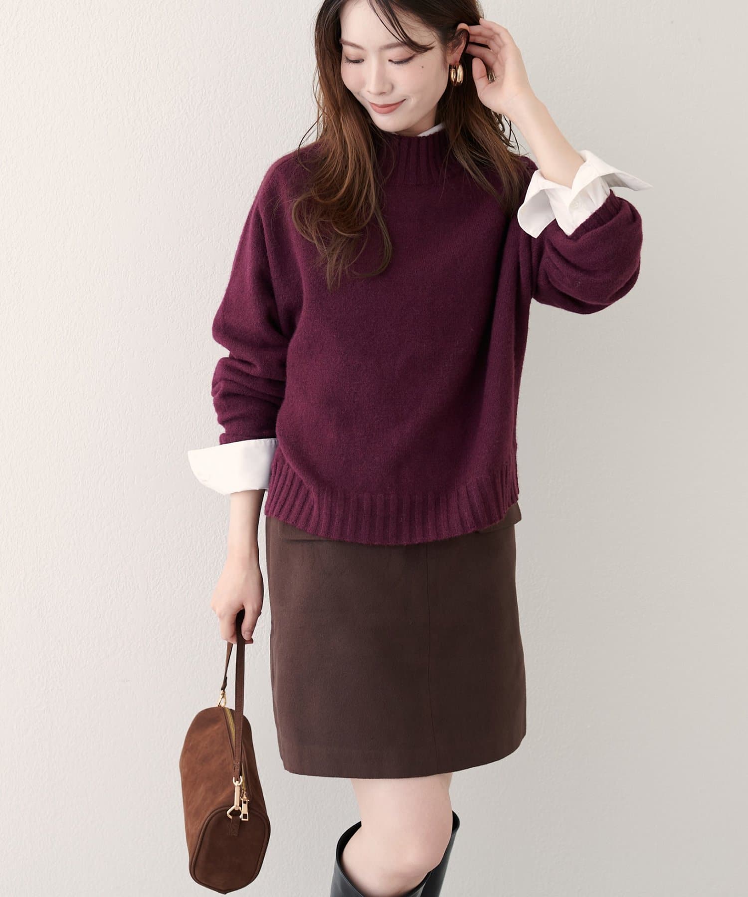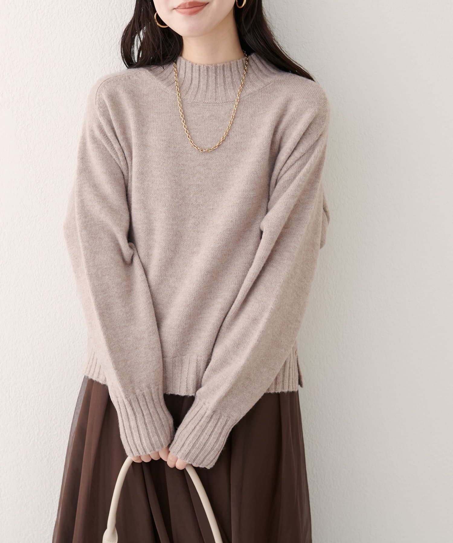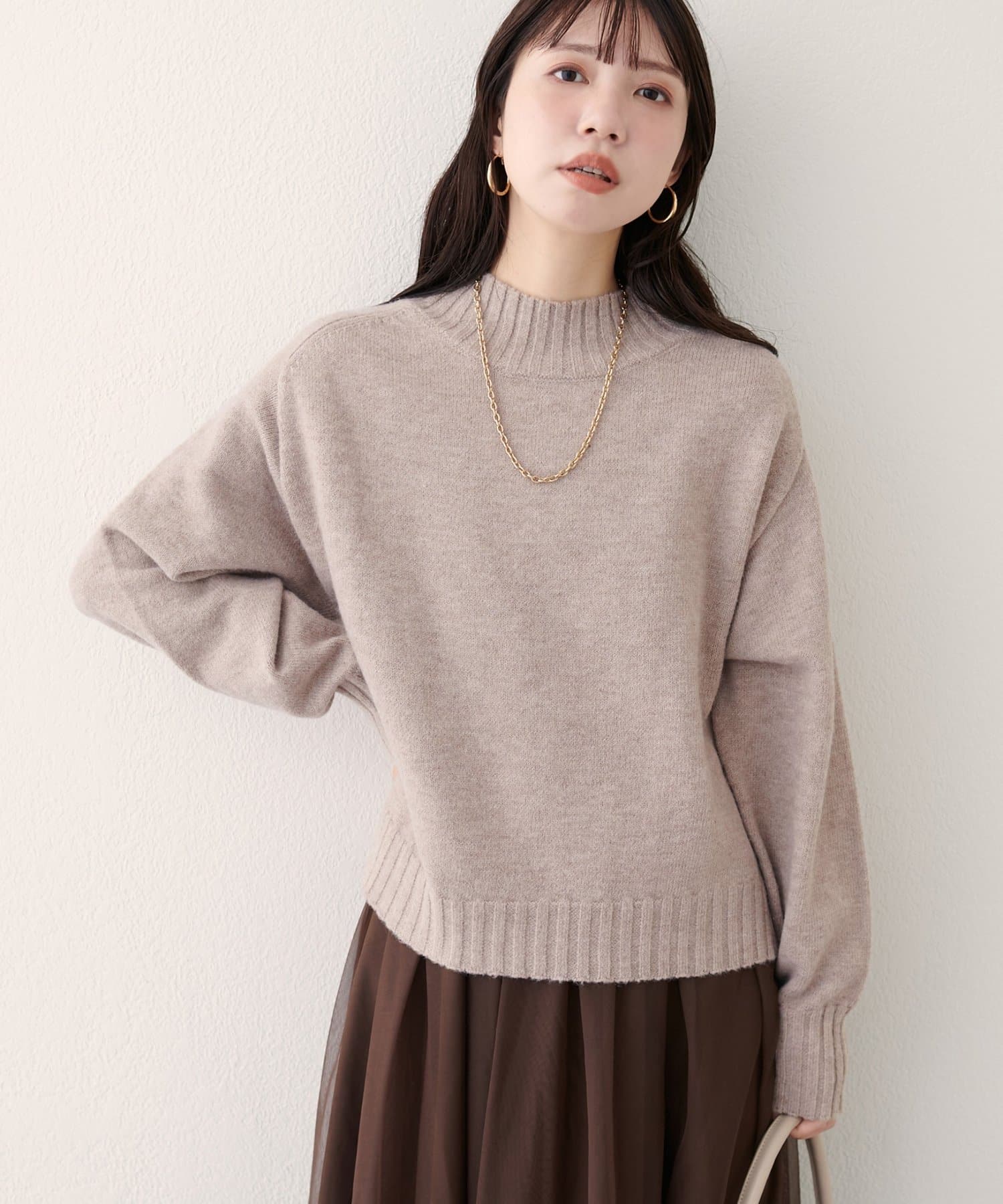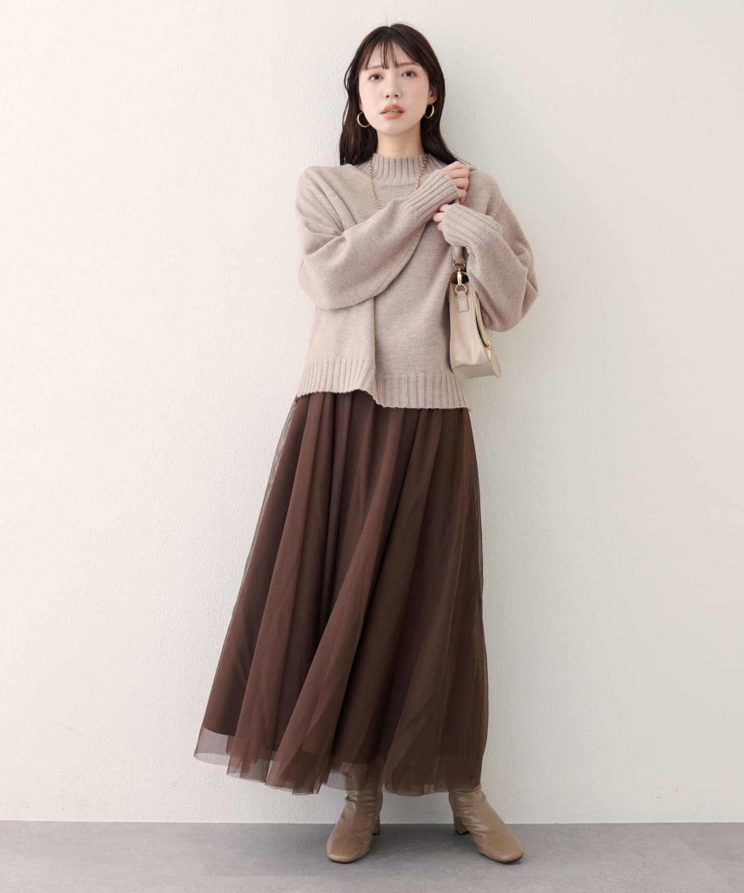 首元はハイネックで、暖かさと上品さをプラス。
