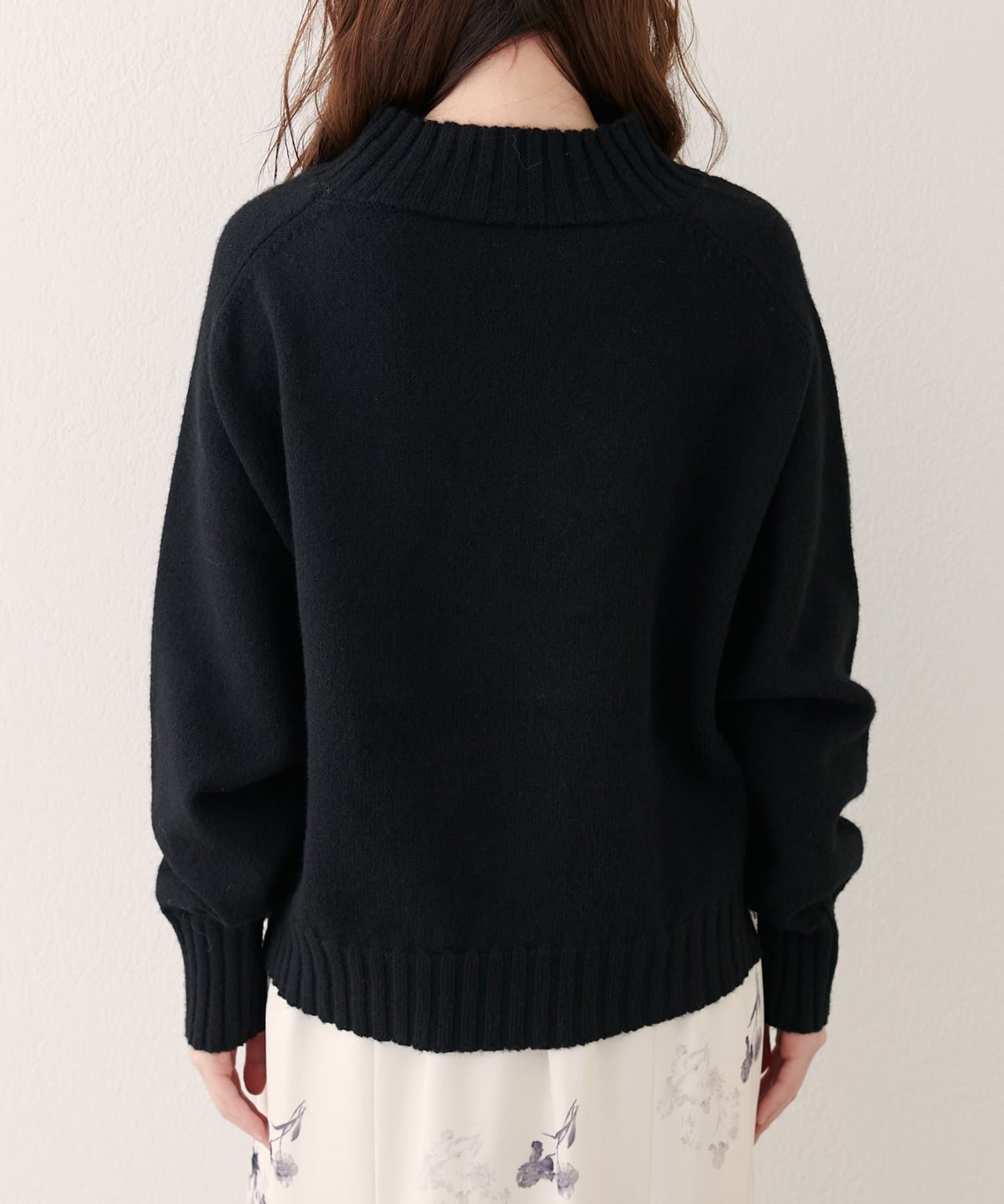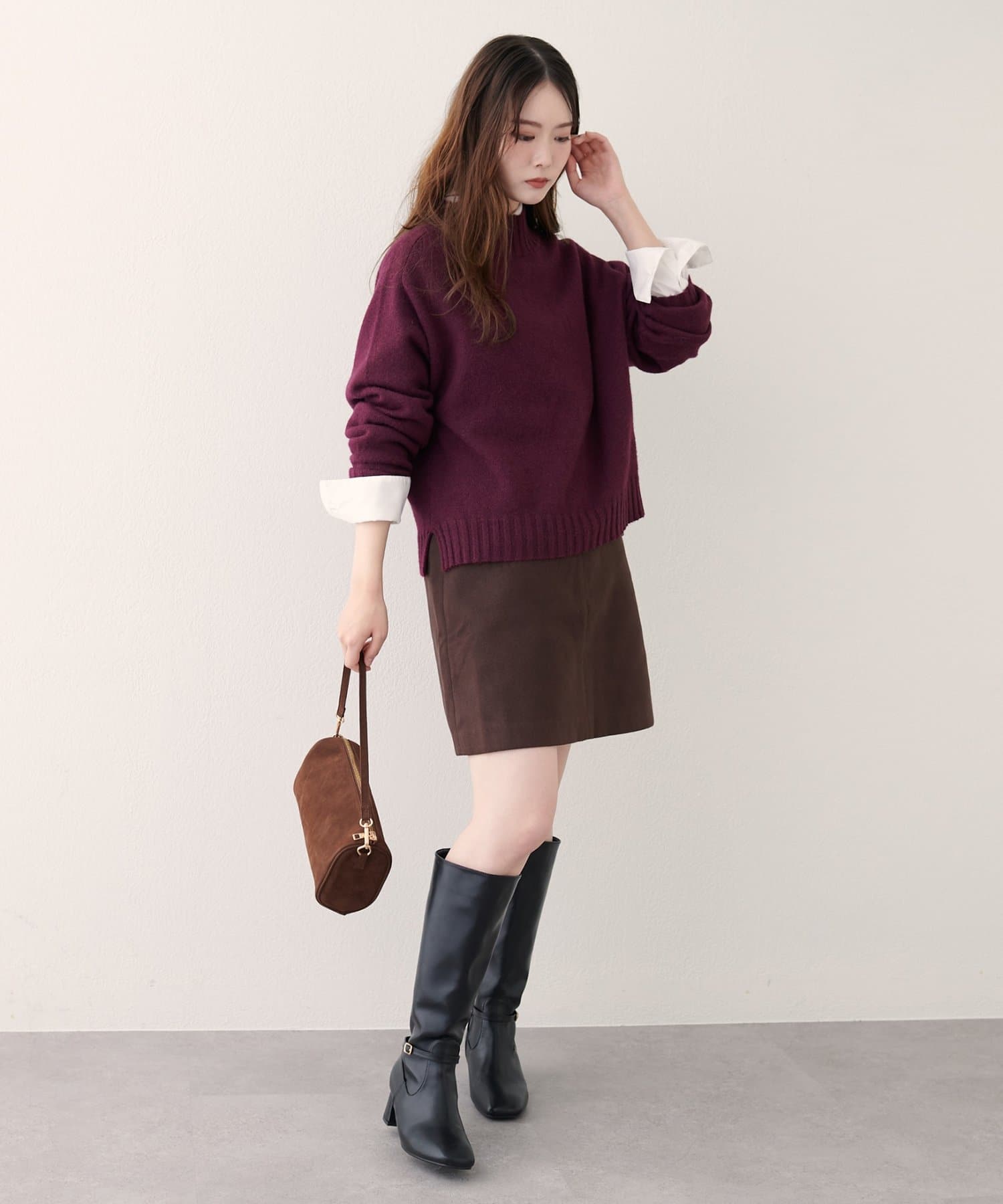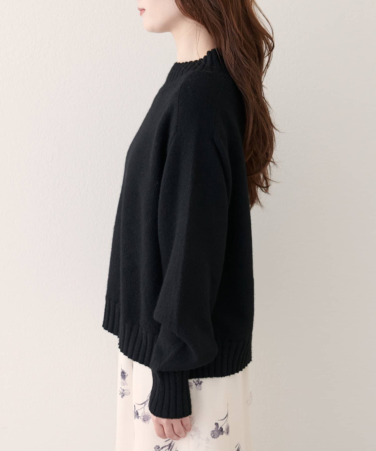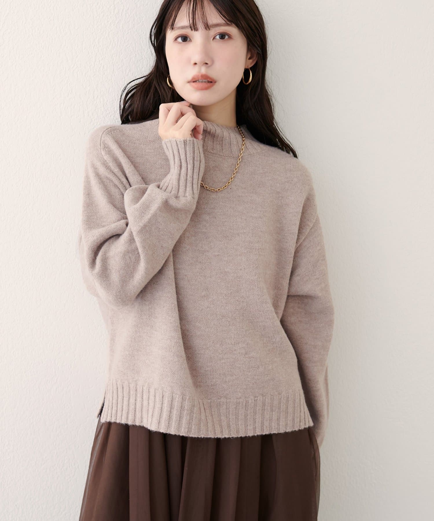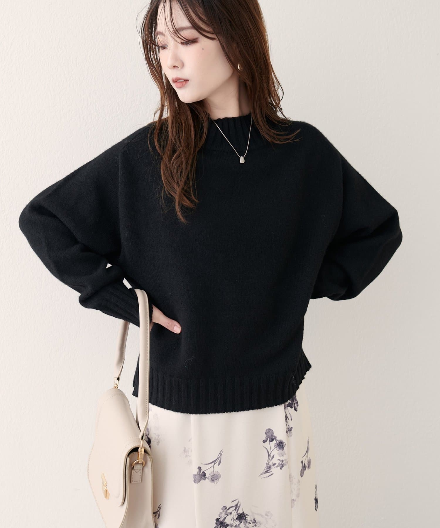 首元はハイネックで、暖かさと上品さをプラス。