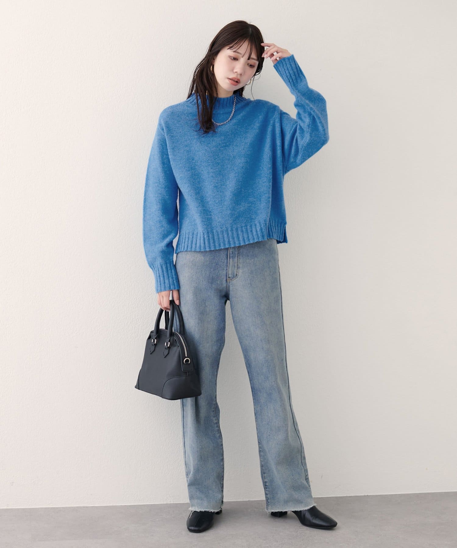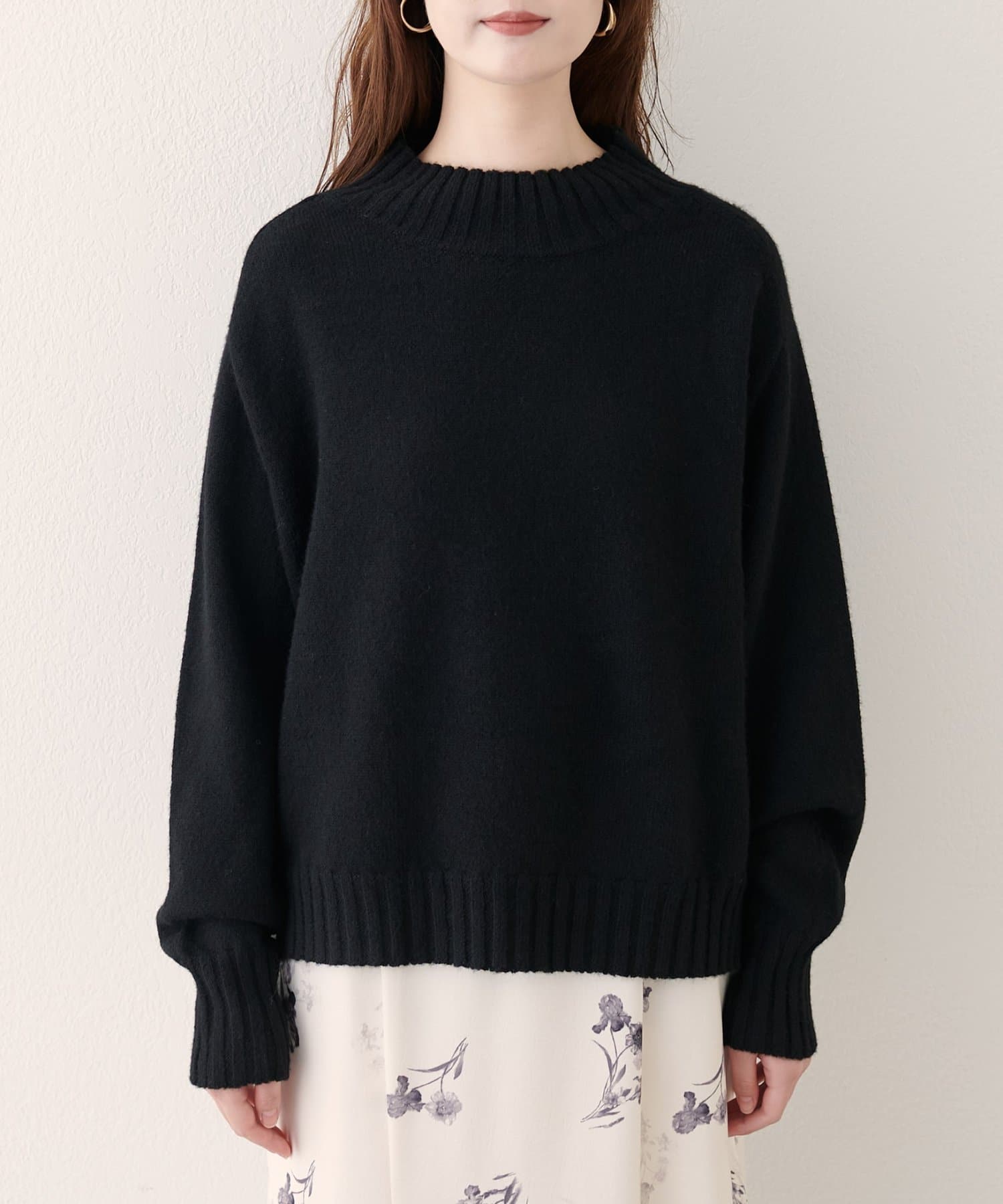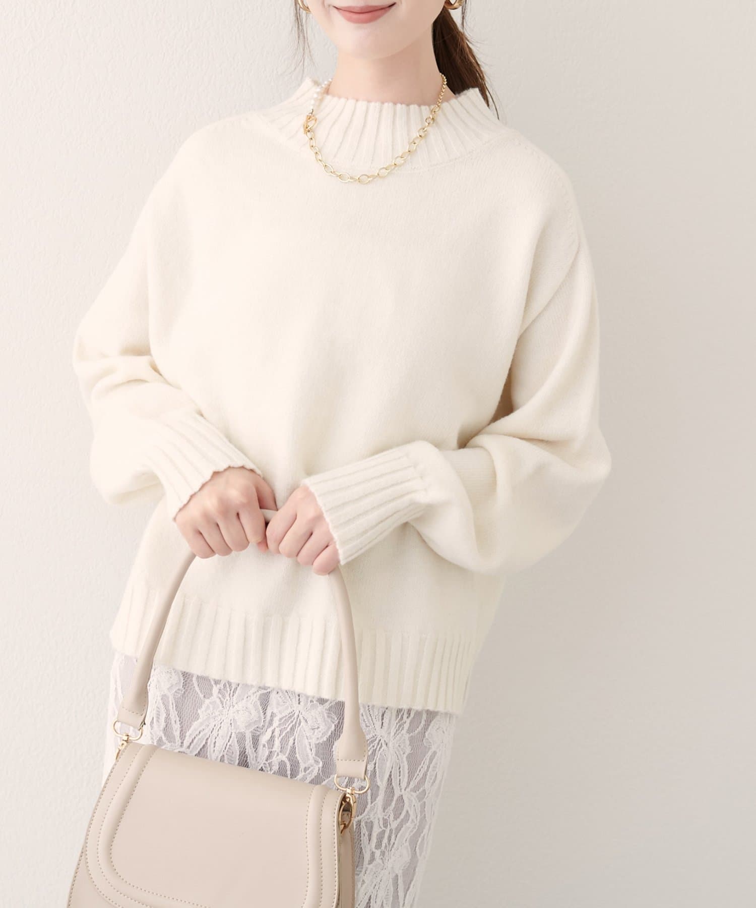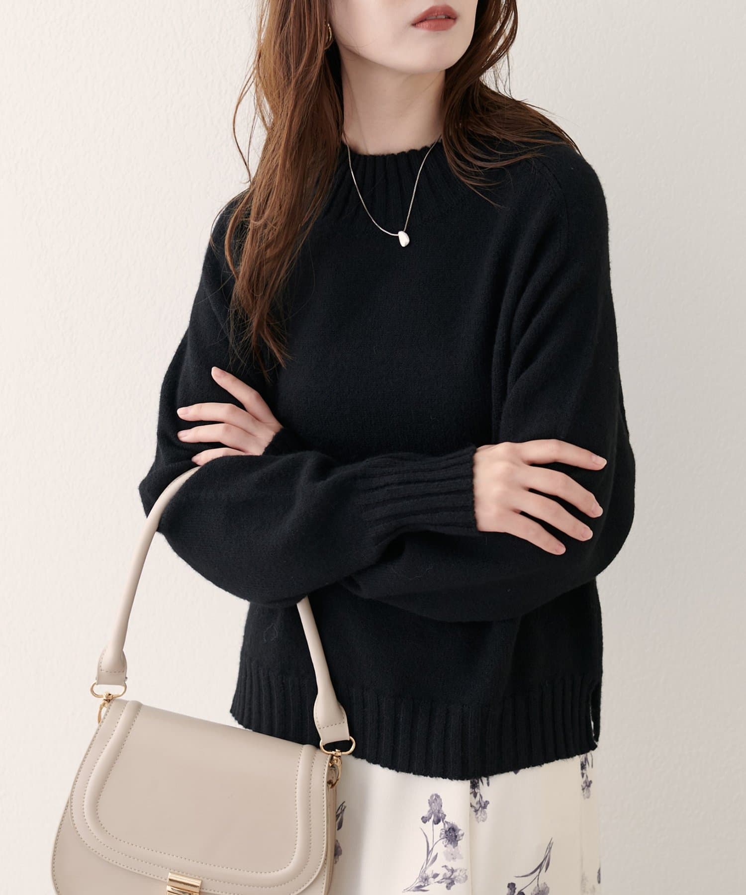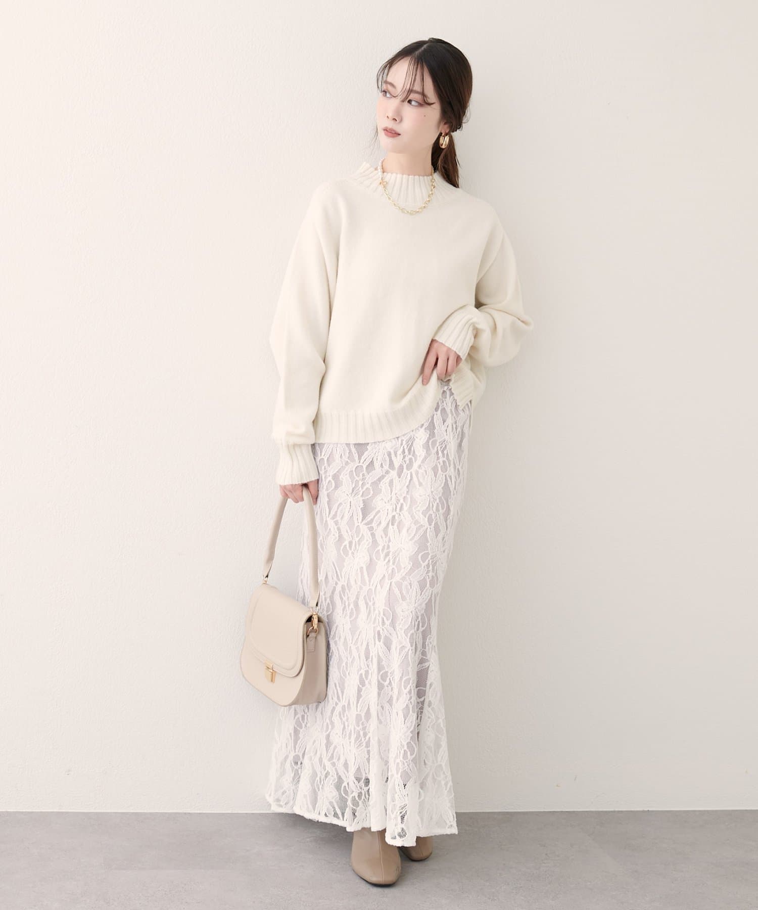 首元はハイネックで、暖かさと上品さをプラス。