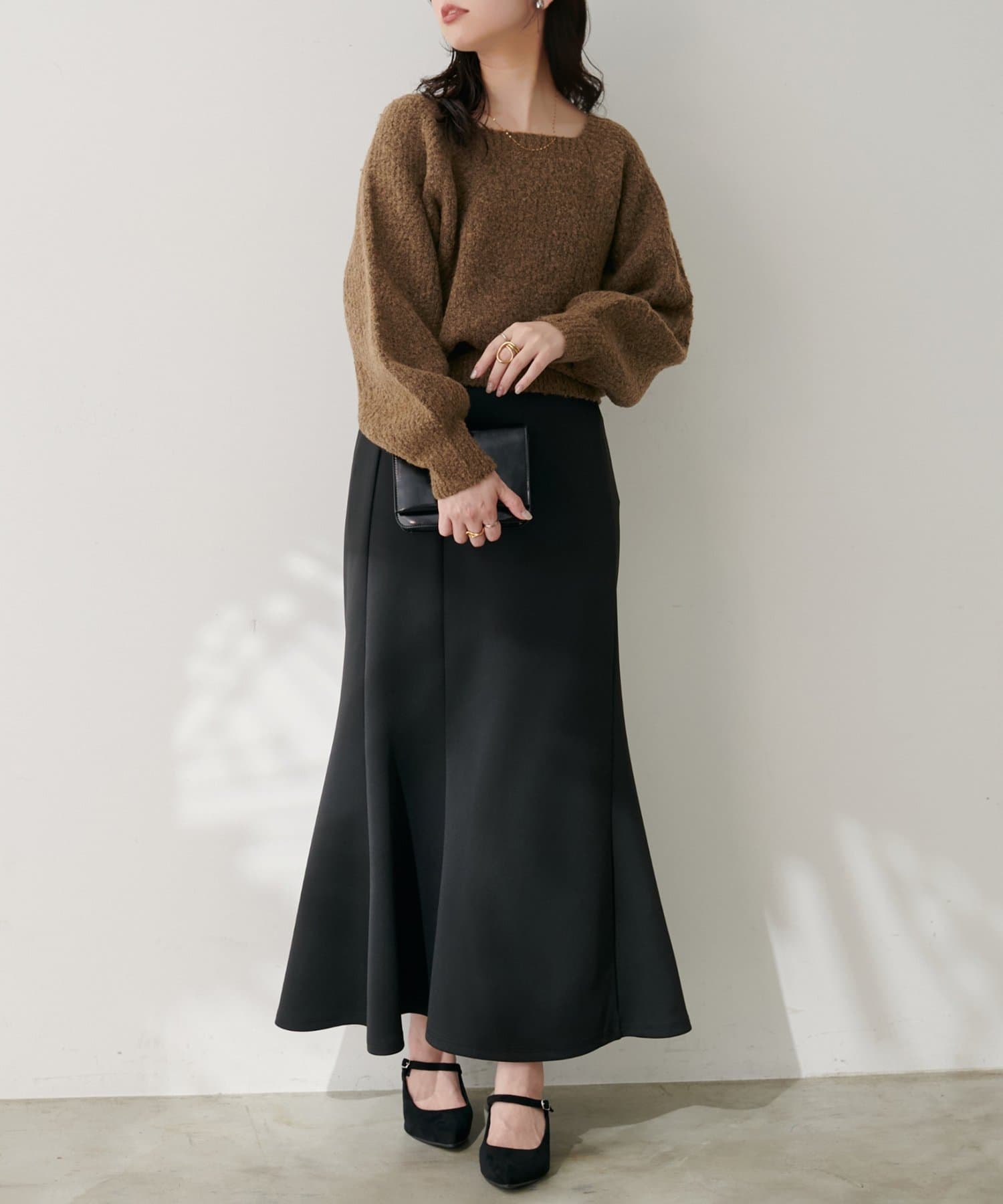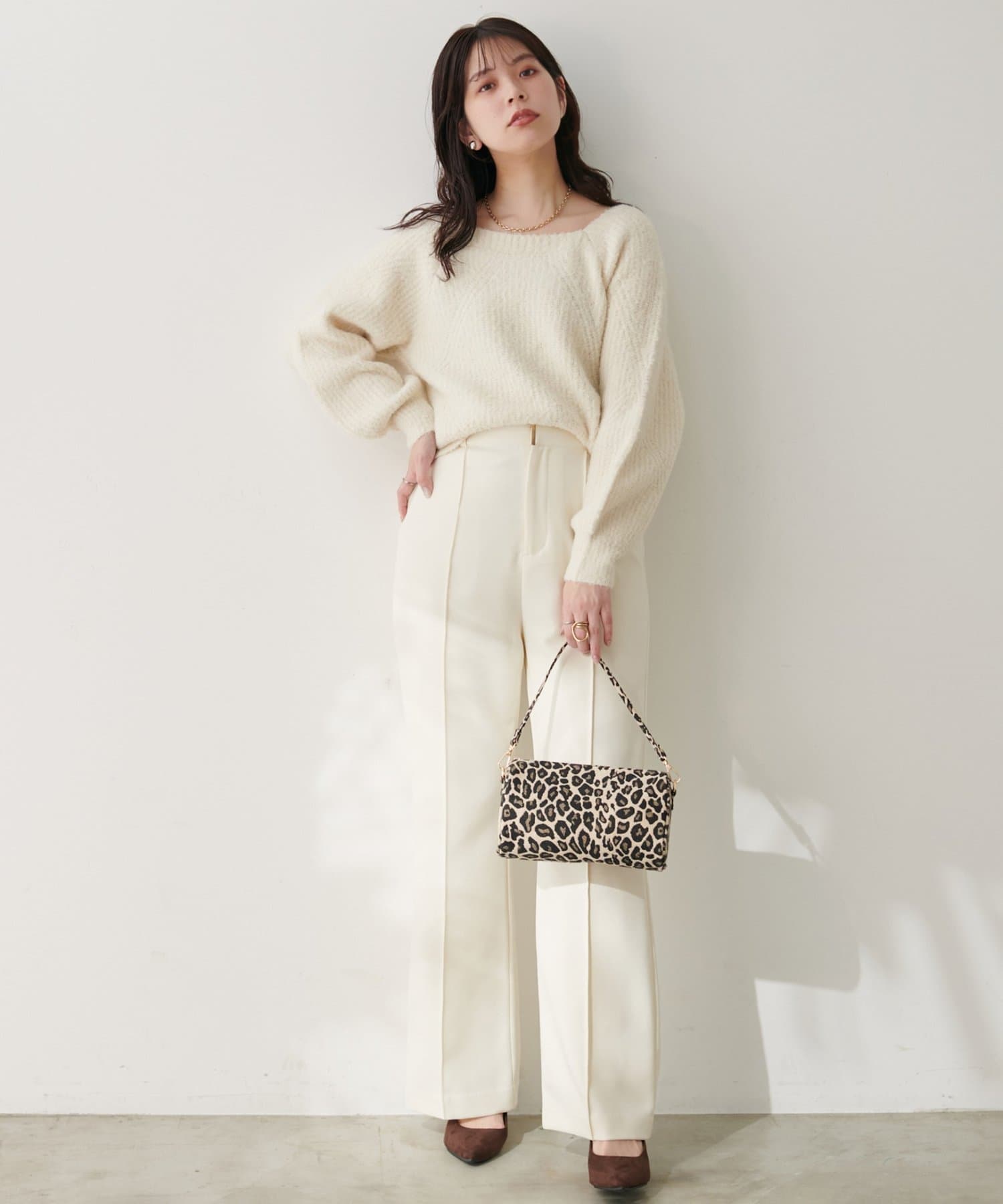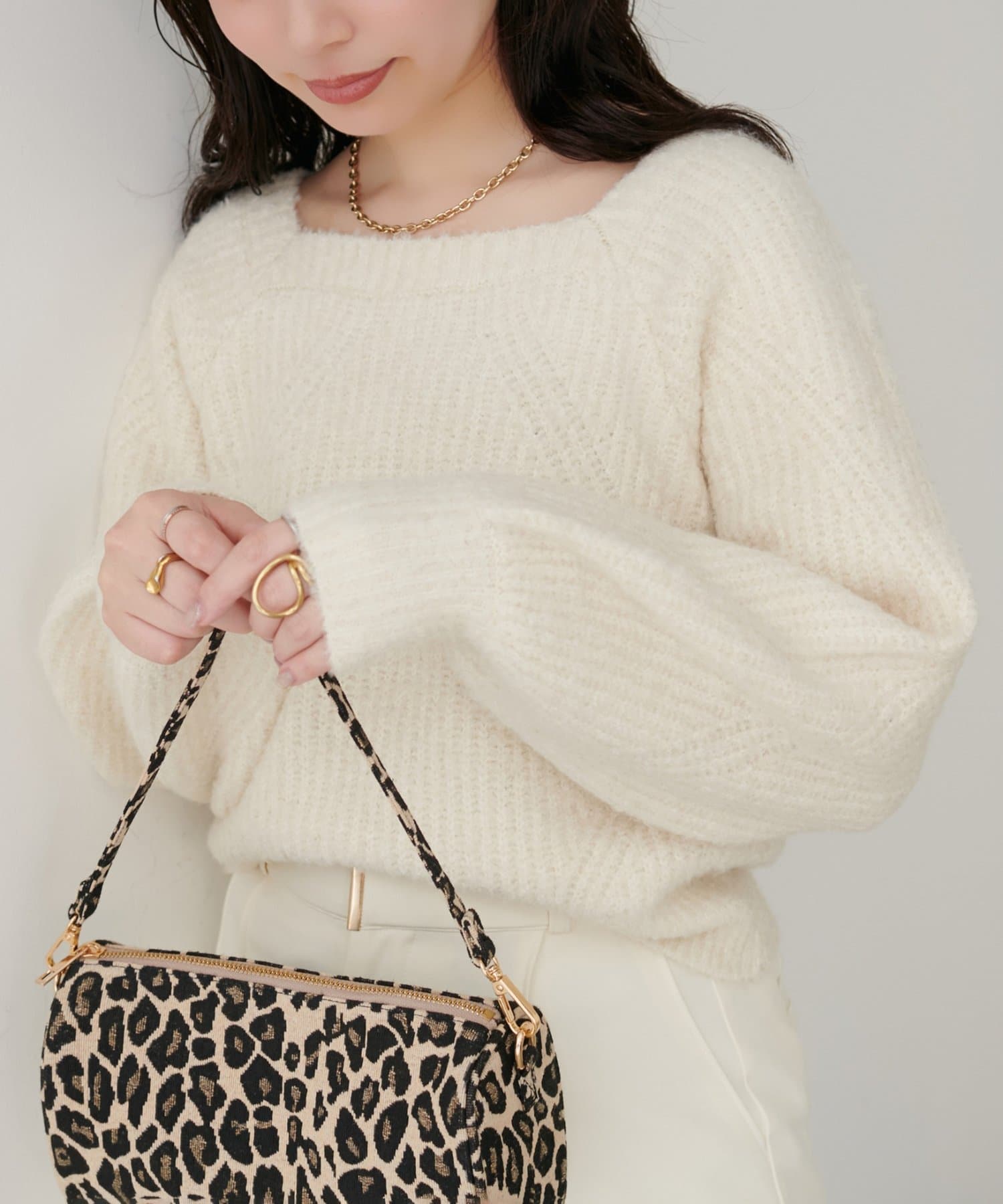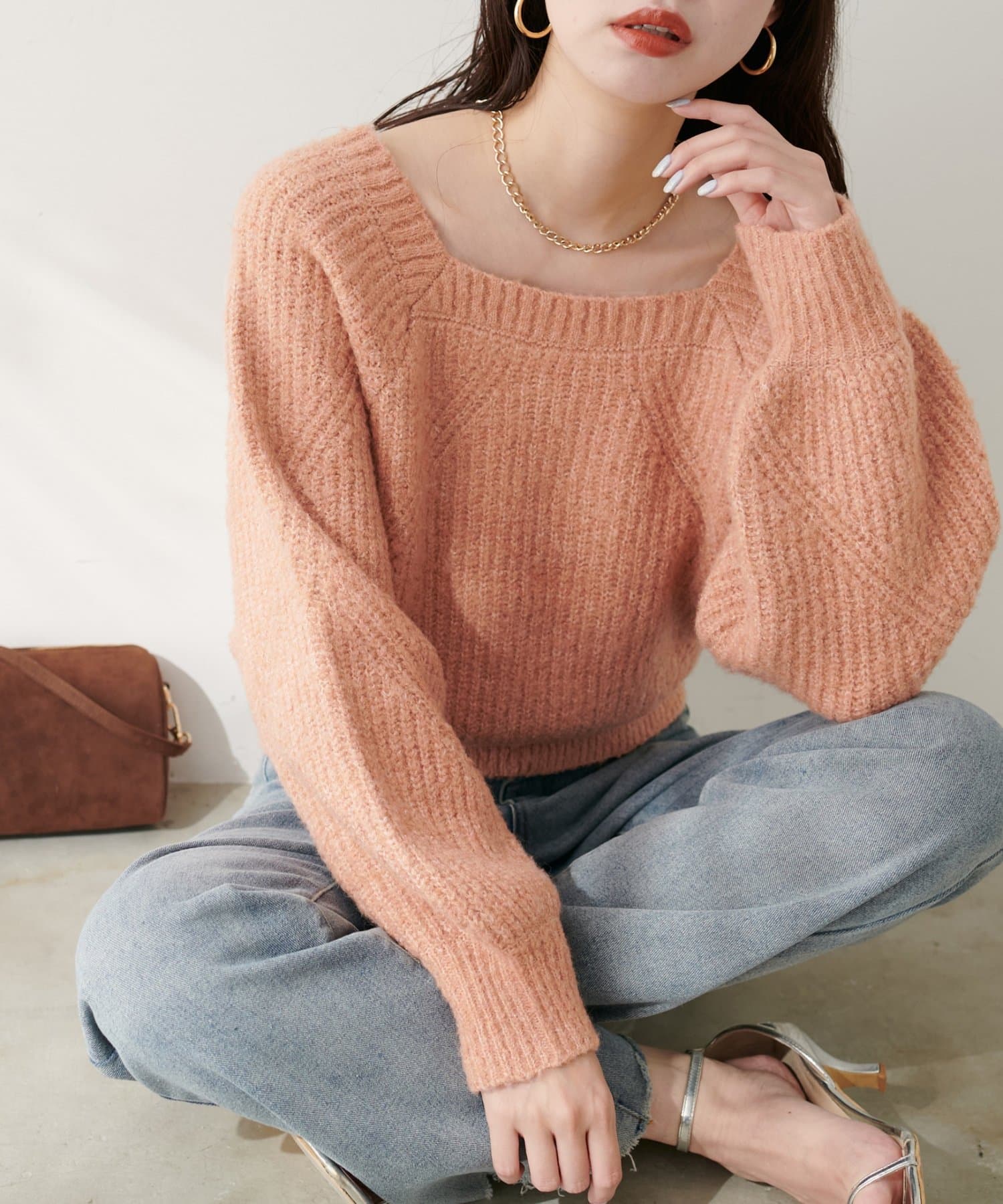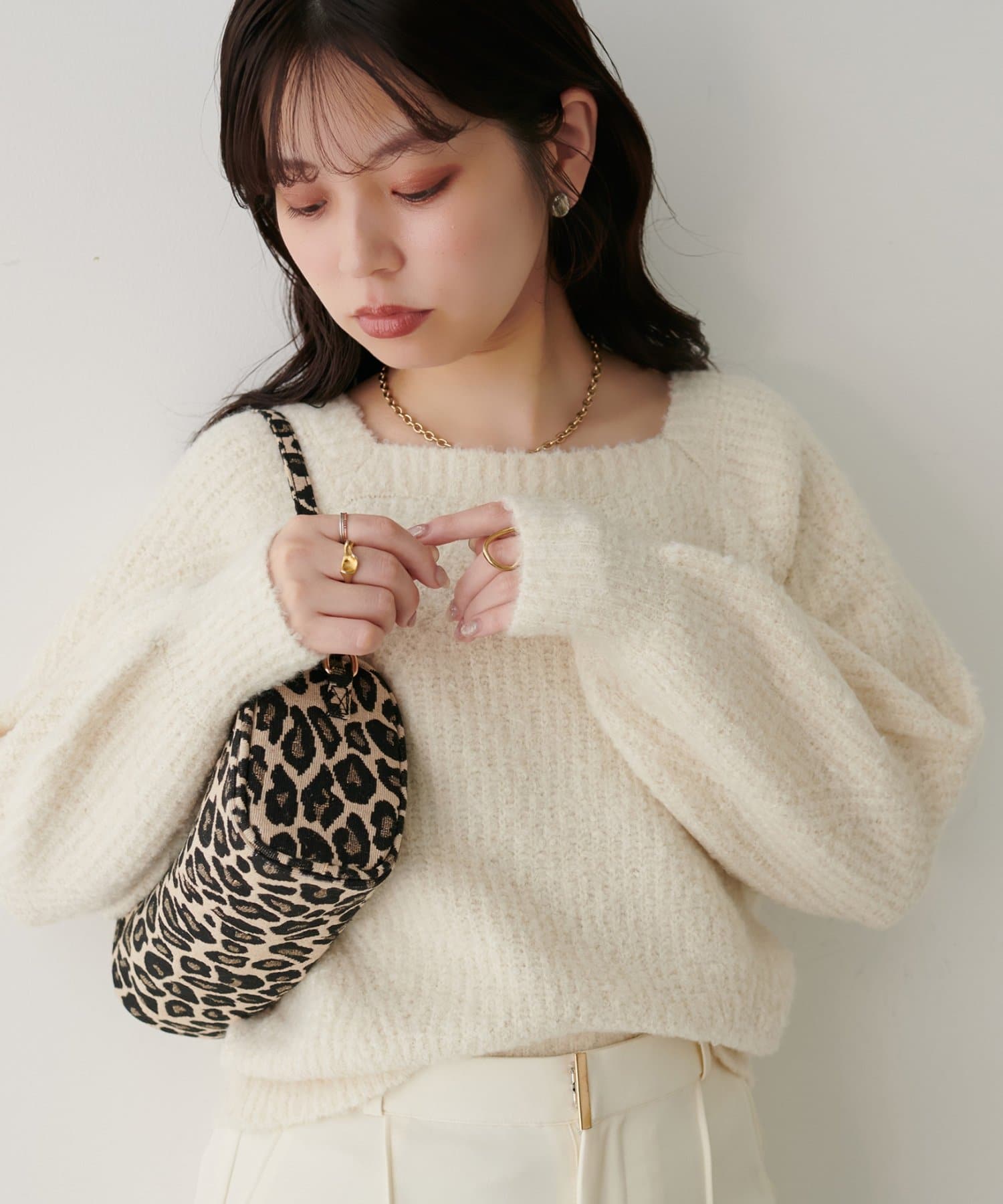 スクエアネックはデコルテを美しく見せ、重くなりがちなニットコーデに抜け感を与えてくれます。