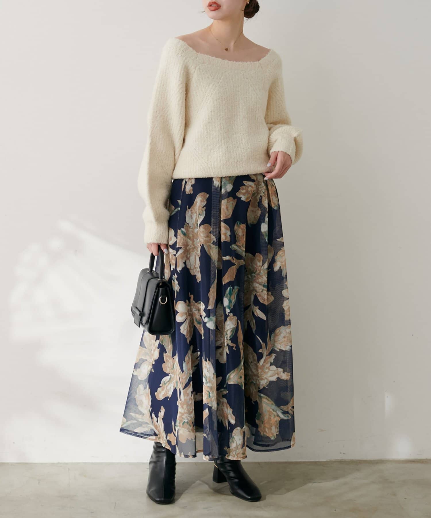 フレアスカートやワンピースにレイヤードして、フェミニンな着こなしに。