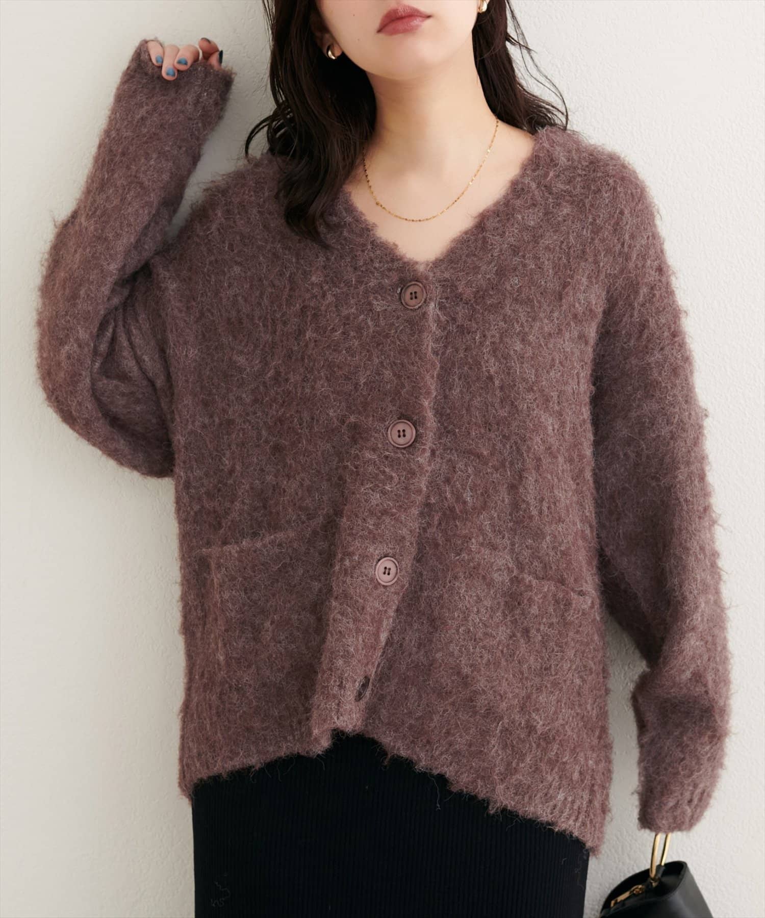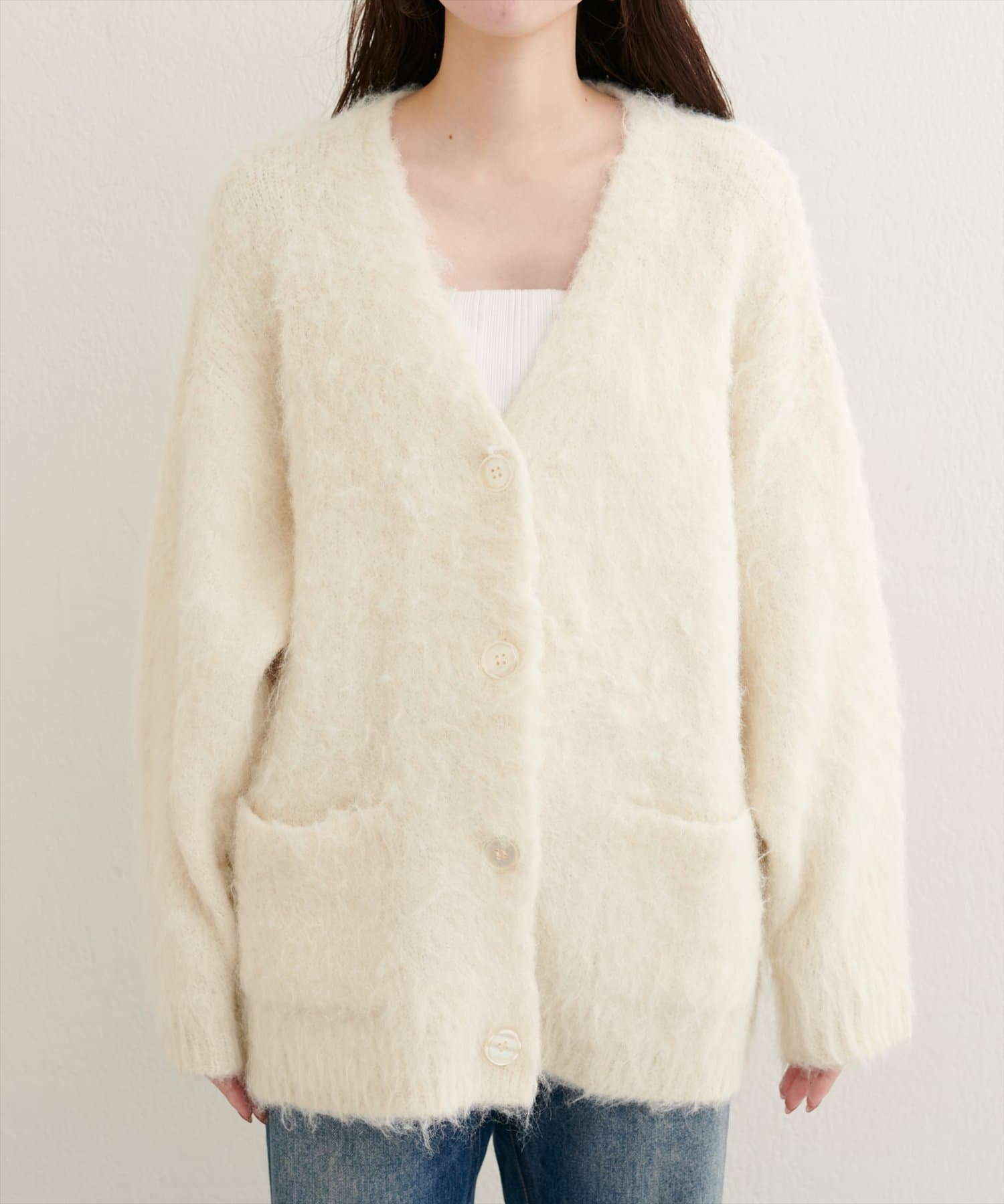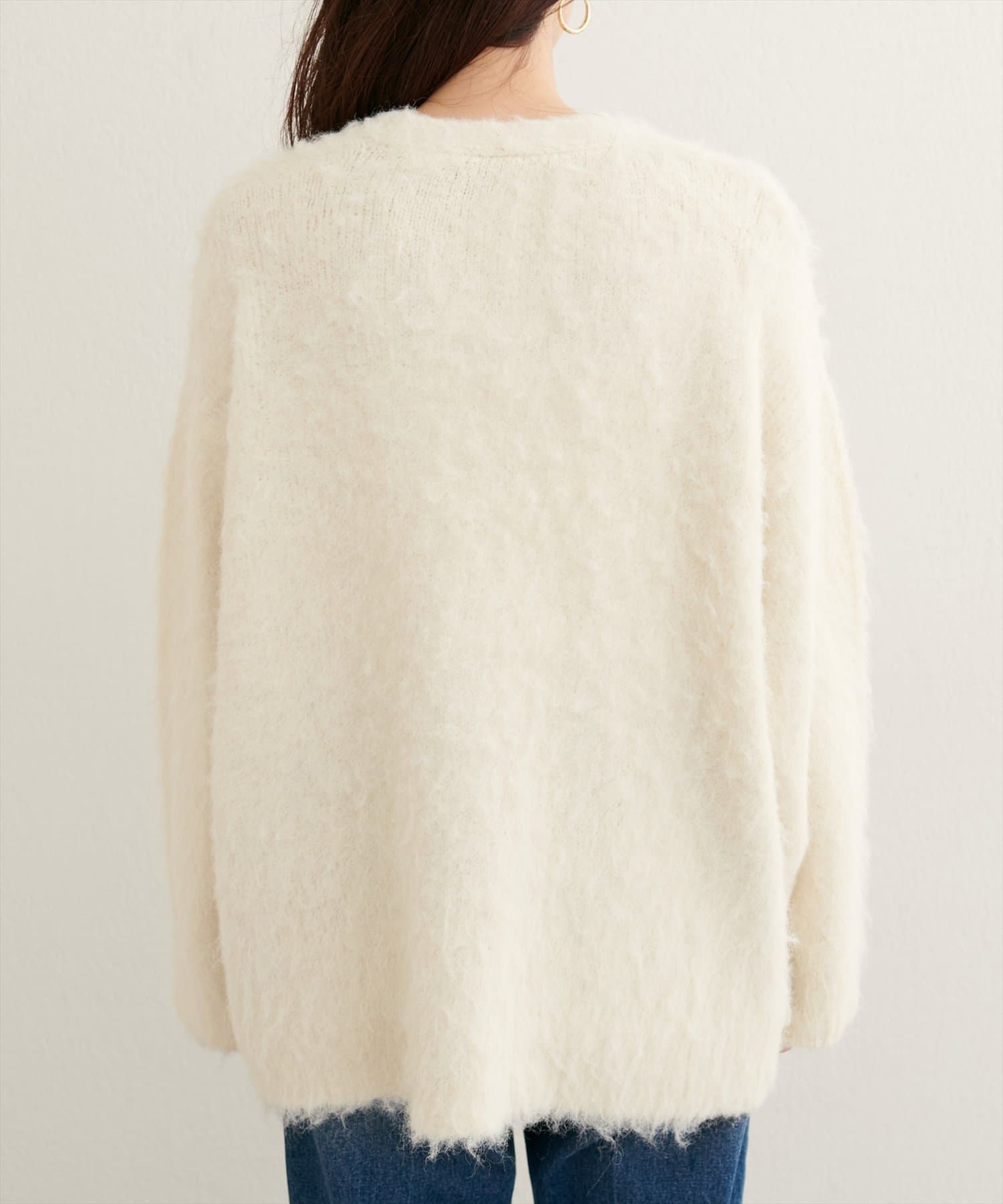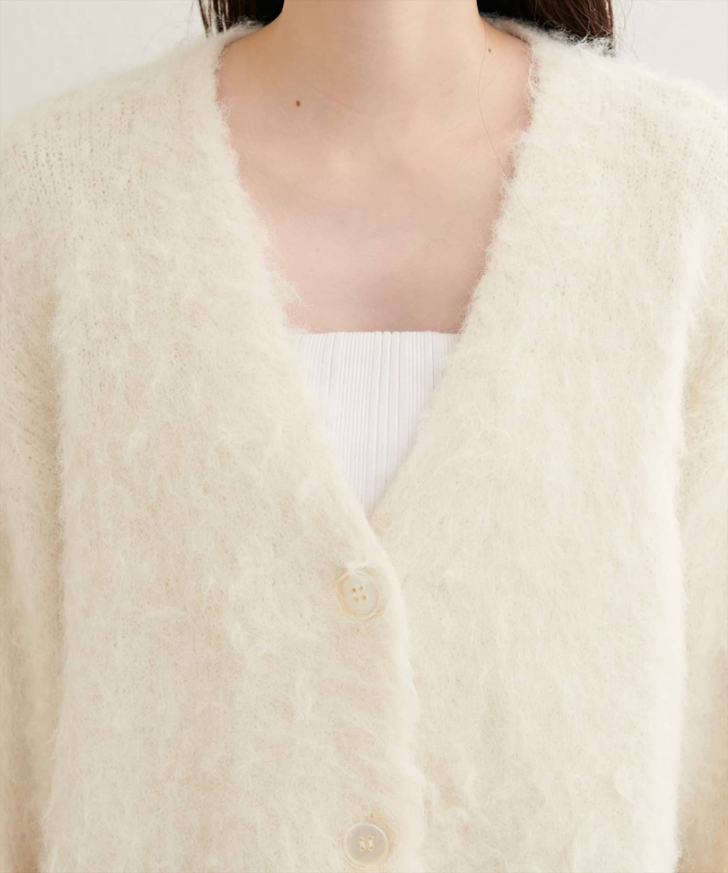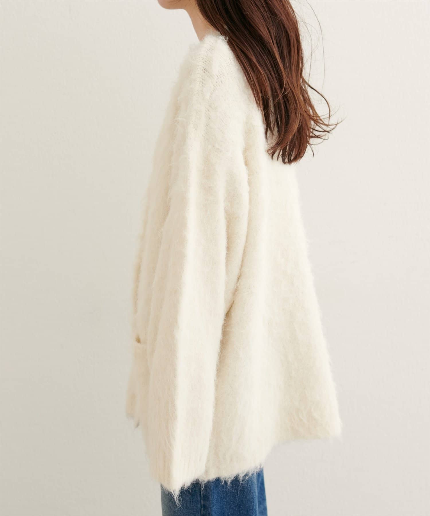 まるで空気を含んだ綿菓子のような、ふんわりとしたシャギー起毛が魅力のVネックニットカーディガン。