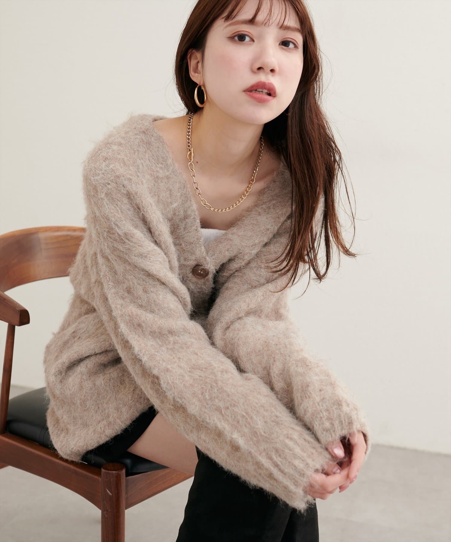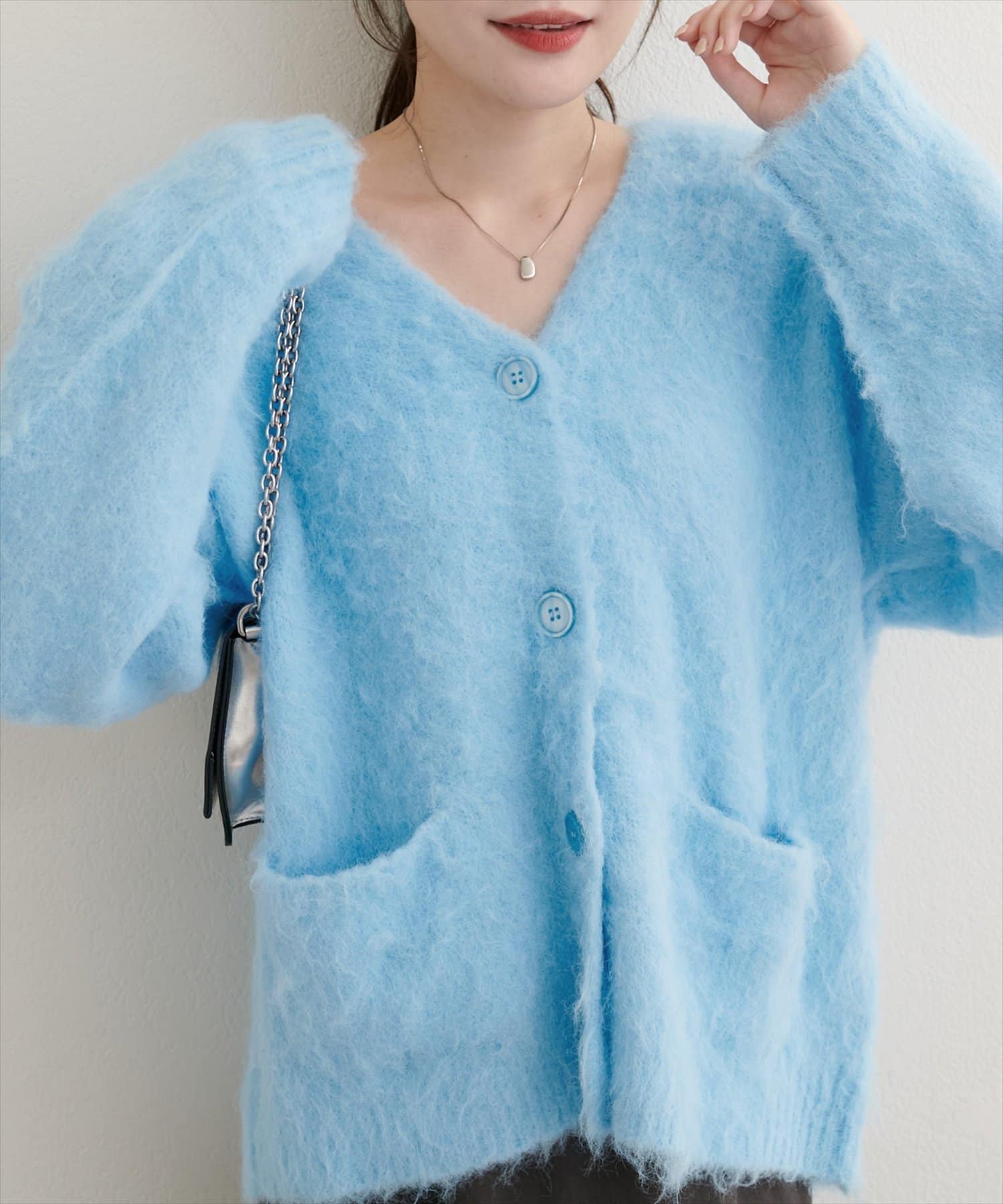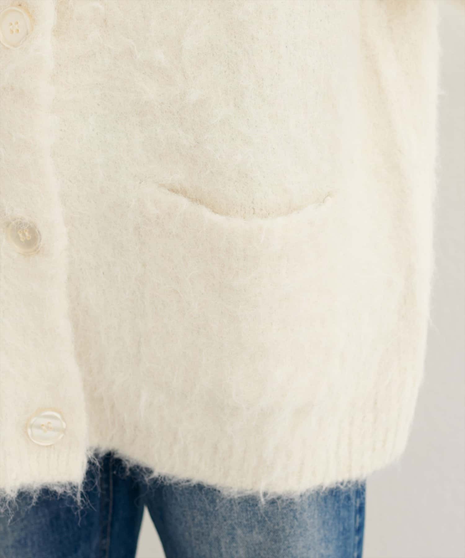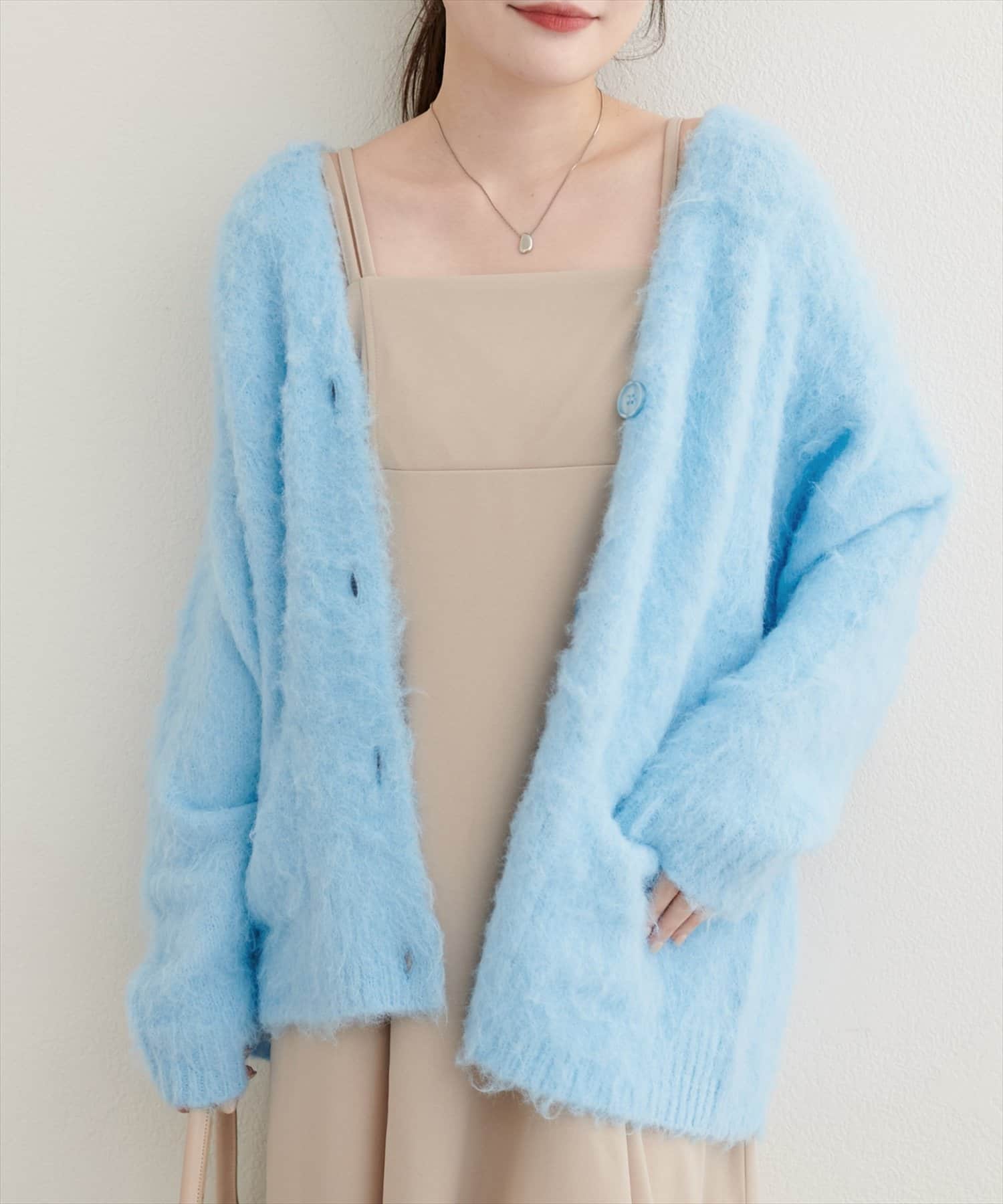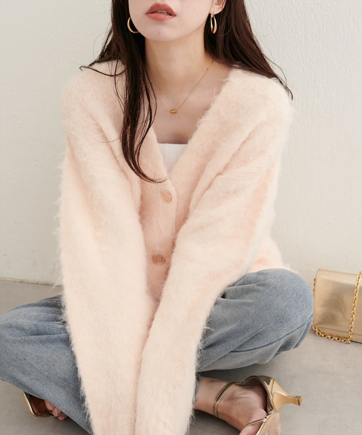 まるで空気を含んだ綿菓子のような、ふんわりとしたシャギー起毛が魅力のVネックニットカーディガン。