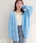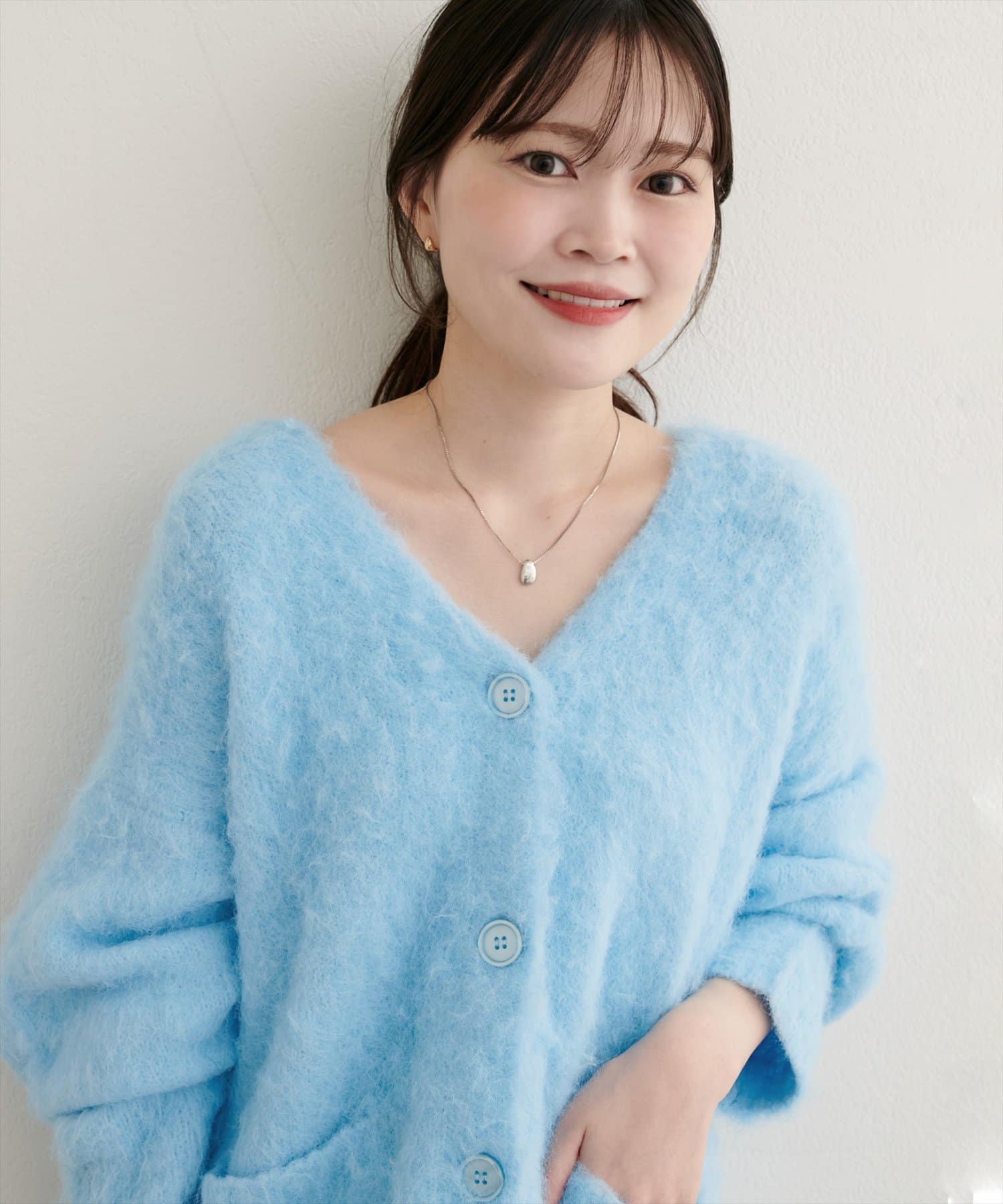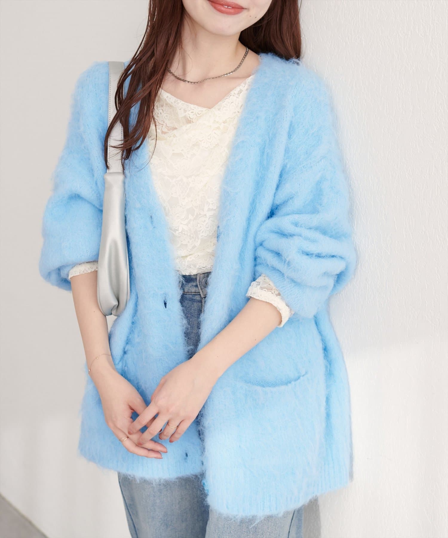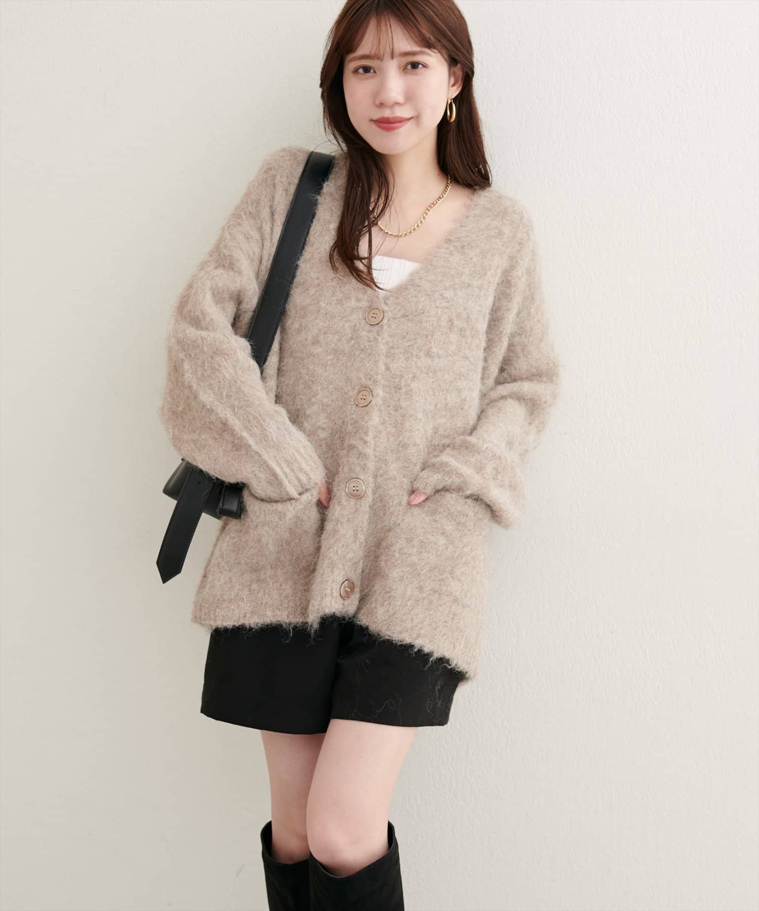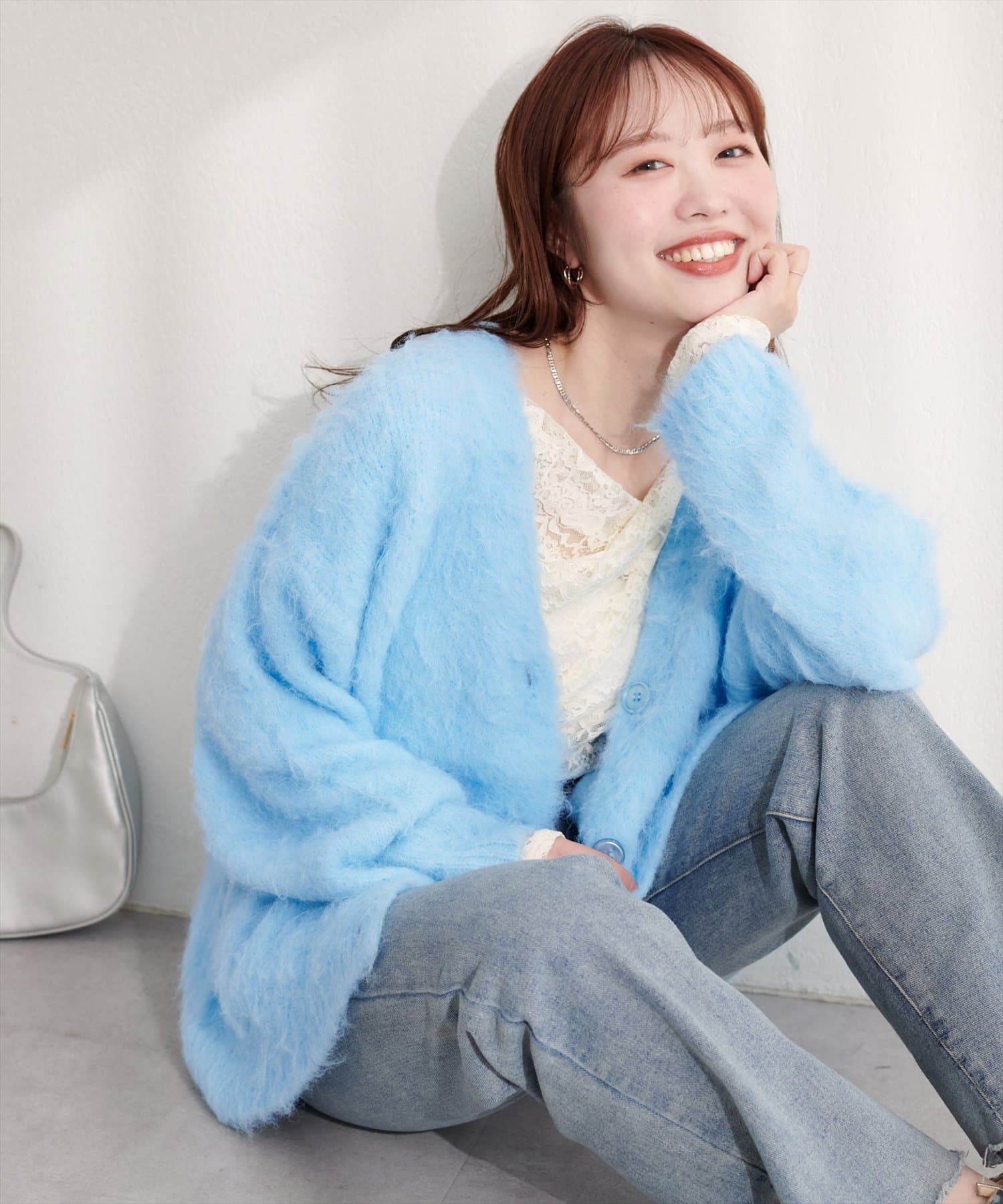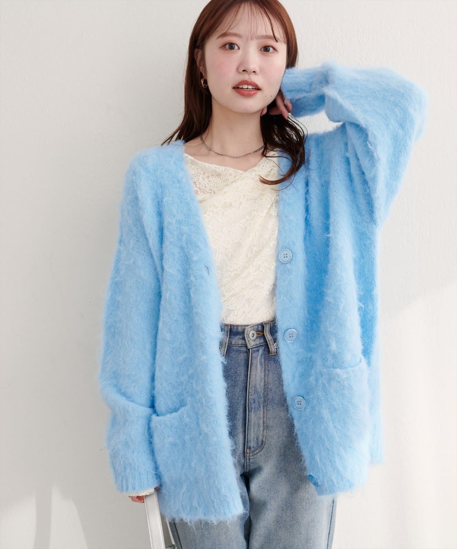 まるで空気を含んだ綿菓子のような、ふんわりとしたシャギー起毛が魅力のVネックニットカーディガン。