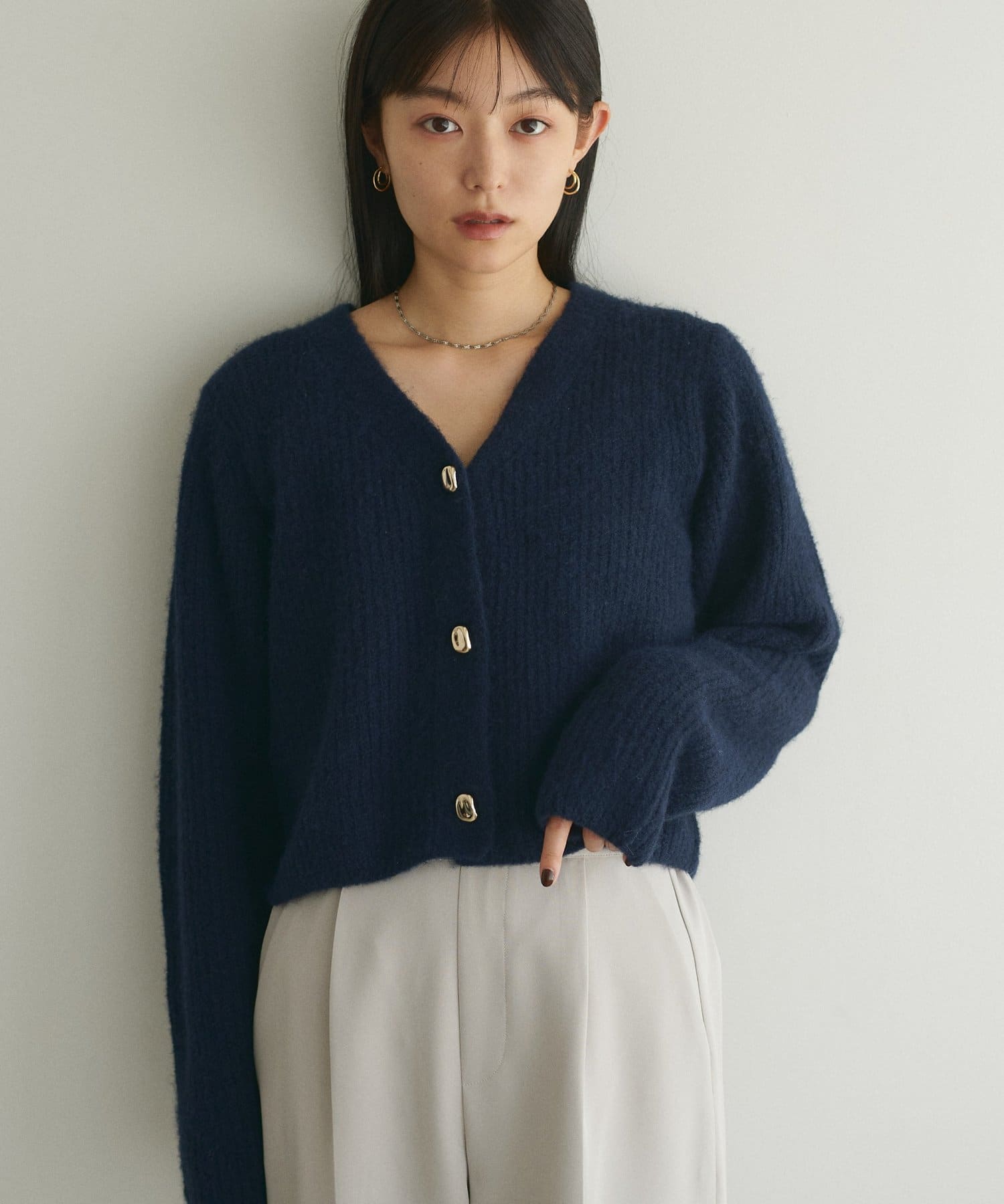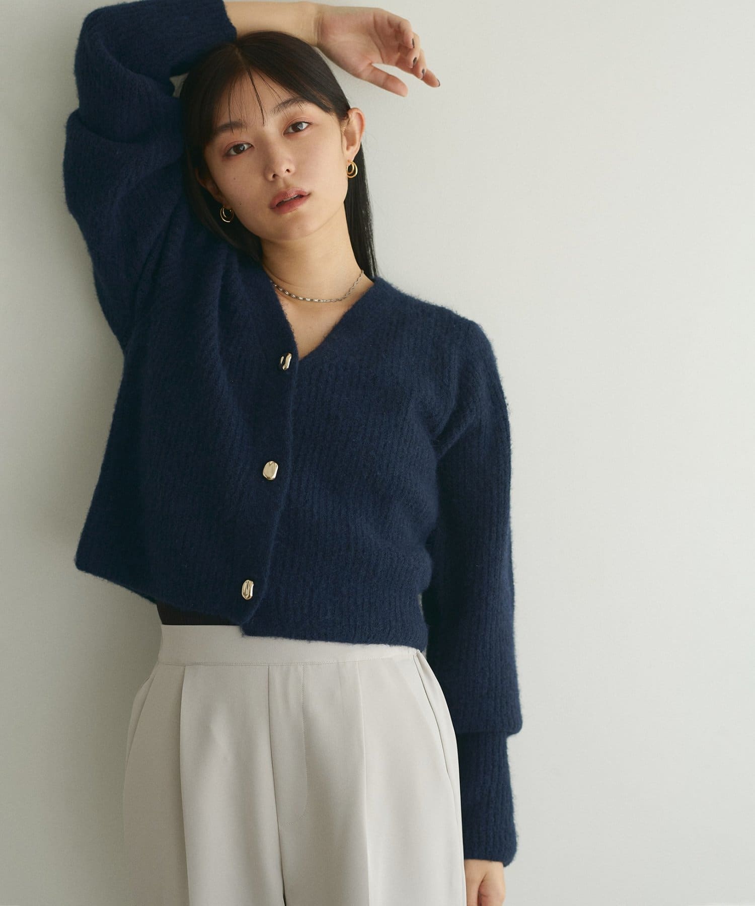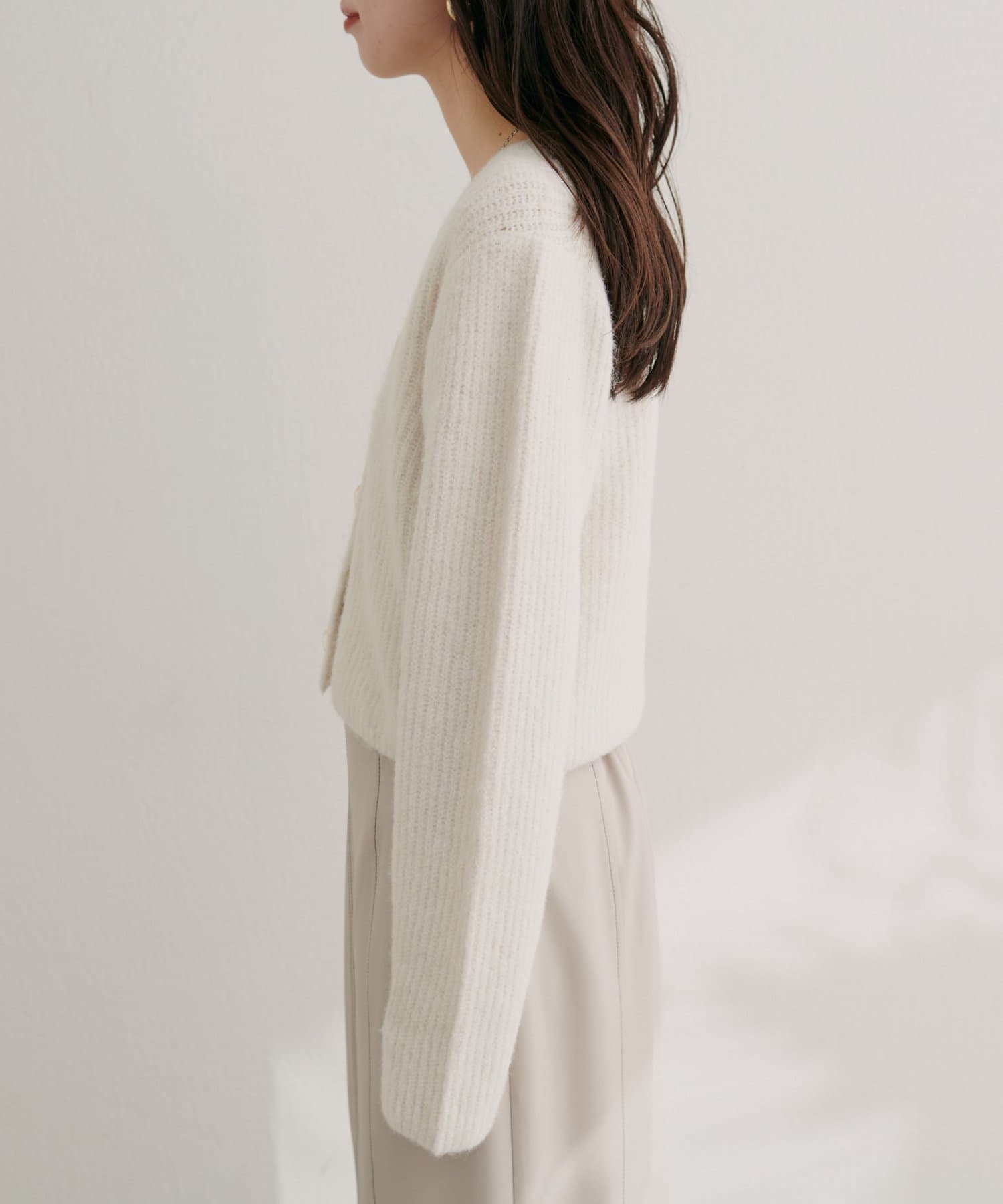 ボタンを閉じて襟付きアイテムと合わせたり、開けてワンピースの上に羽織ったりと様々な着こなしがお楽しみいただけます。