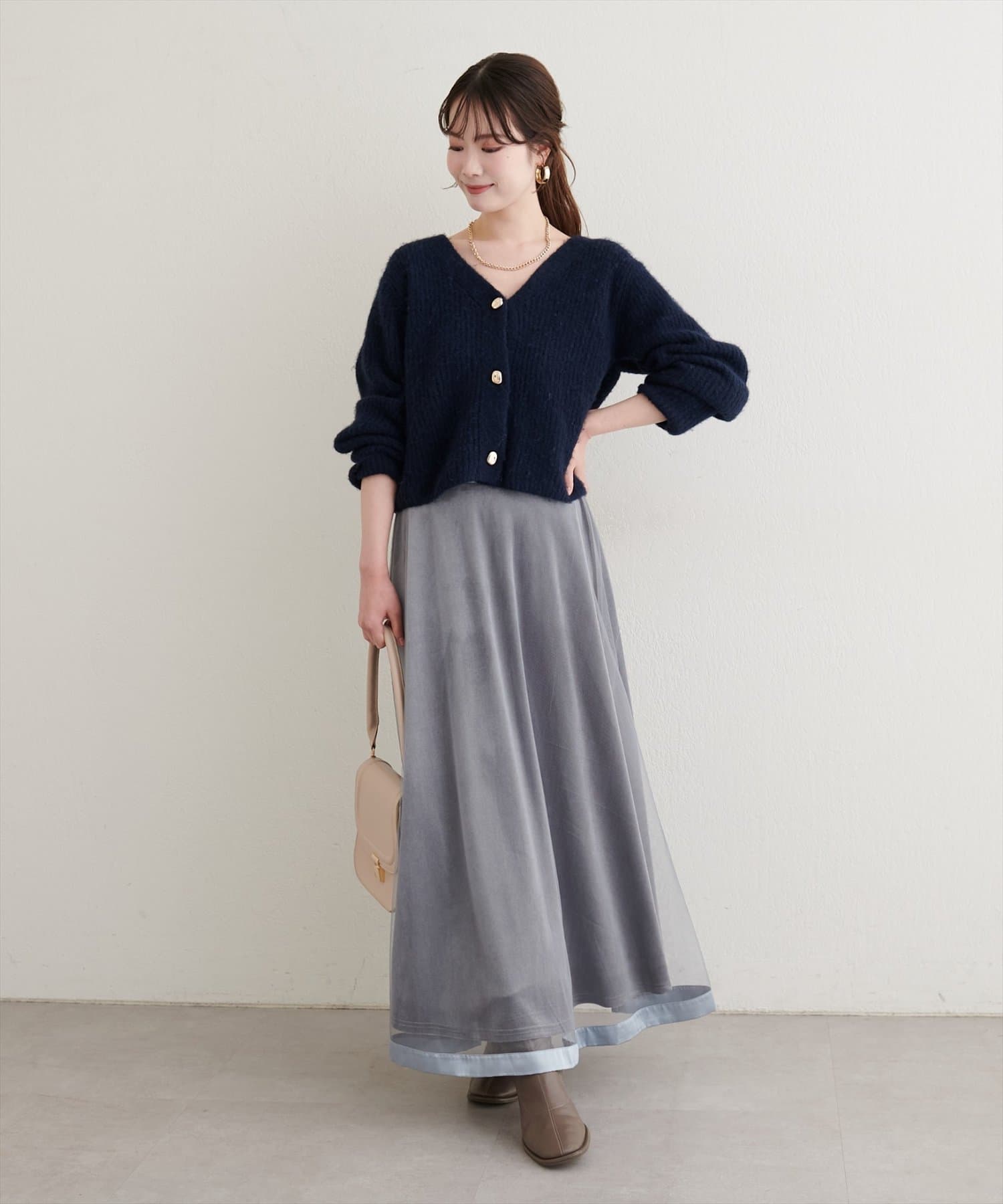 ブラウスやシャツにスカートやきれいめパンツを合わせたきれいめスタイルに羽織れば、上品な印象に。