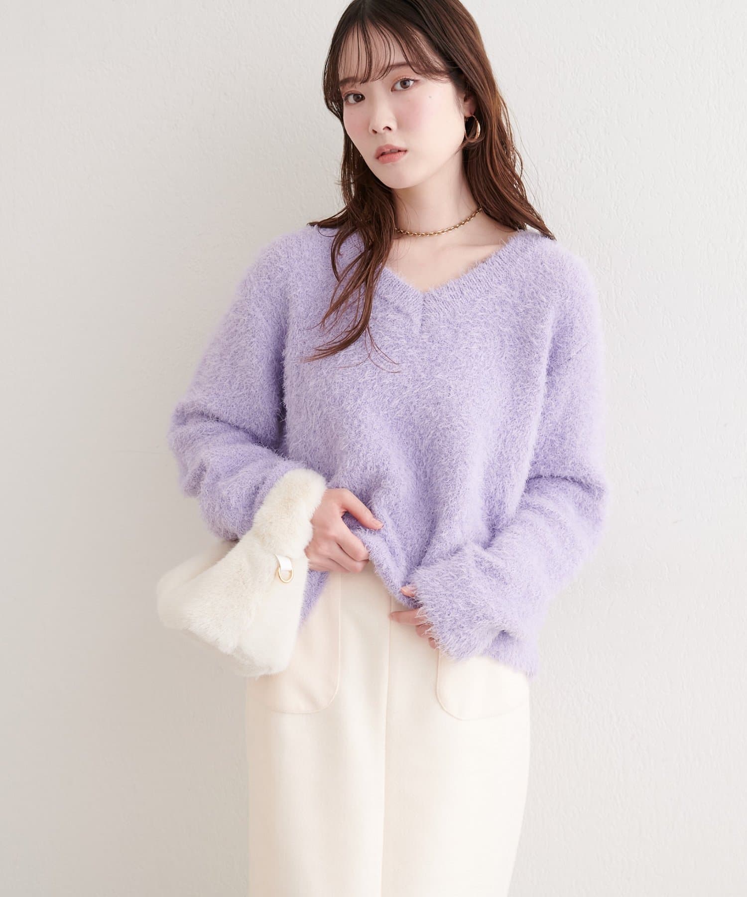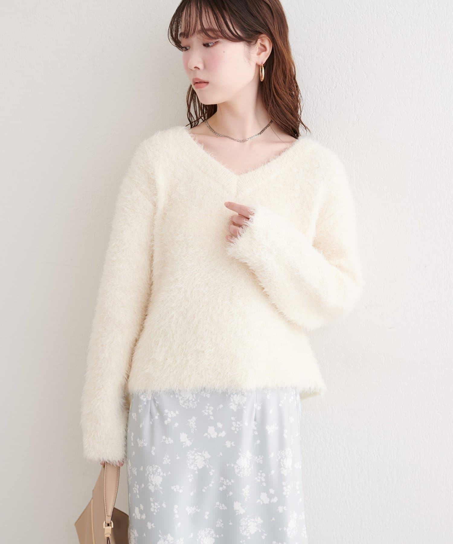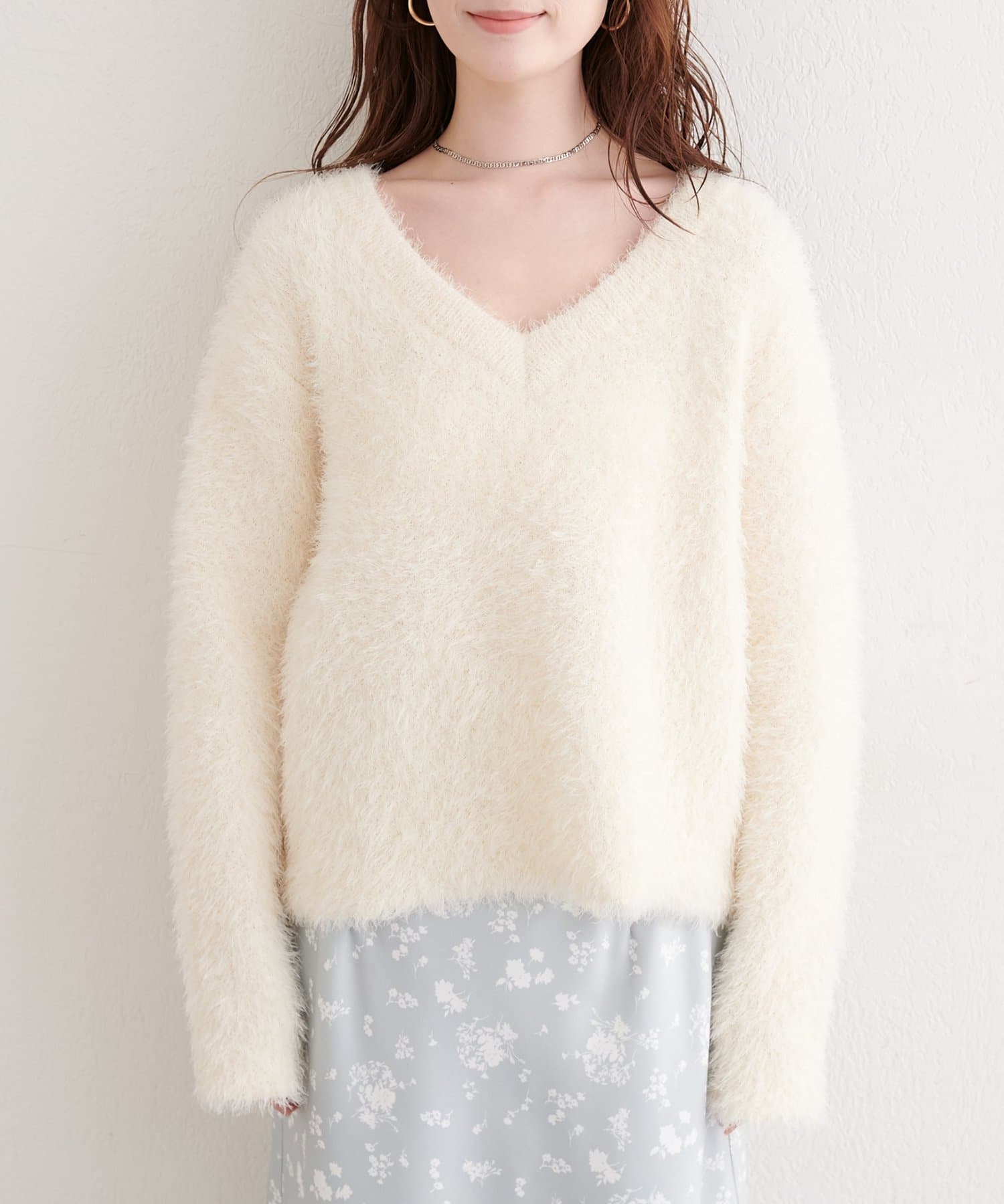 • natural couture(ナチュラルクチュール) 【Mychoiceset対象】Vネックシャギーニットプルオーバー