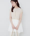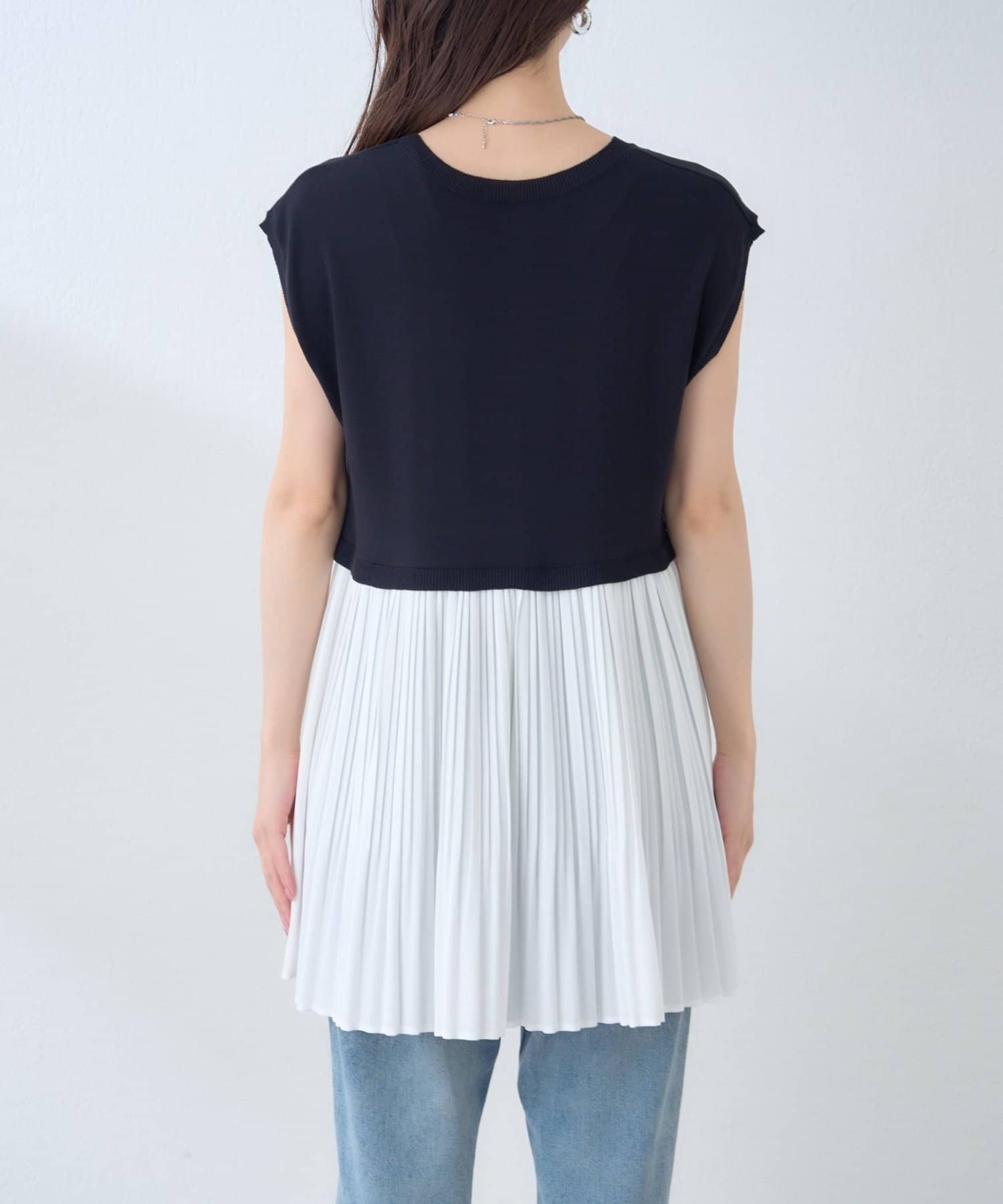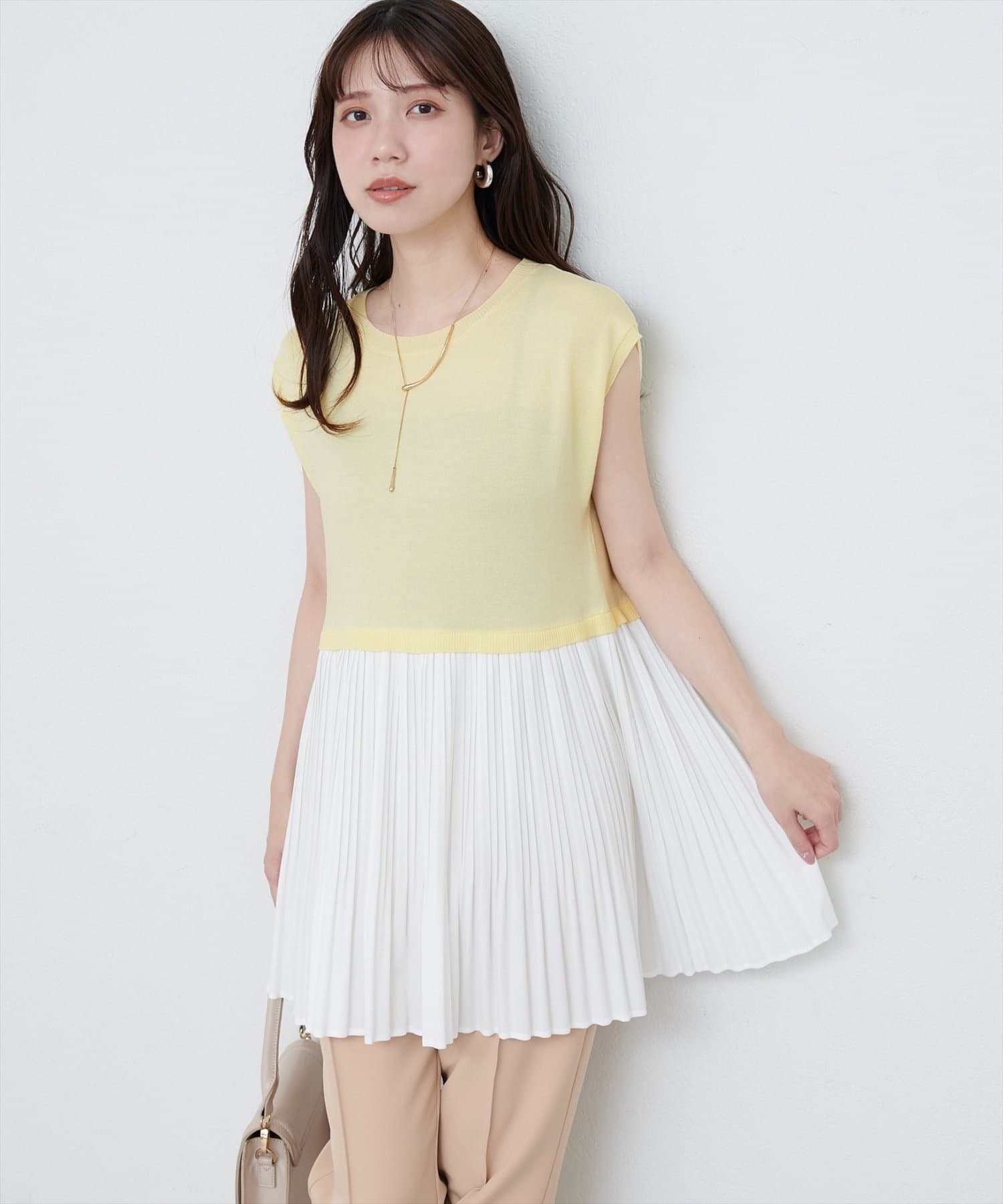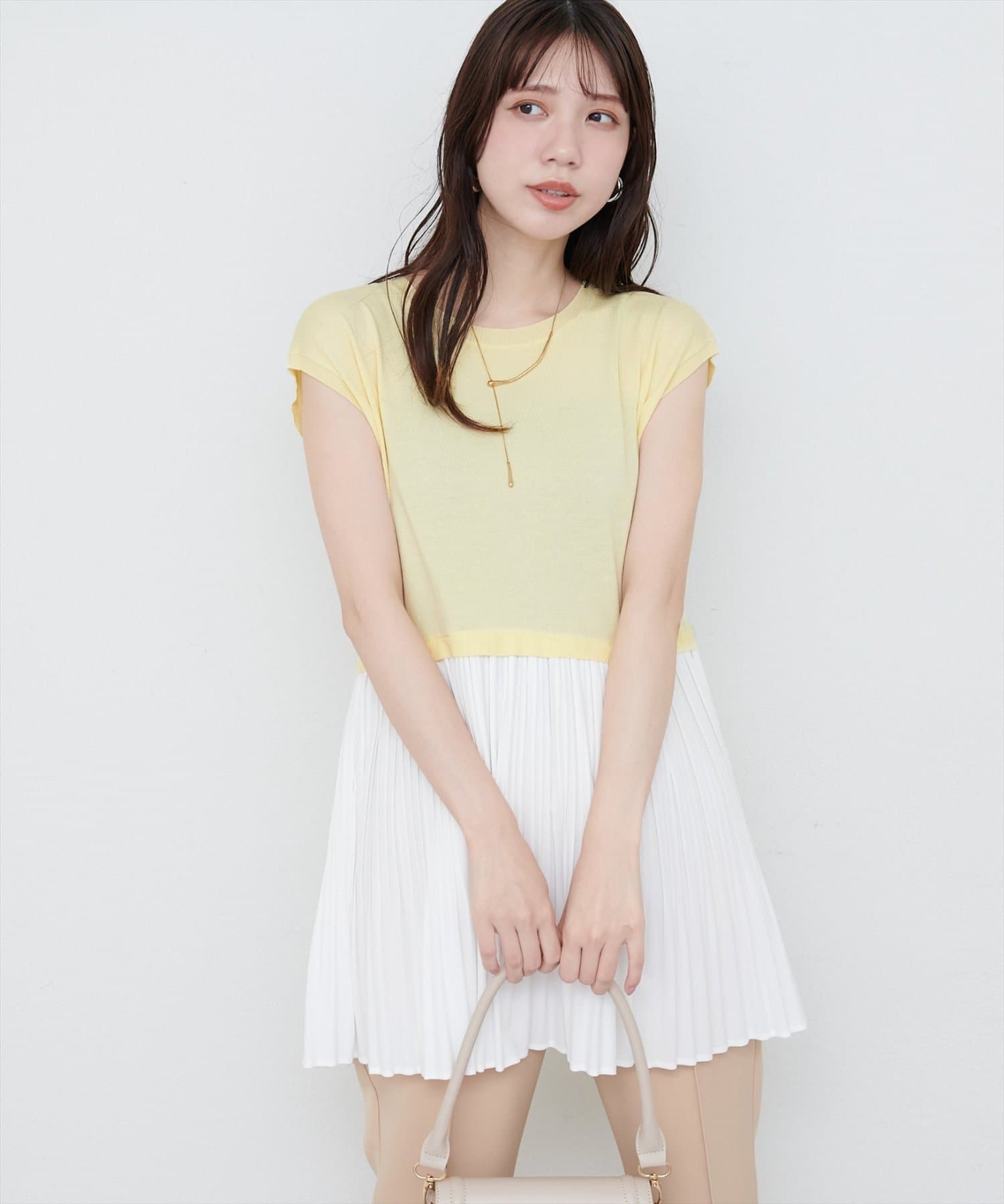 トップス部分のシンプルなニットと、繊細なプリーツがドッキングした、デザイン性の高い一枚。