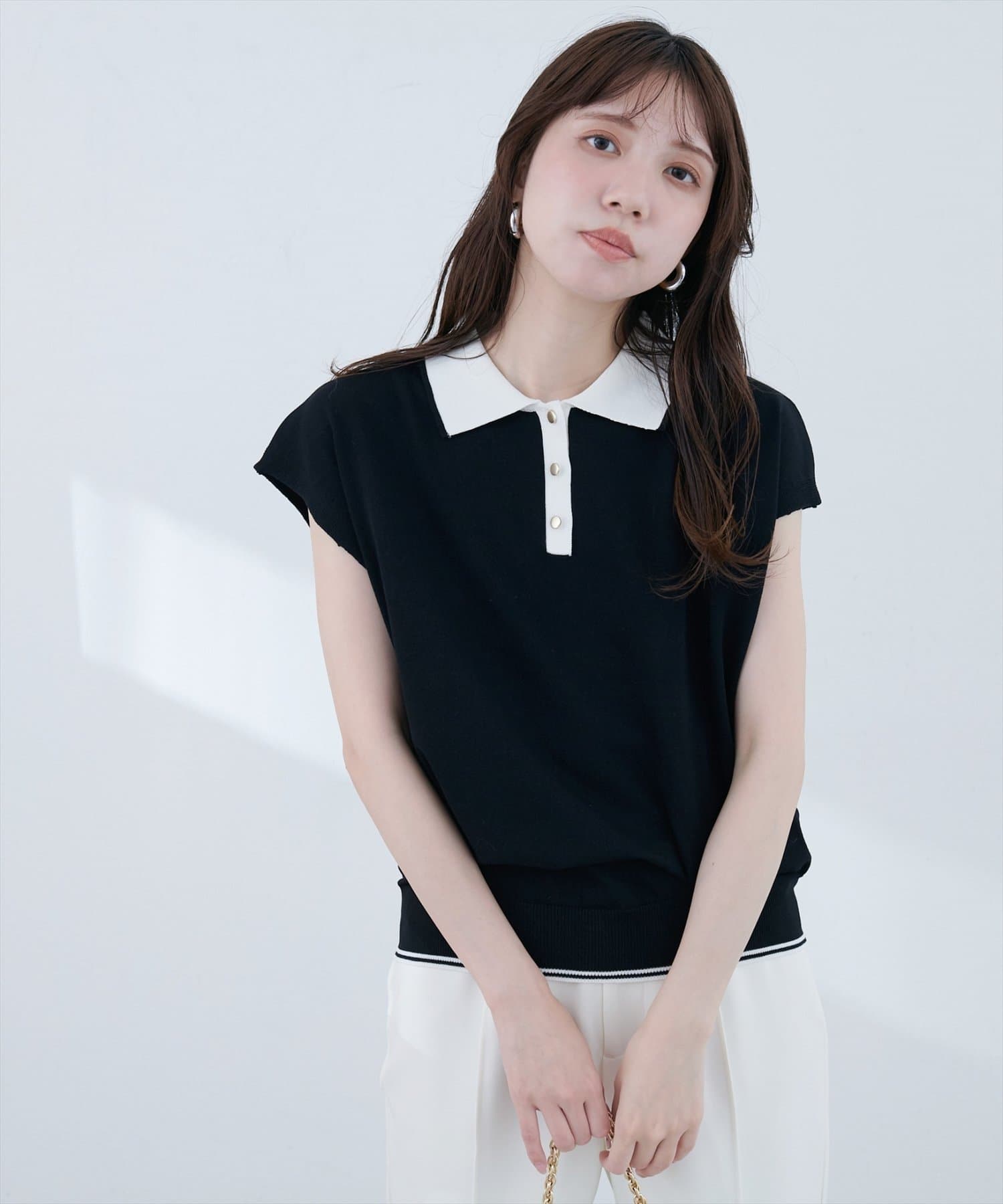 上品なニット素材と、襟元の配色デザインが、着るだけで洗練された印象を与えます。