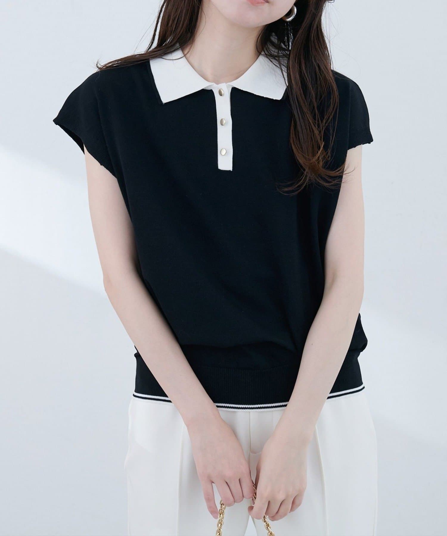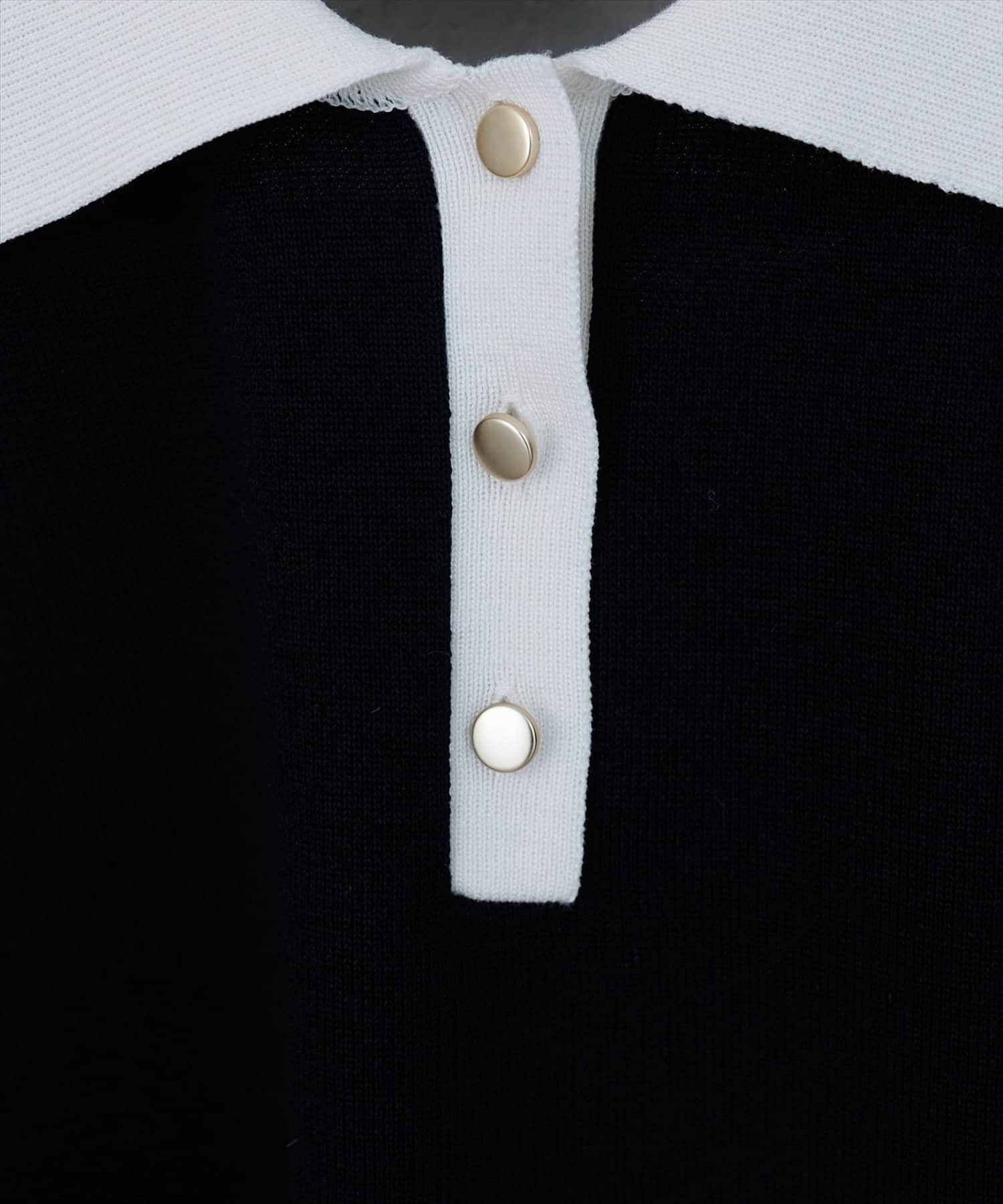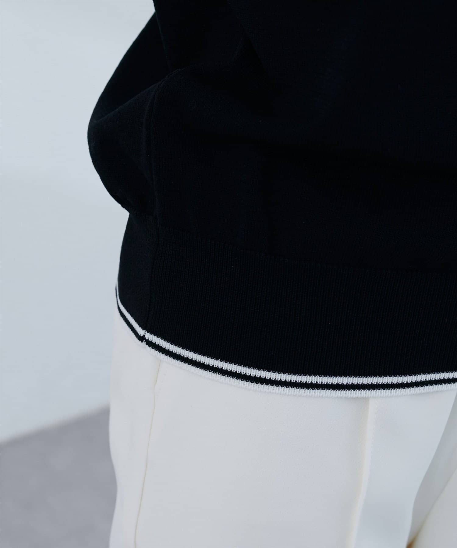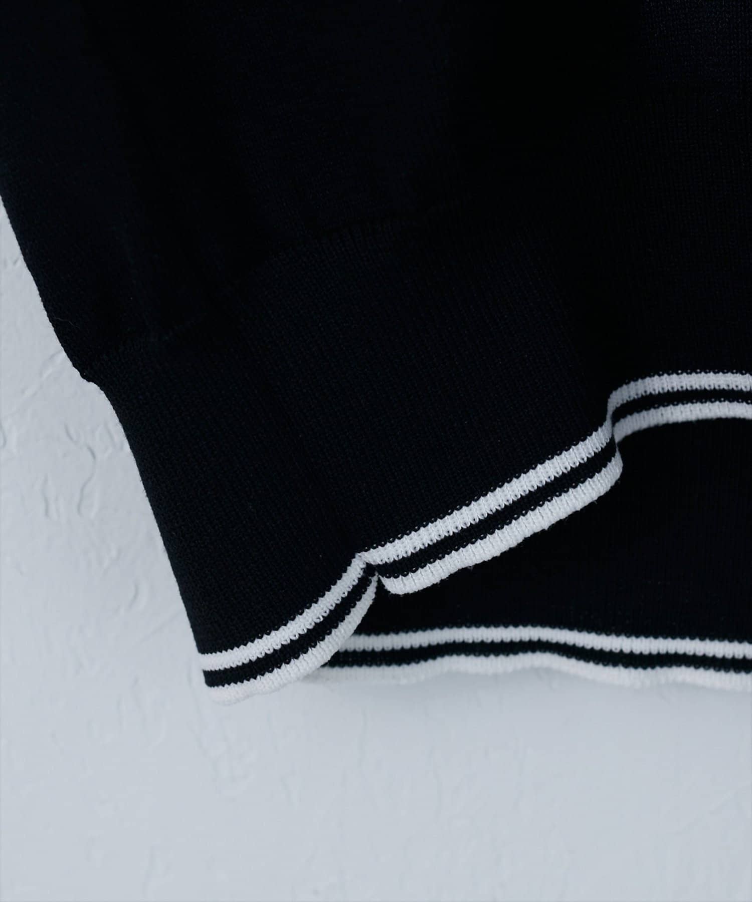 上品なニット素材と、襟元の配色デザインが、着るだけで洗練された印象を与えます。