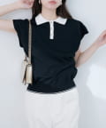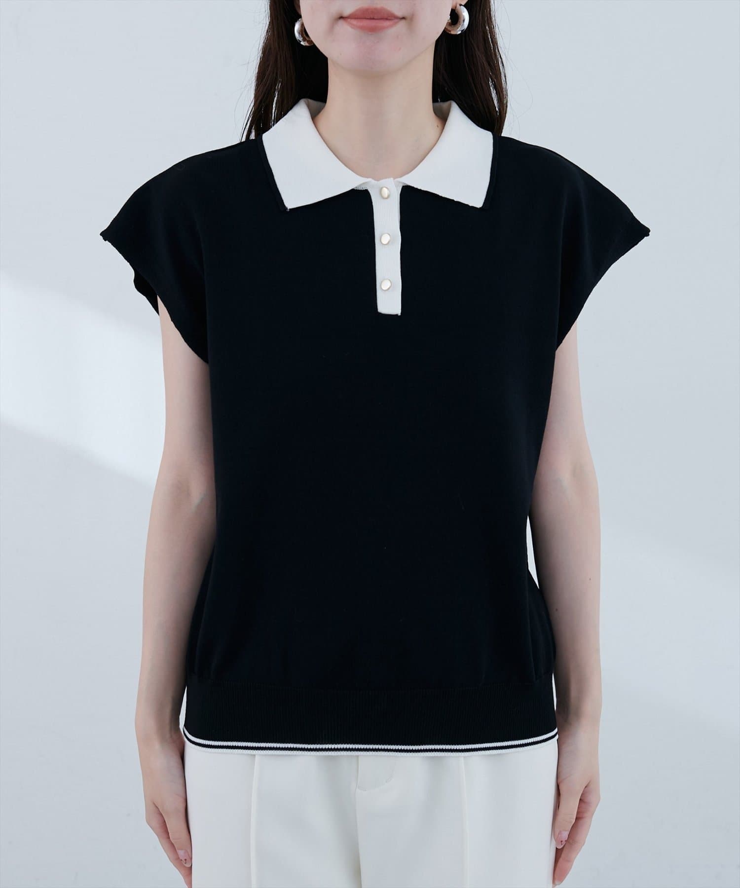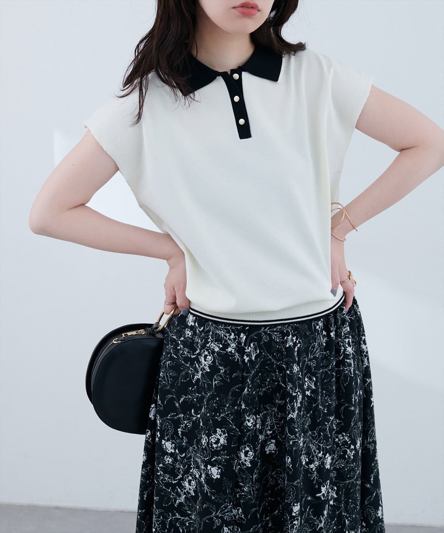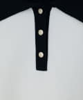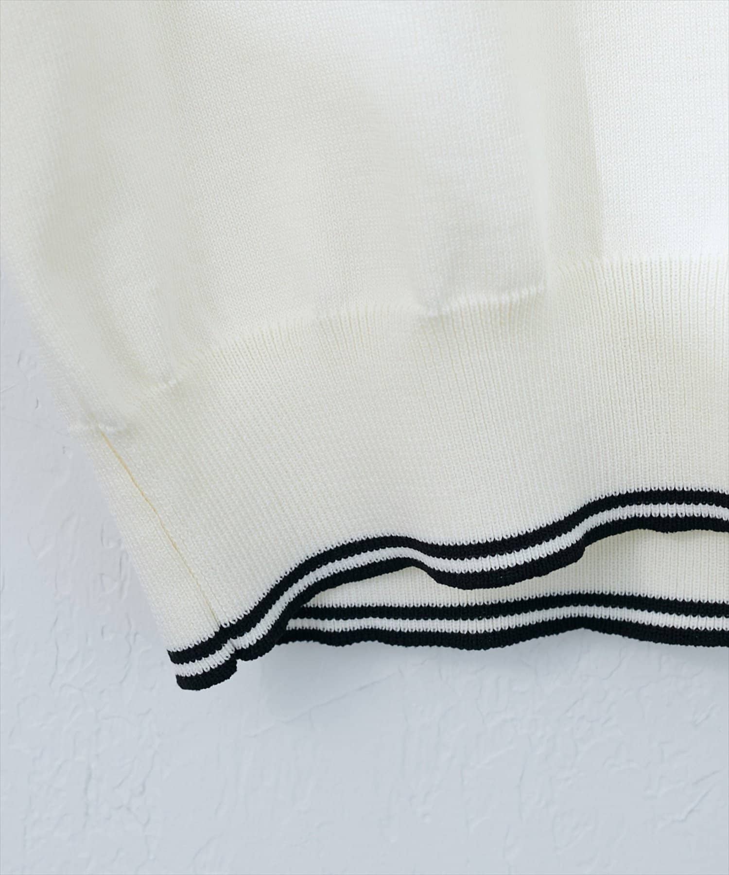上品なニット素材と、襟元の配色デザインが、着るだけで洗練された印象を与えます。
