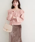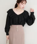 デコルテを美しく彩るクロスフリルが、顔周りを華やかに演出します。計算されたフリルのボリューム感は、上品さと愛らしさを両立。