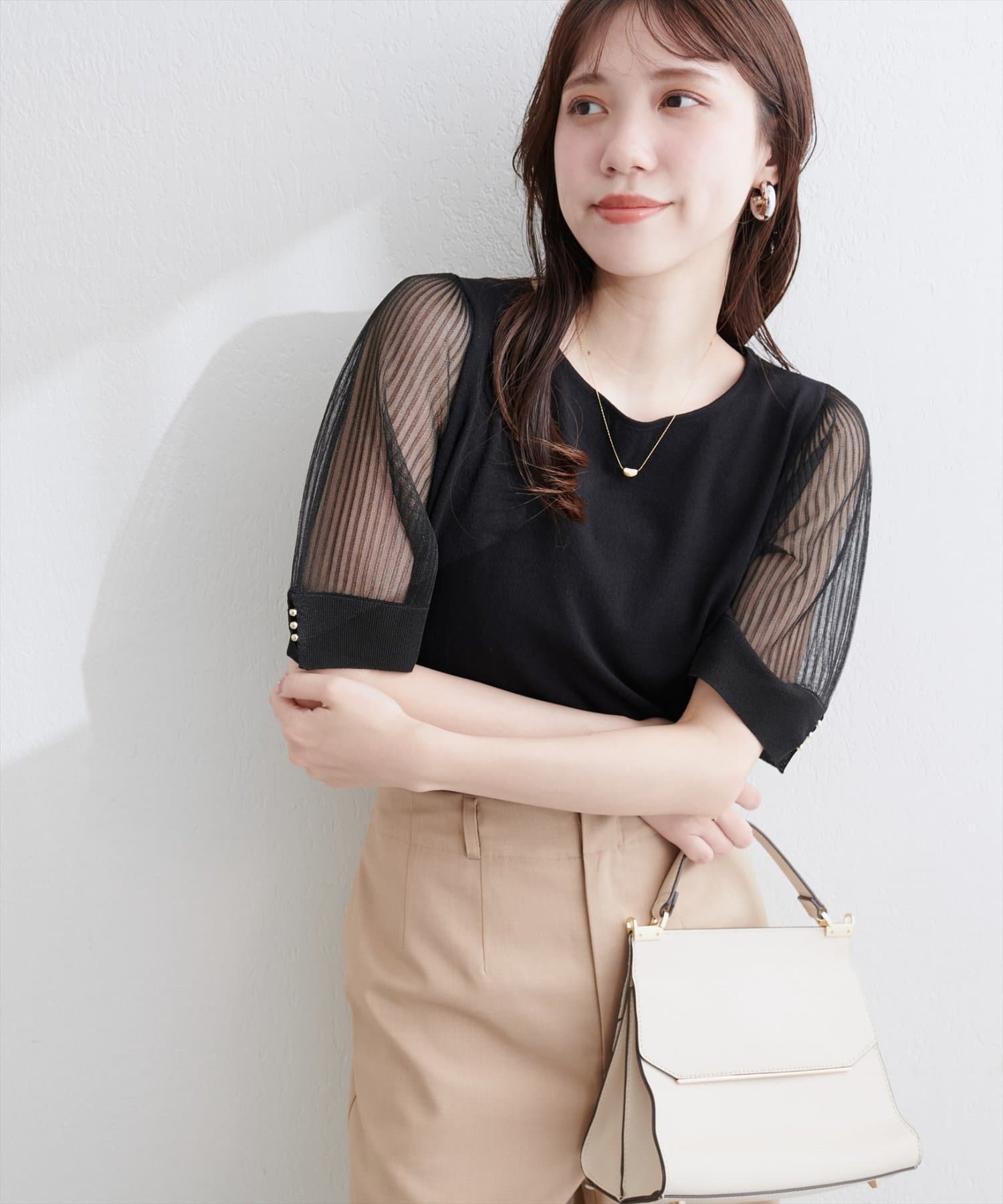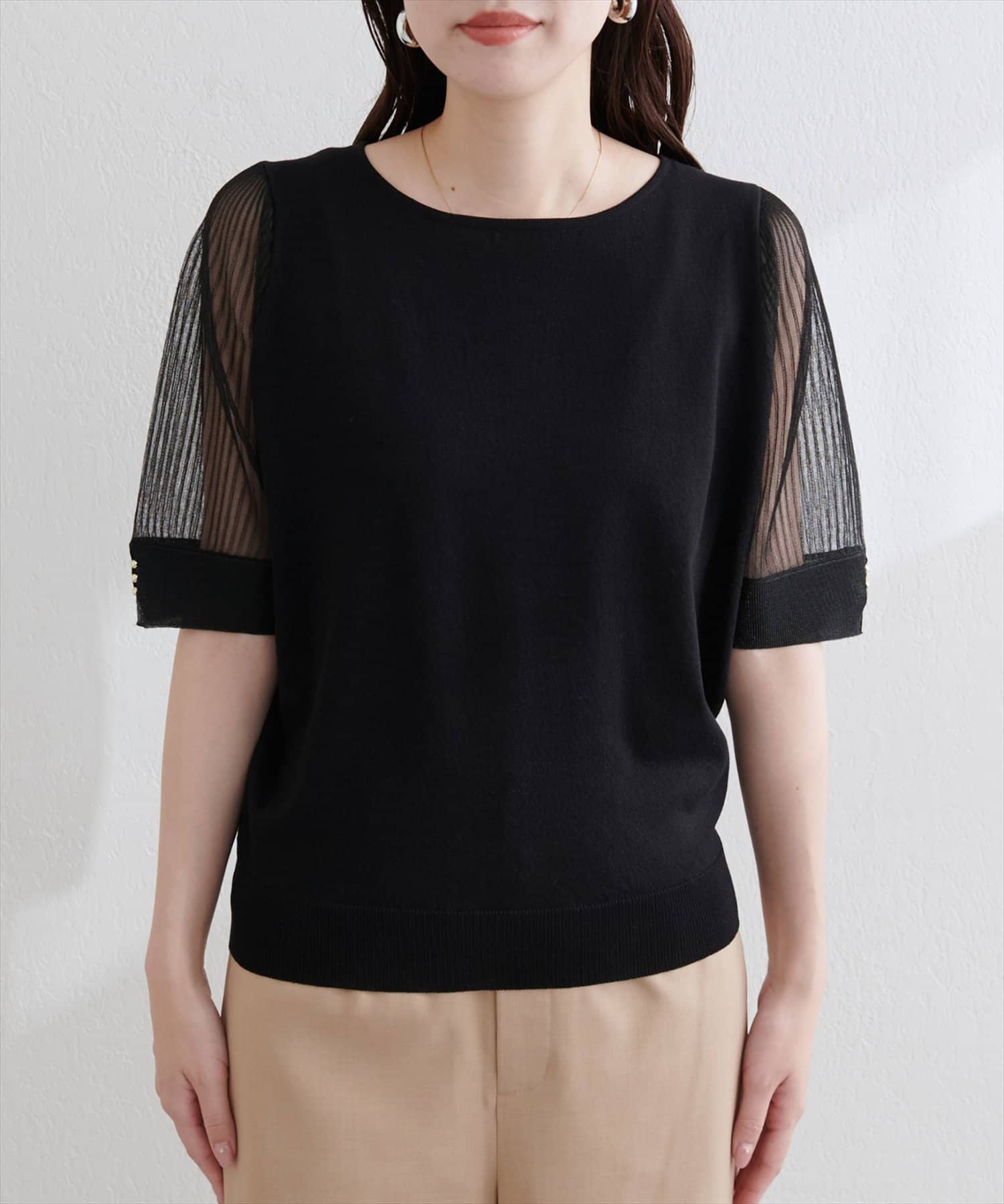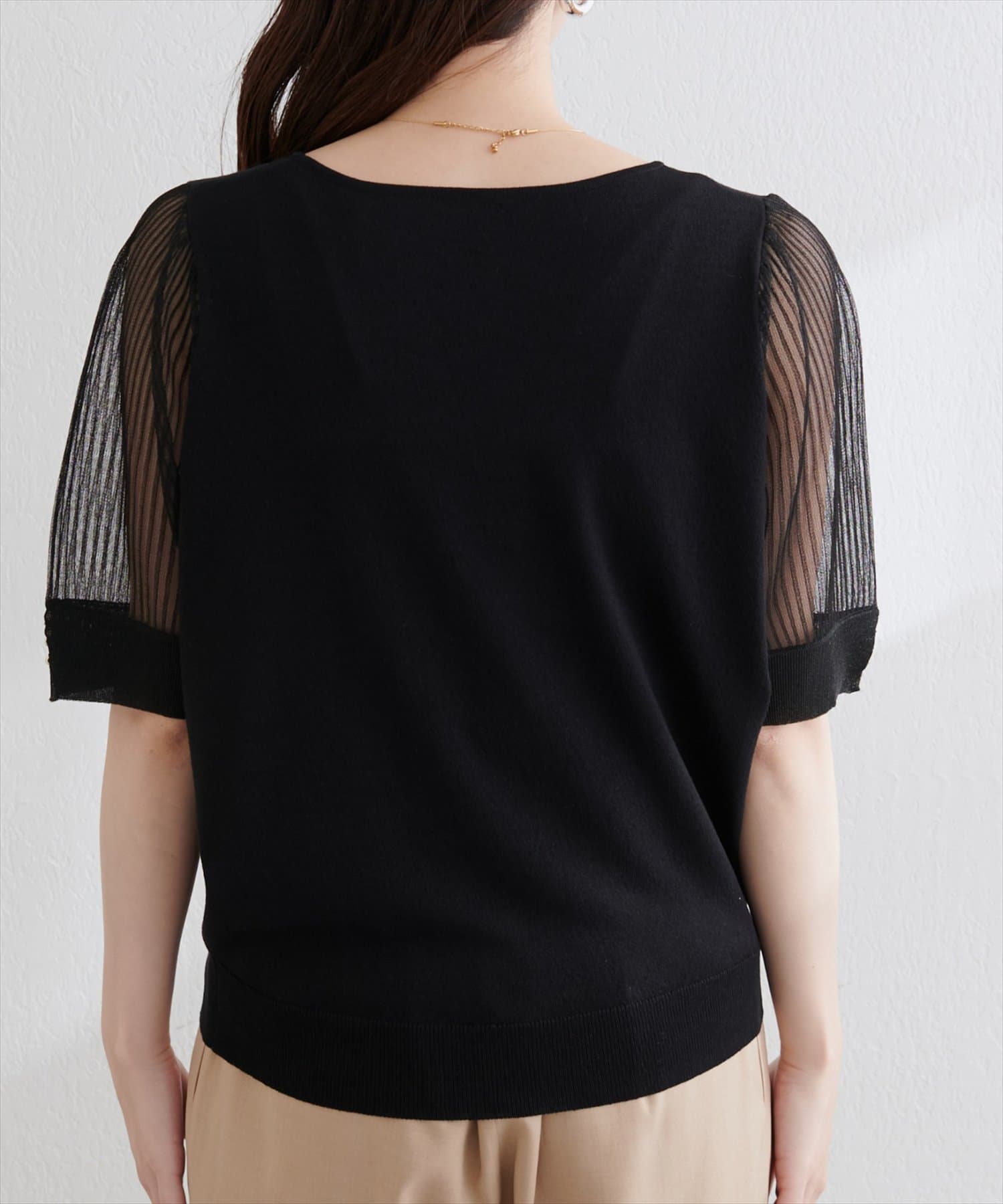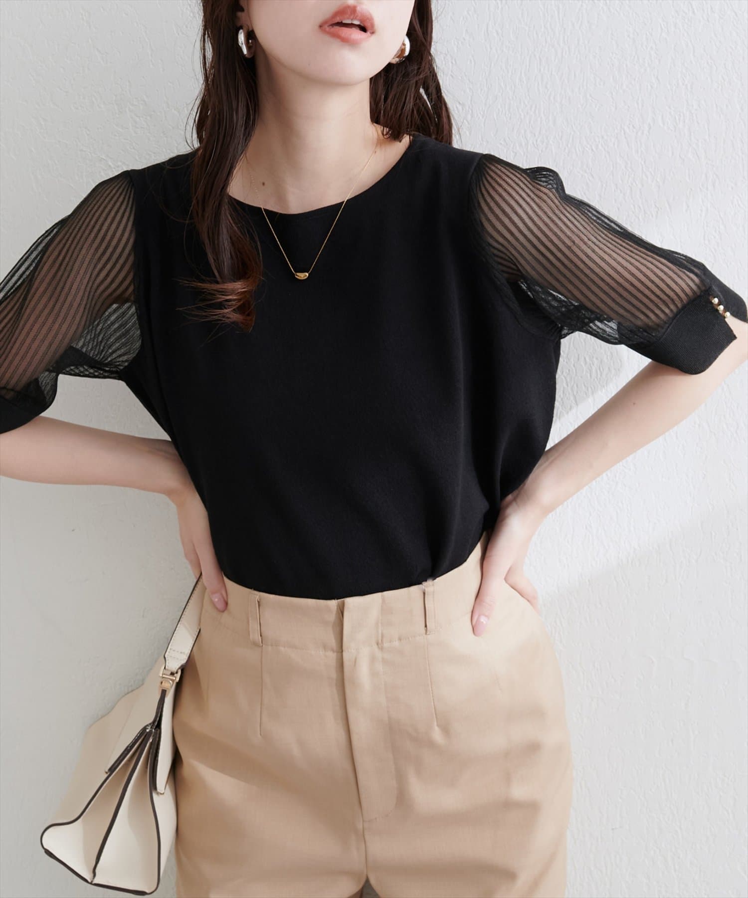 繊細なシアー素材の袖が、女性らしさを引き立てるニットトップス。