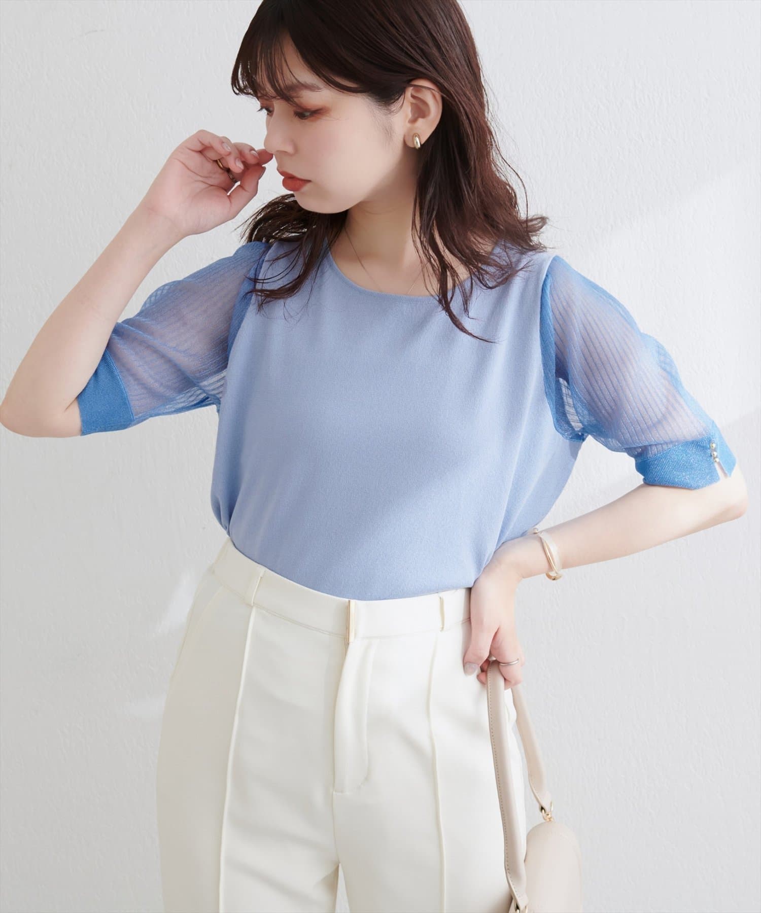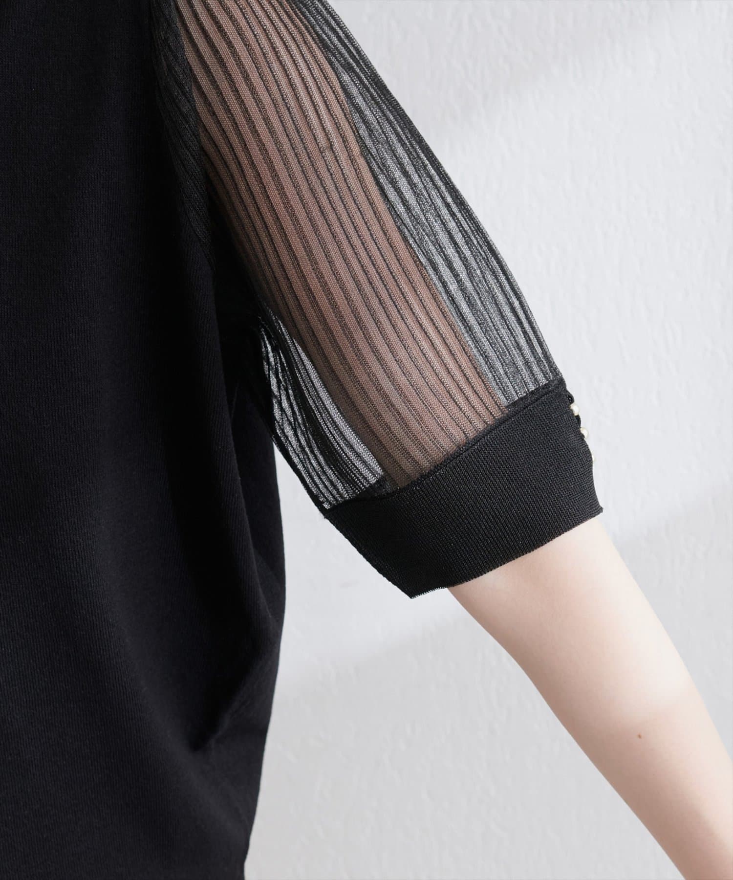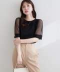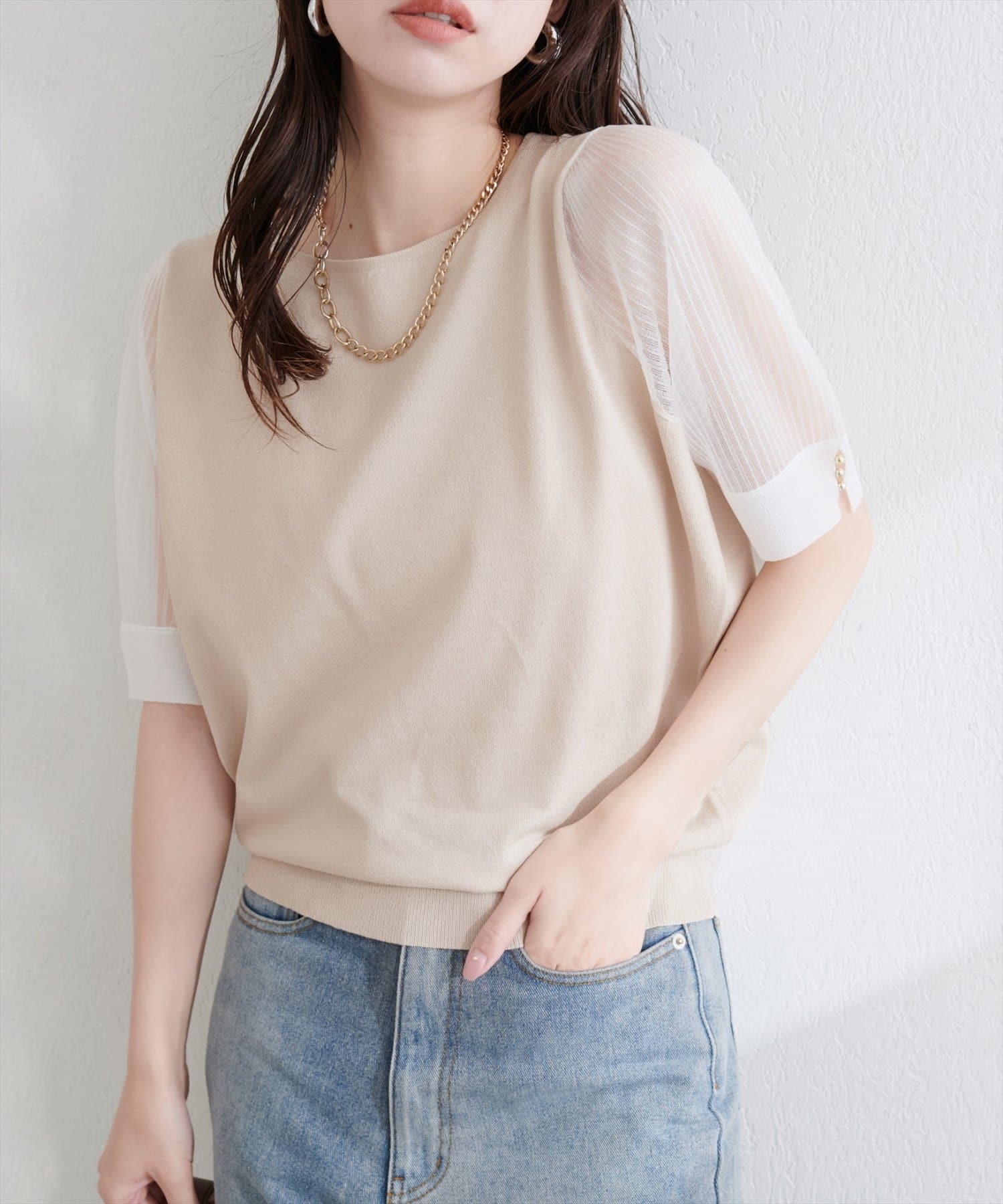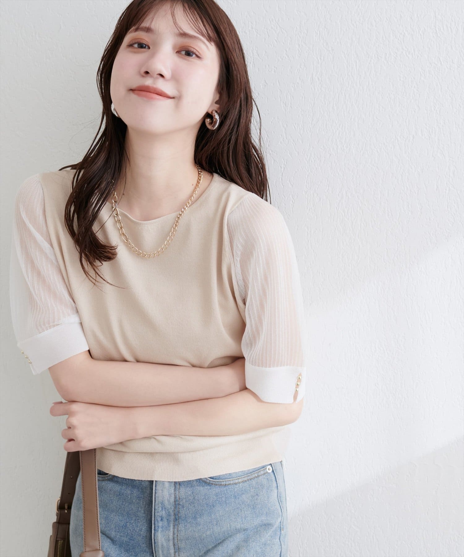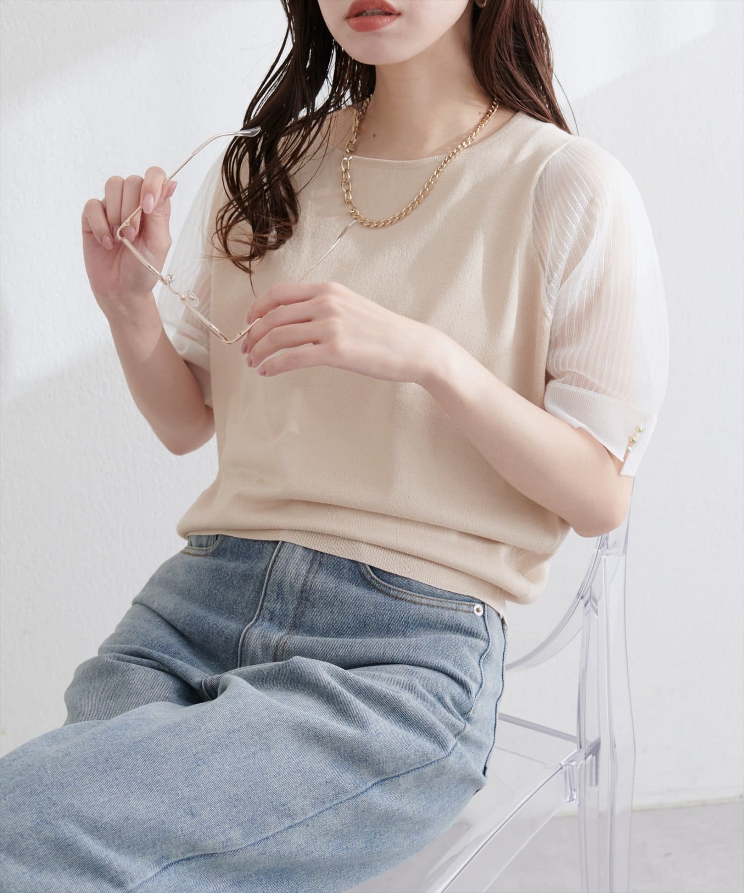 繊細なシアー素材の袖が、女性らしさを引き立てるニットトップス。